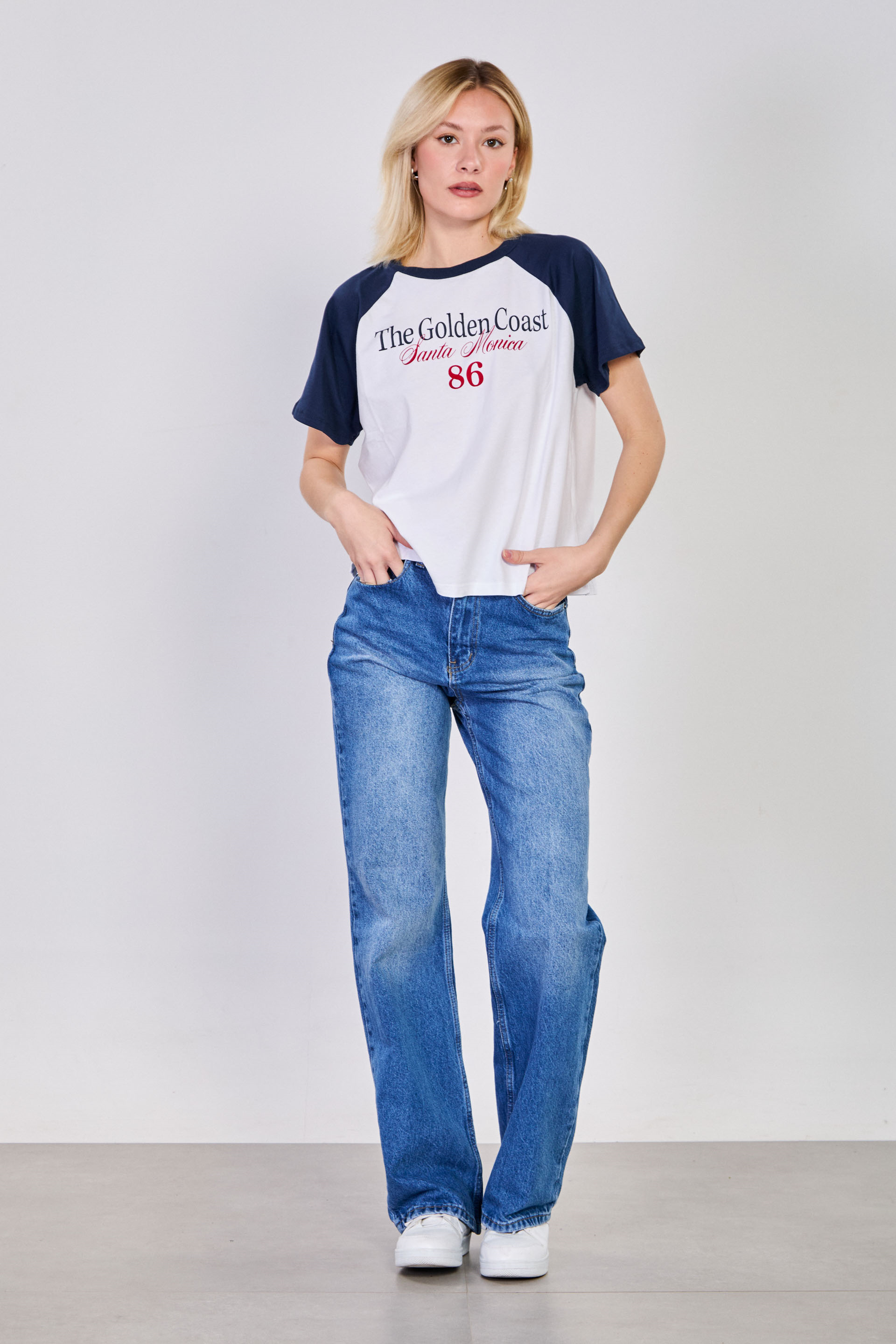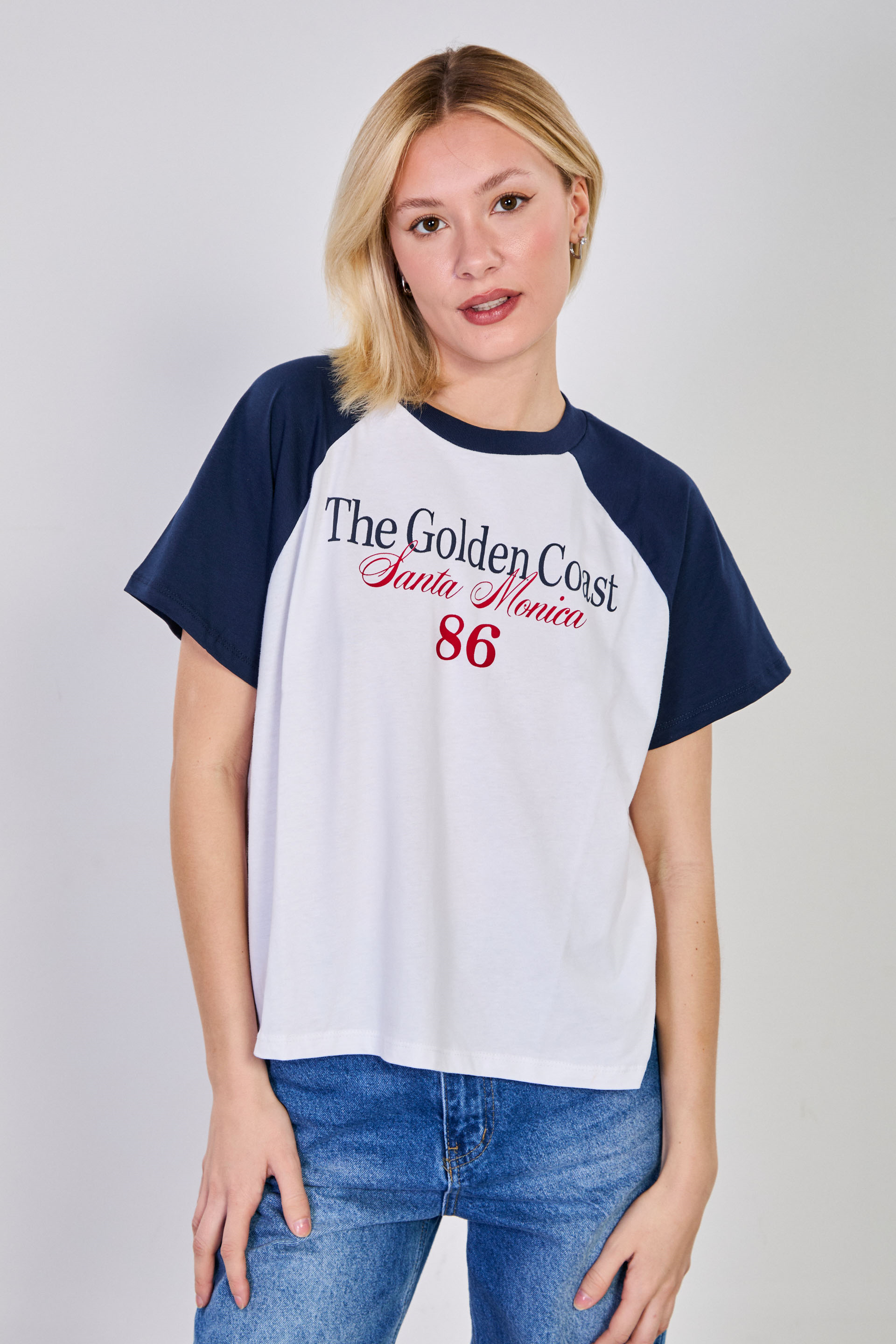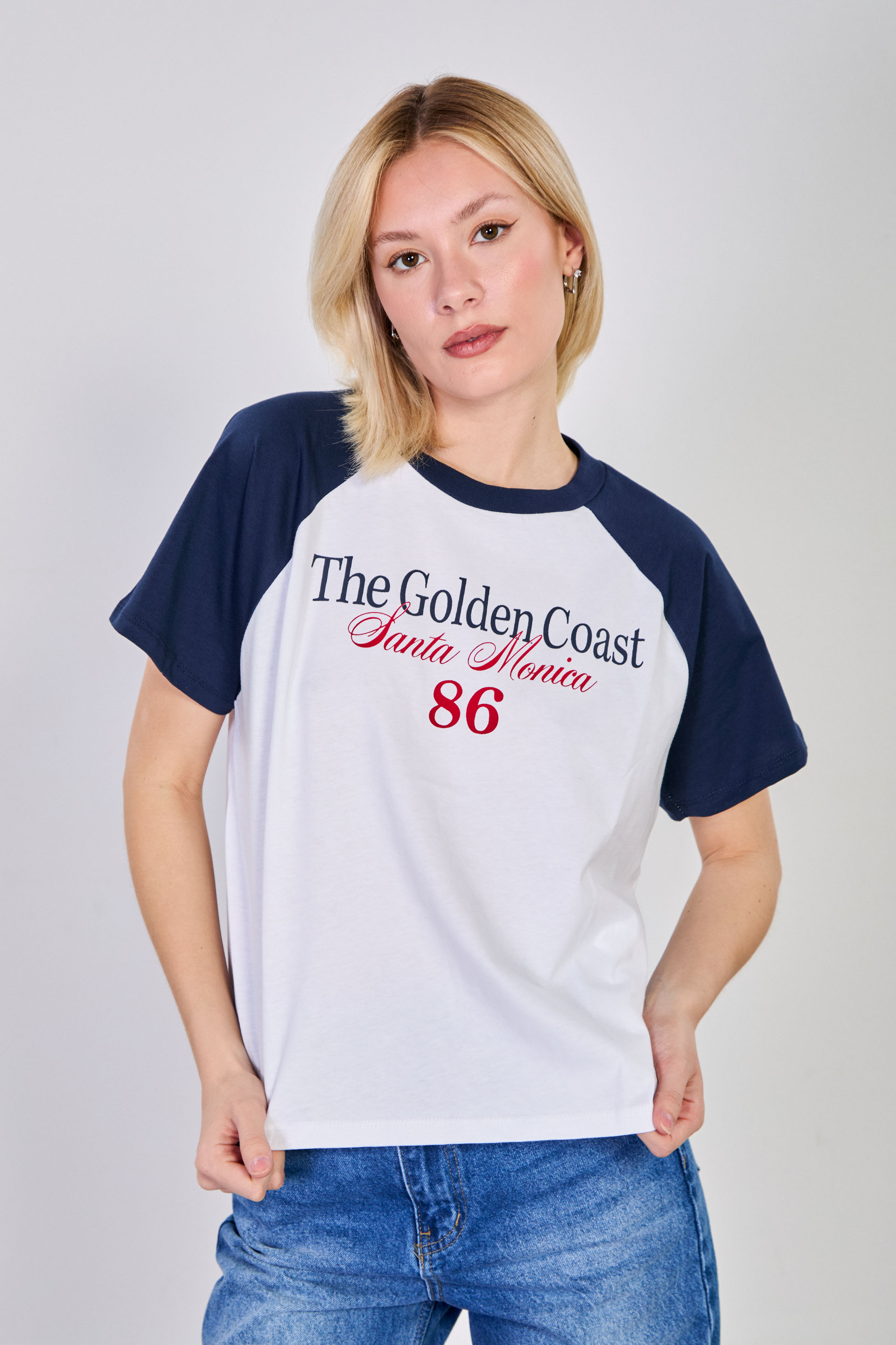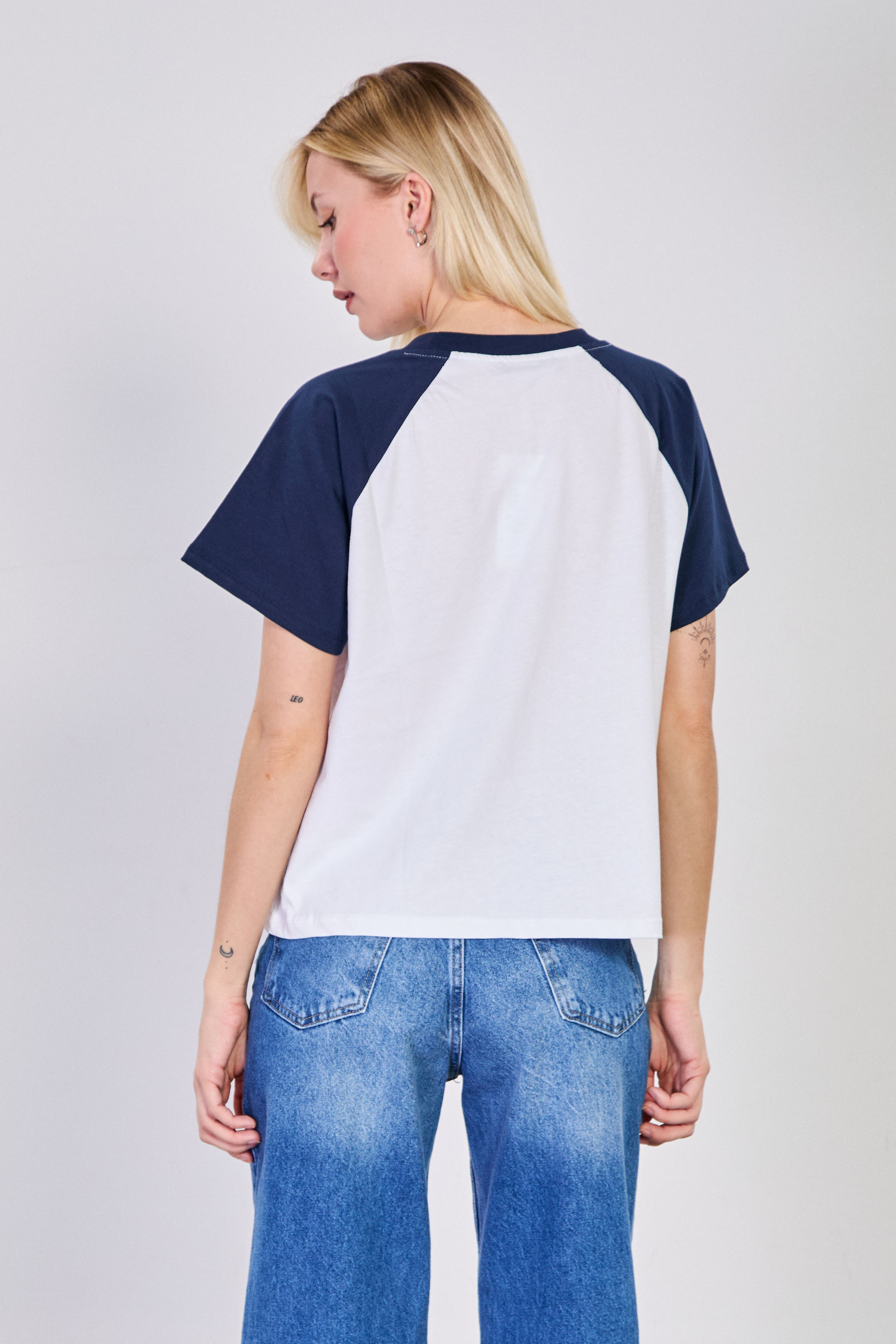 Kadın Önü Baskılı Kol Garnili T-Shirt - Beyaz/Lacivert