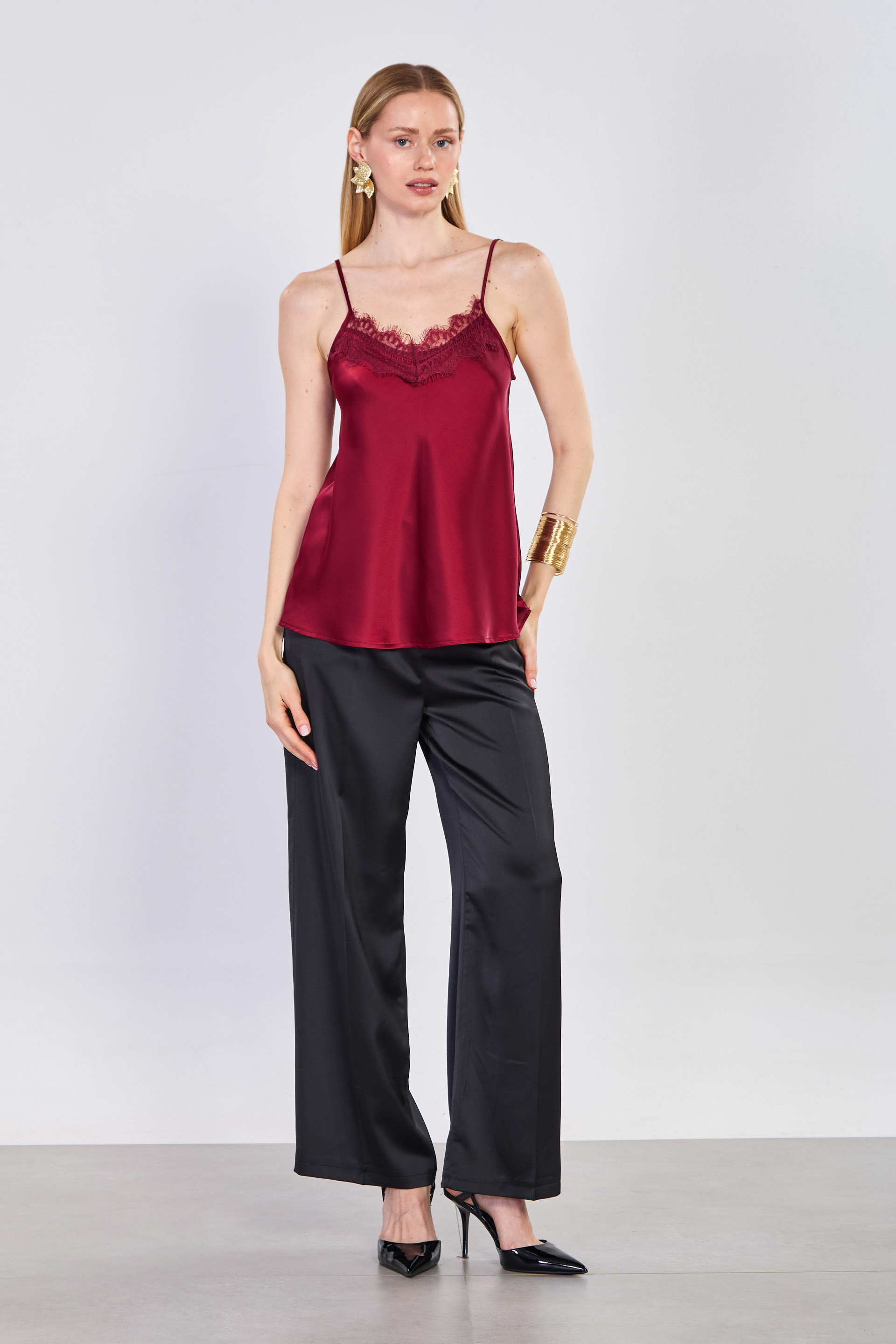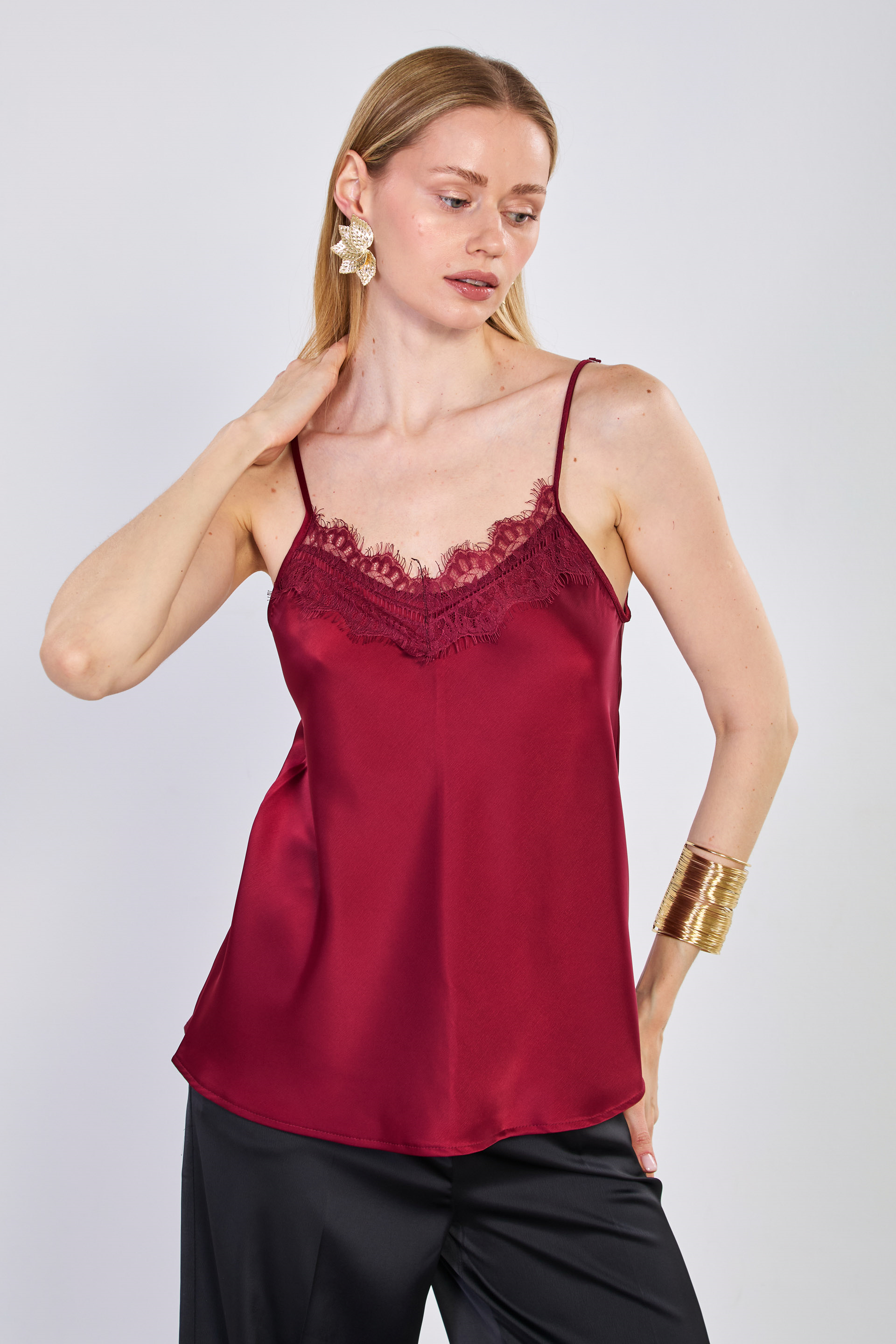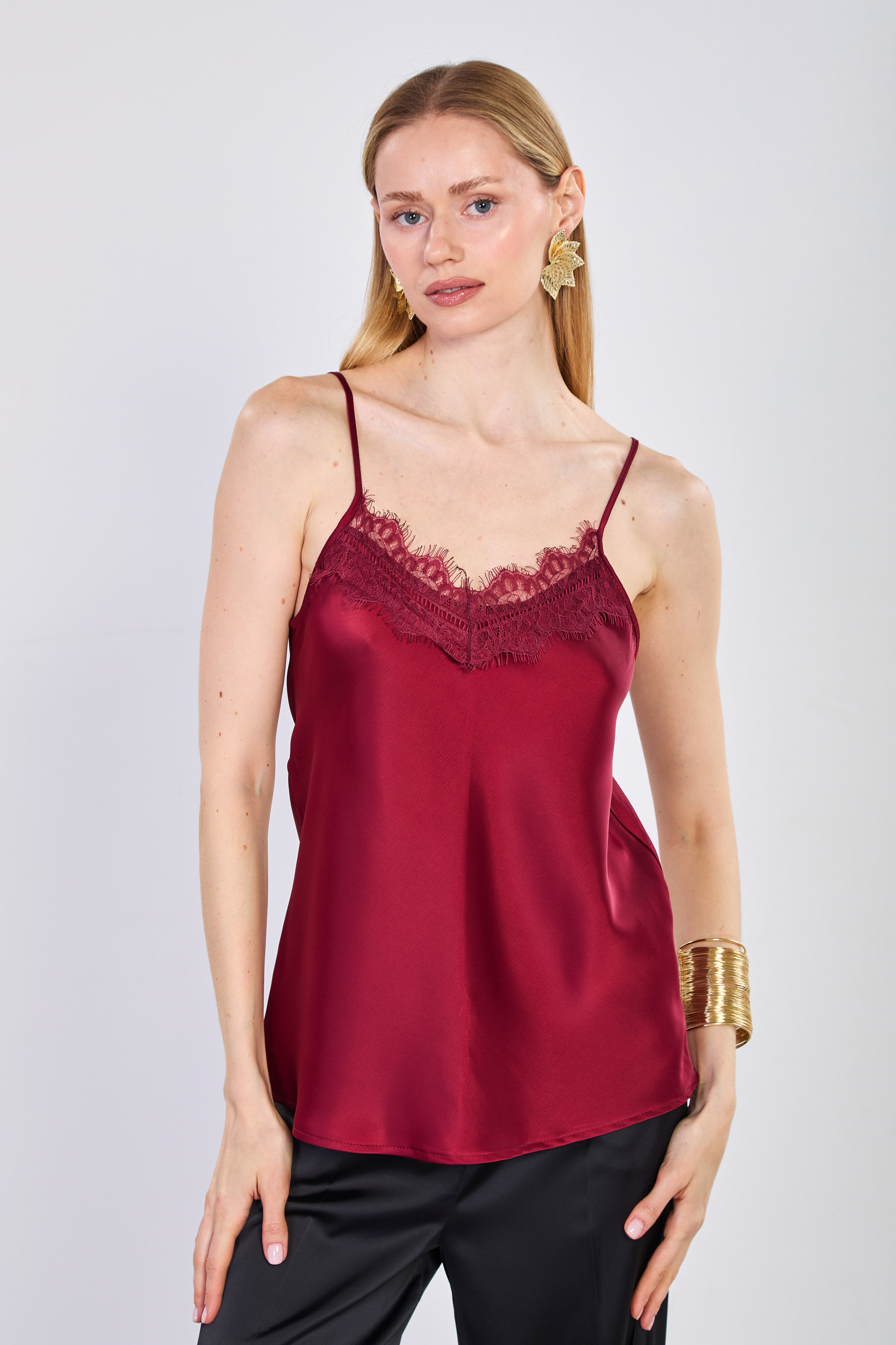 Kadın Önü Dantelli Askılı Saten Bluz - Bordo