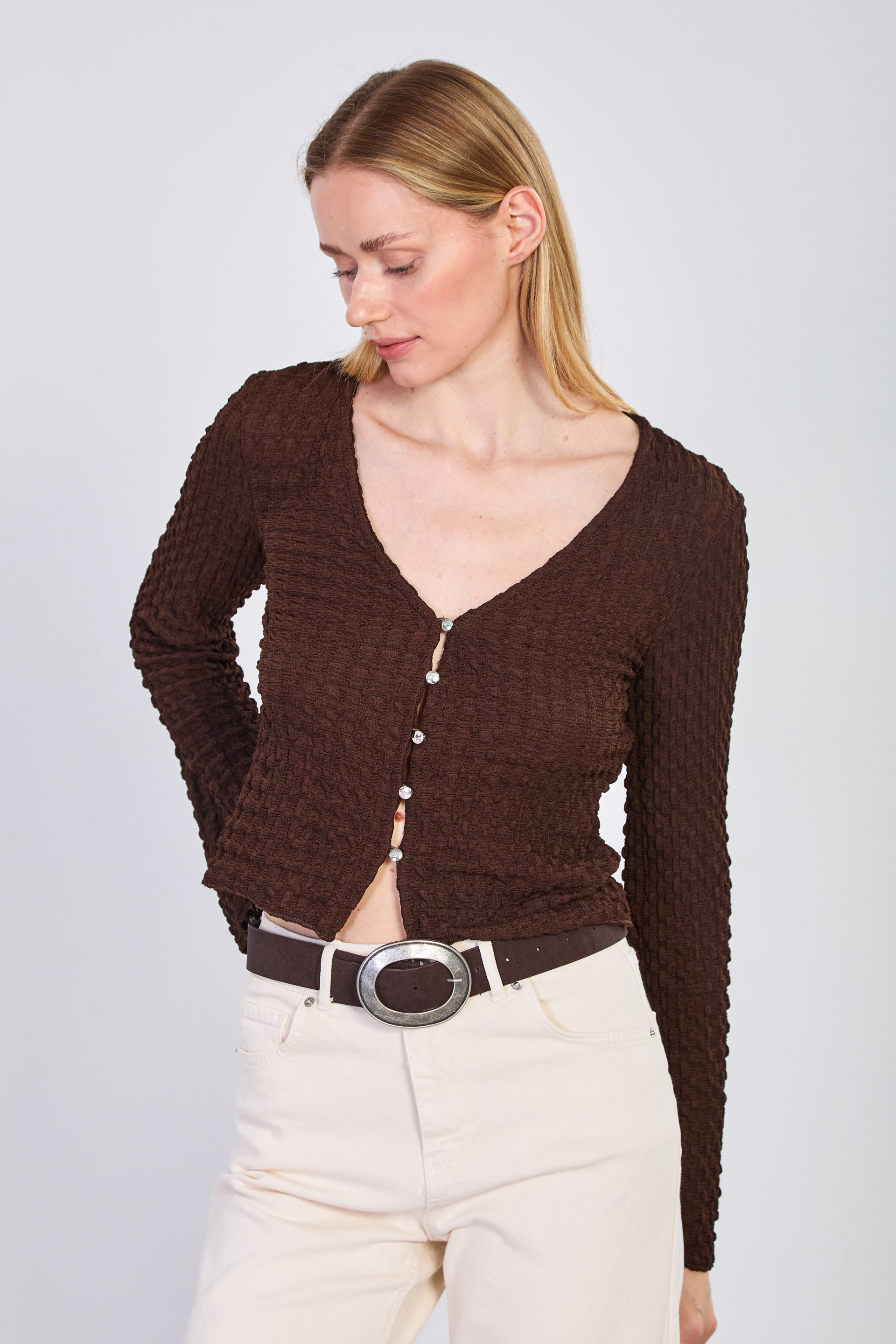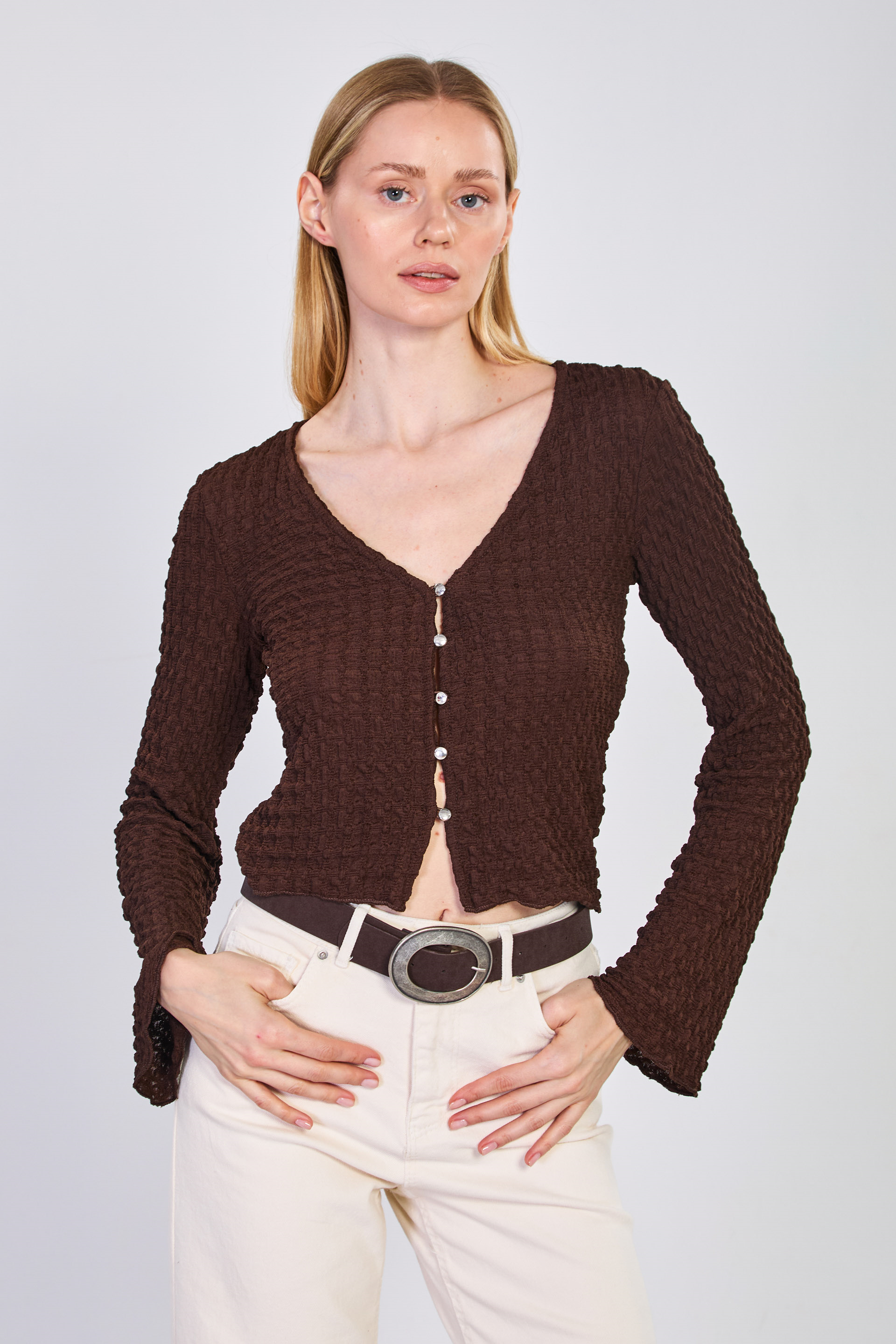 Kadın Önü Düğmeli İspanyol Kol Bluz - Acı Kahve