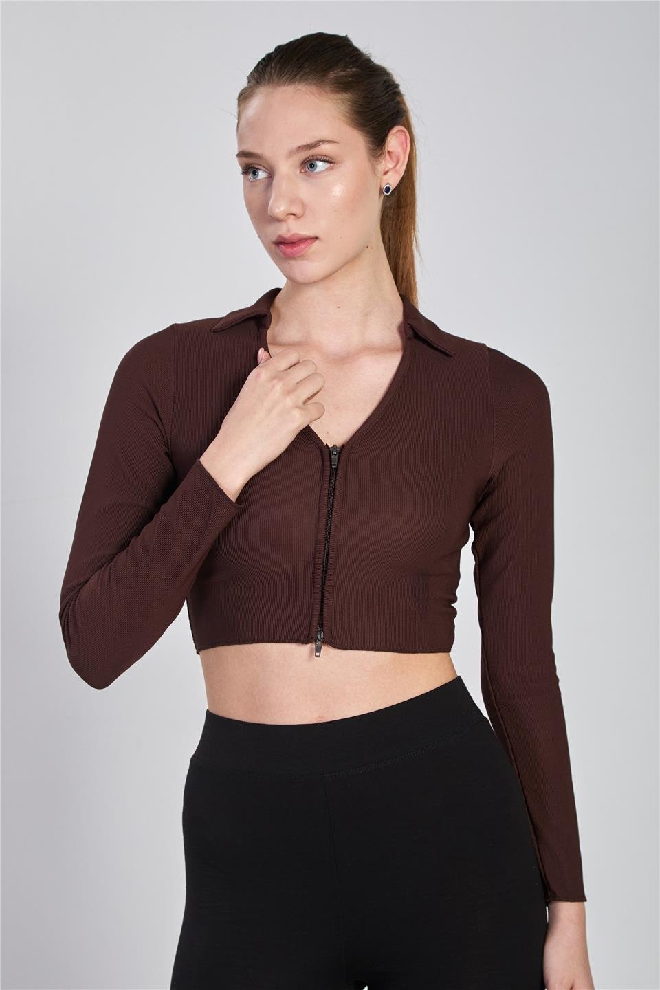 Kadın Önü Fermuarlı Uzun Kol Crop Body - Kahve
