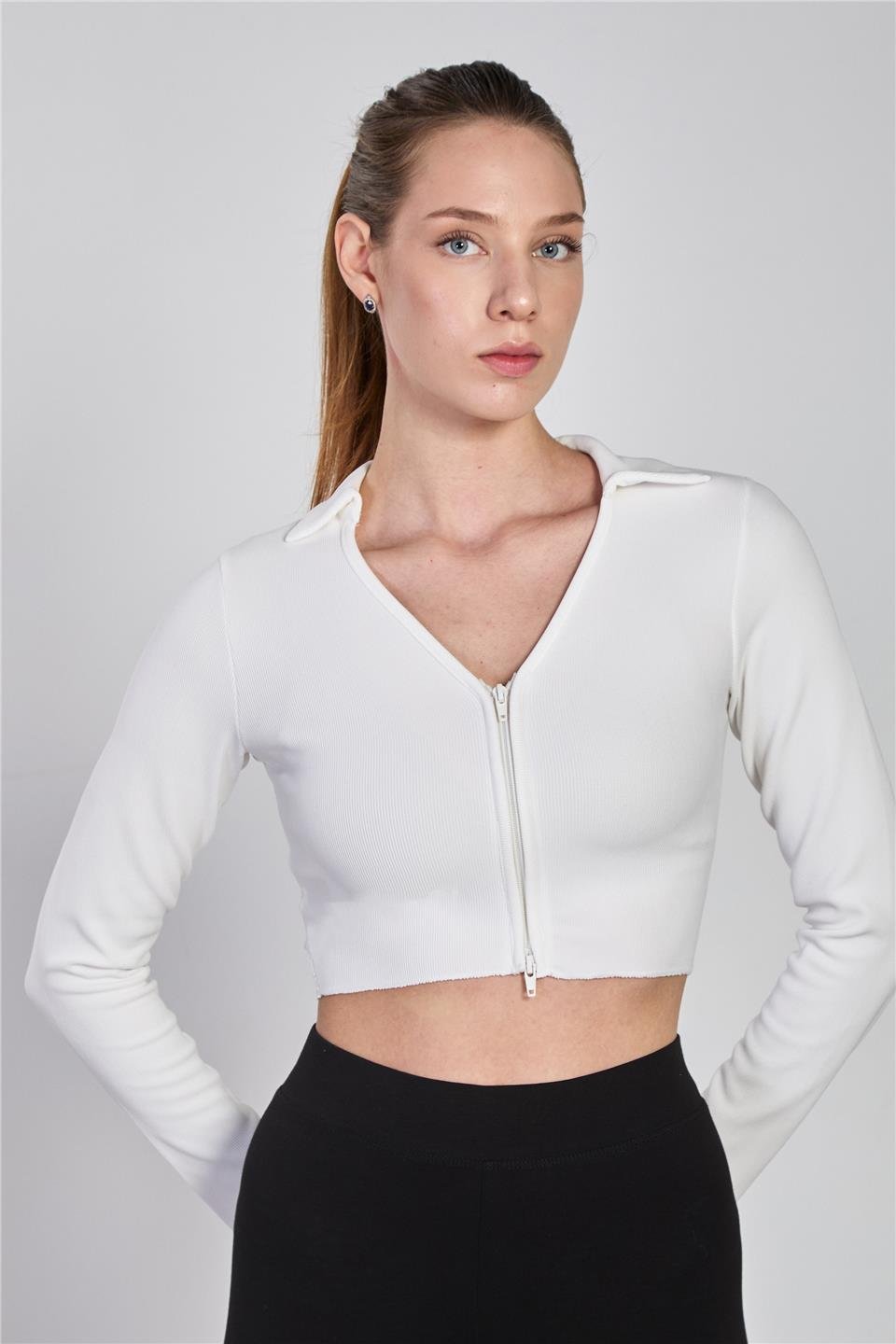 Kadın Önü Fermuarlı Uzun Kol Crop Body - Ekru