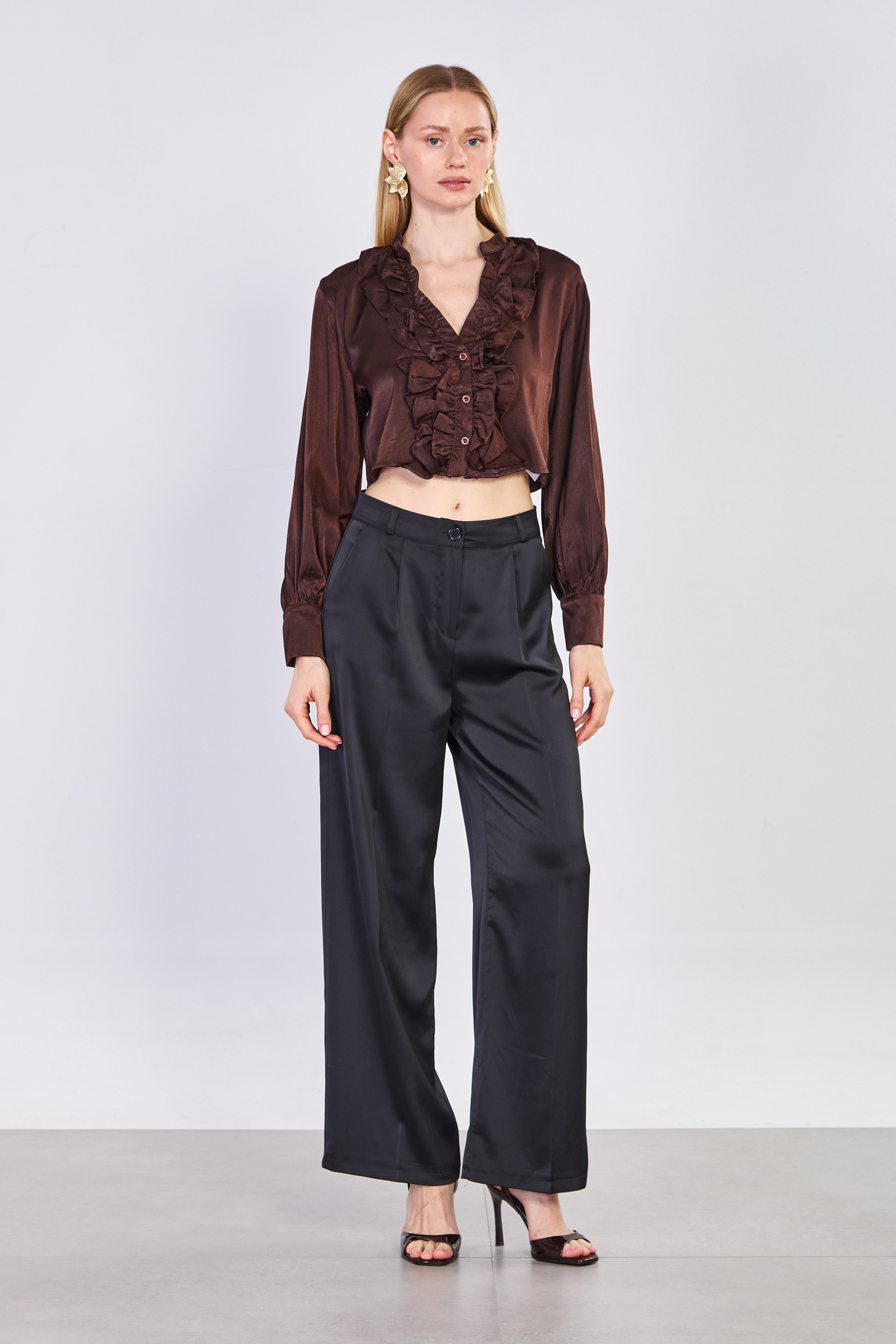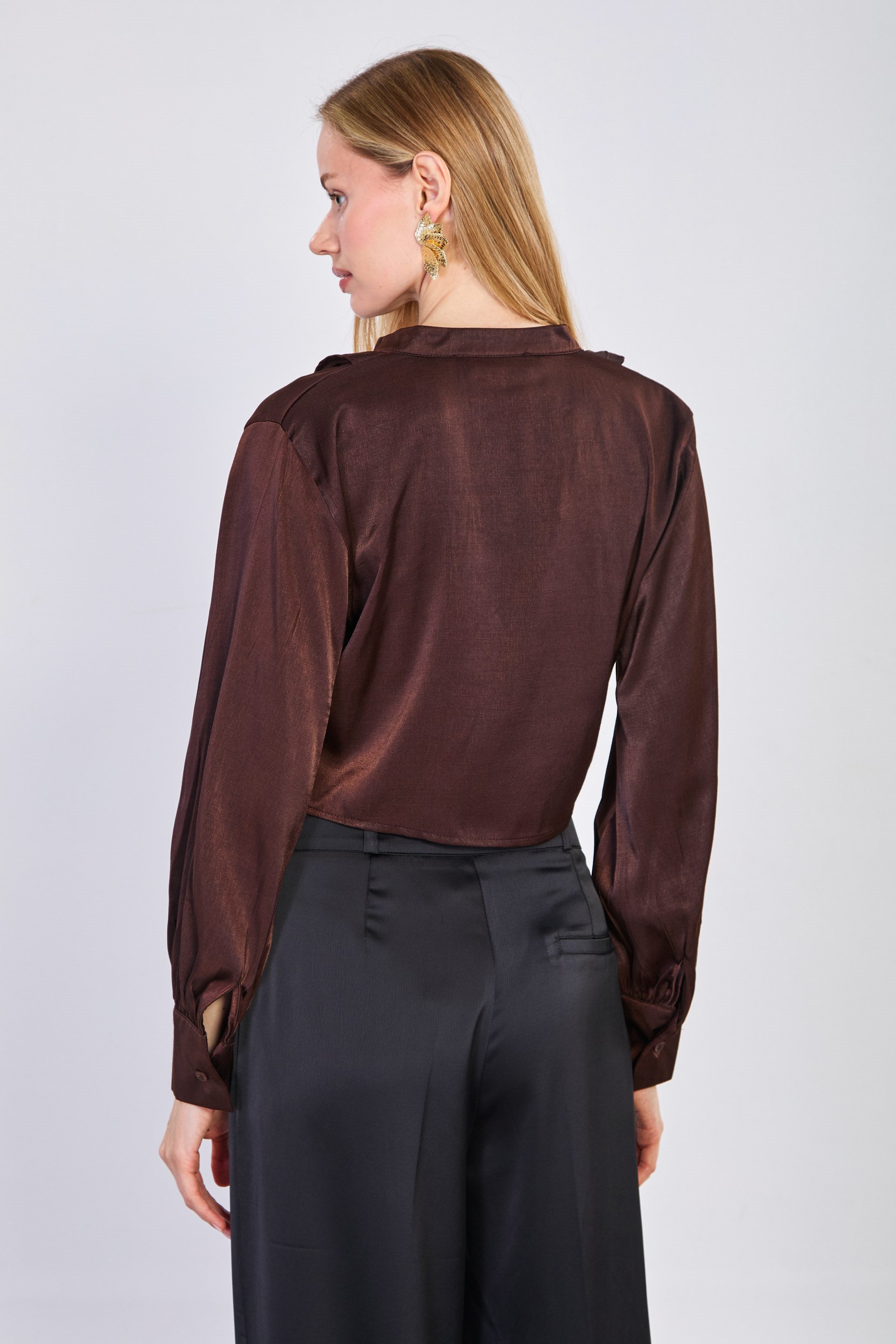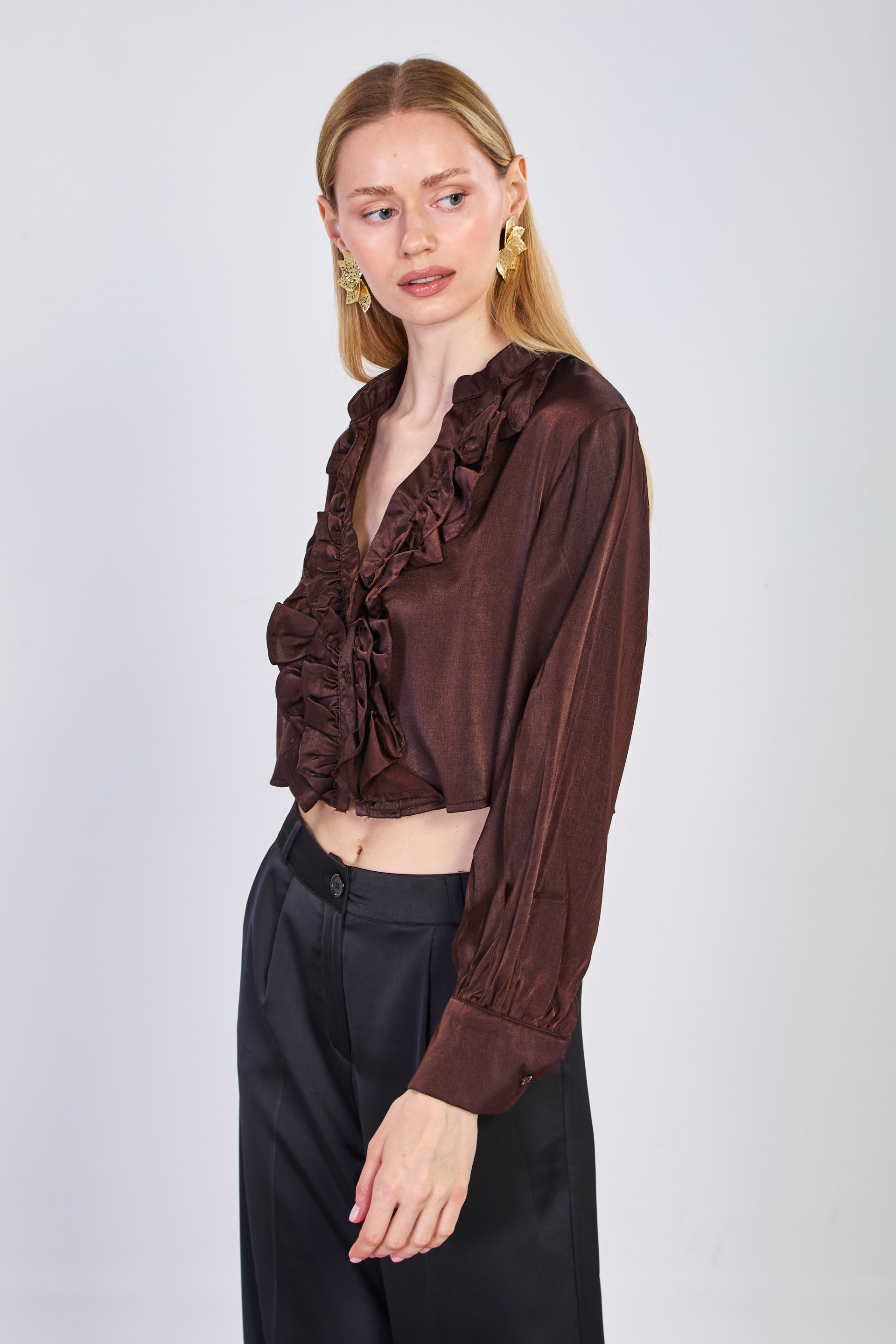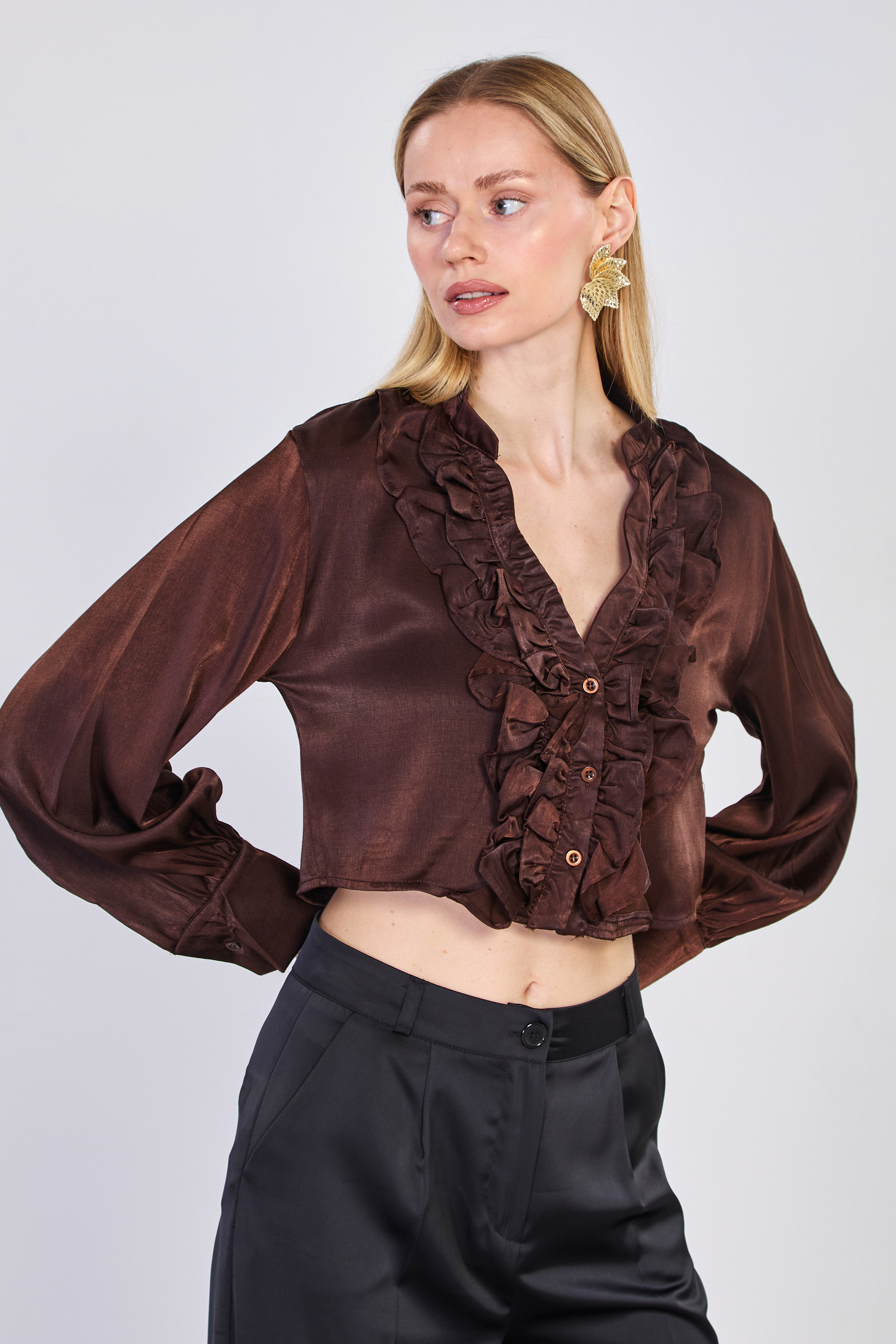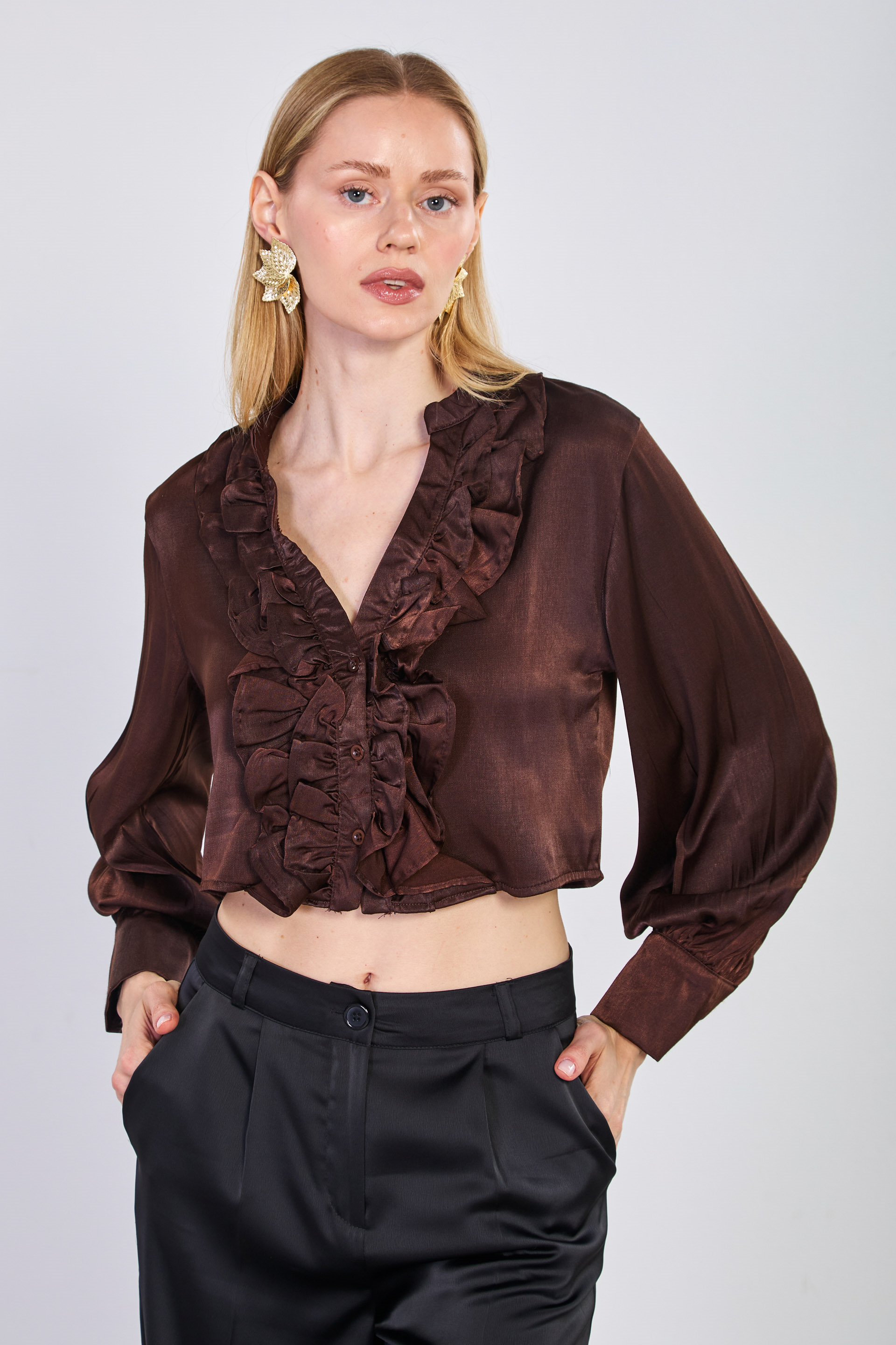 Kadın Önü Fırfırlı Saten Kısa Bluz - Acı Kahve