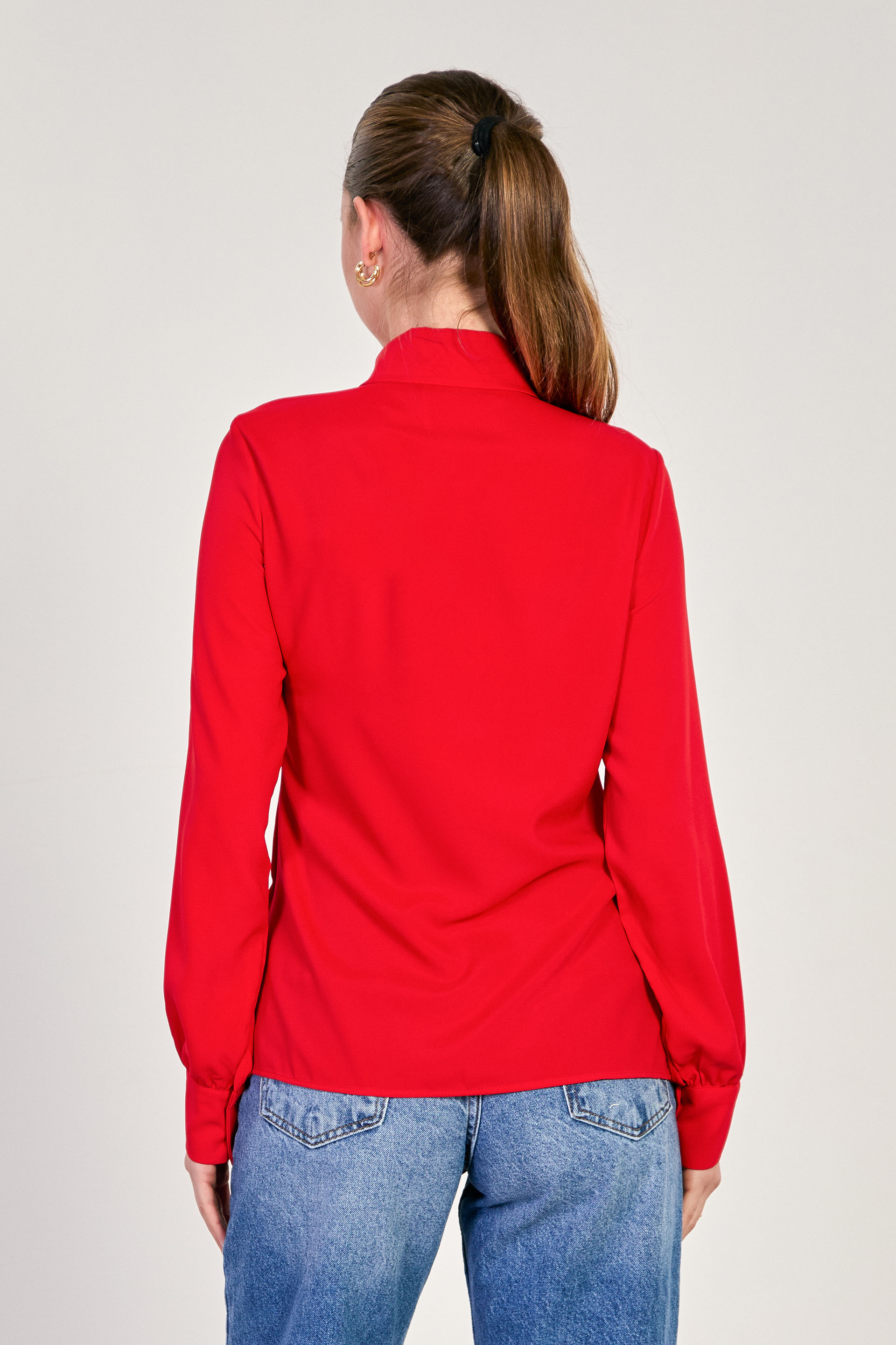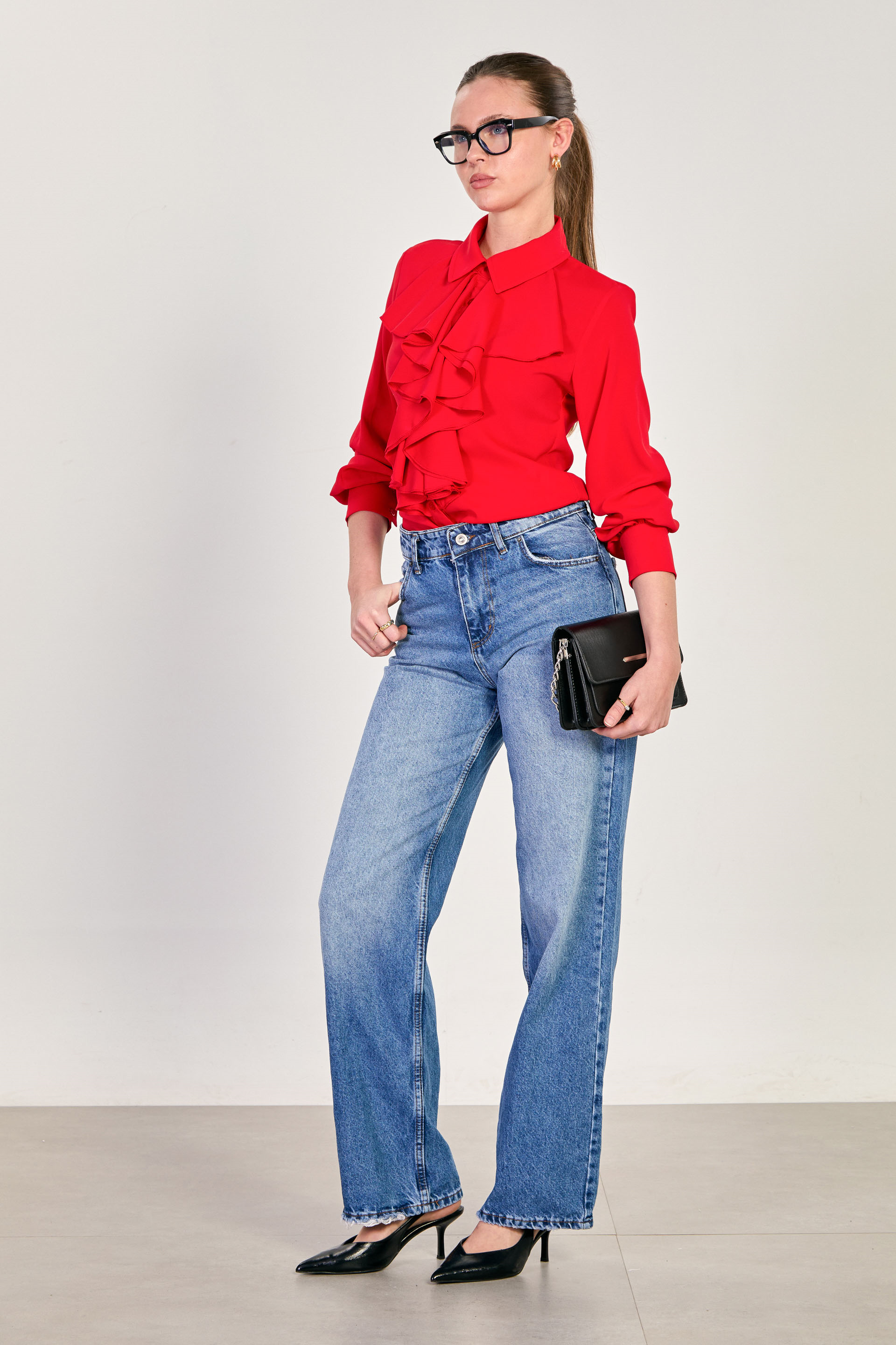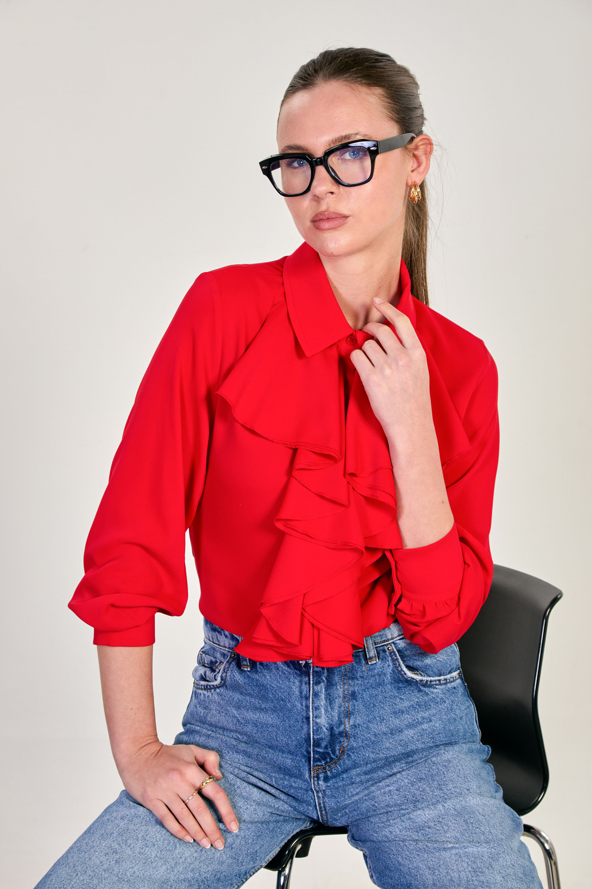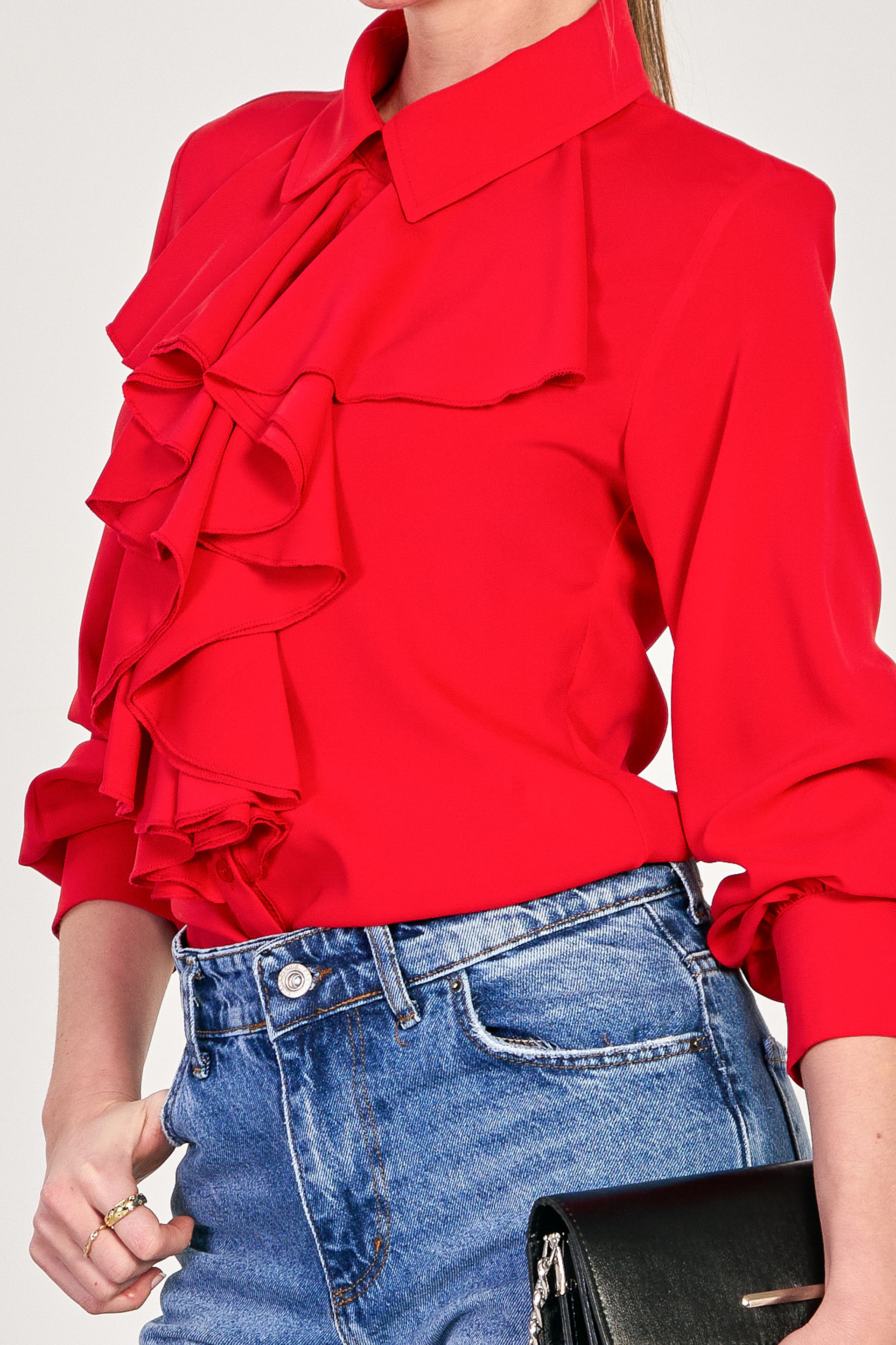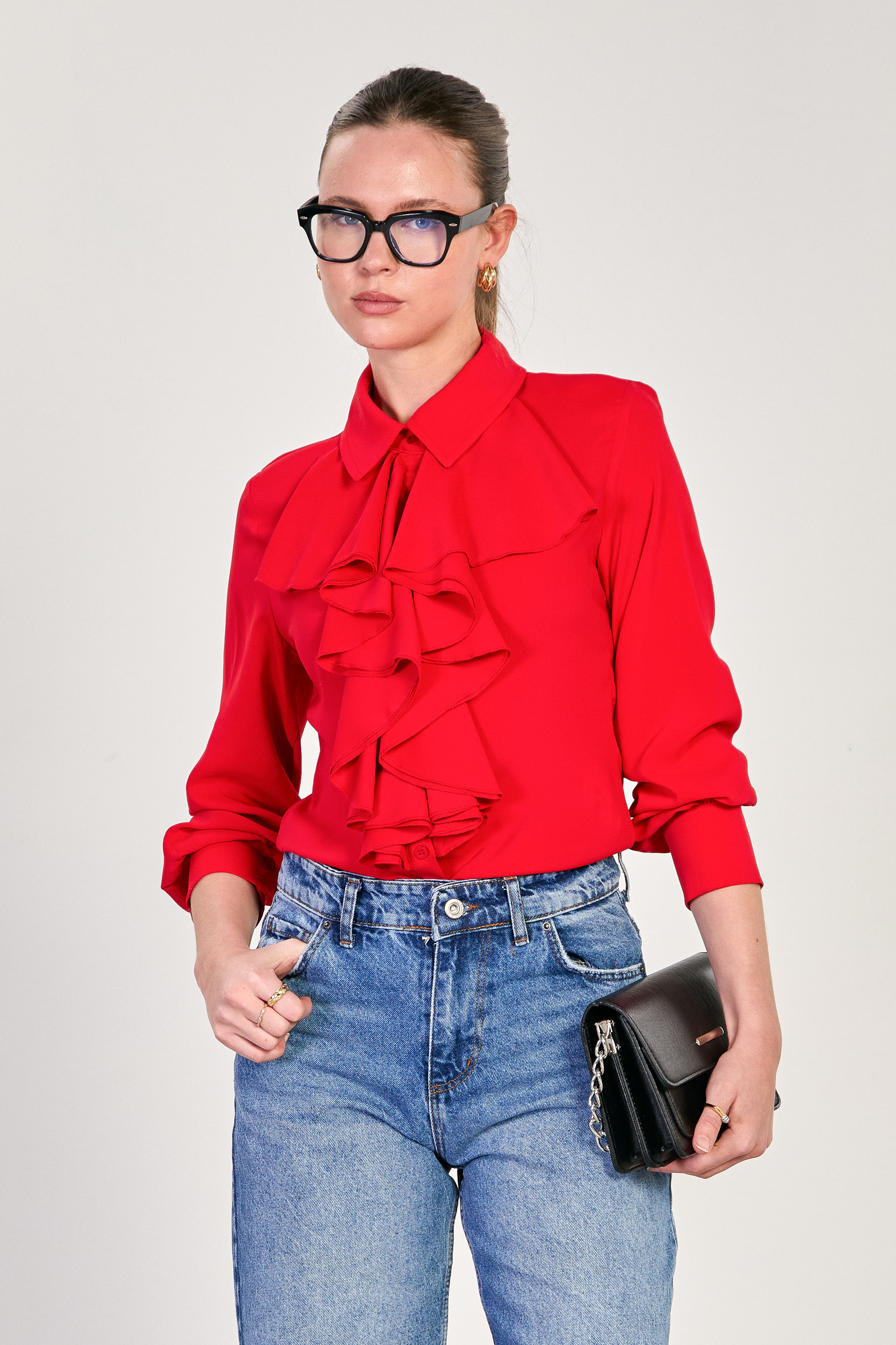 Kadın Önü Fırfırlı Uzun Kollu Gömlek - Kırmızı
