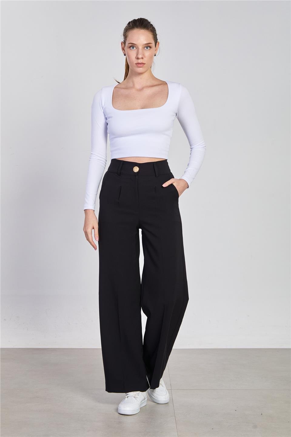 Kadın Önü Pileli Palazzo Kumaş Pantolon - Siyah