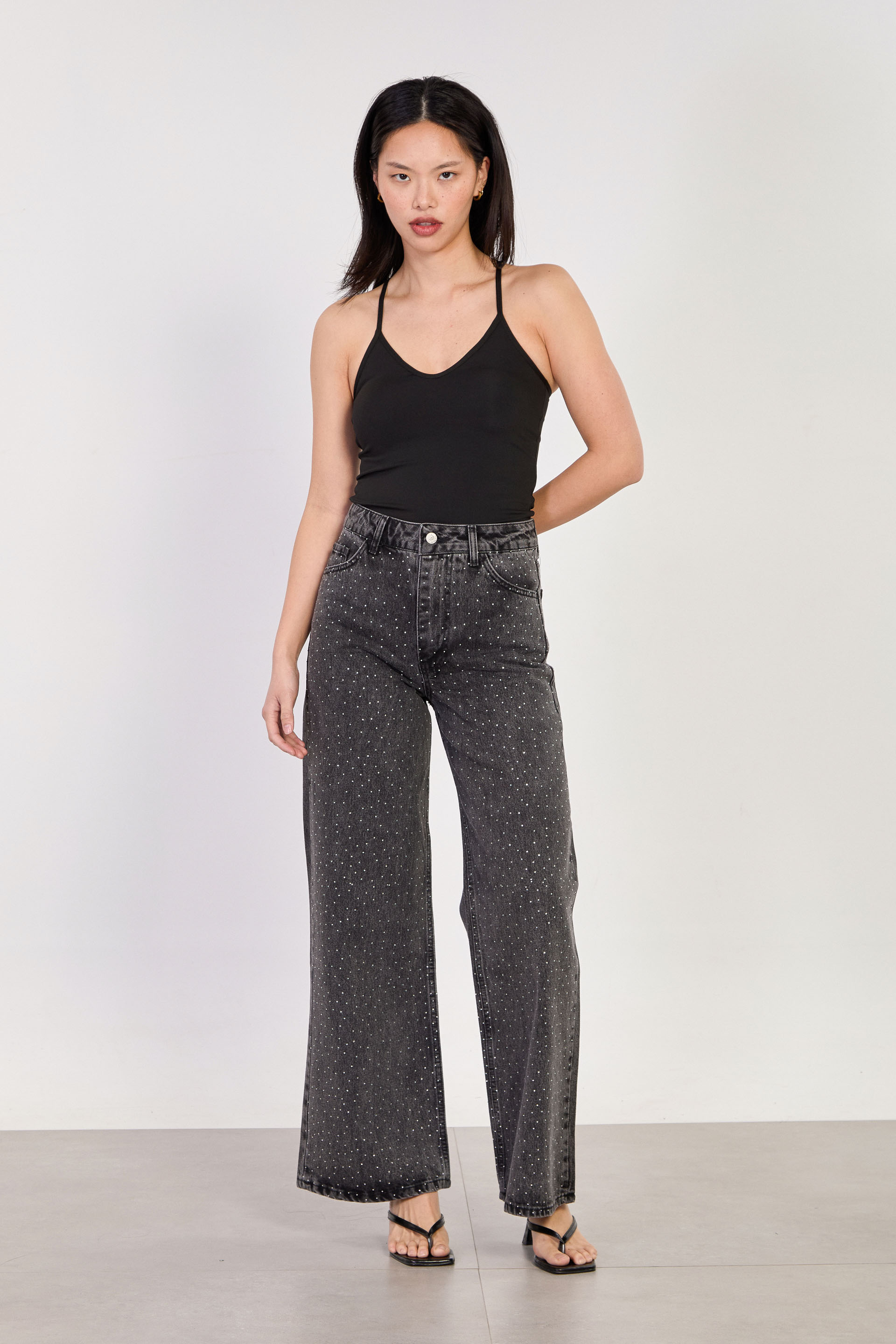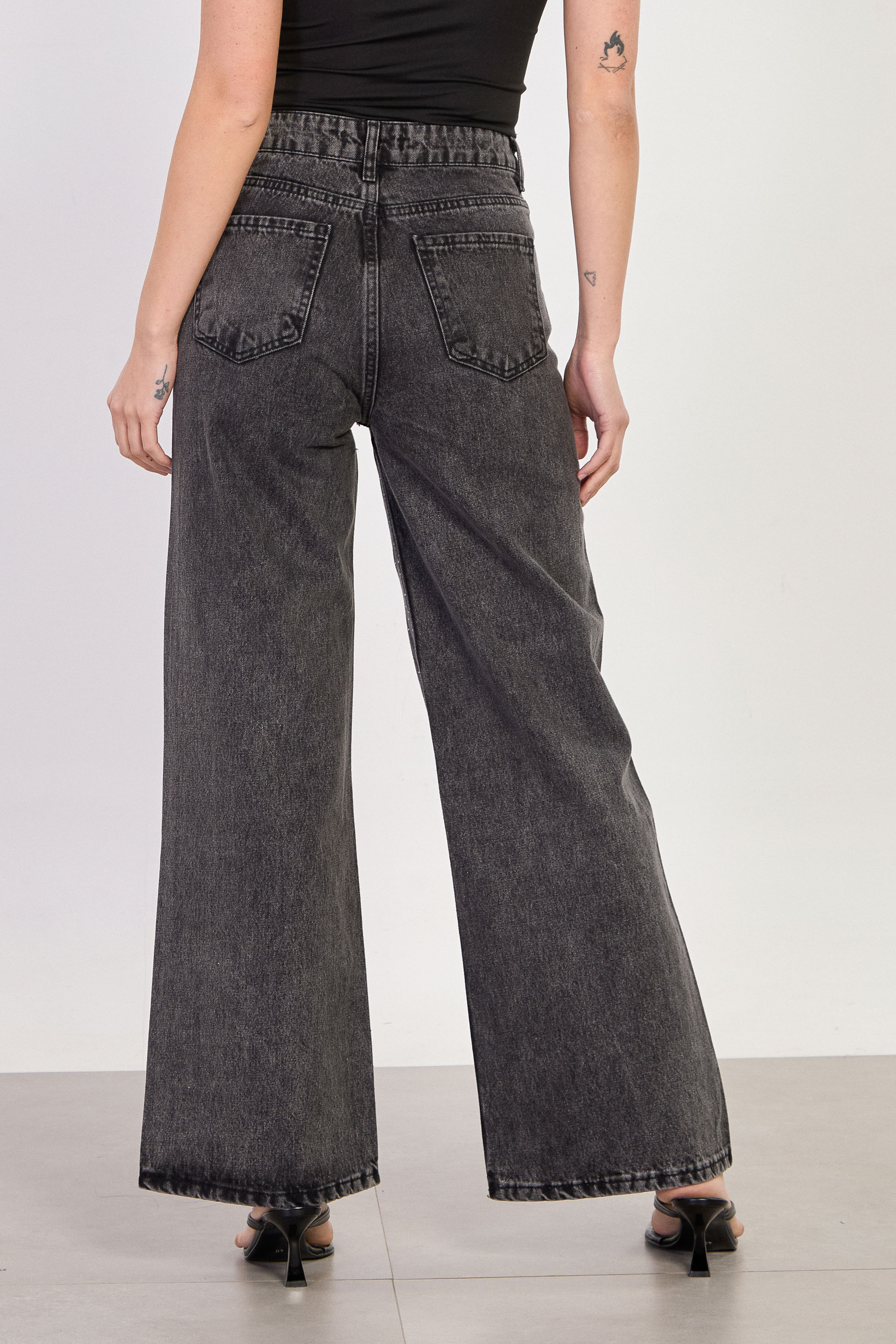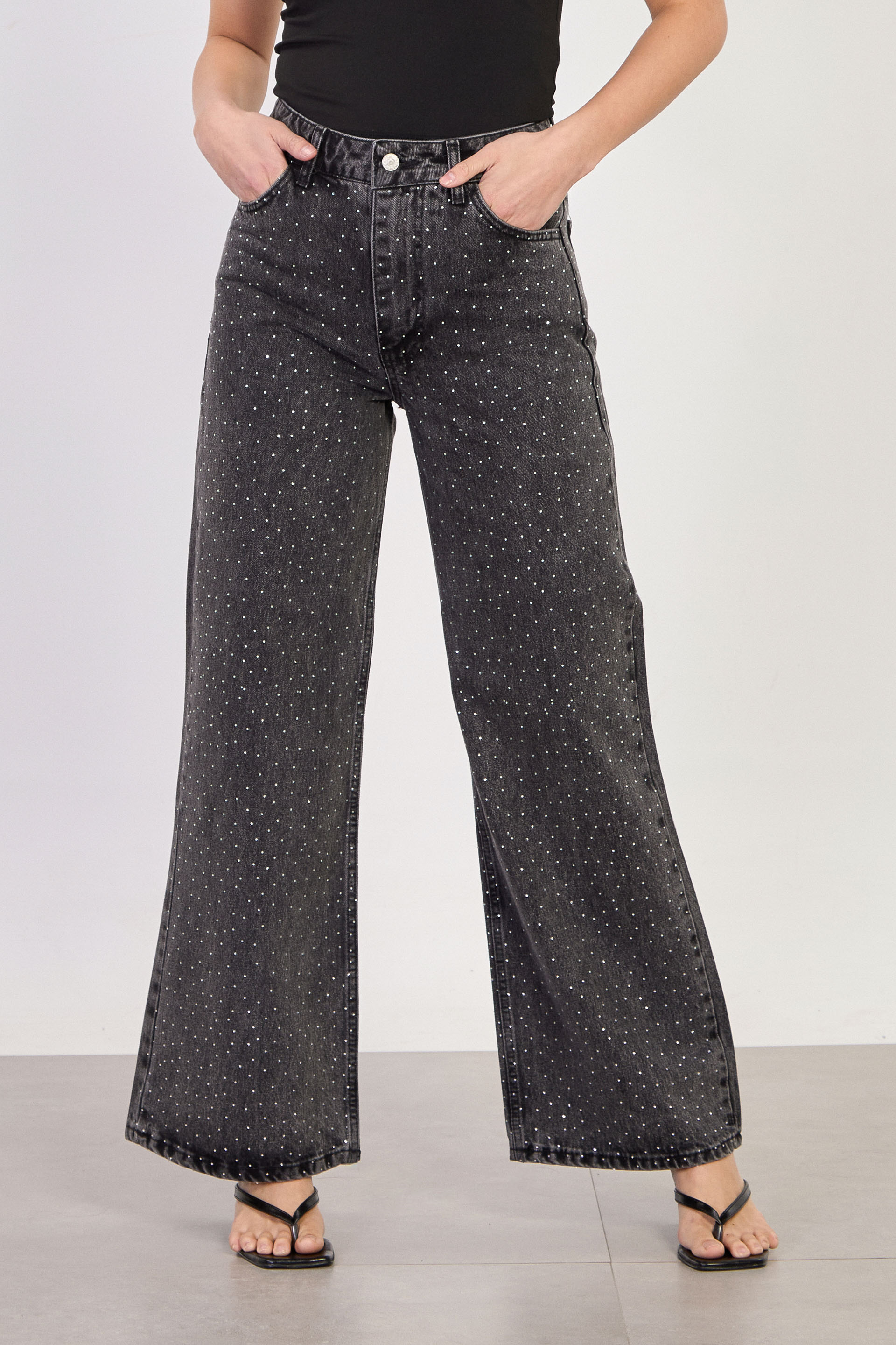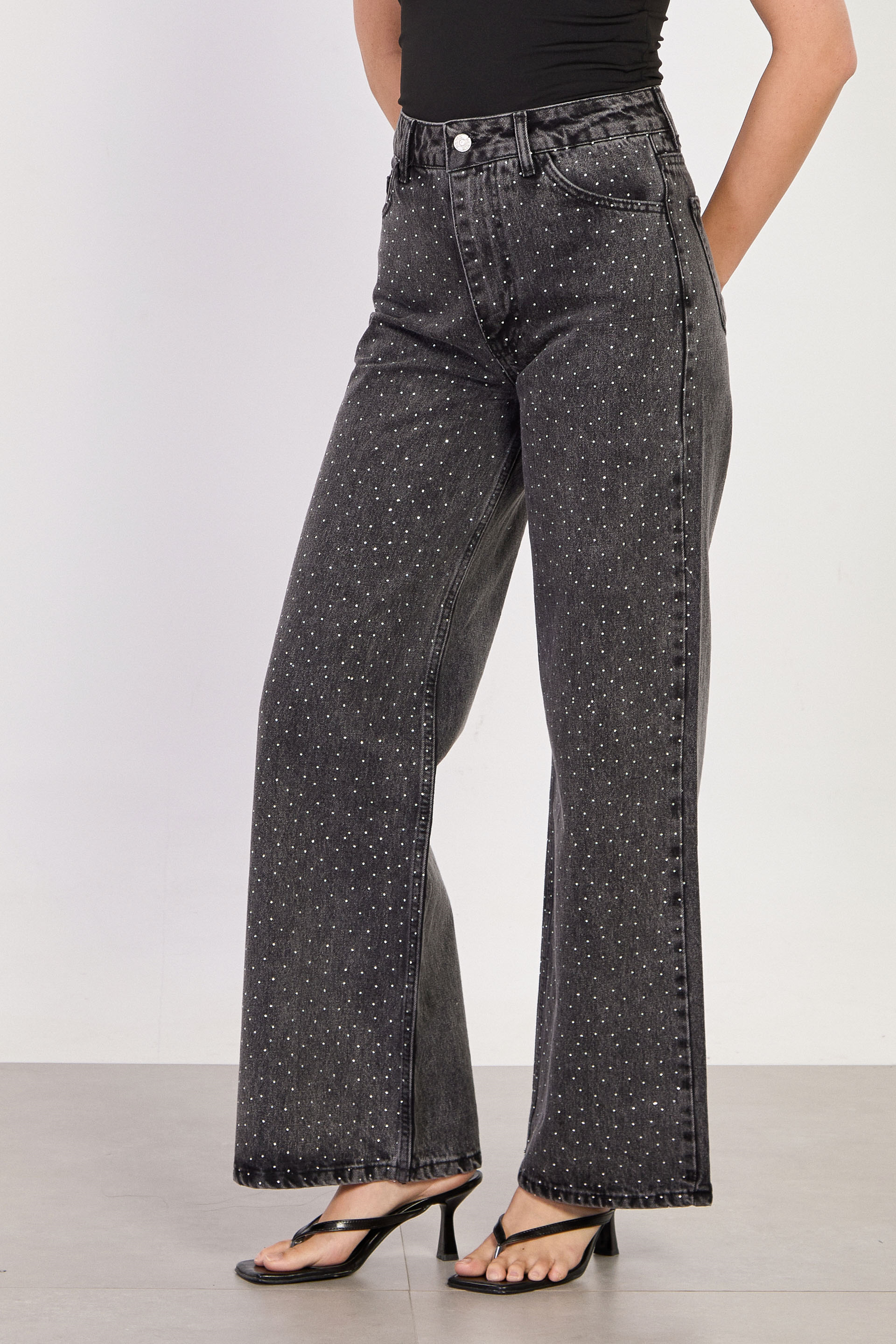 Kadın Önü Taşlı Palazzo Jean Pantolon - Siyah
