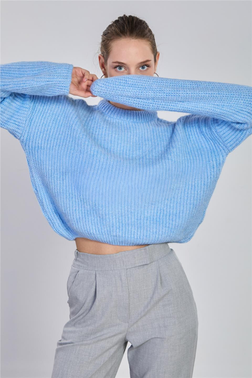 Kadın Örgülü Crop Kazak - Bebe Mavi