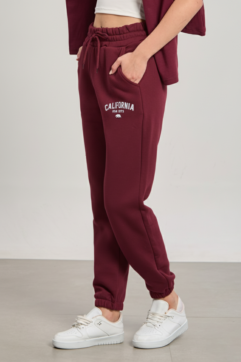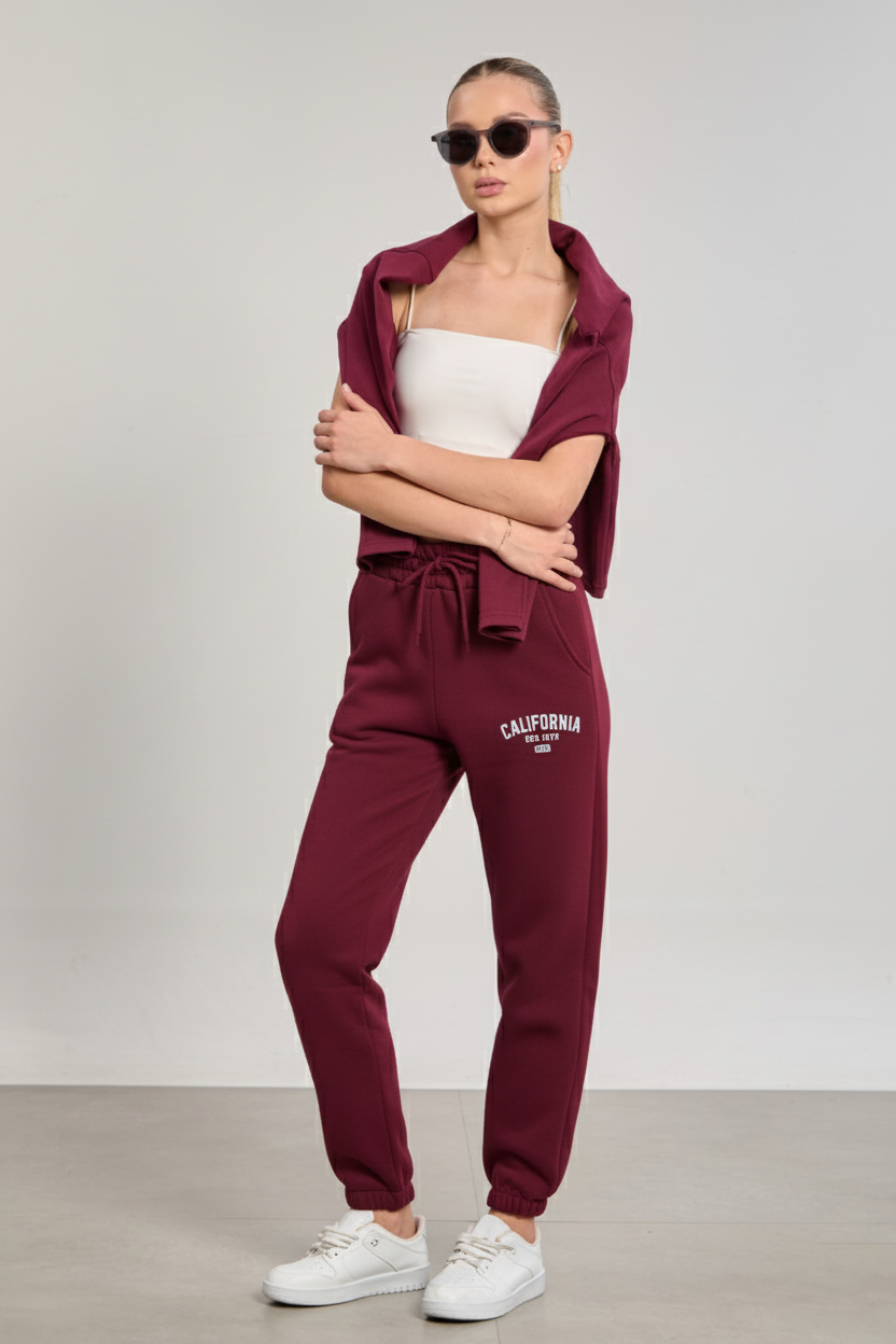 Kadın Paçası Lastikli California Basklı Eşofman Altı - Bordo