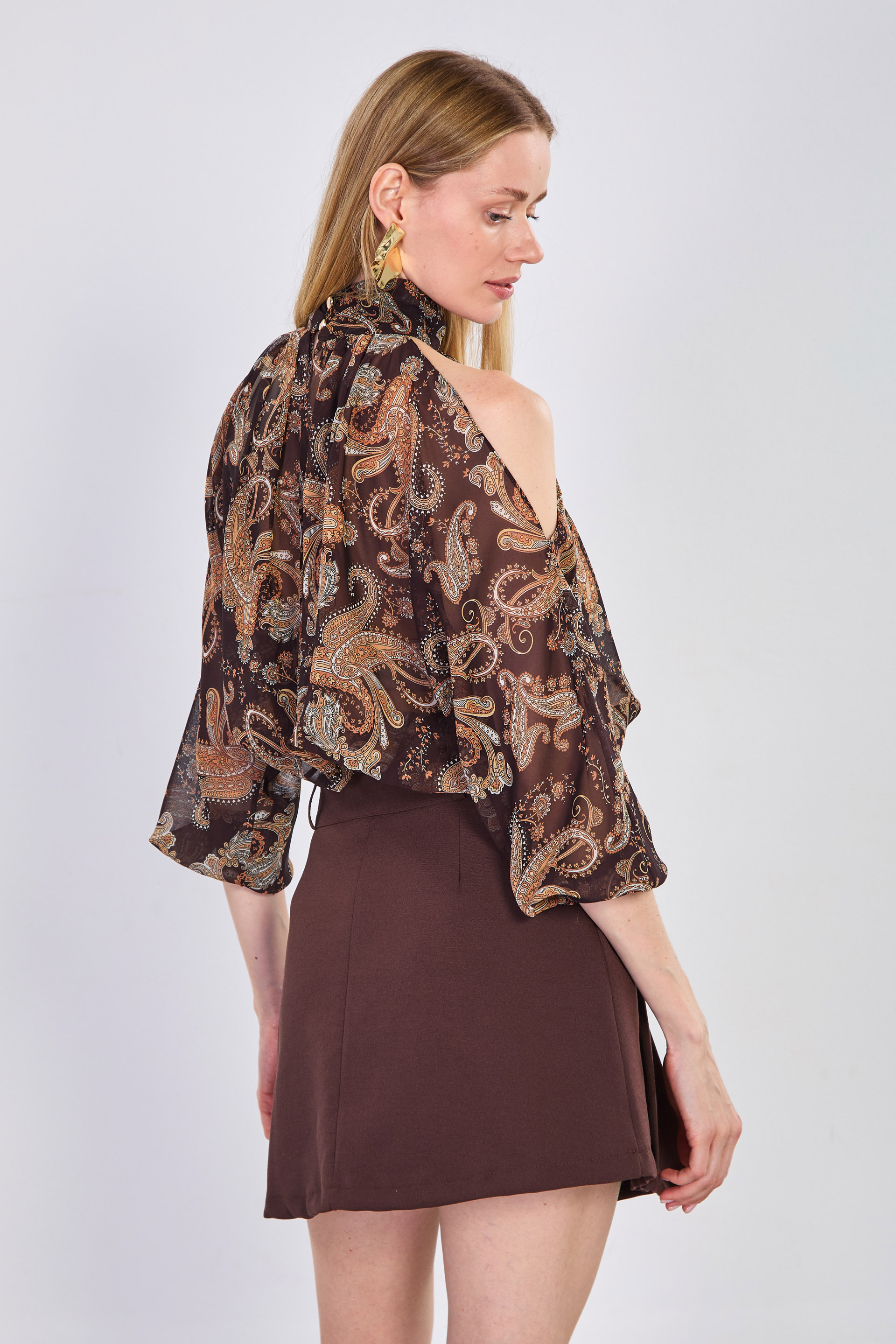 Kadın Paisley Desenli Omzu Açık Bluz - Acı Kahve