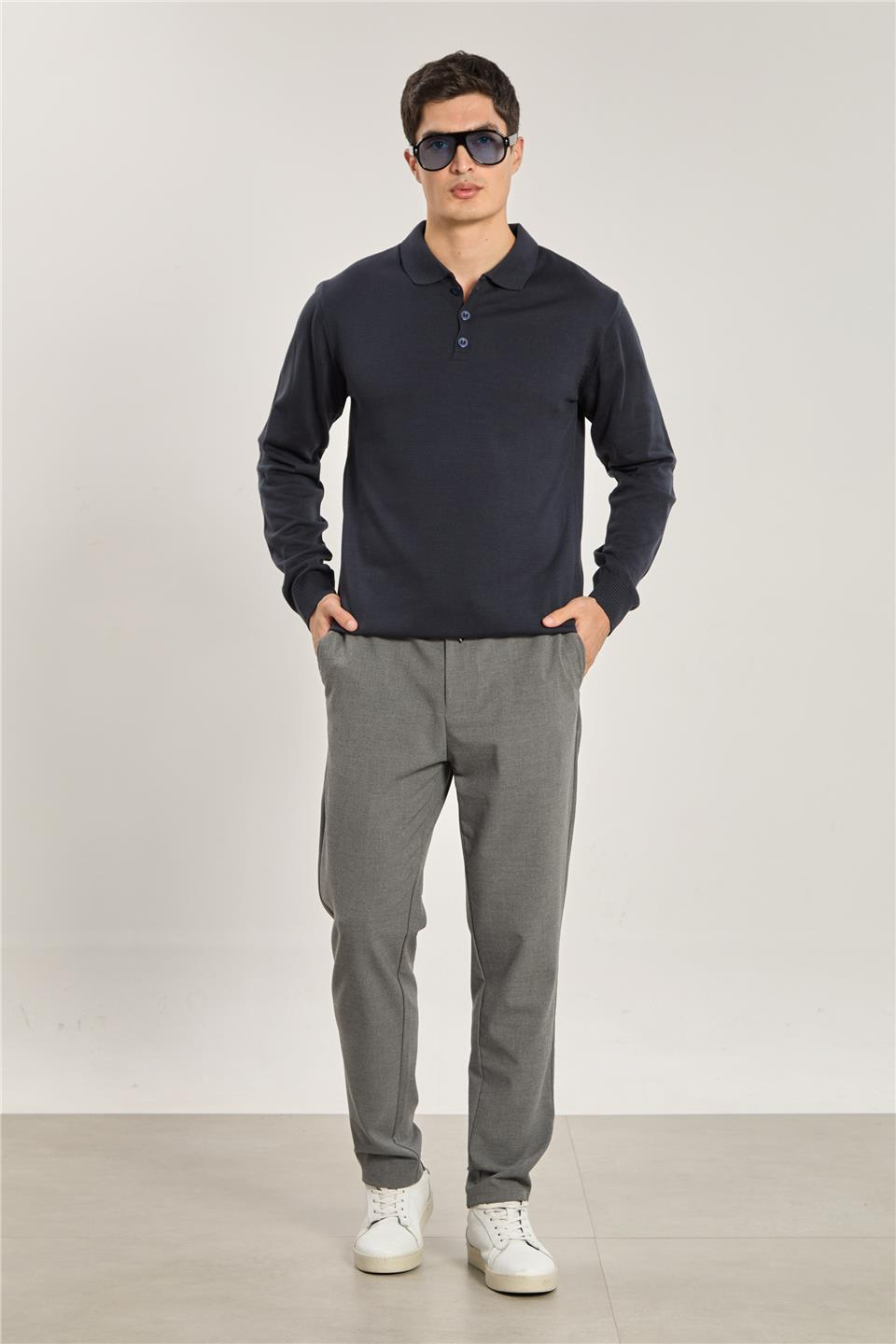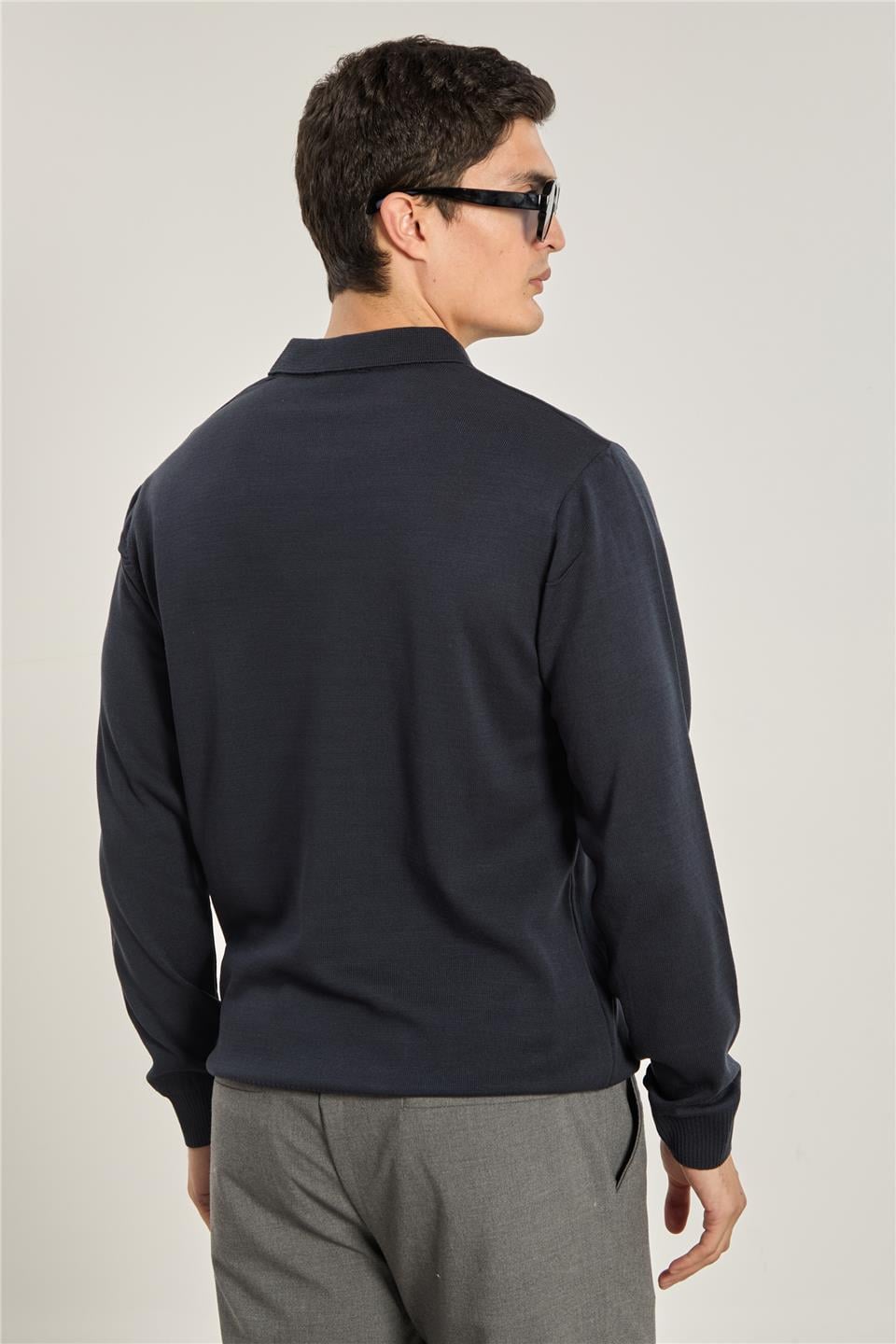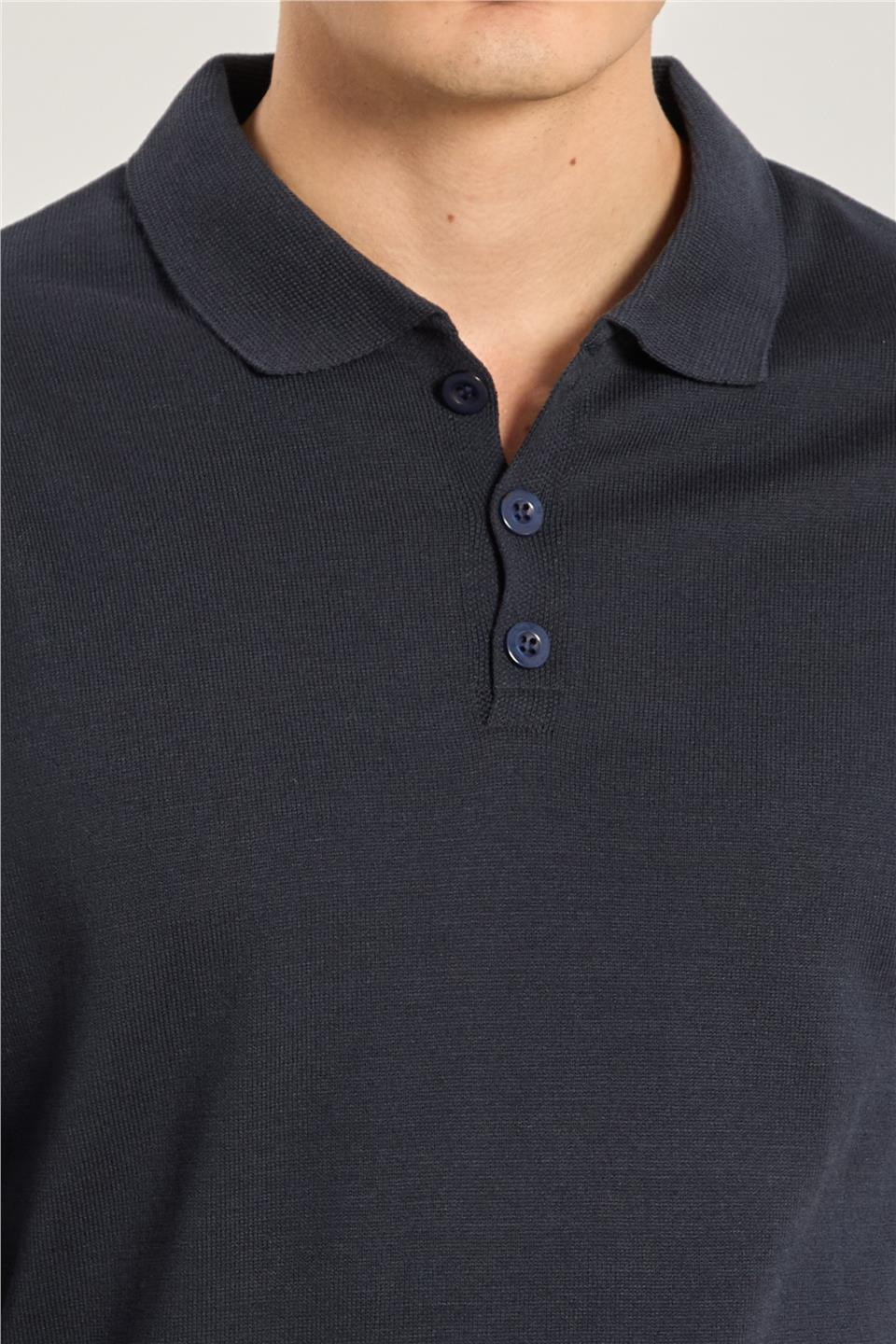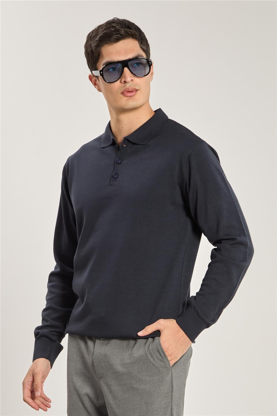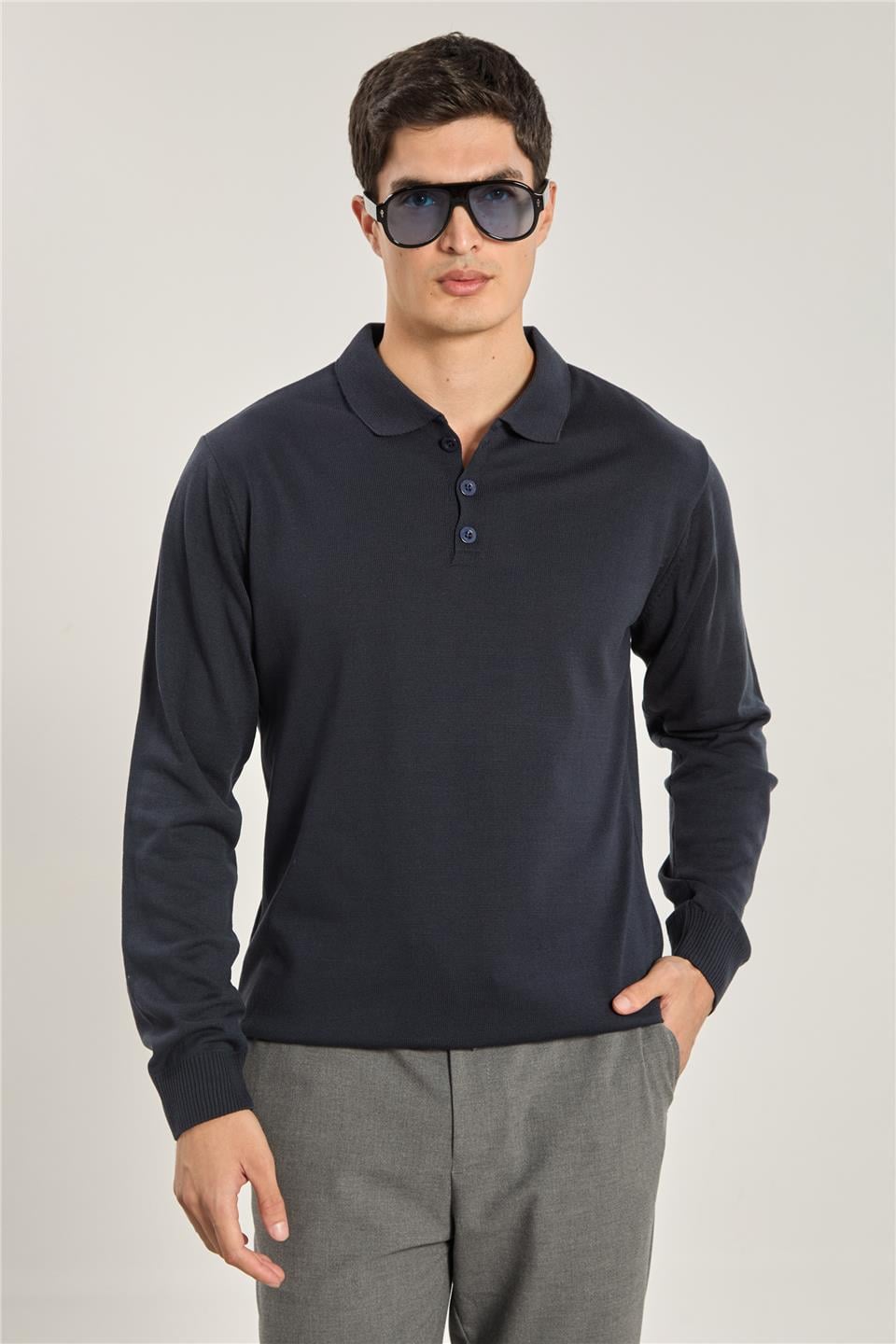 Erkek Polo Yaka Düğmeli Triko Kazak - Koyu Lacivert