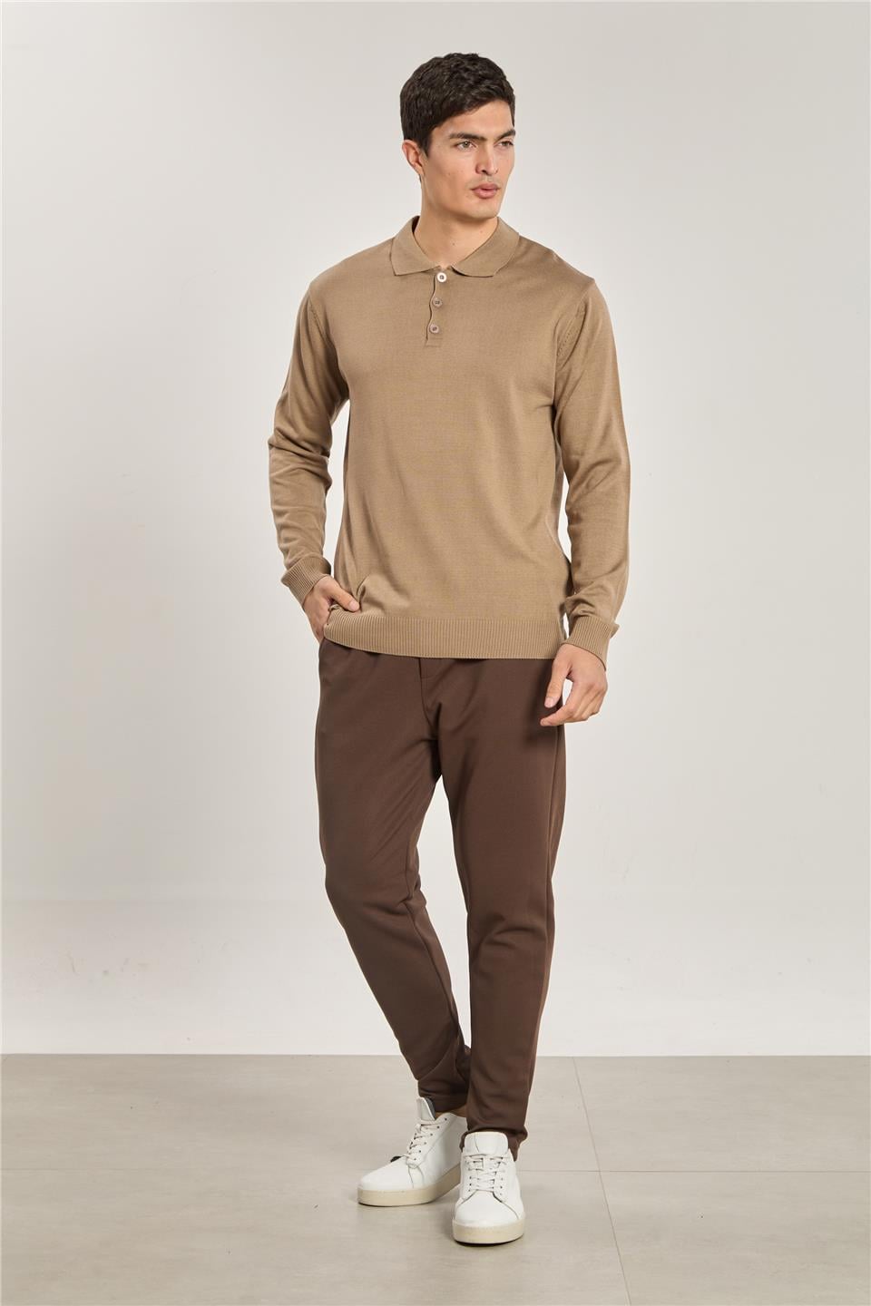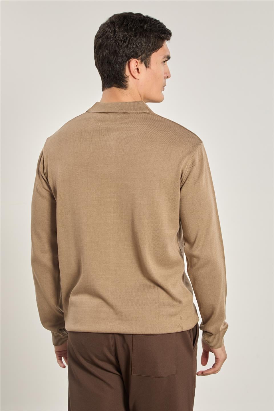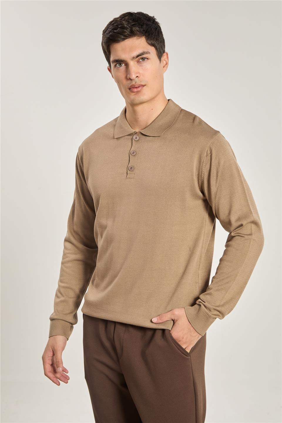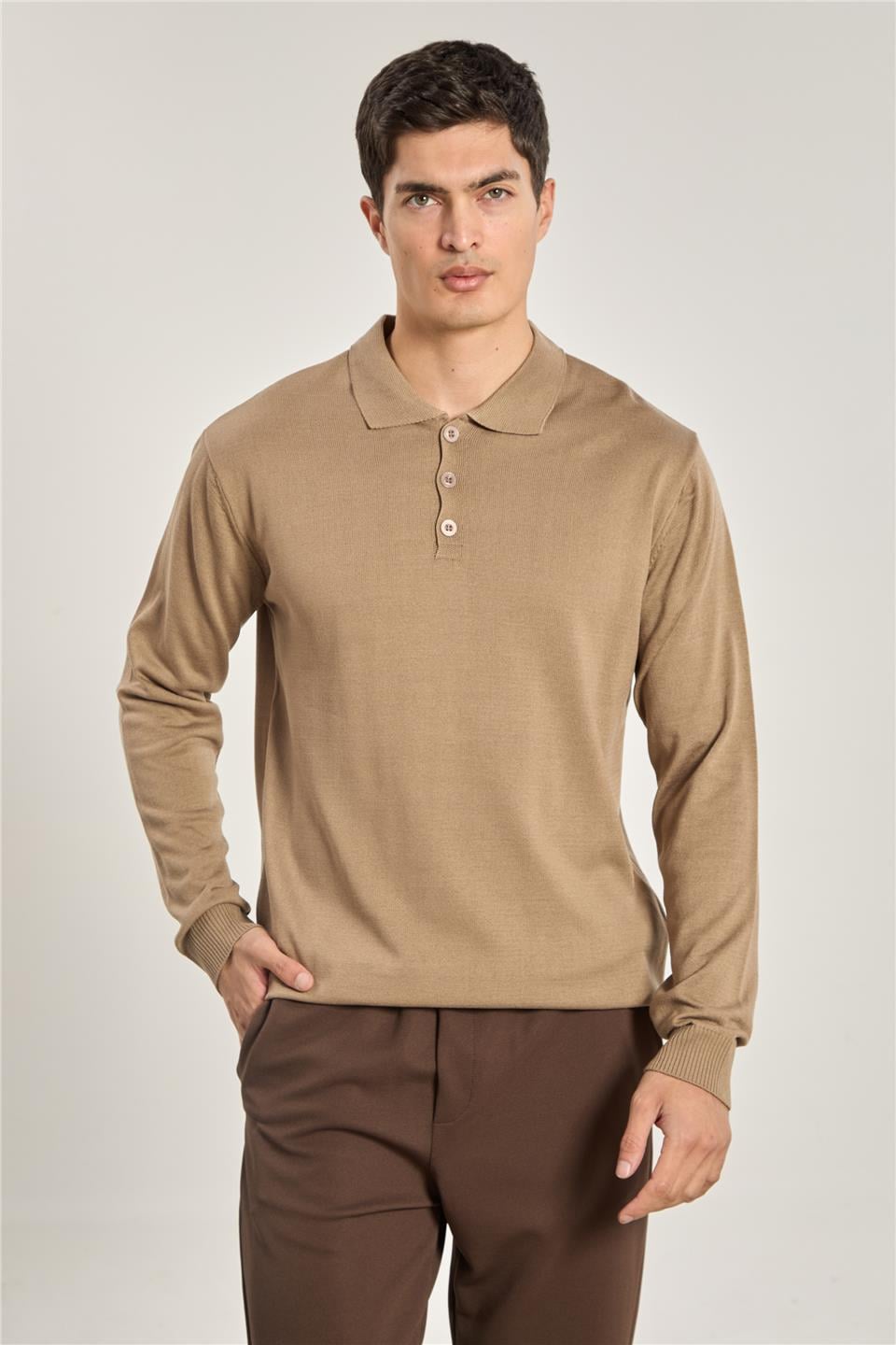Erkek Polo Yaka Düğmeli Triko Kazak - Vizon