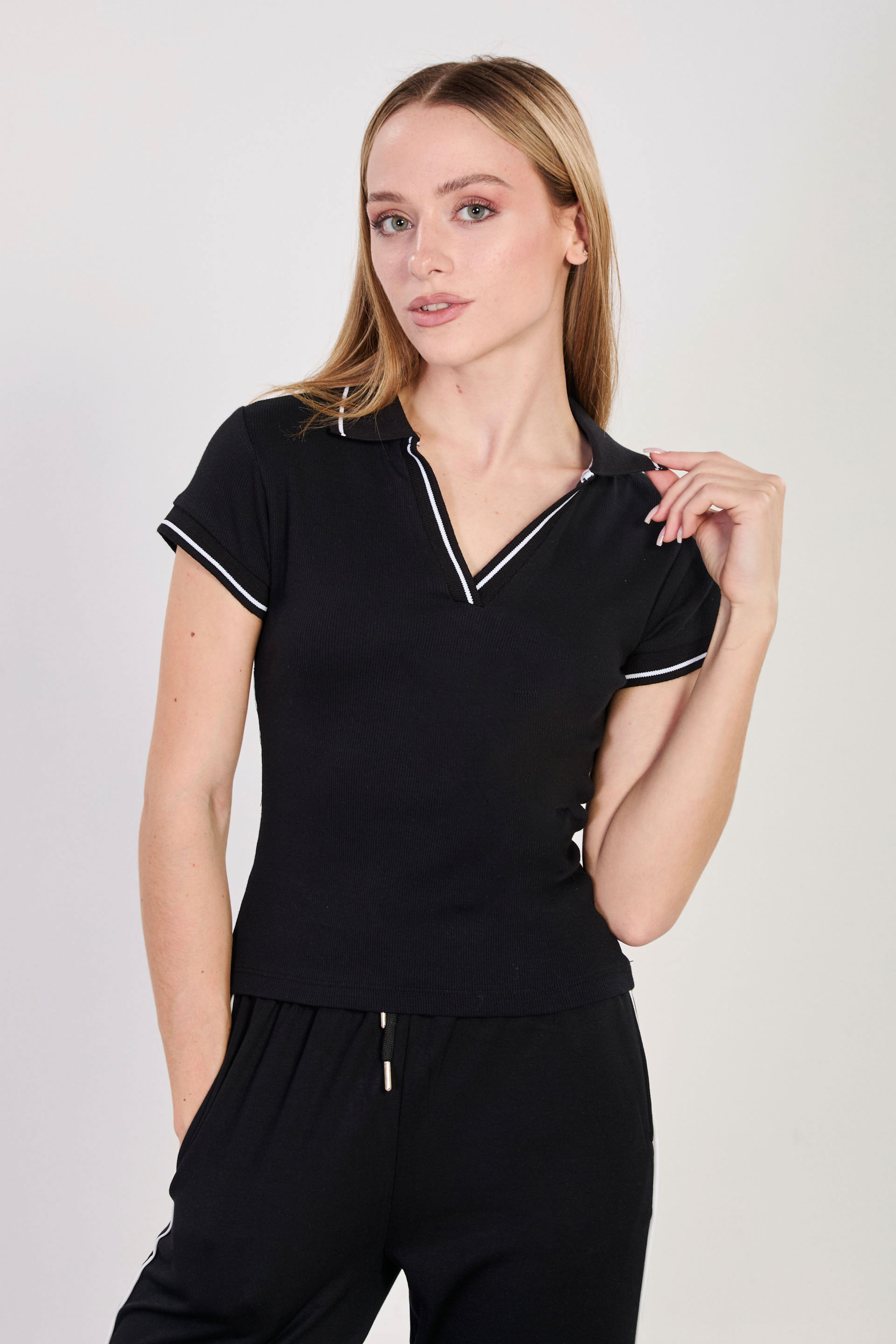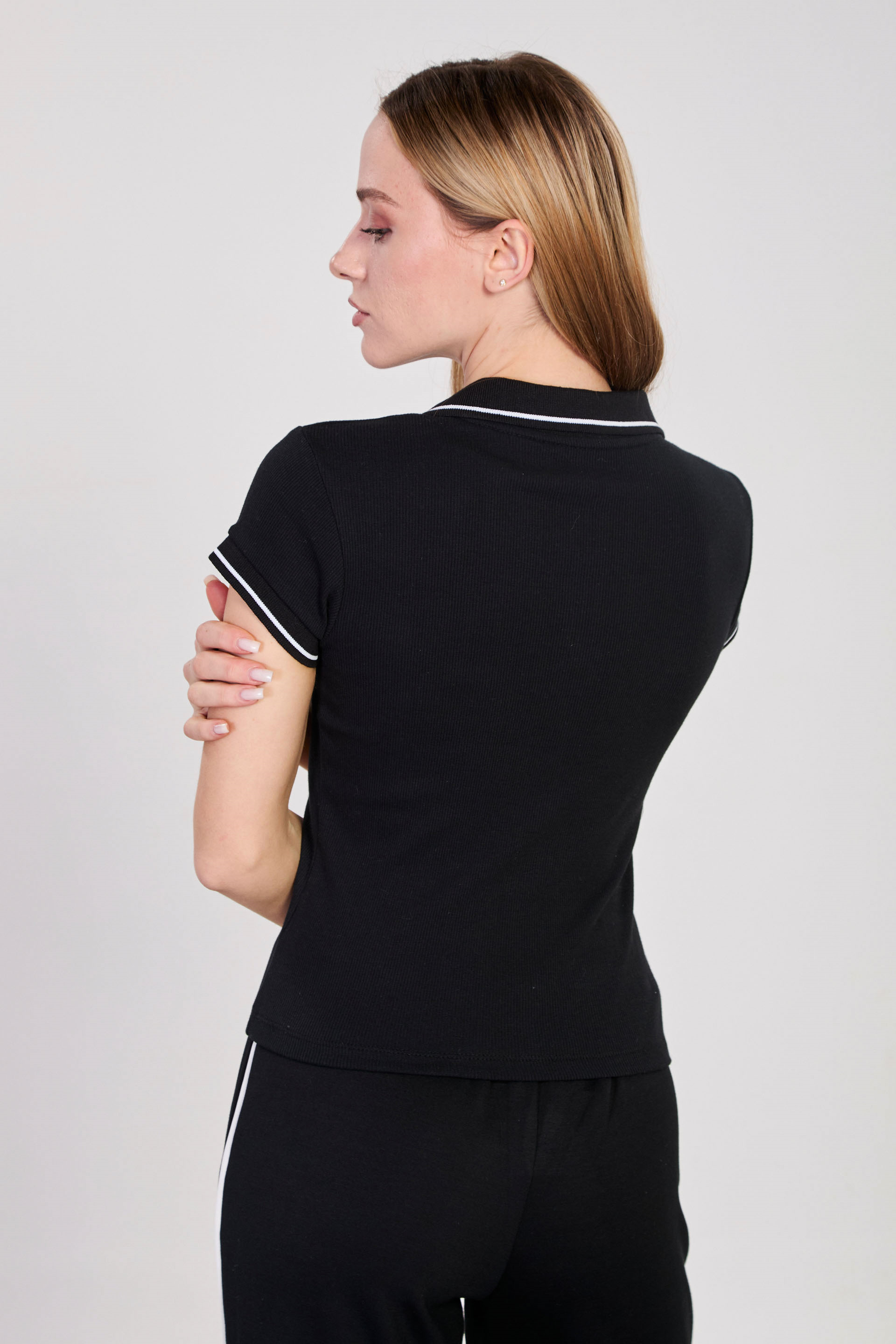 Kadın Polo Yaka Fitilli Body - Siyah/Beyaz