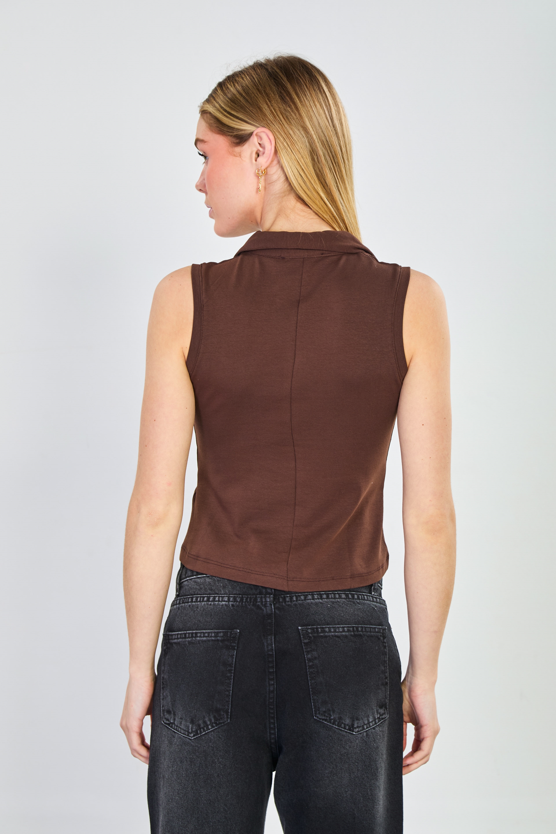 Kadın Polo Yaka Önü Fermuarlı Kolsuz Body - Bej