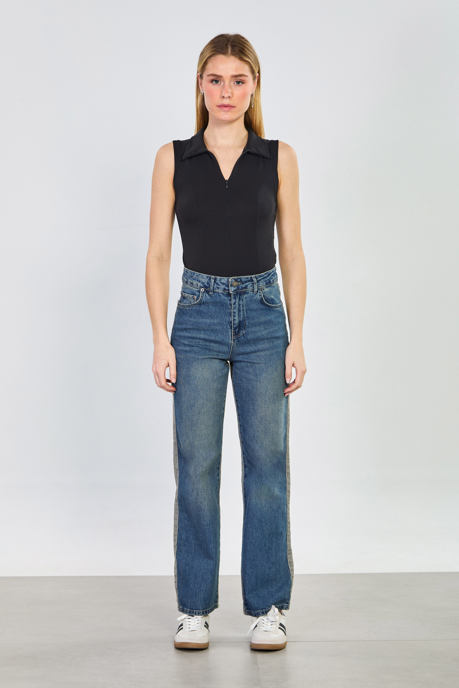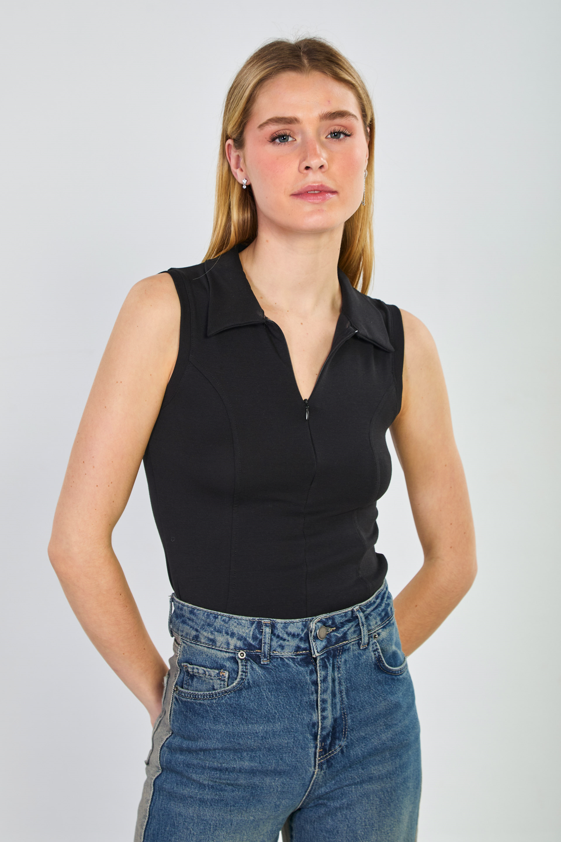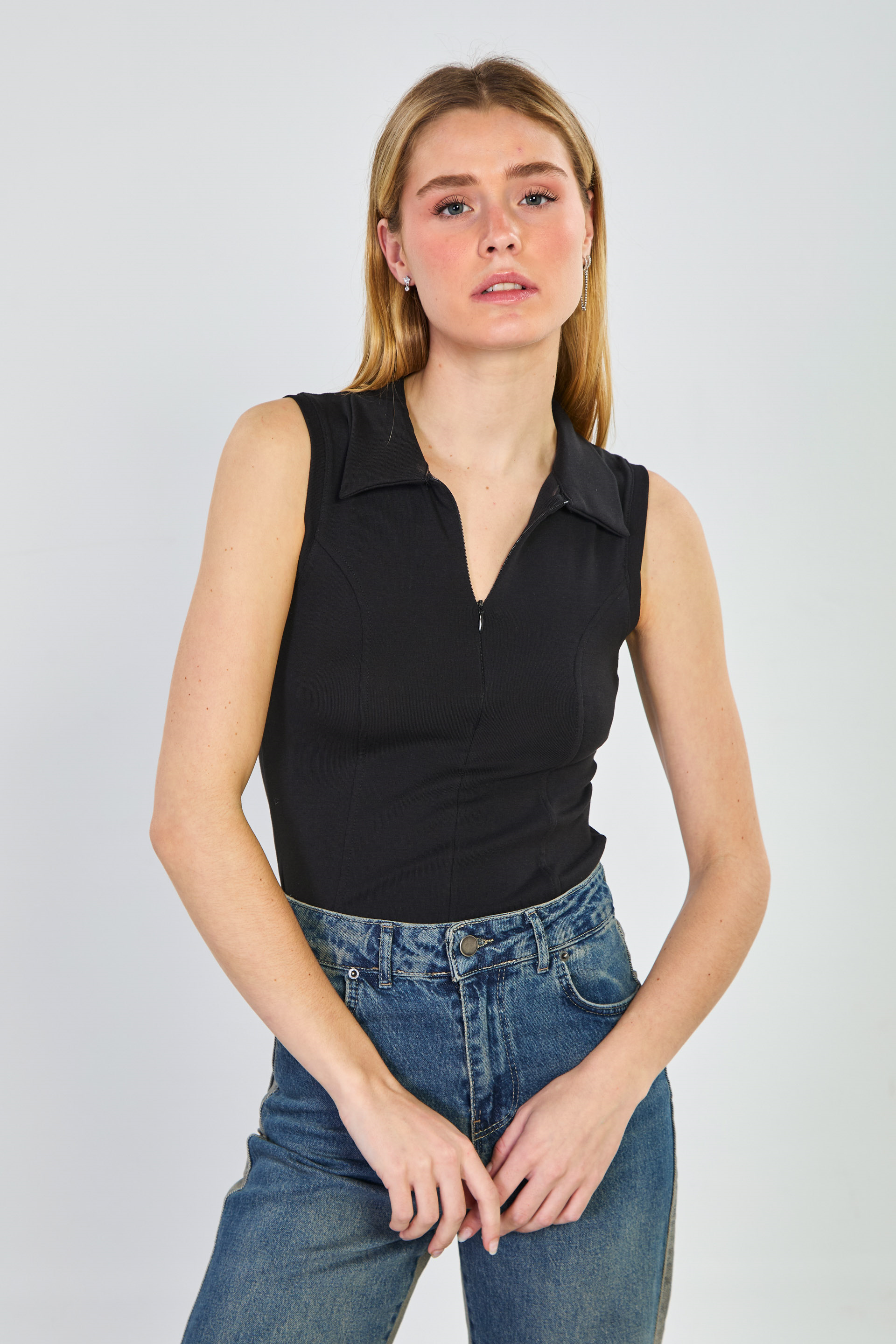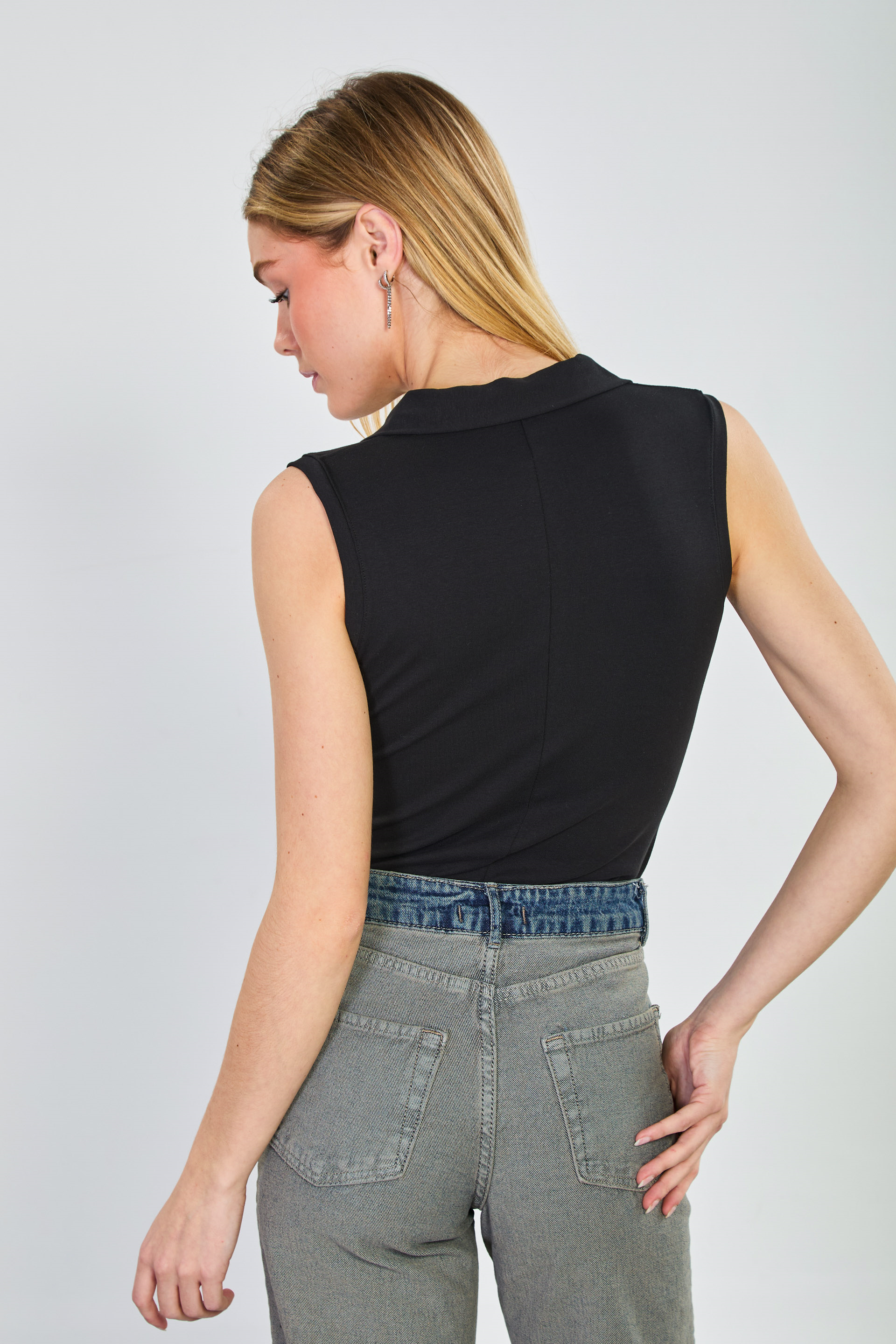 Kadın Polo Yaka Önü Fermuarlı Kolsuz Body - Siyah