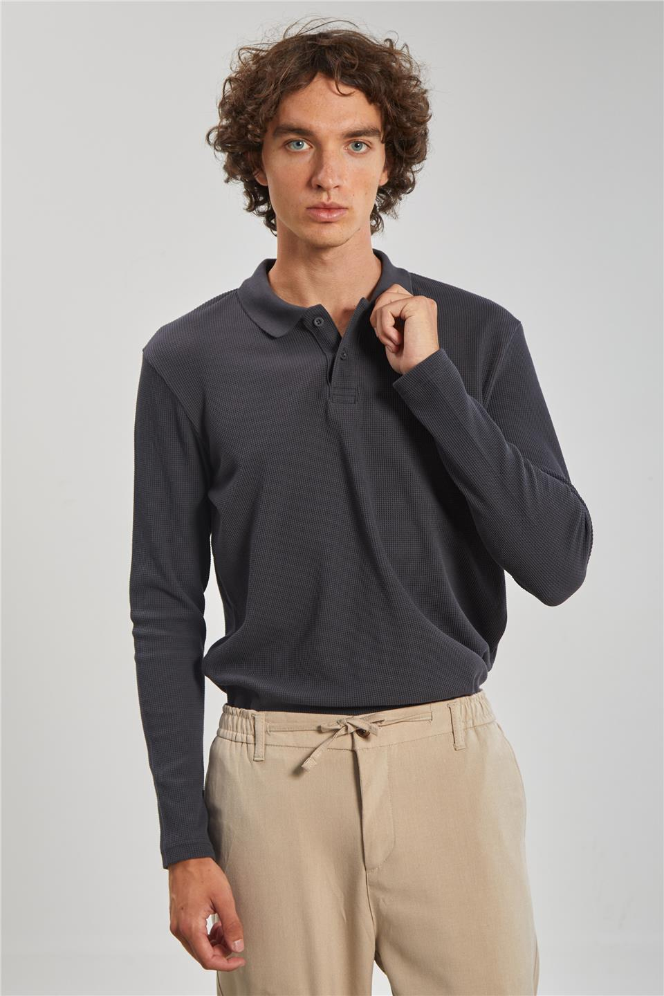 Erkek Polo Yaka Waffle Sweatshirt - Antrasit