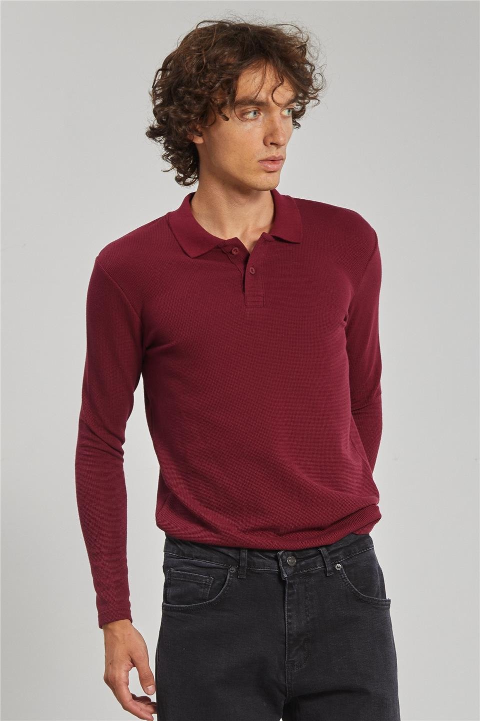 Erkek Polo Yaka Waffle Sweatshirt - Vişne