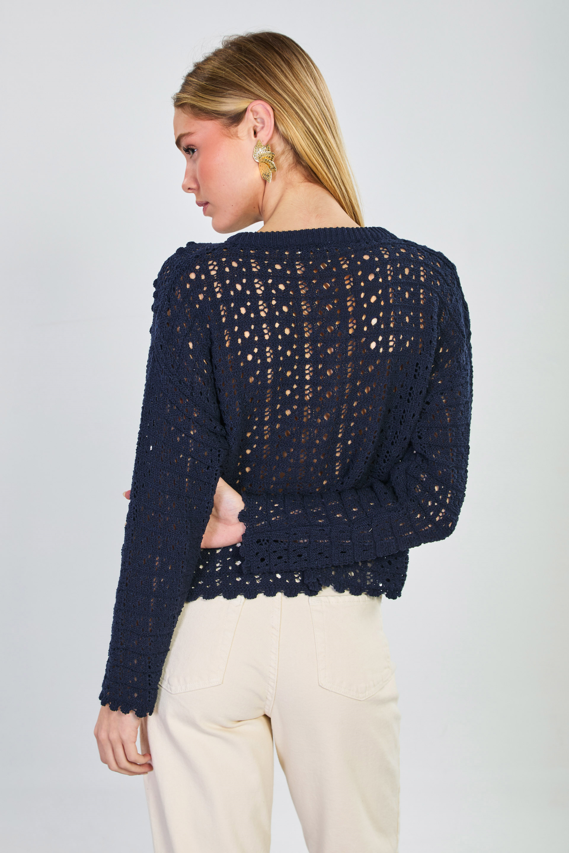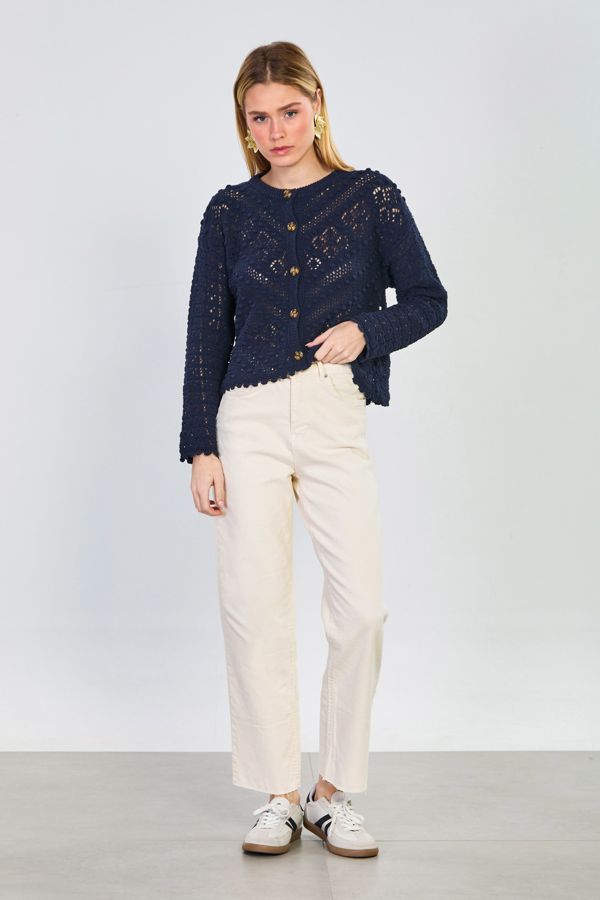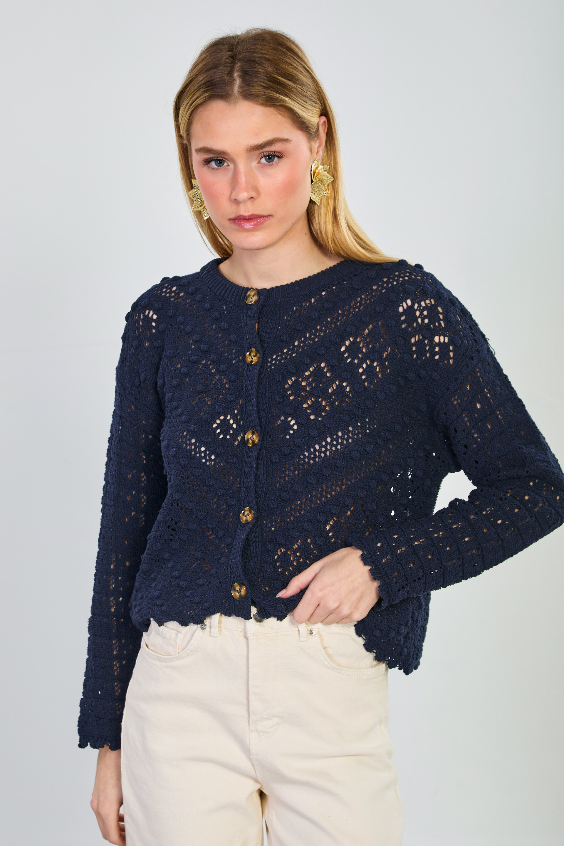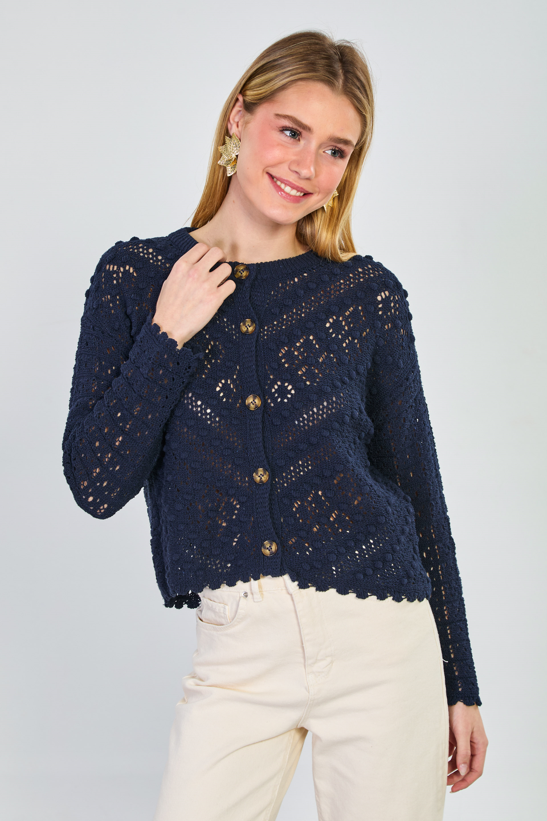Kadın Ponponlu Düğmeli Ajurlu Hırka - Lacivert