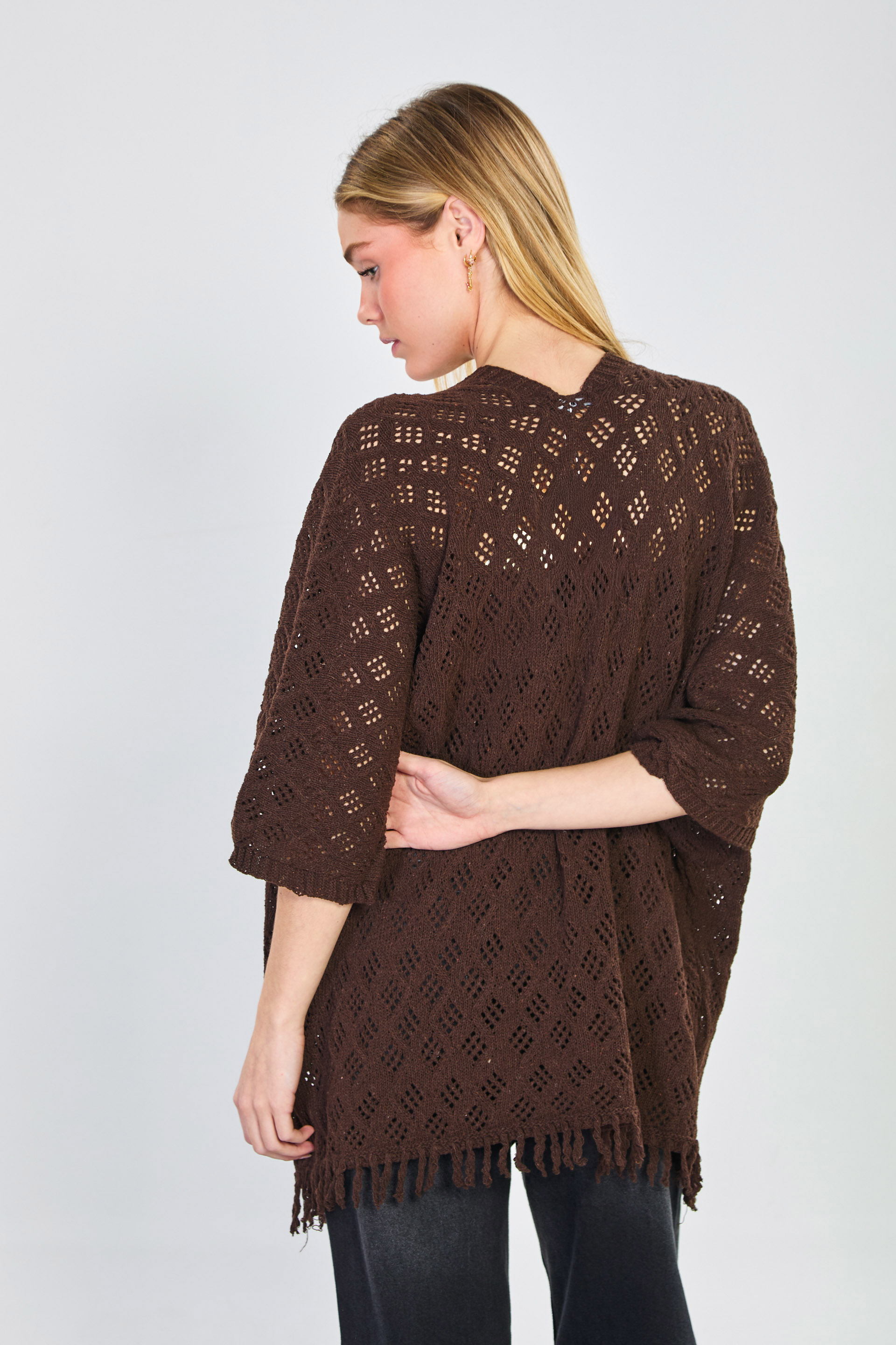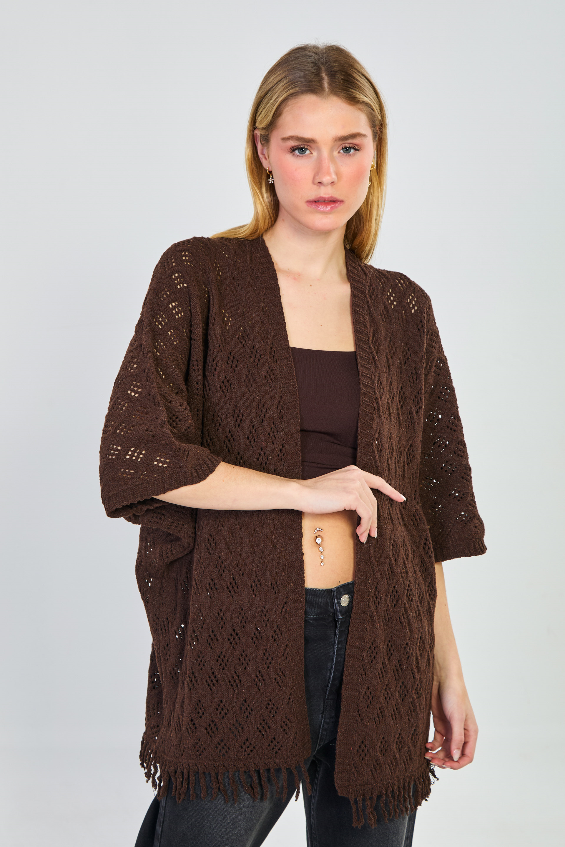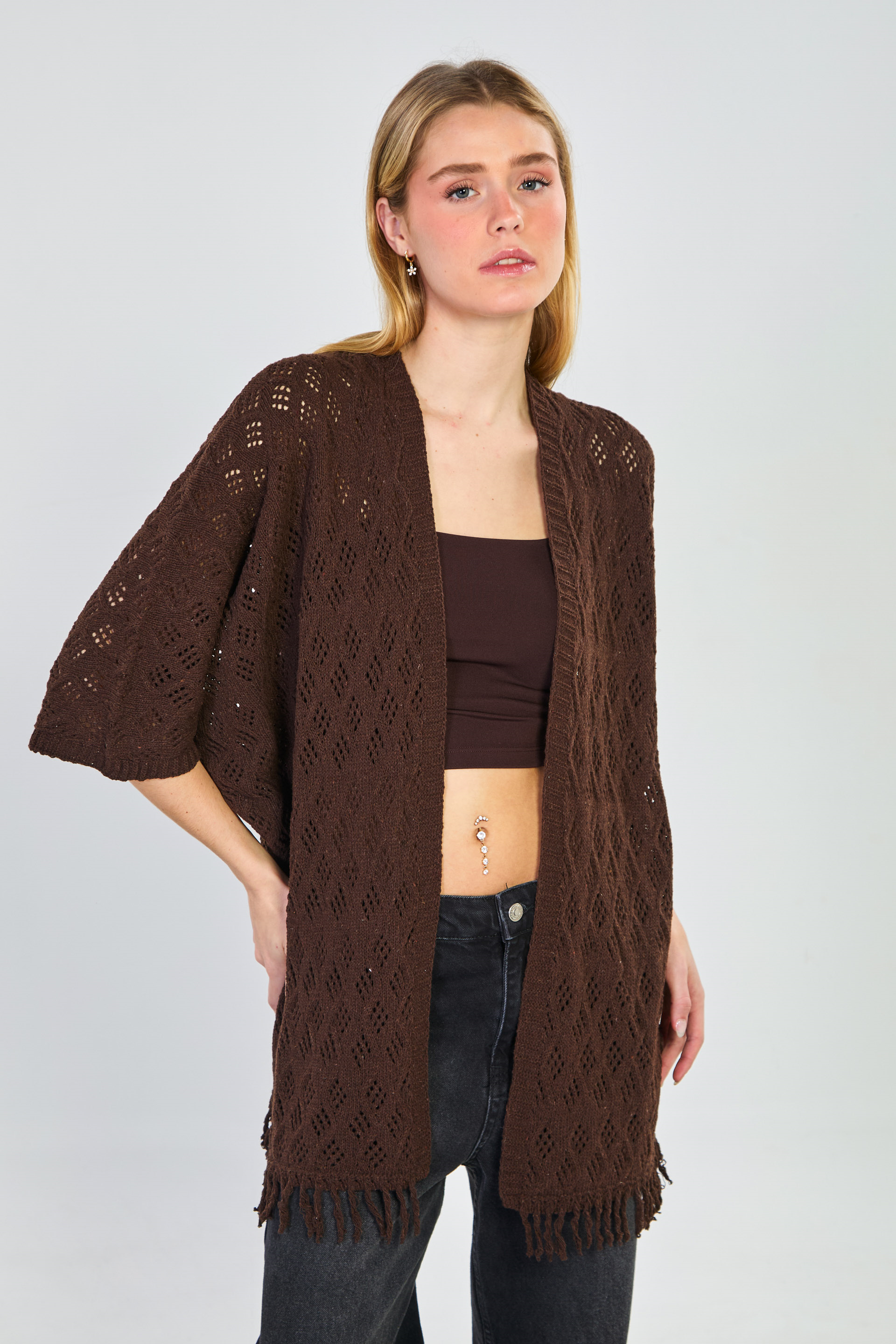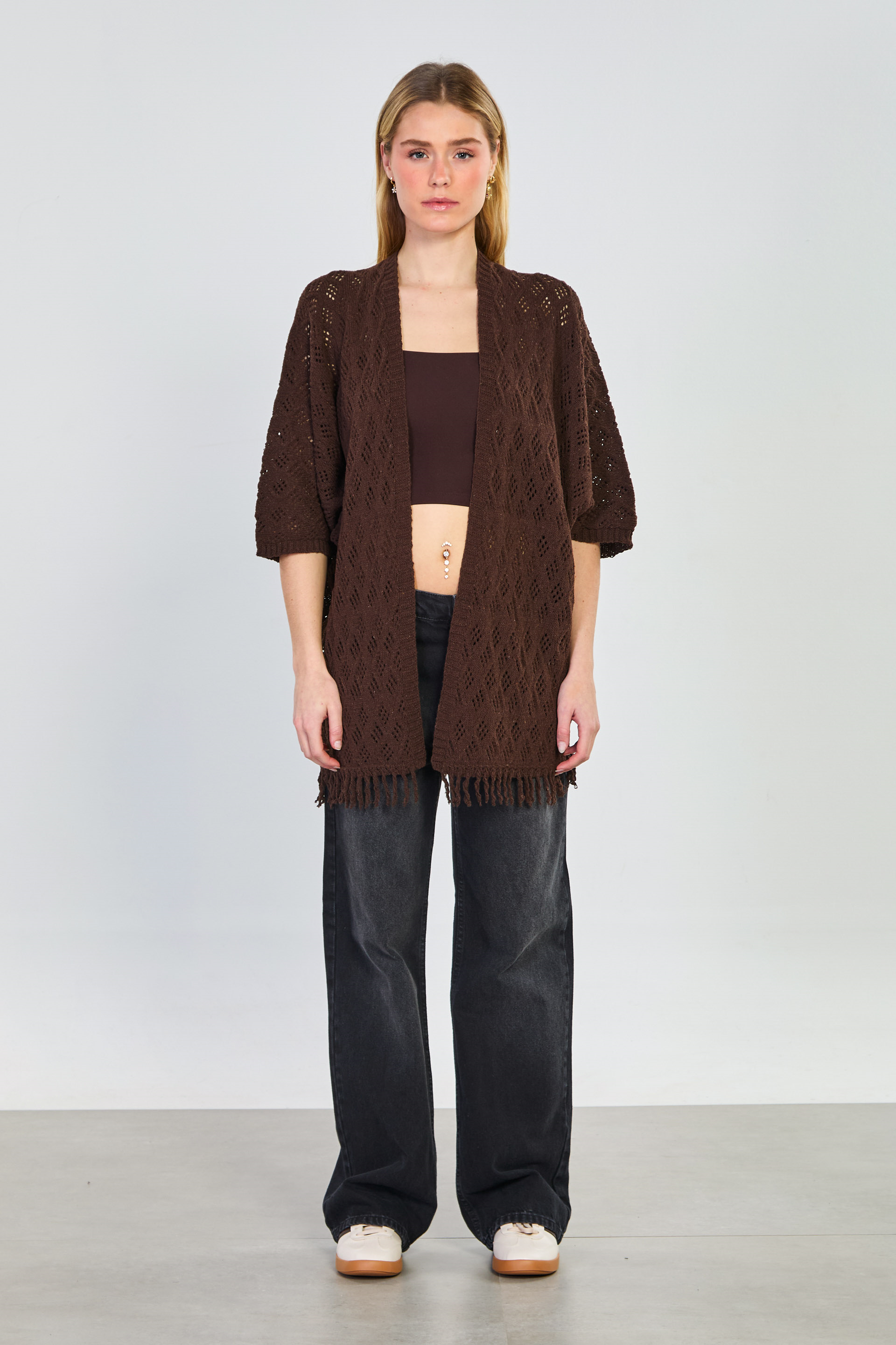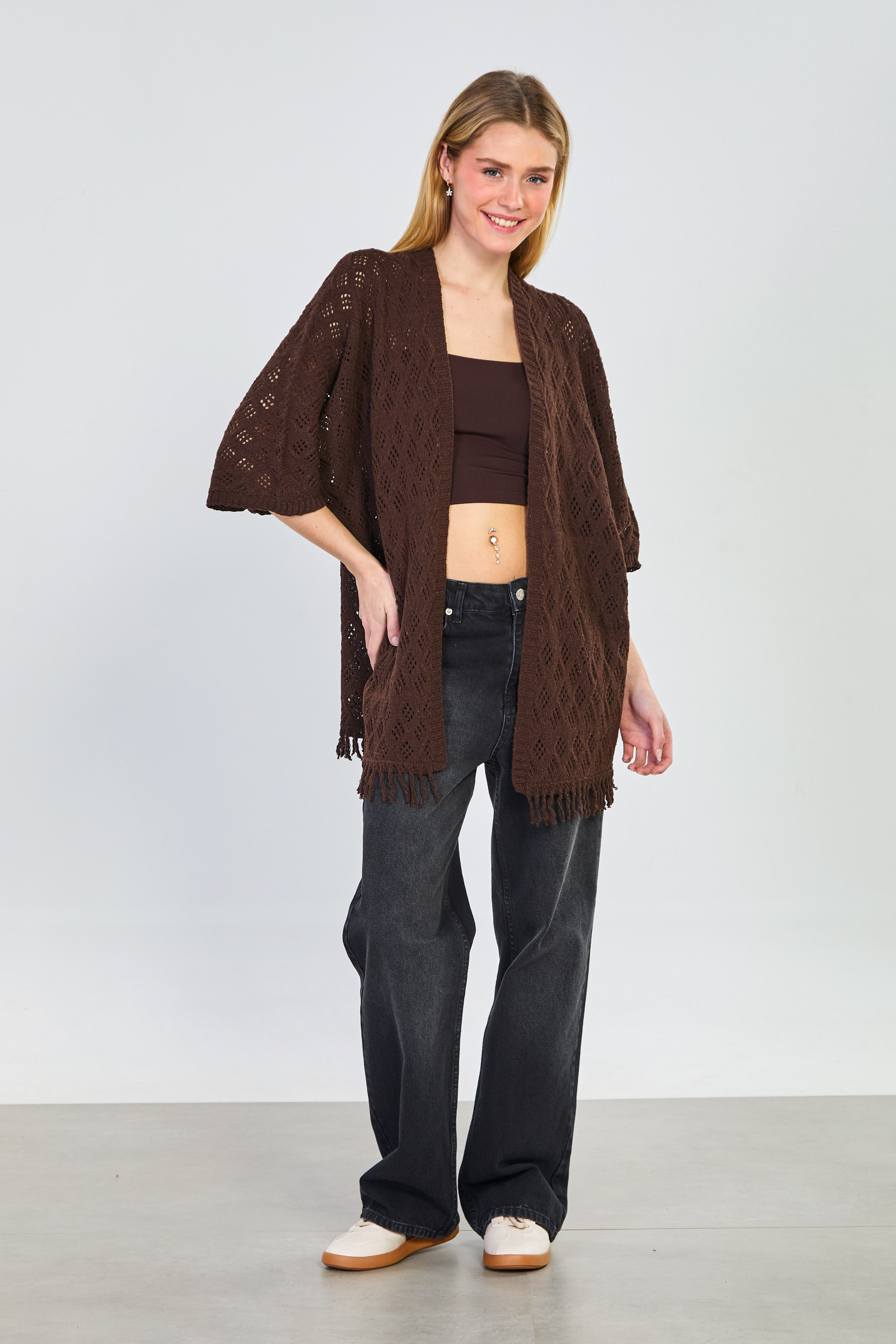 Kadın Saçaklı Yarasa Kol Ajurlu Hırka - Acı Kahve