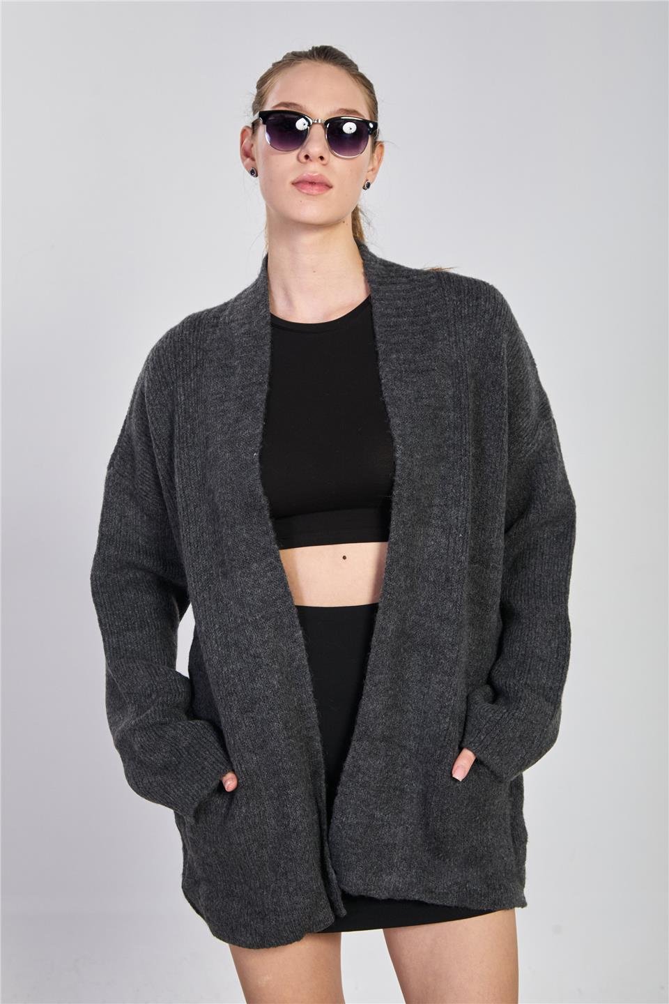Kadın Şal Yaka Cepli Triko Hırka - Antrasit