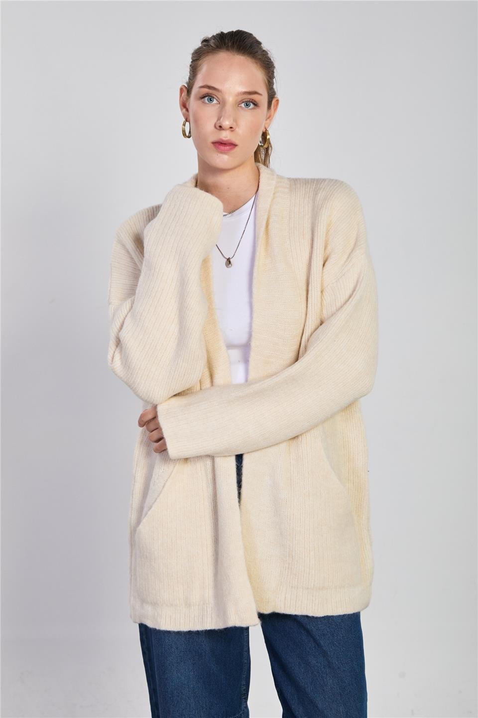 Kadın Şal Yaka Cepli Triko Hırka - Taş