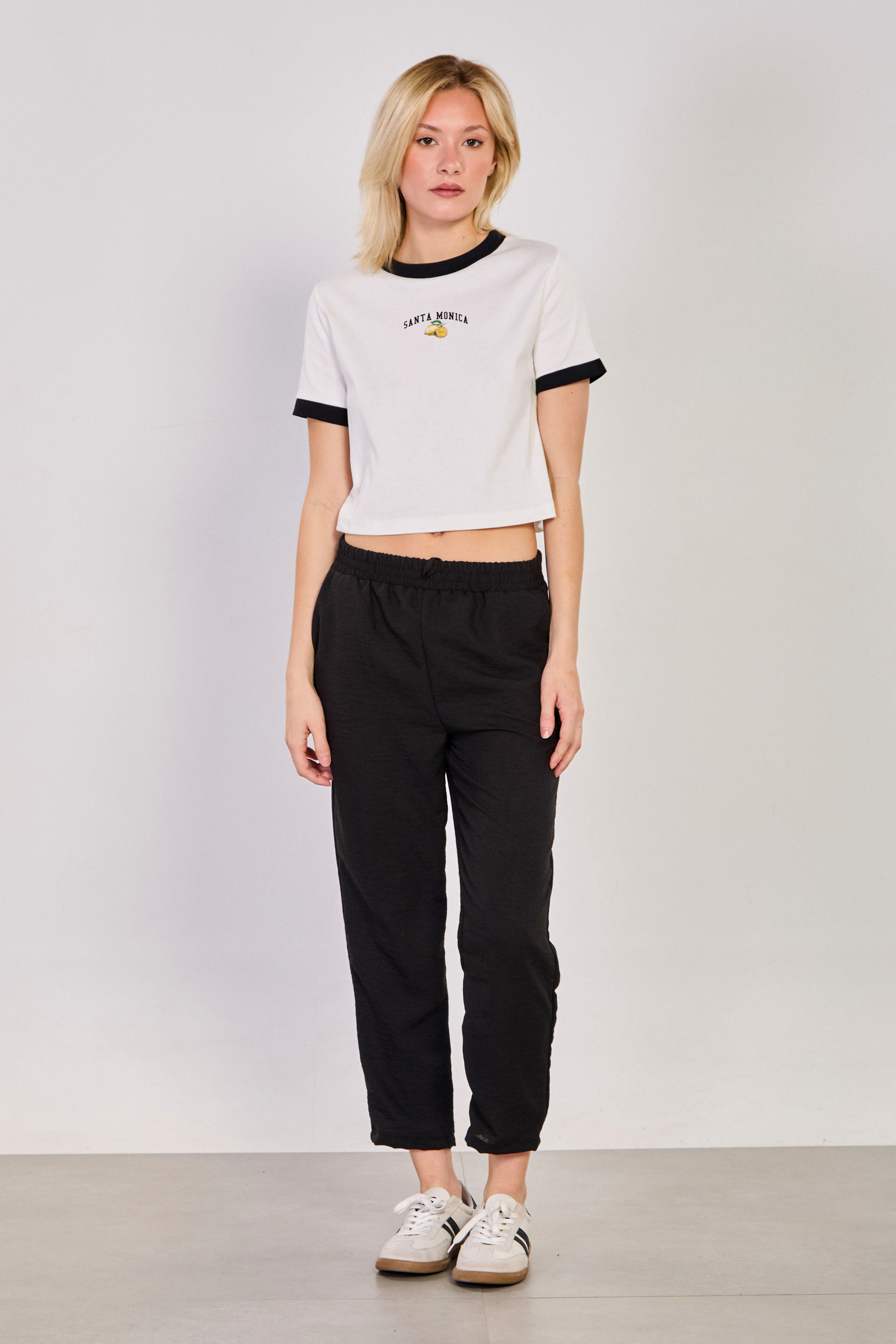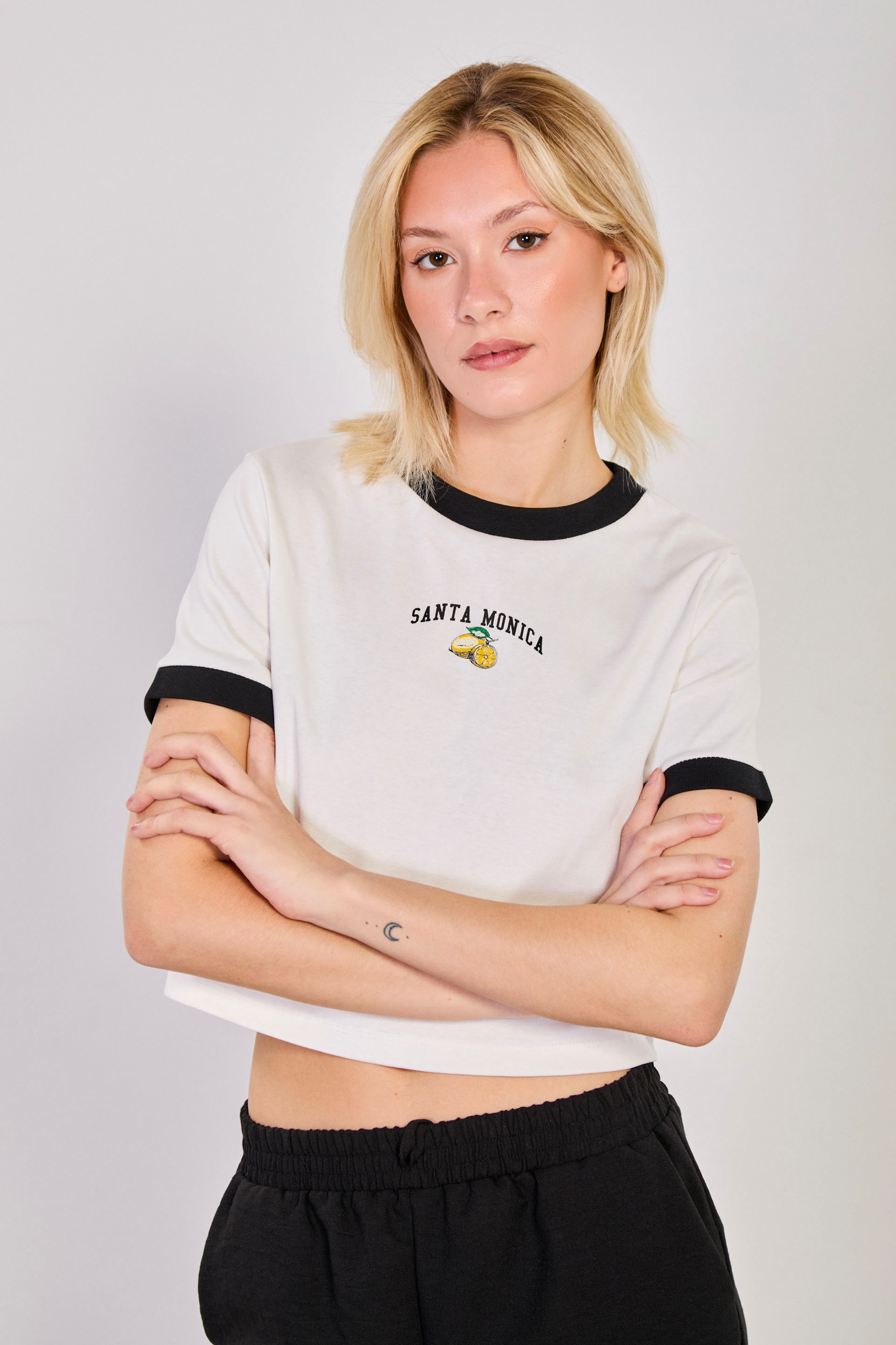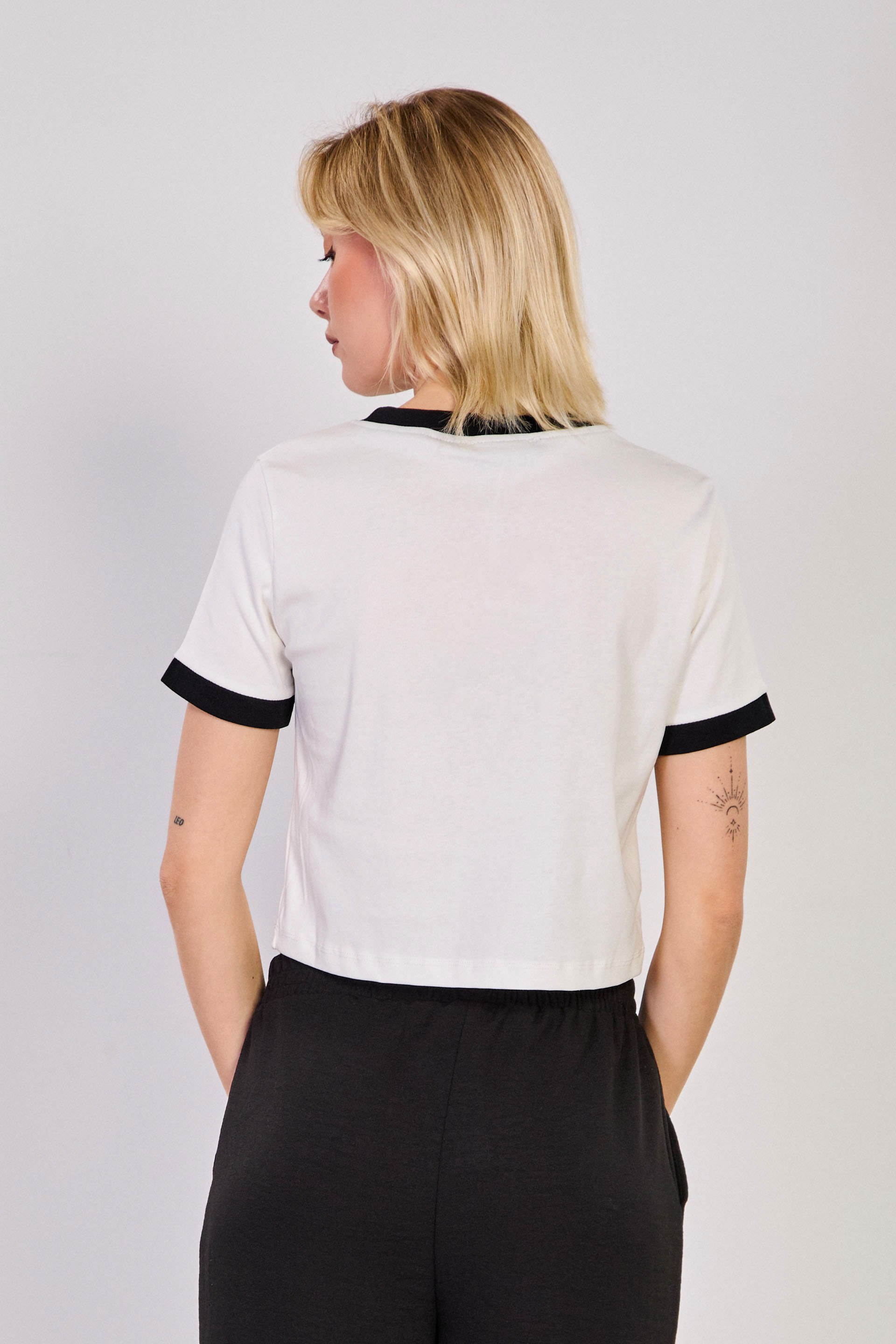 Kadın Santa Monica Kol ve Yaka Garnili T-Shirt - Ekru/Siyah