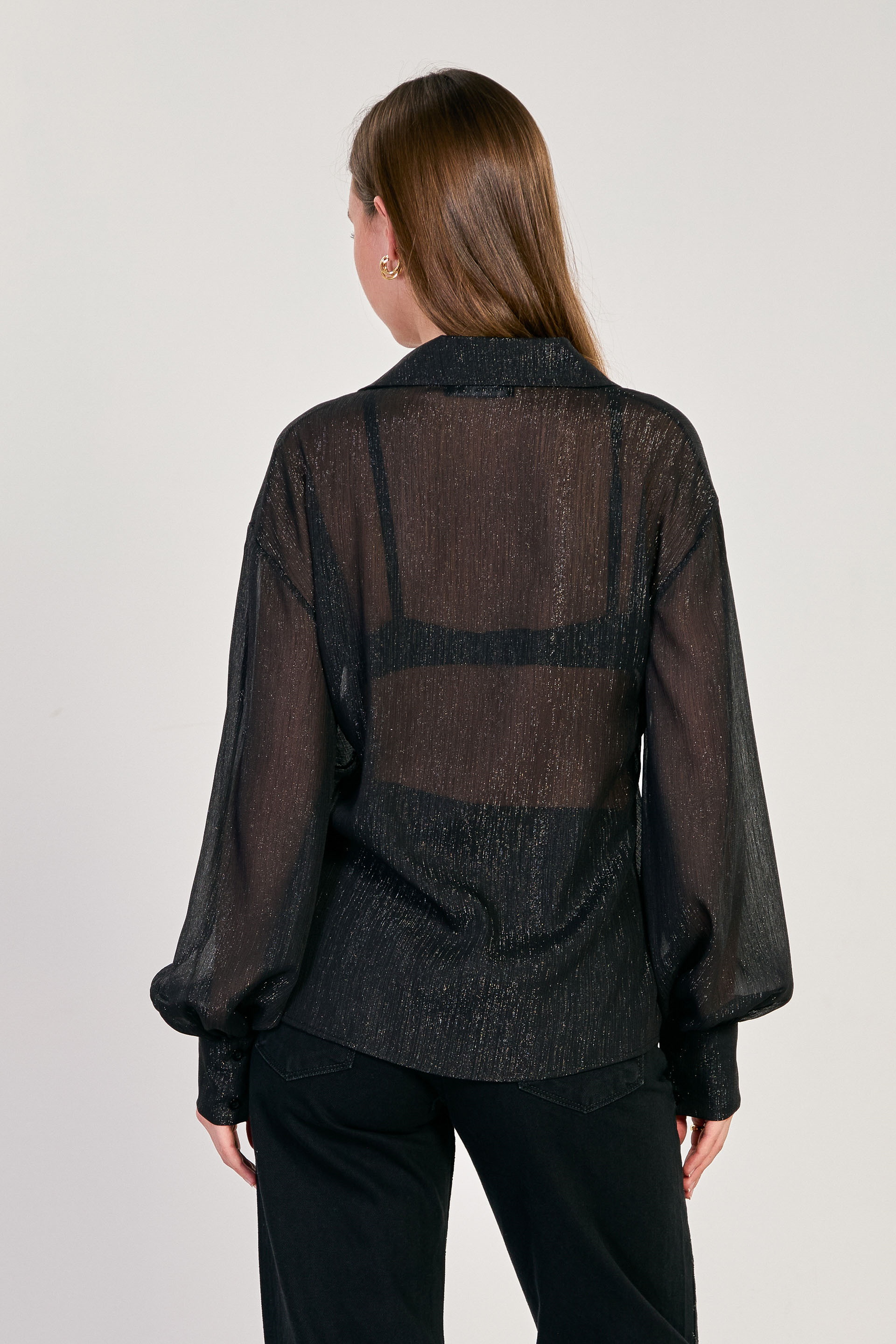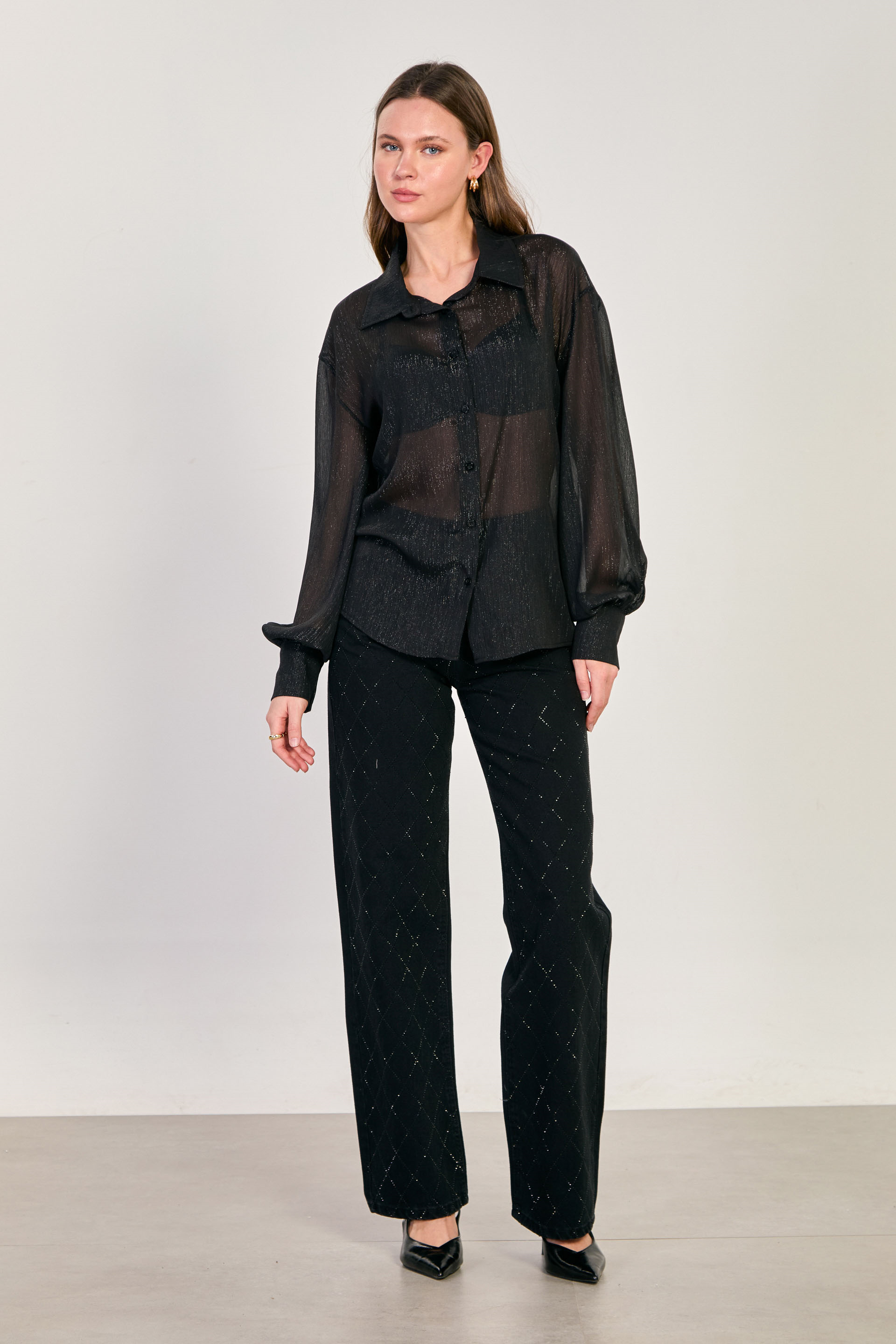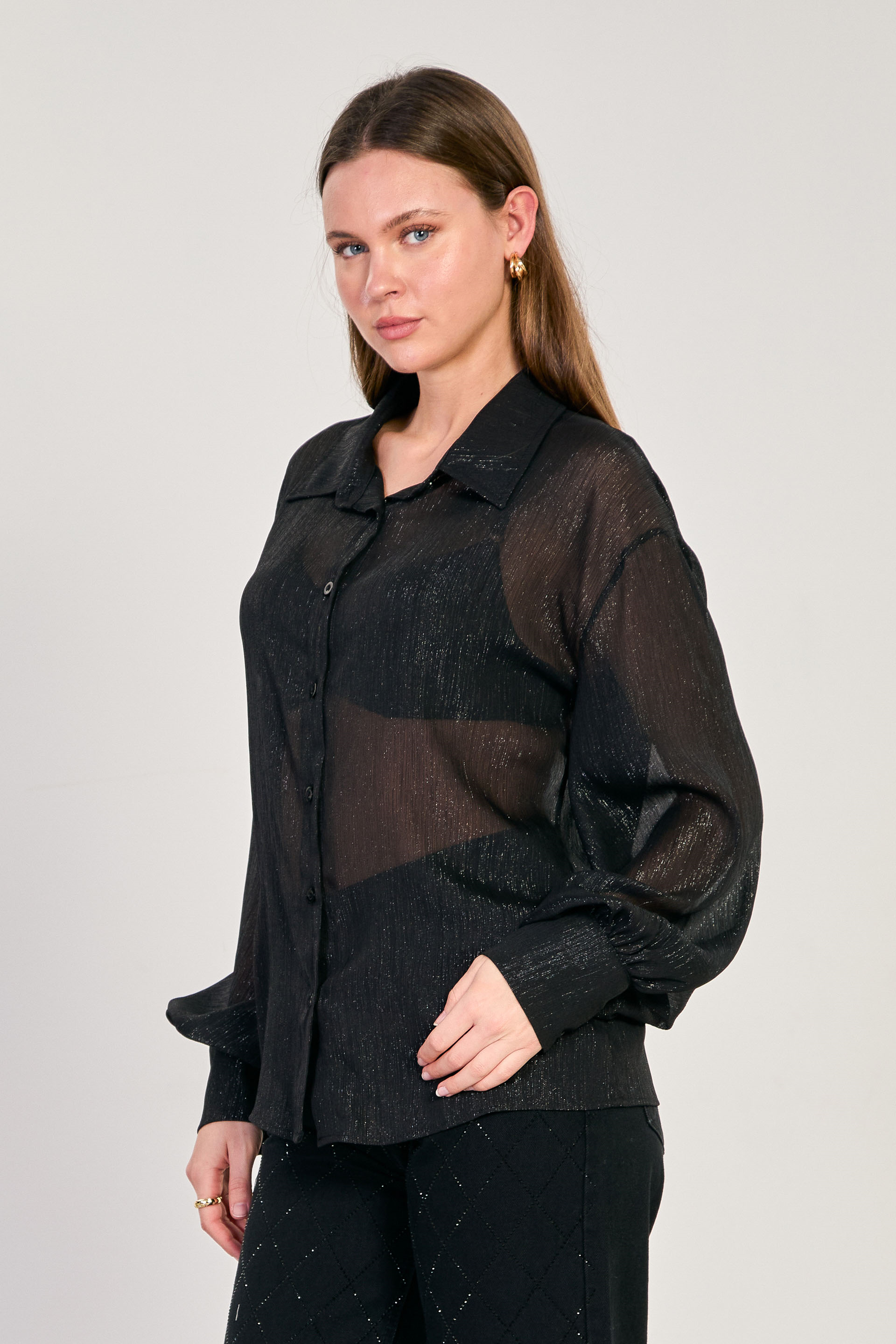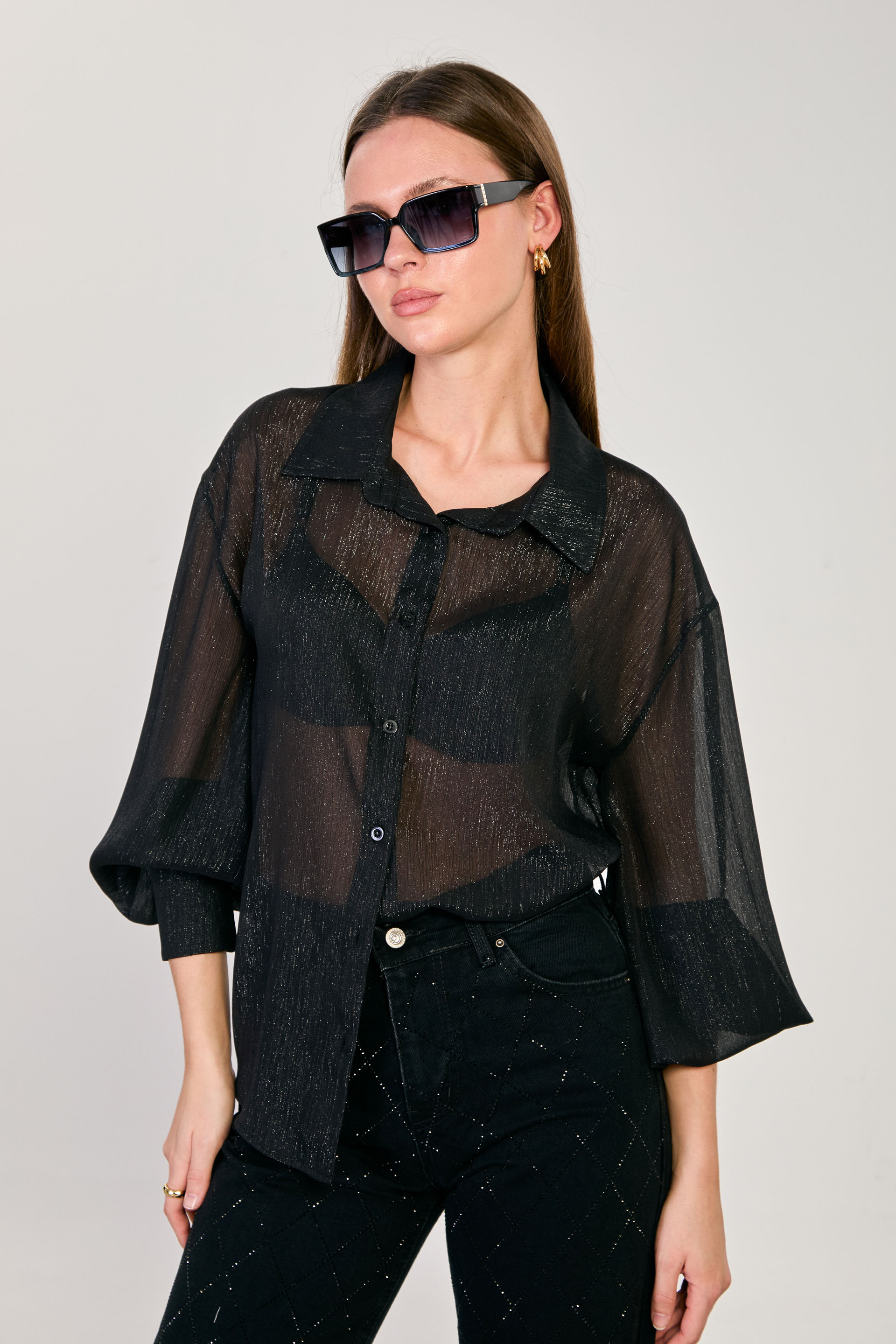 Kadın Simli Balon Kol Gömlek - Siyah