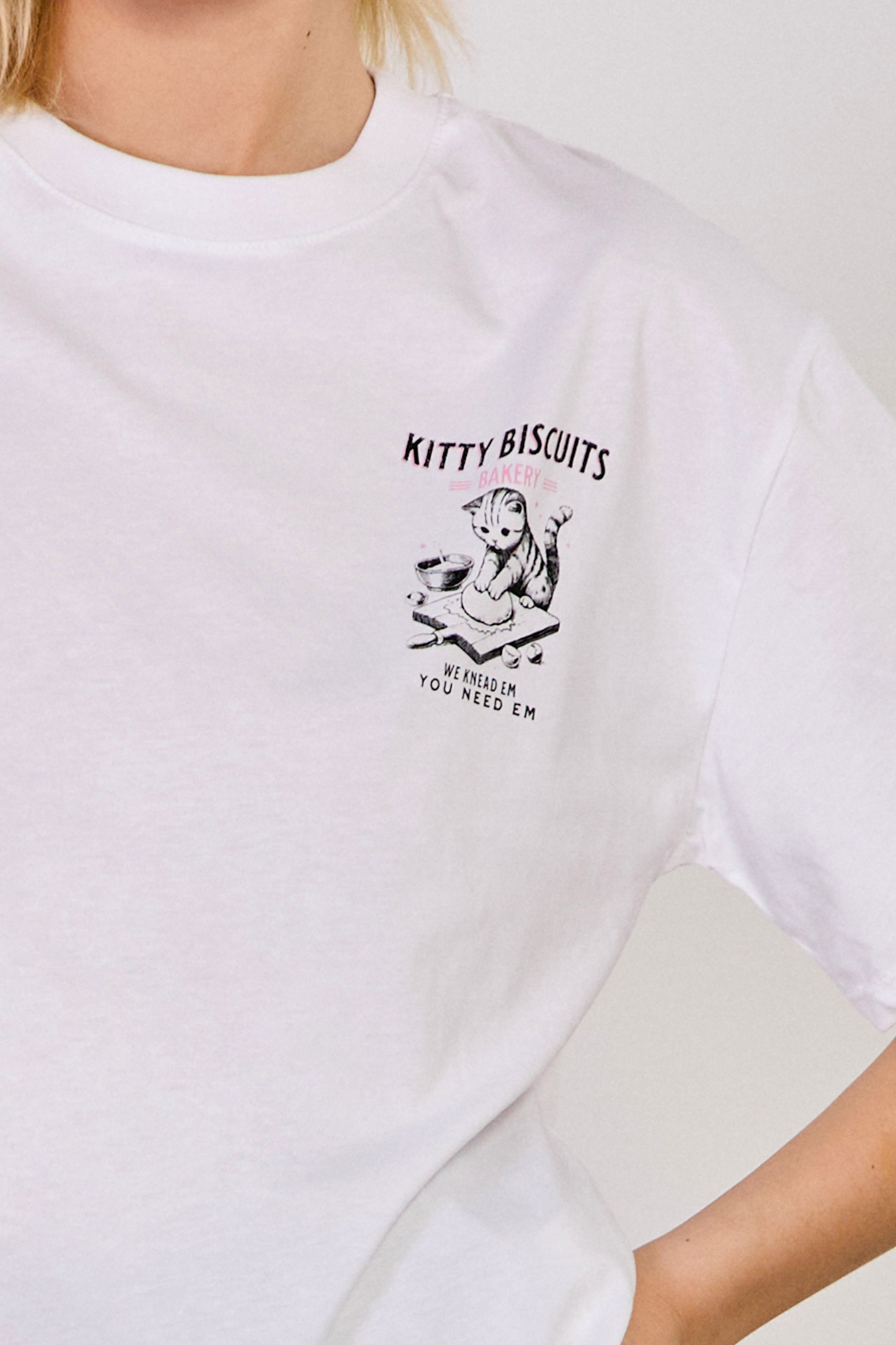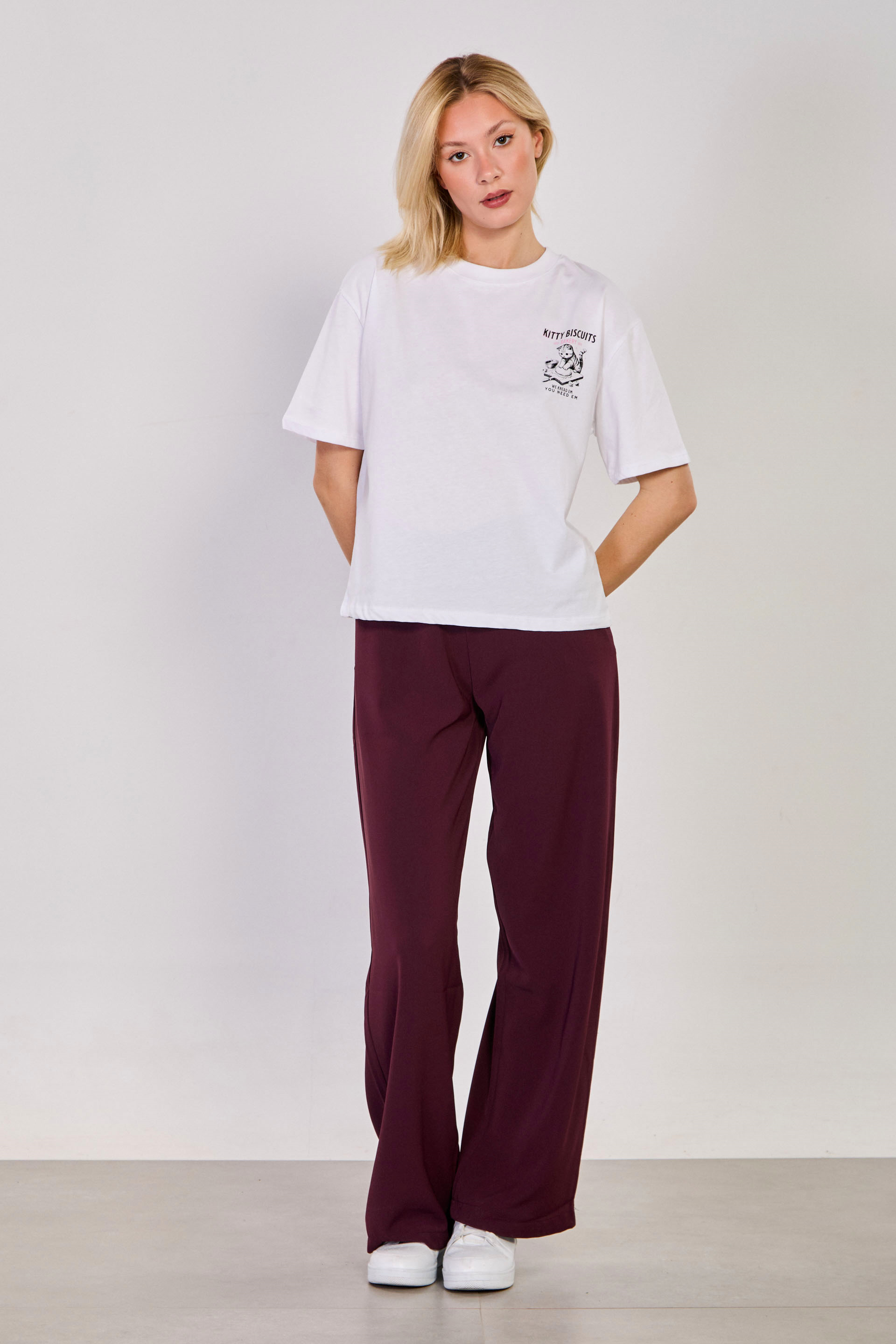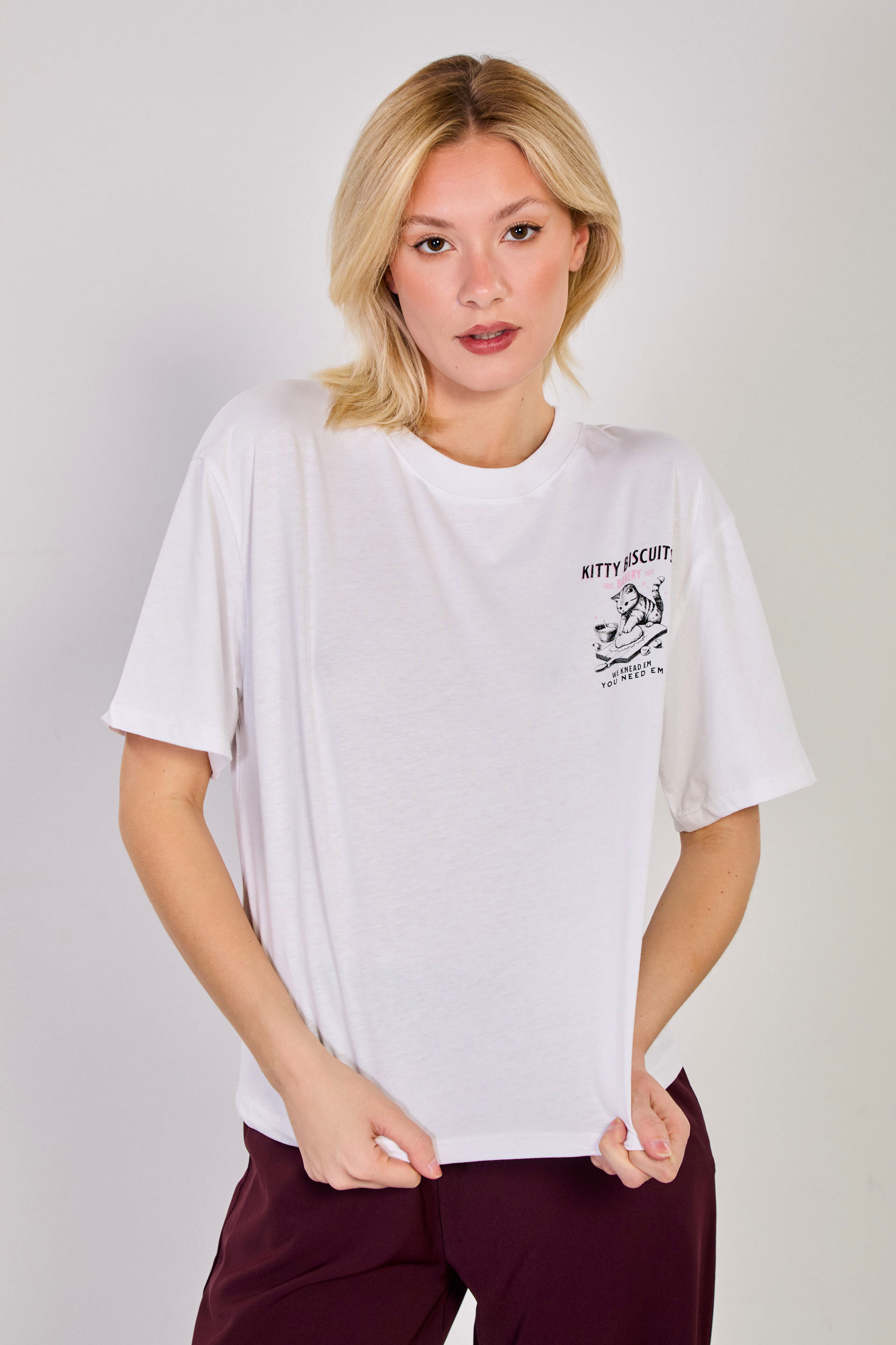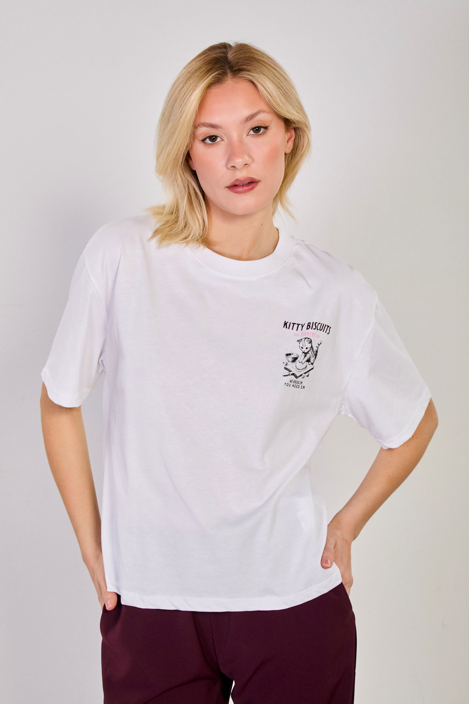 Kadın Sırtı Kedi Baskılı Oversize T-Shirt - Beyaz