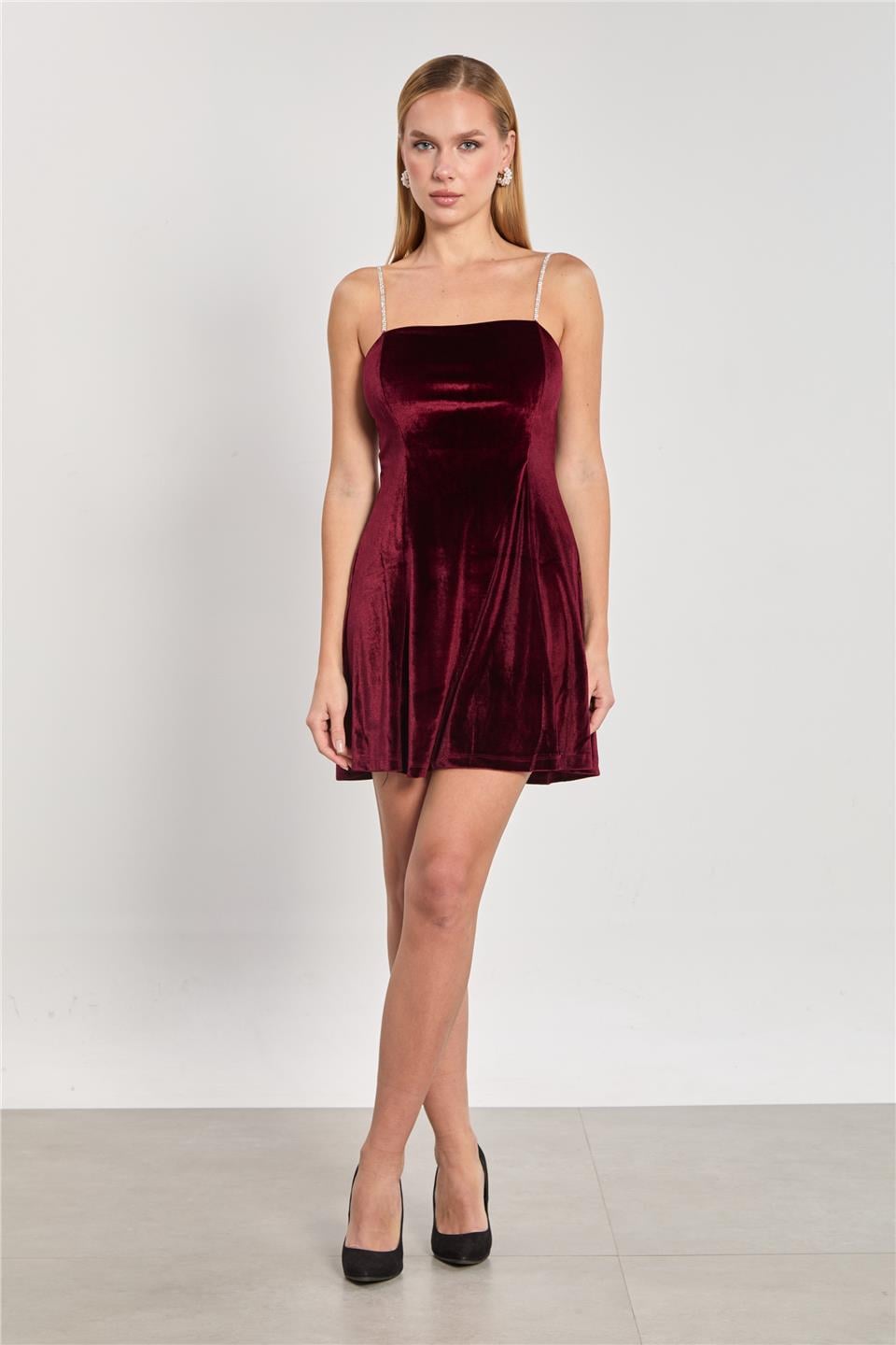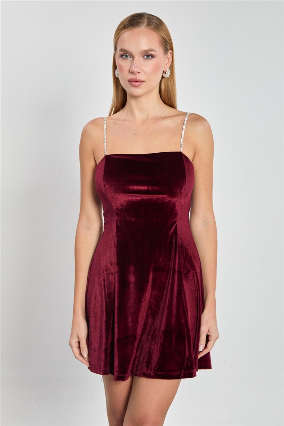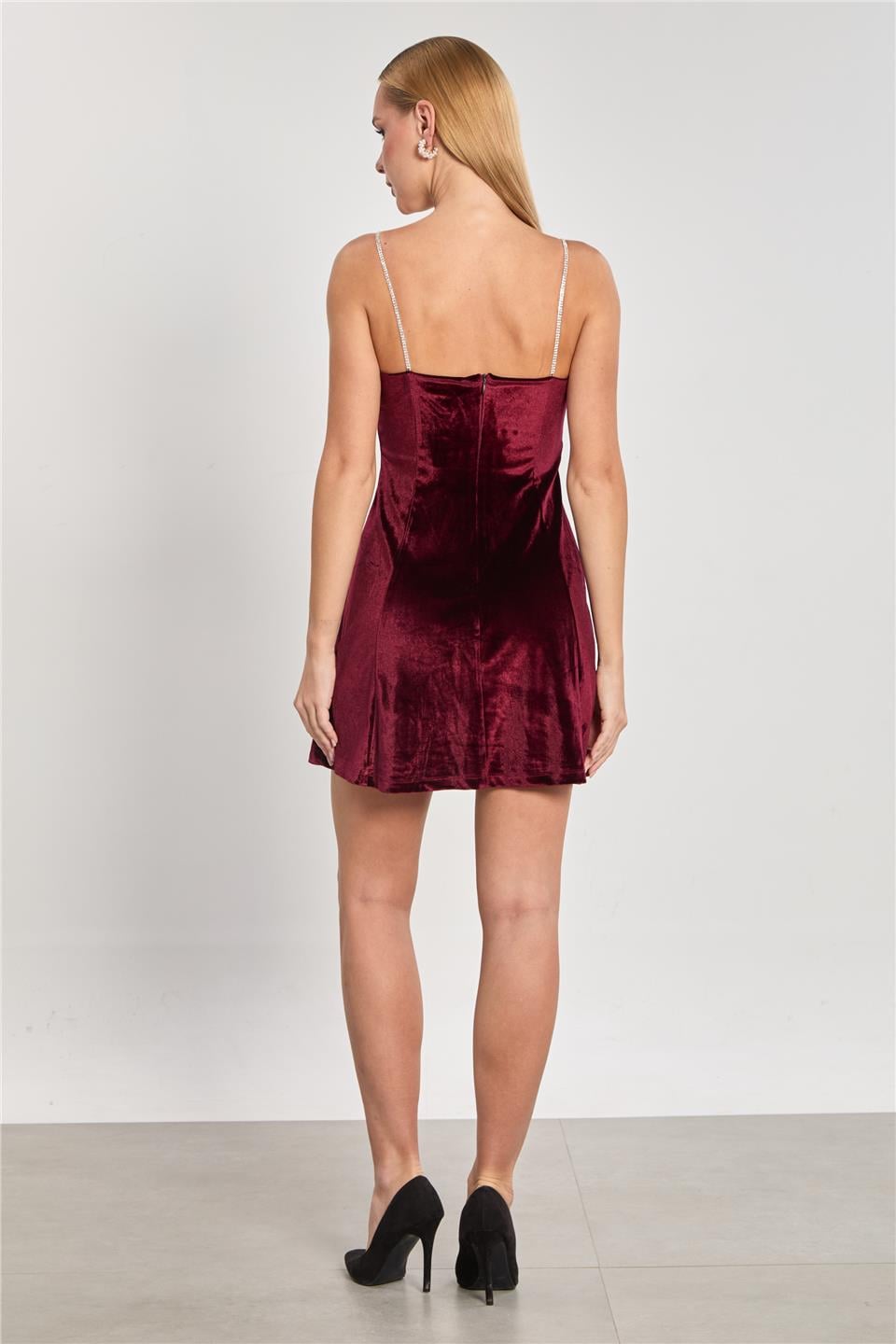 Kadın Taş Askılı Mini Kadife Elbise - Bordo