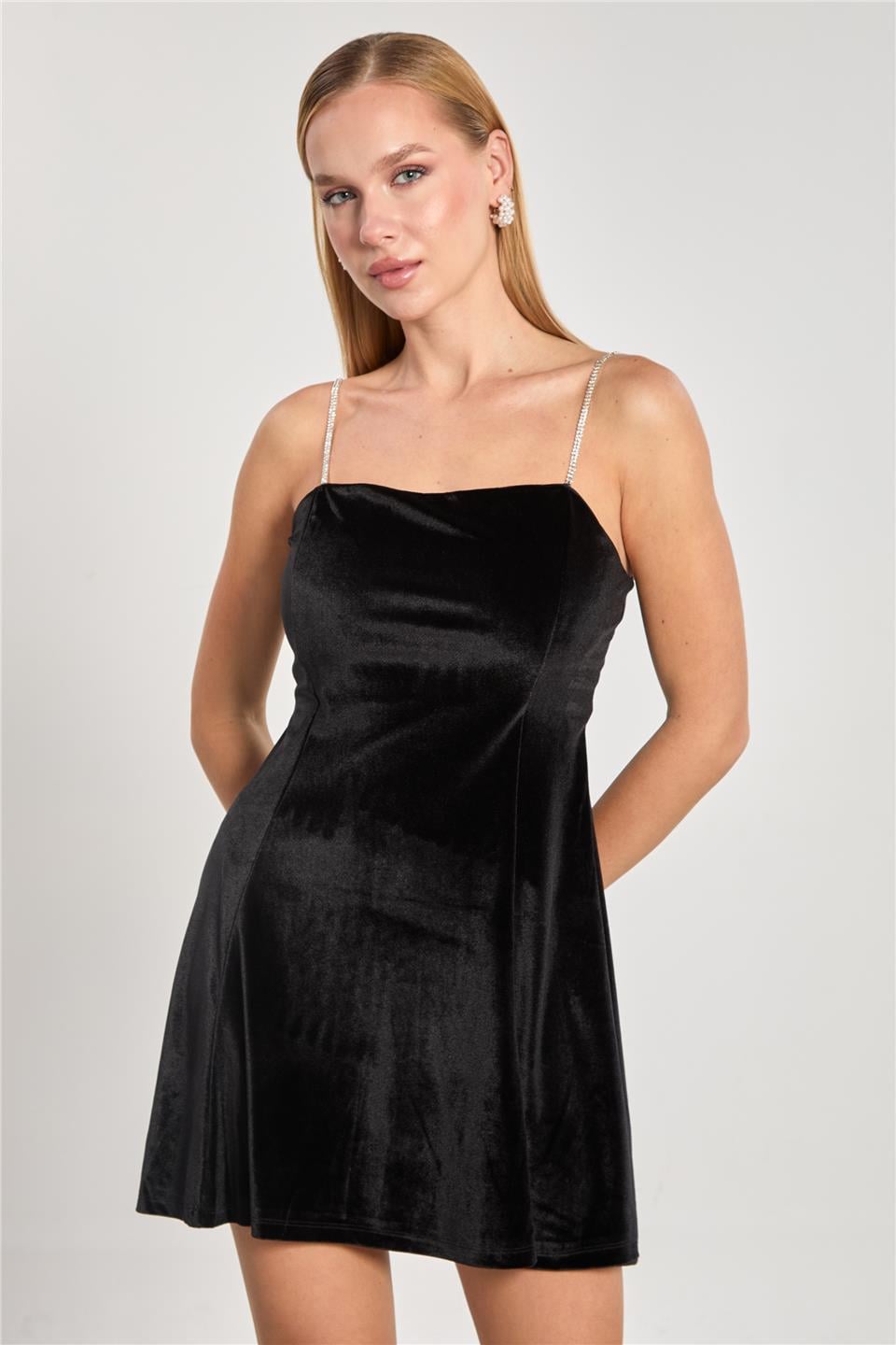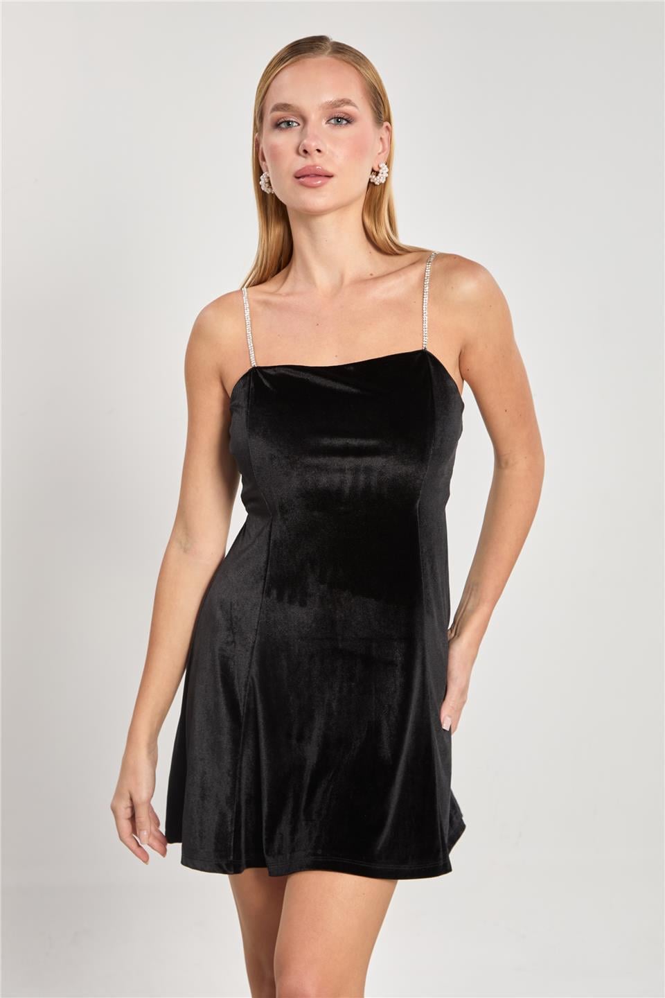Kadın Taş Askılı Mini Kadife Elbise - Siyah