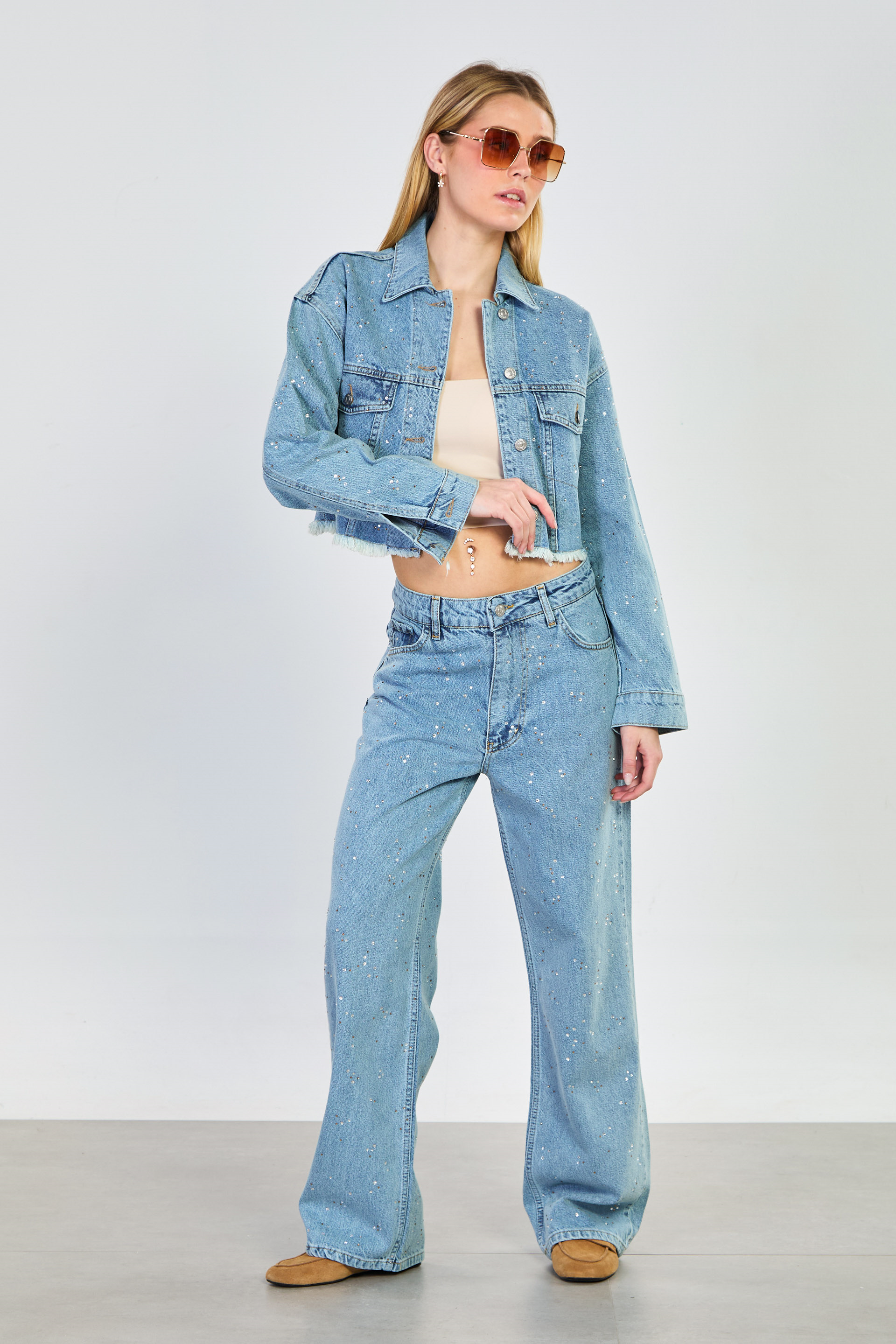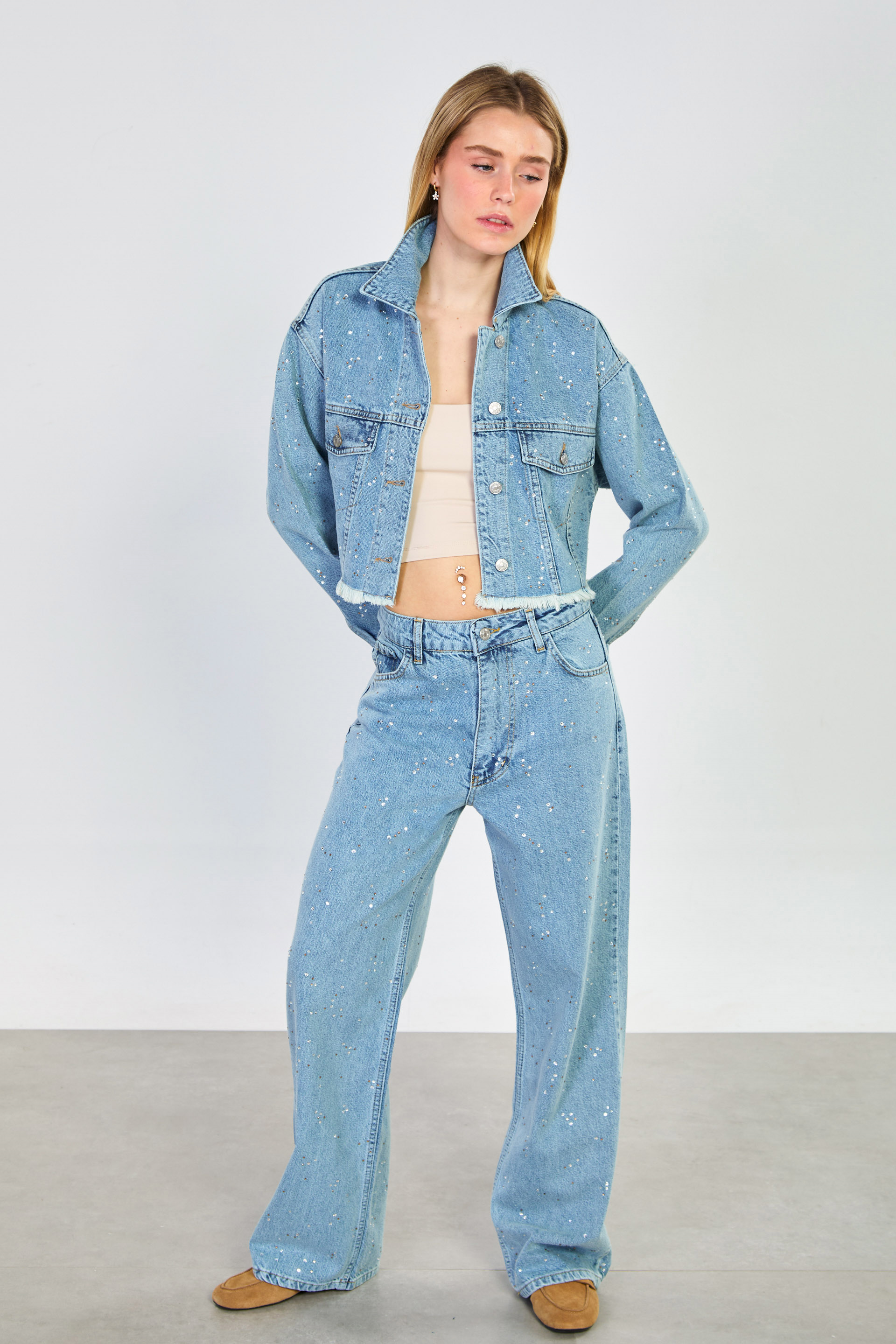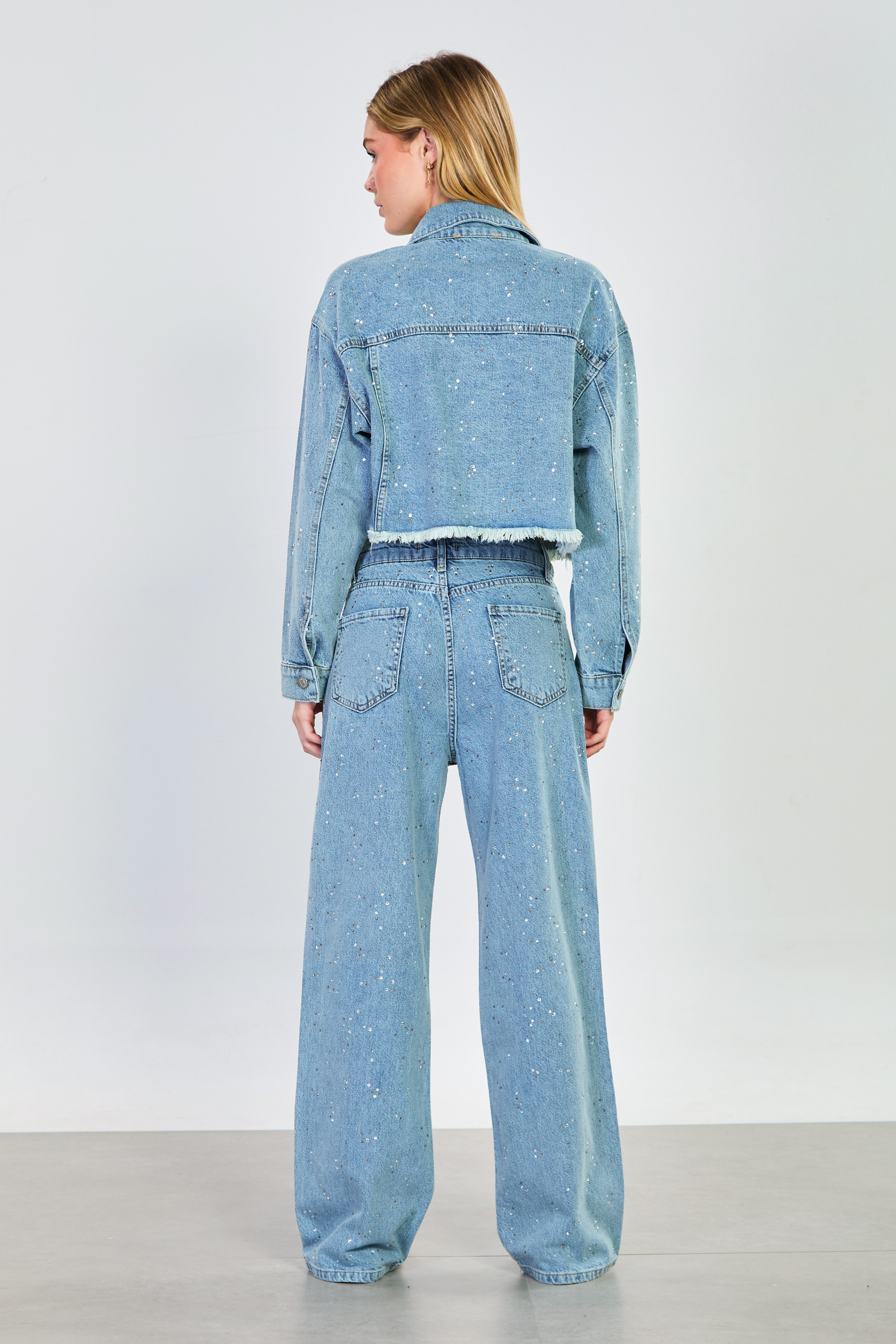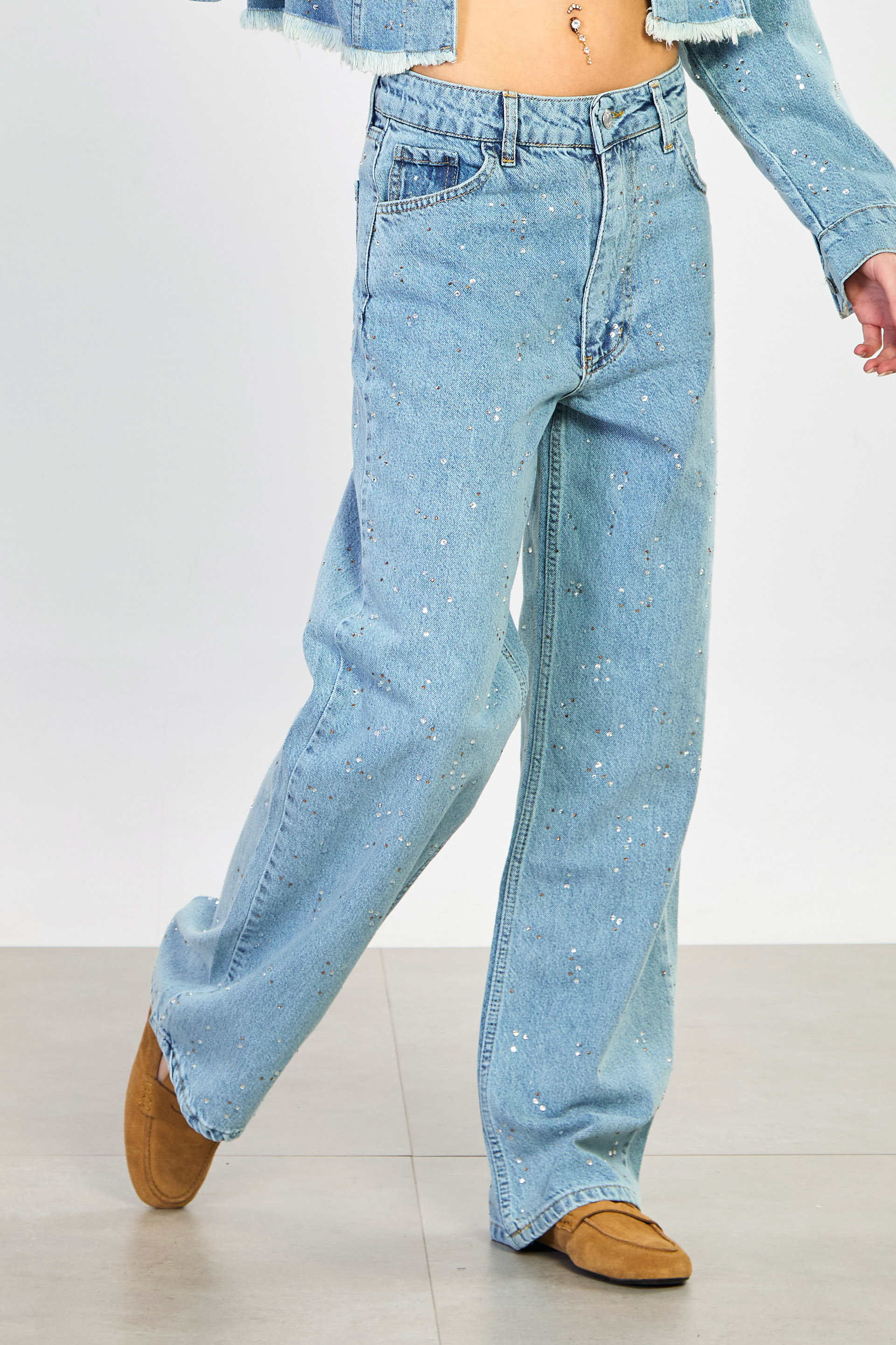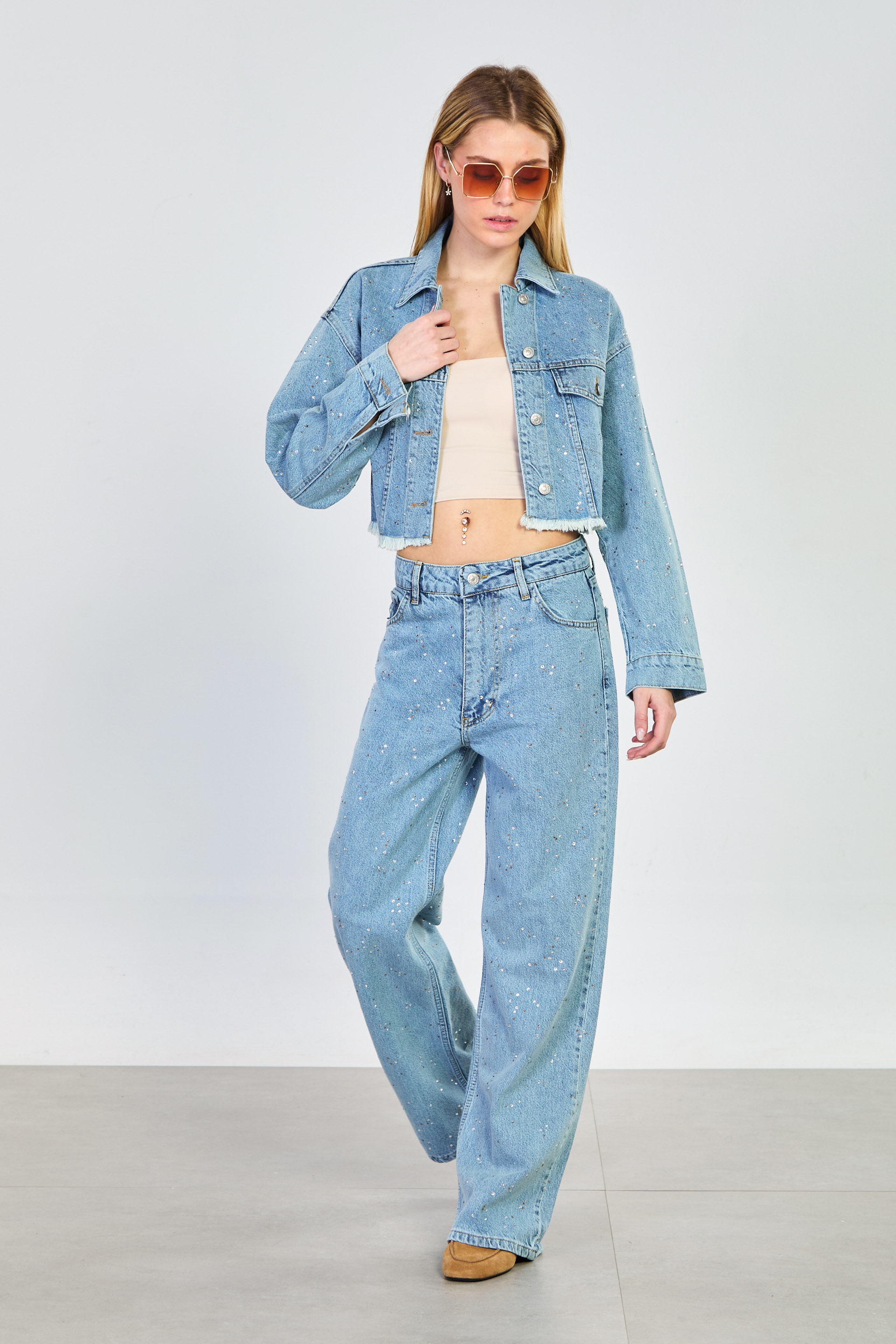 Kadın Taşlı Bol Paça Jean Pantolon - Açık Mavi