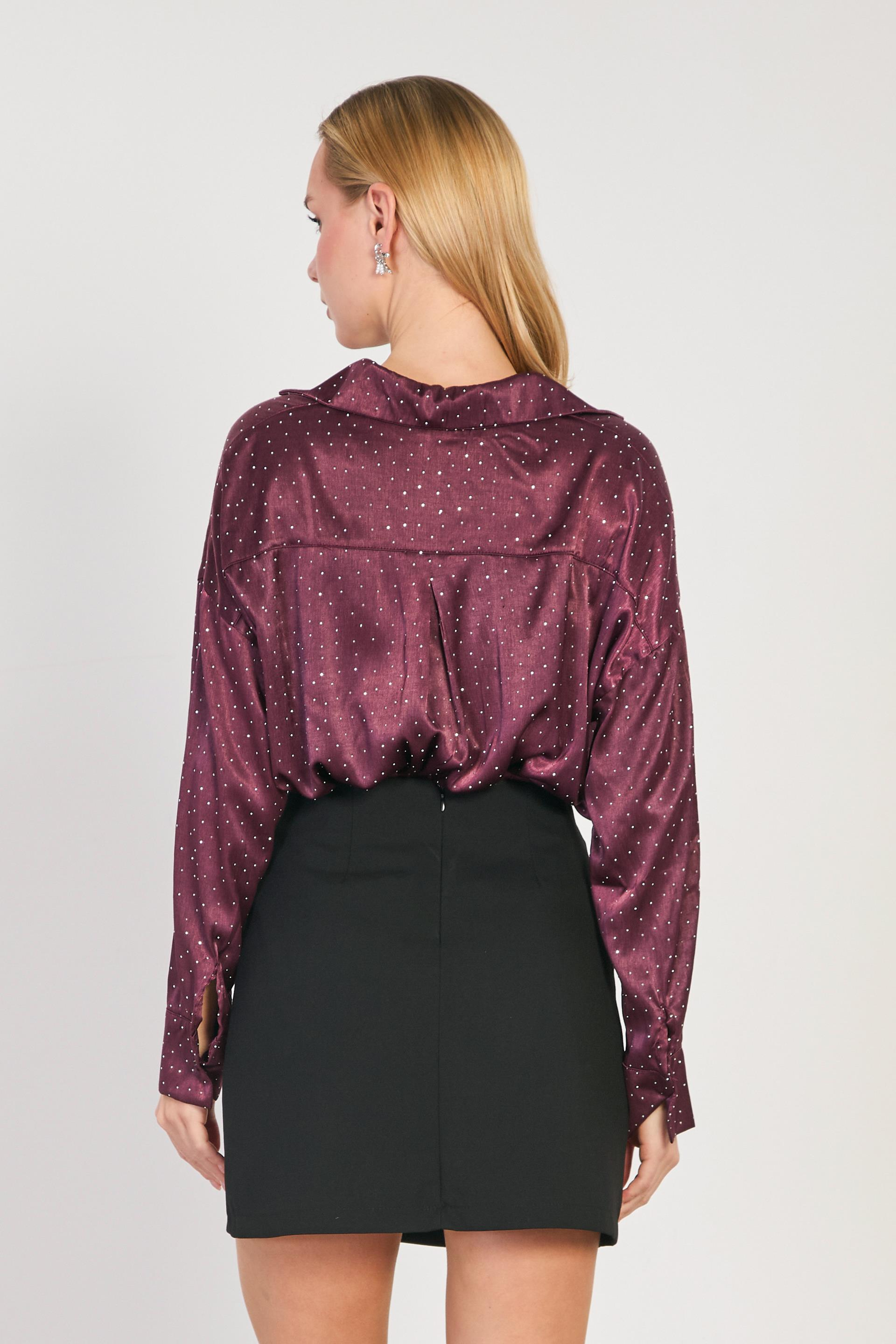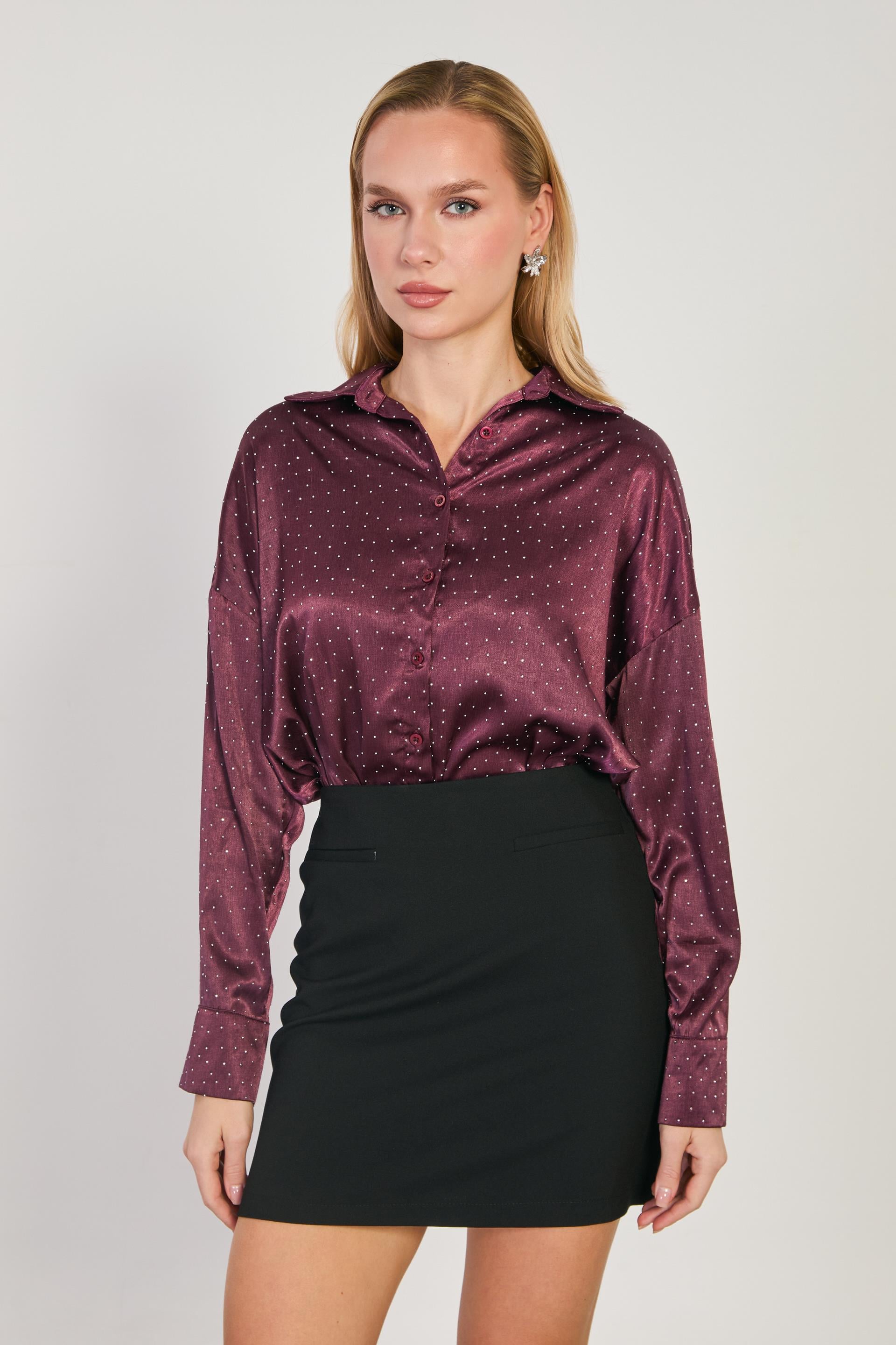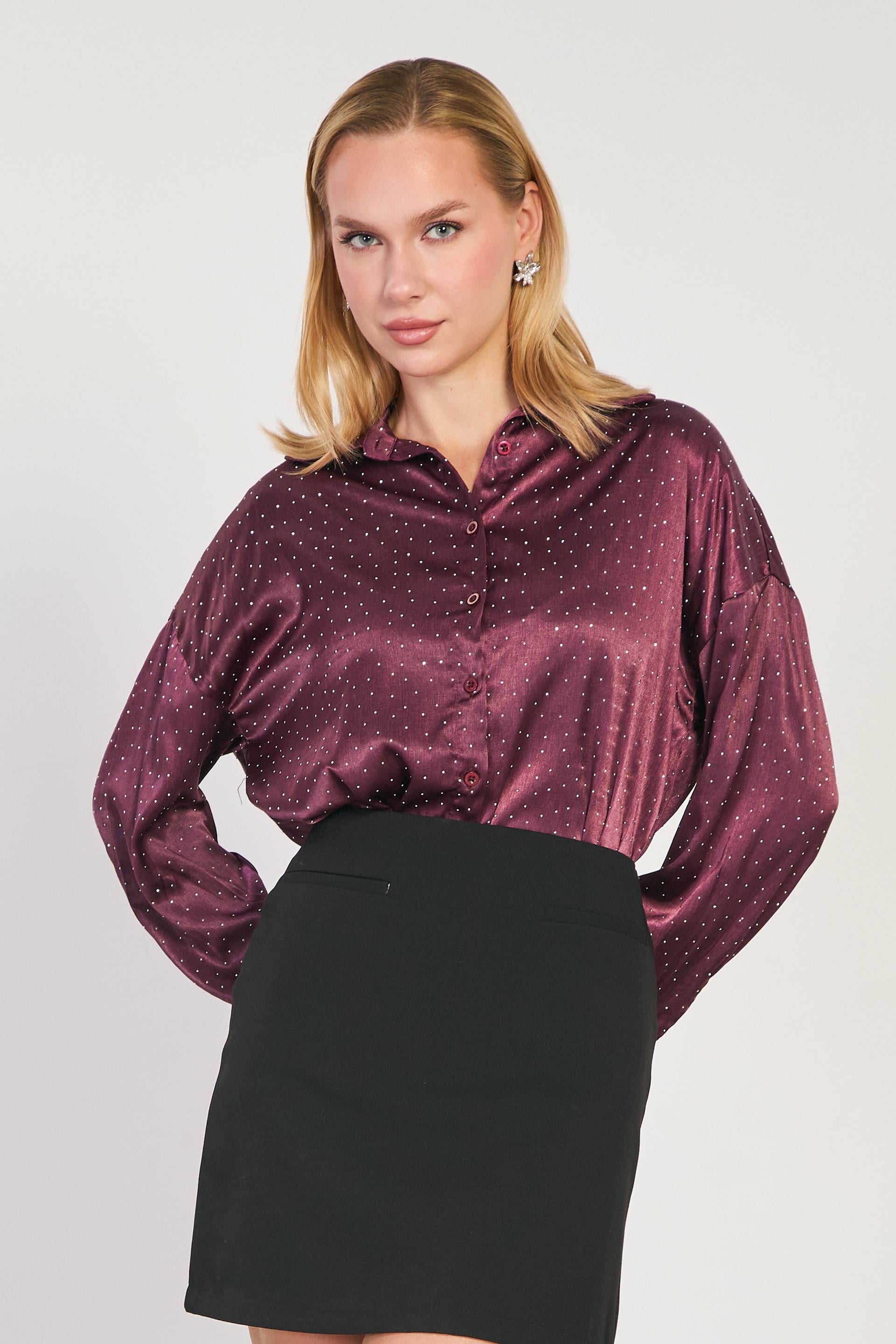 Kadın Taşlı Saten Uzun Kol Gömlek - Mürdüm
