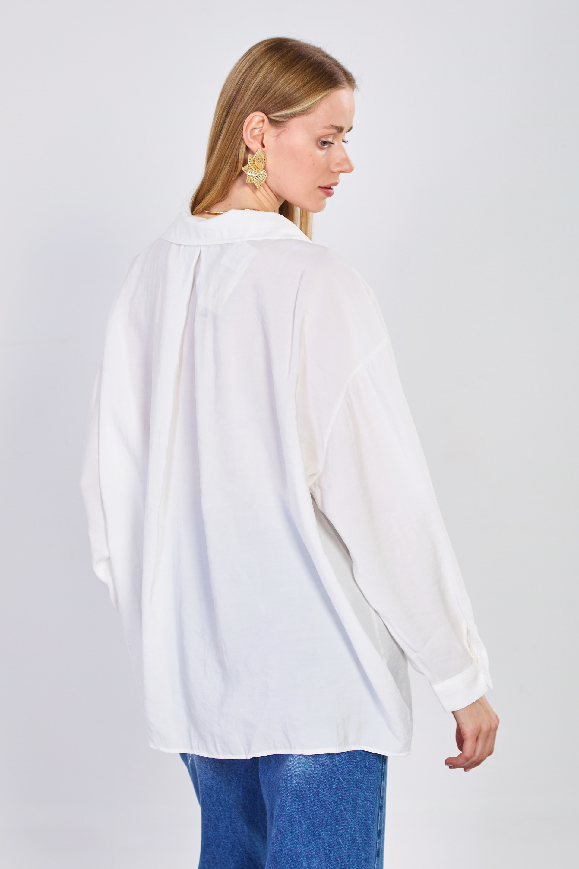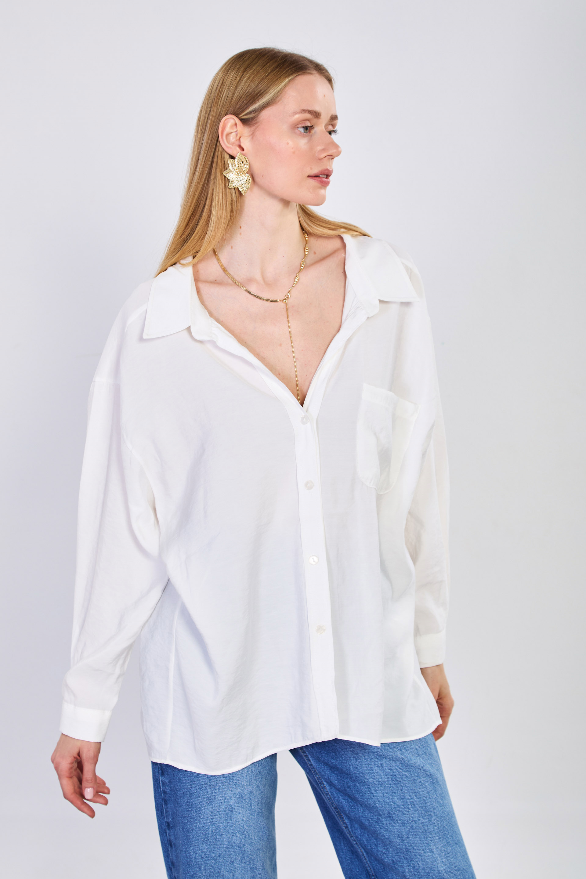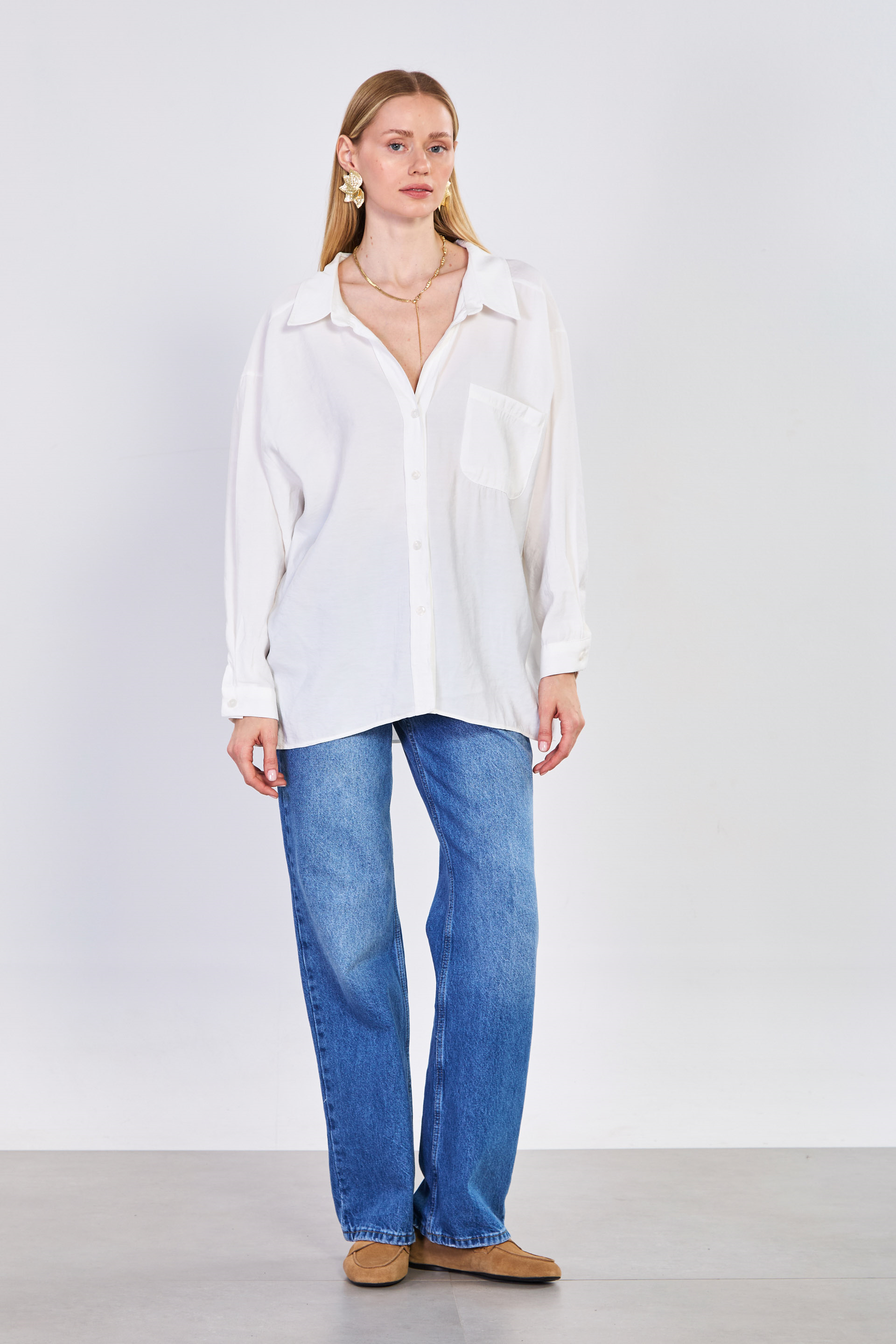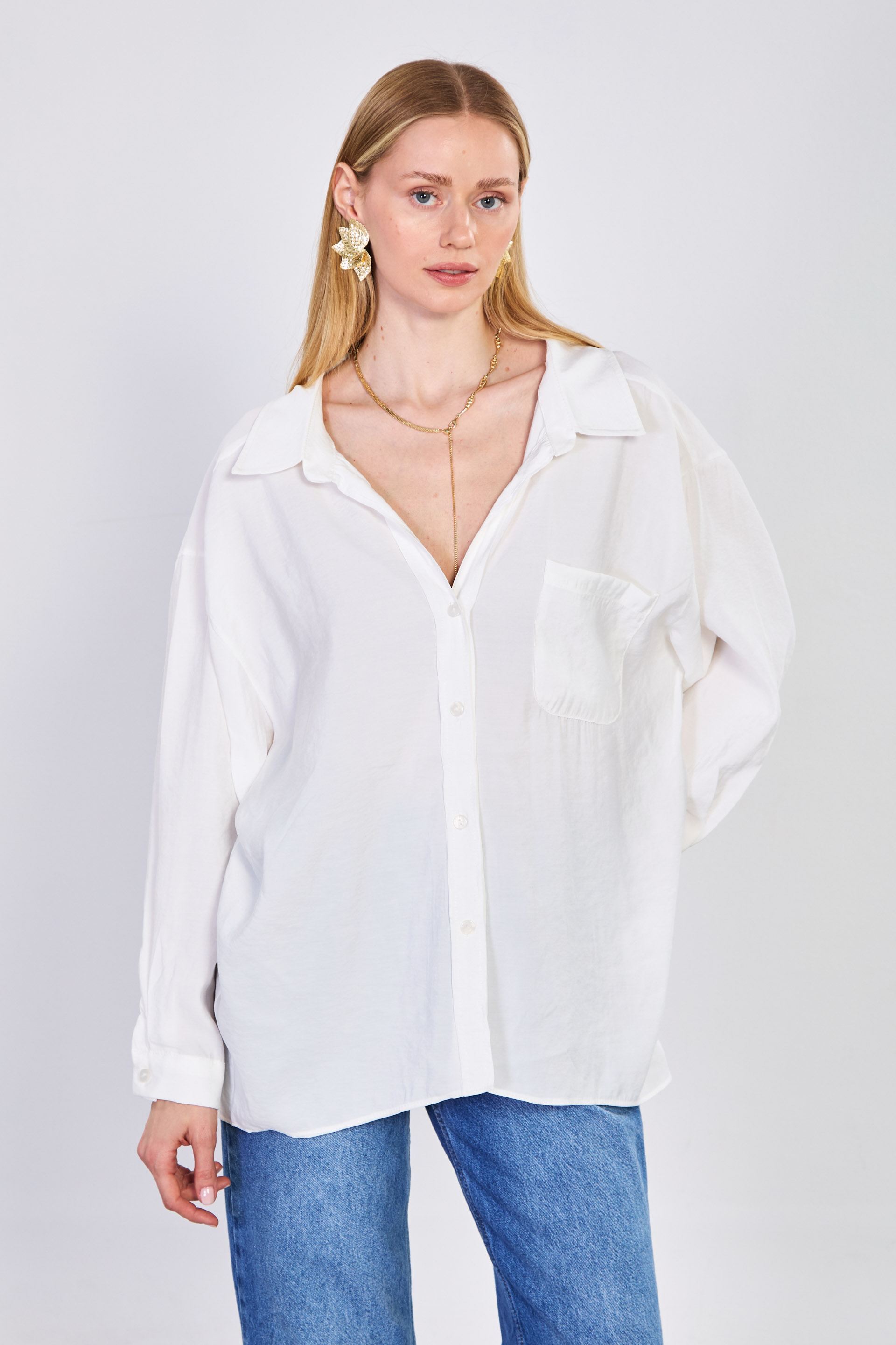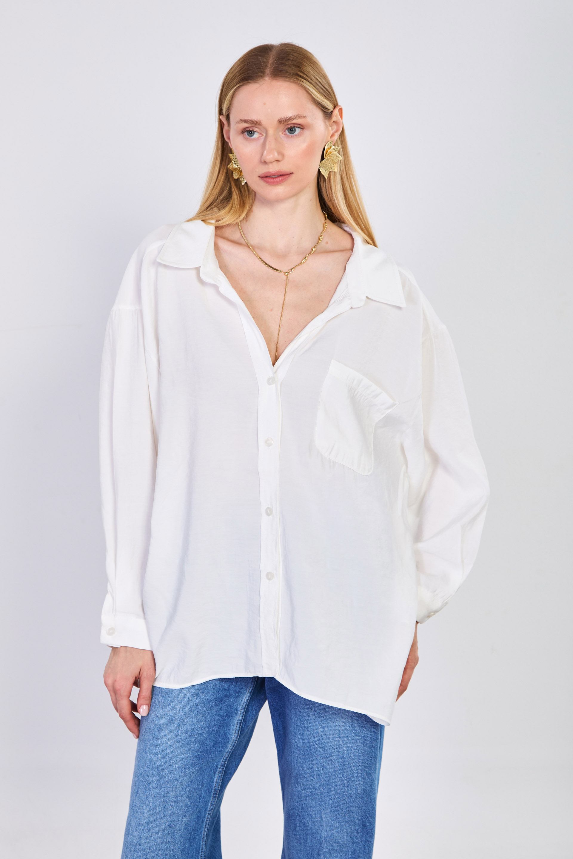 Kadın Tek Cepli V Yaka Gömlek - Beyaz