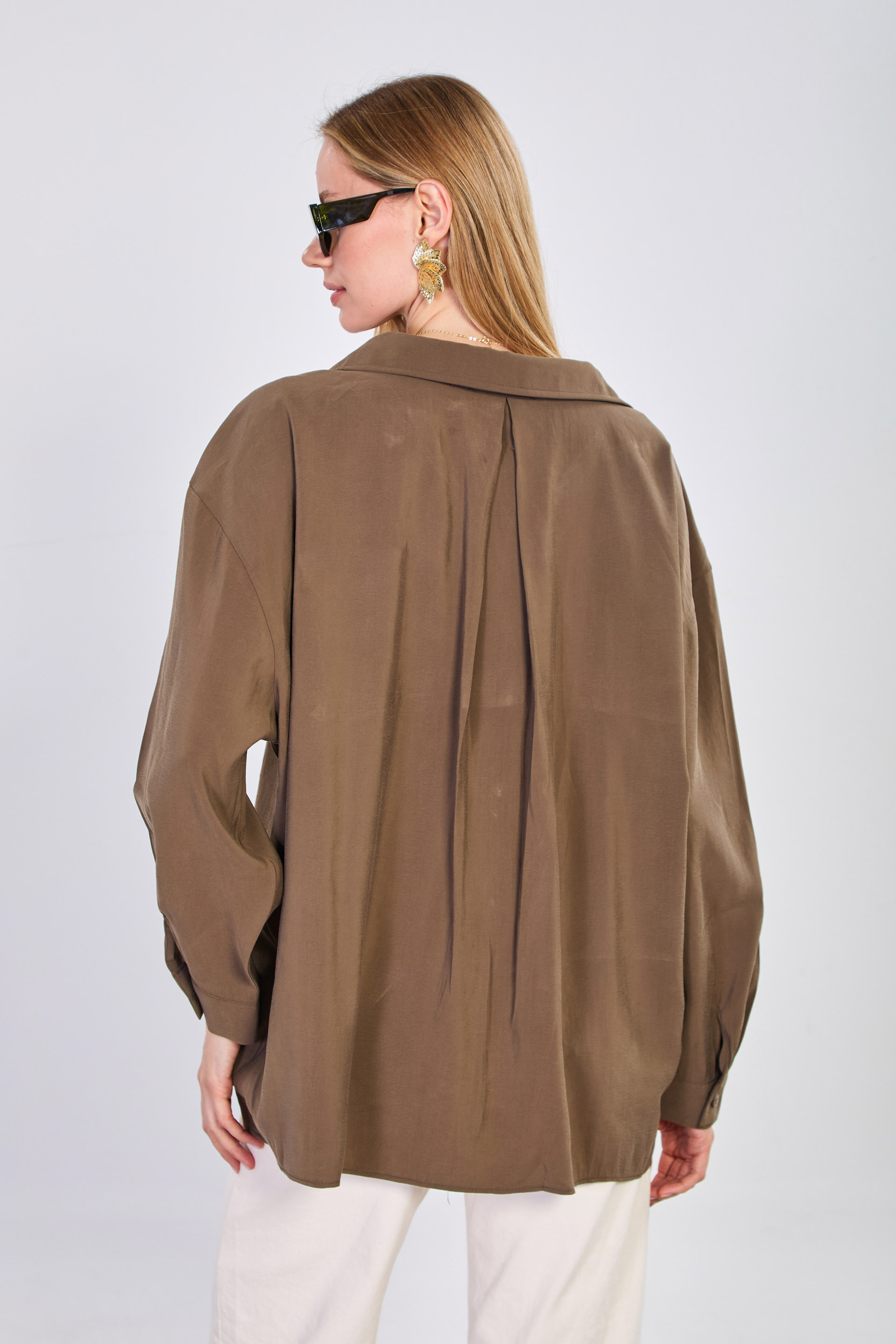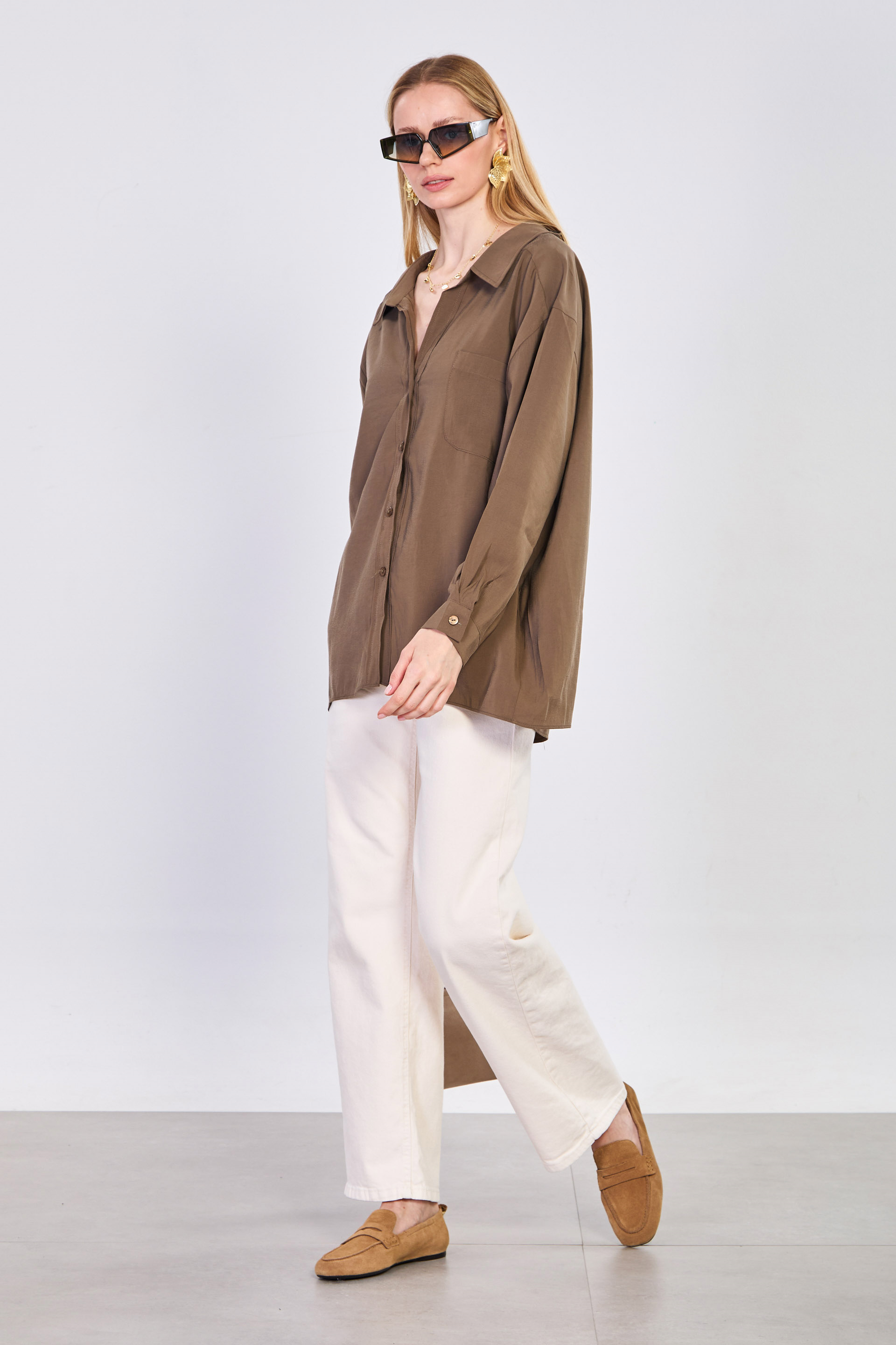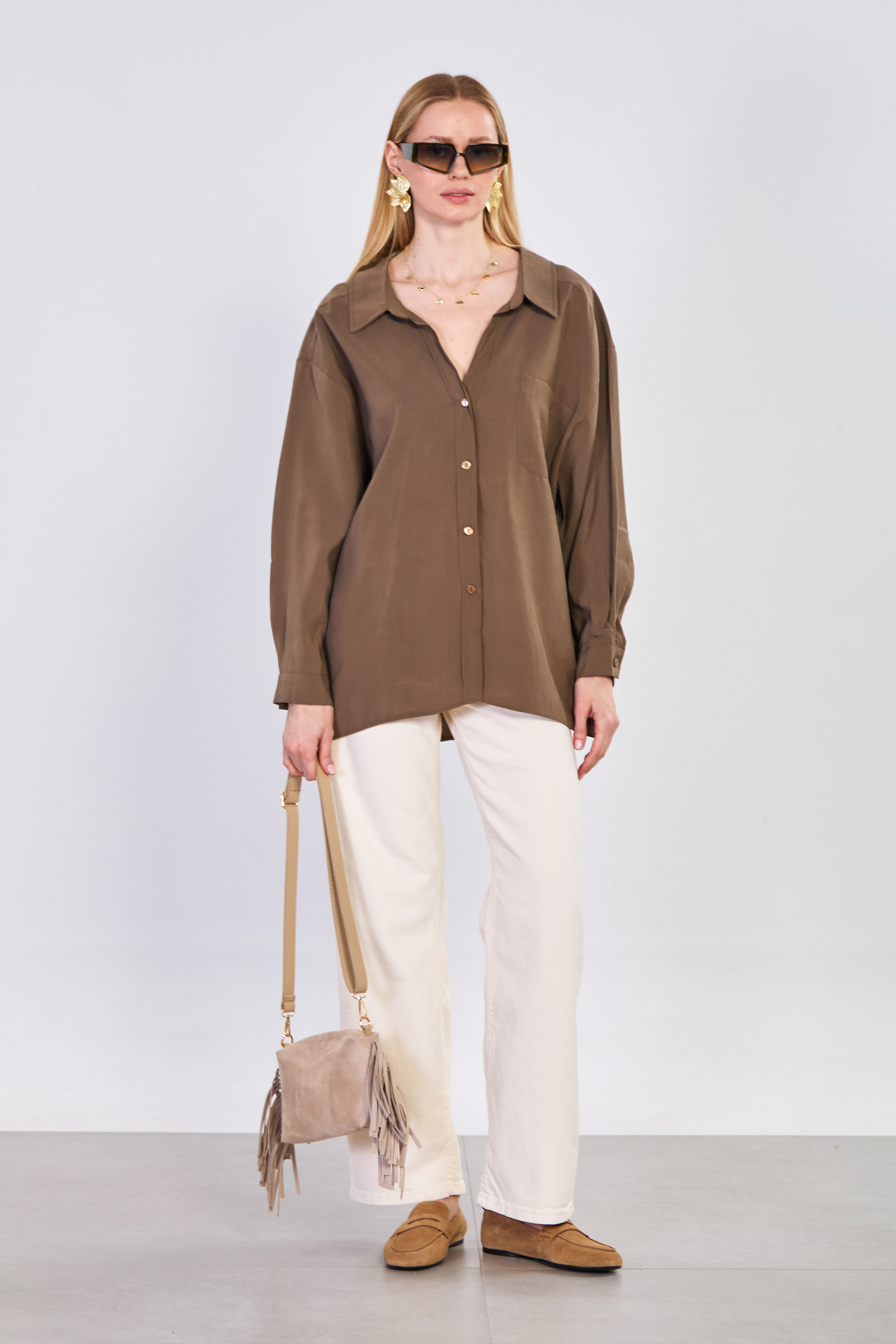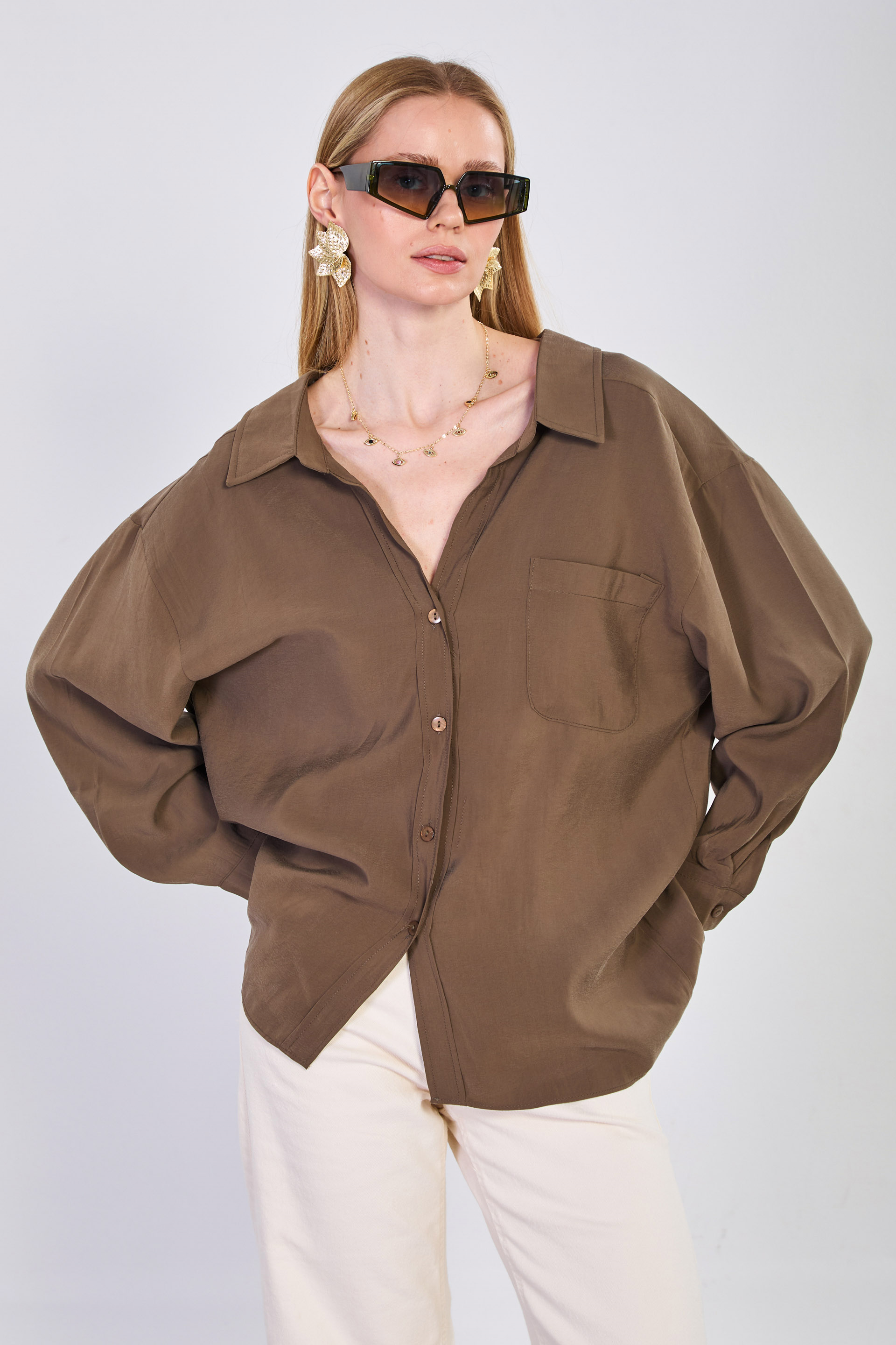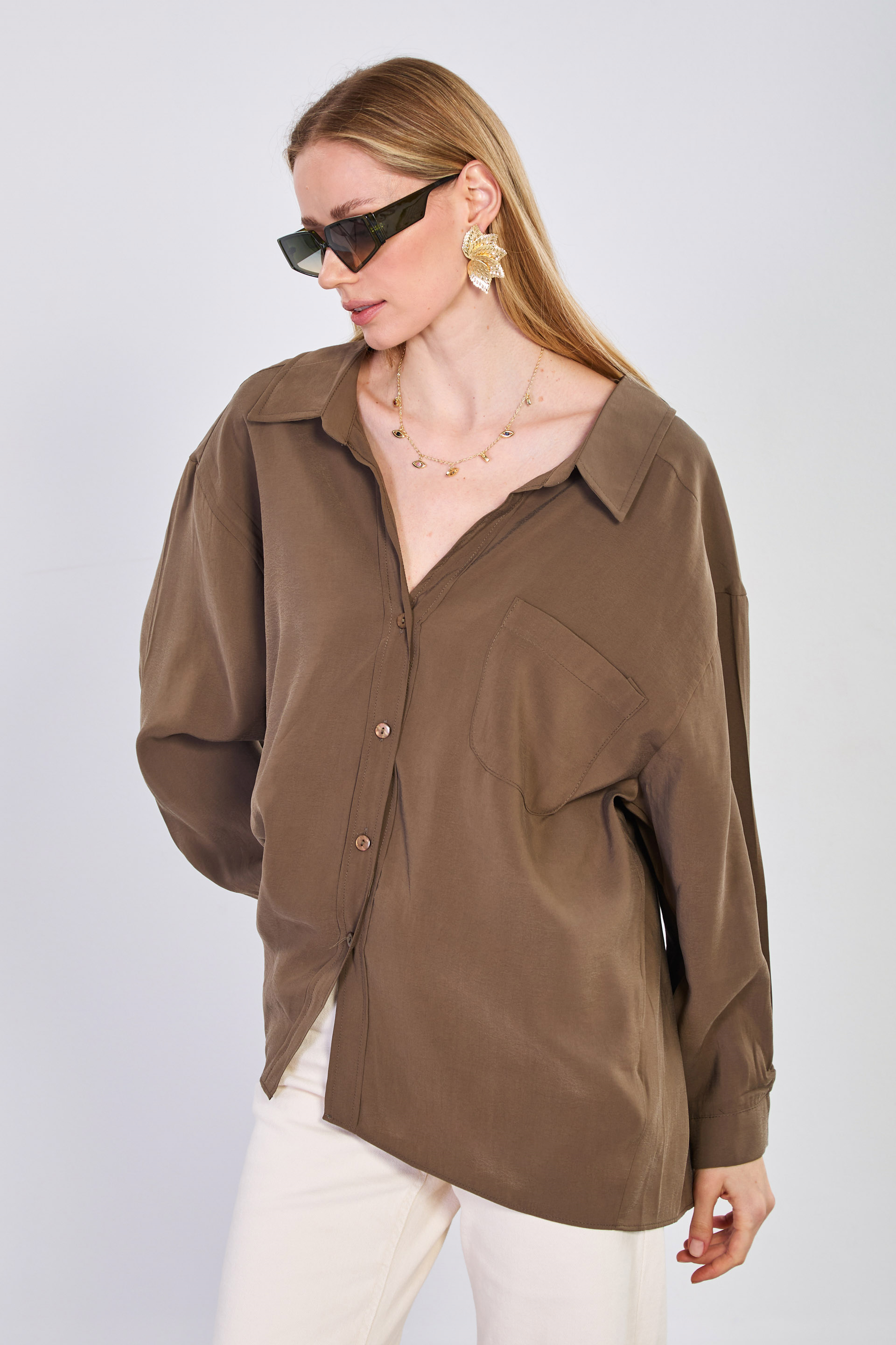 Kadın Tek Cepli V Yaka Gömlek - Haki