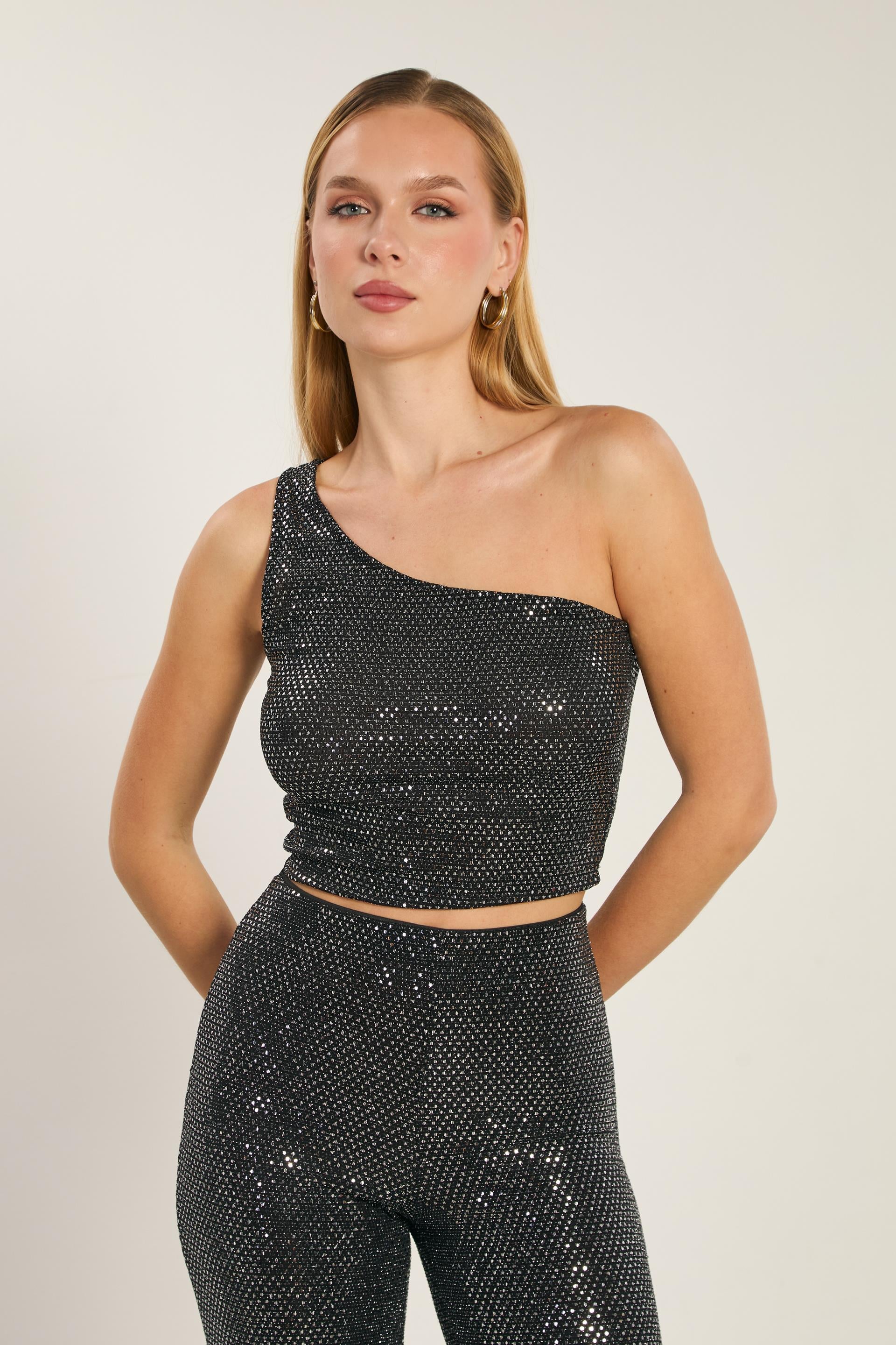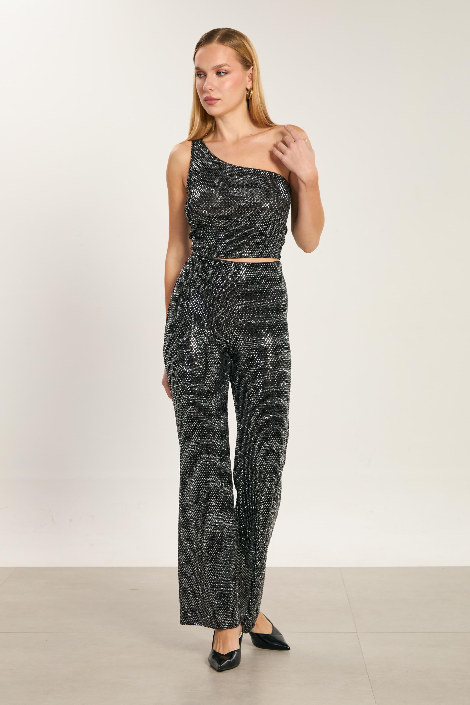 Kadın Tek Omuz Parıltılı Bluz - Siyah