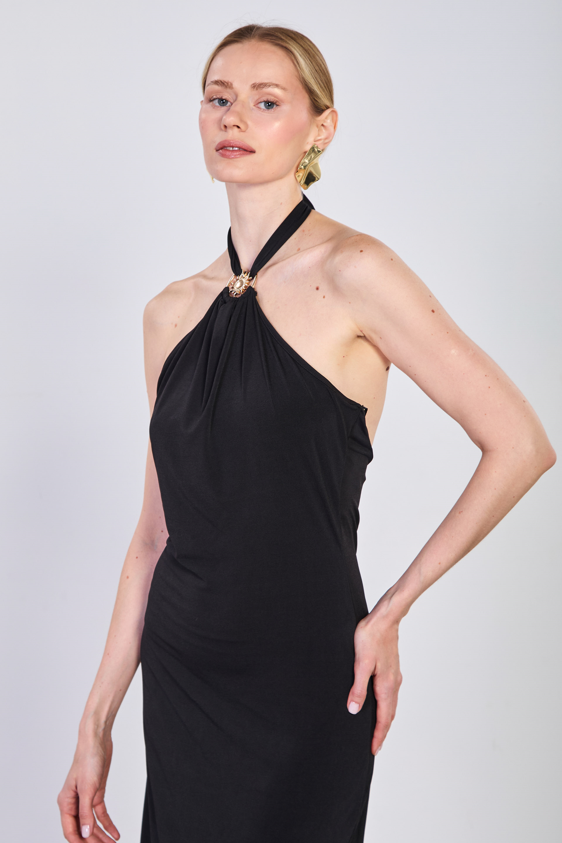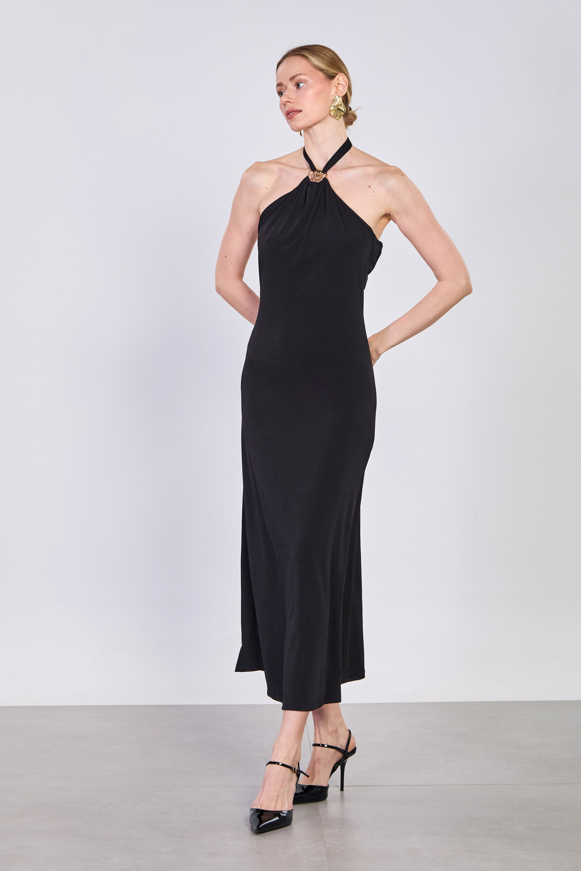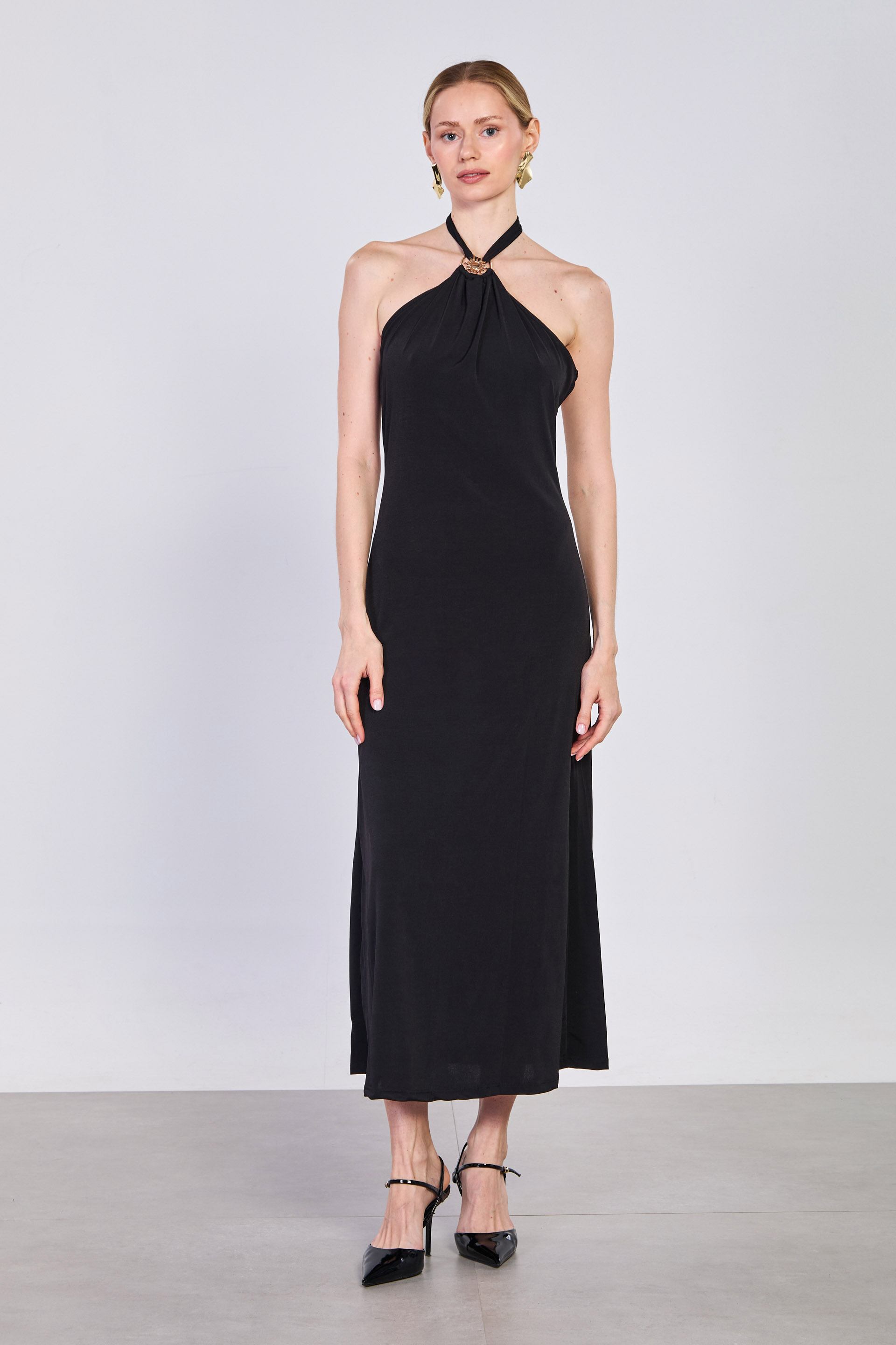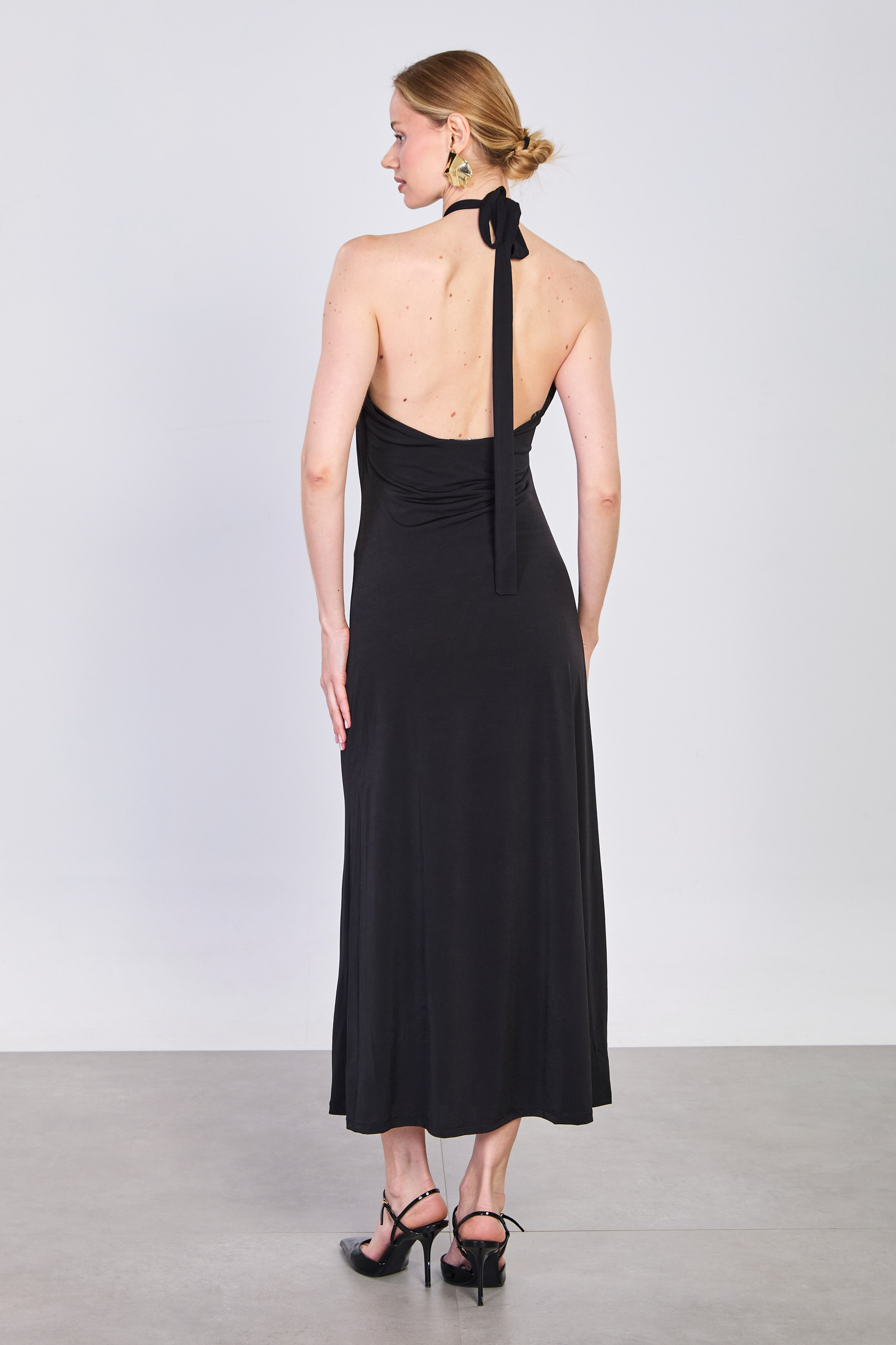 Kadın Tokalı Boyundan Bağlamalı Uzun Elbise - Siyah