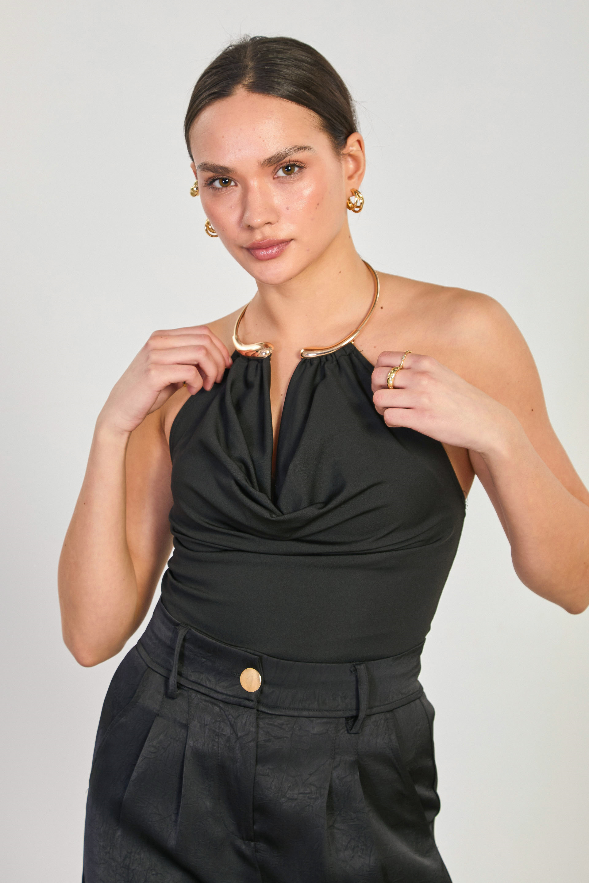 Kadın Tokalı Boyundan Geçmeli Degaje Yaka Bluz - Siyah