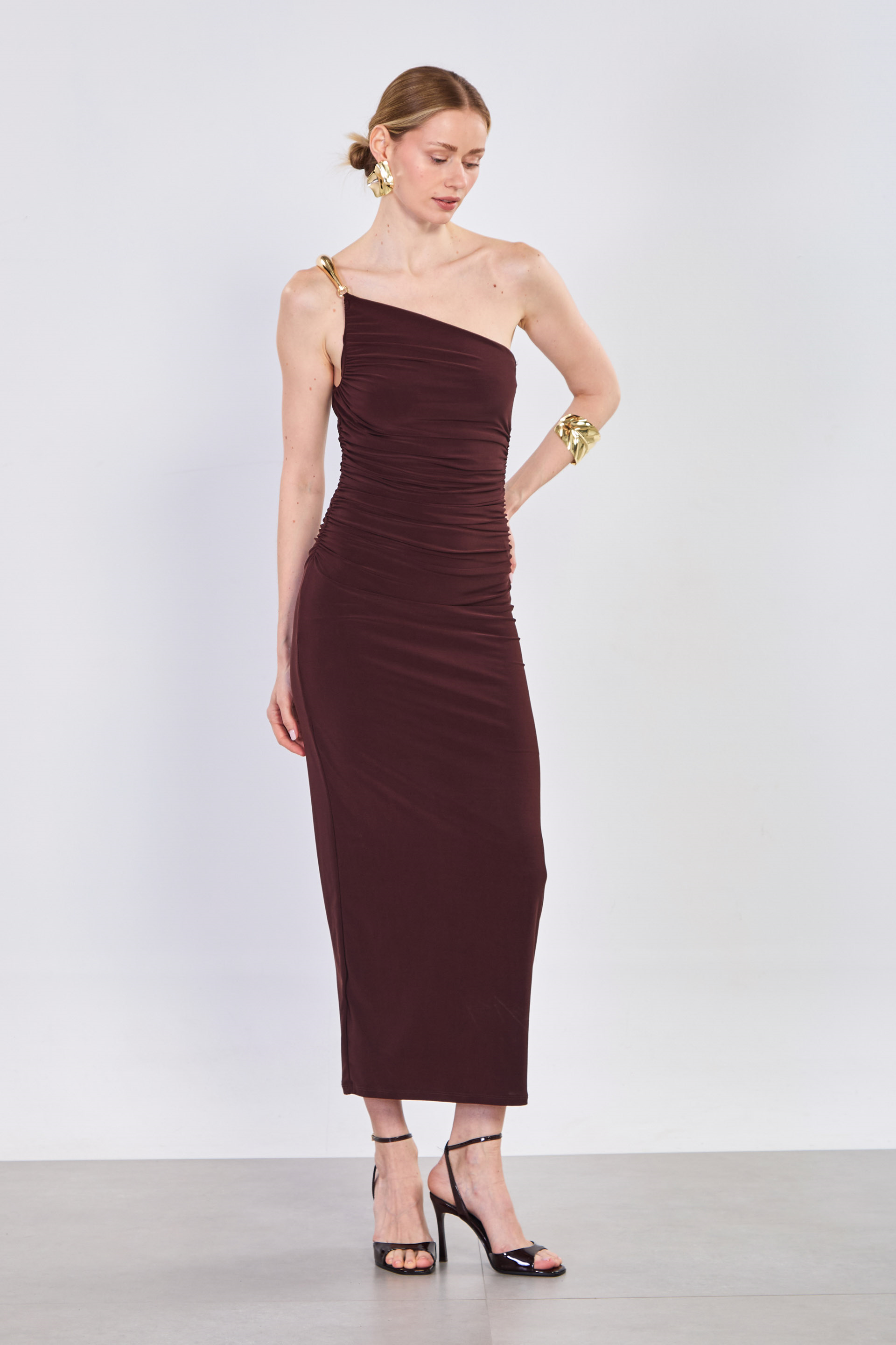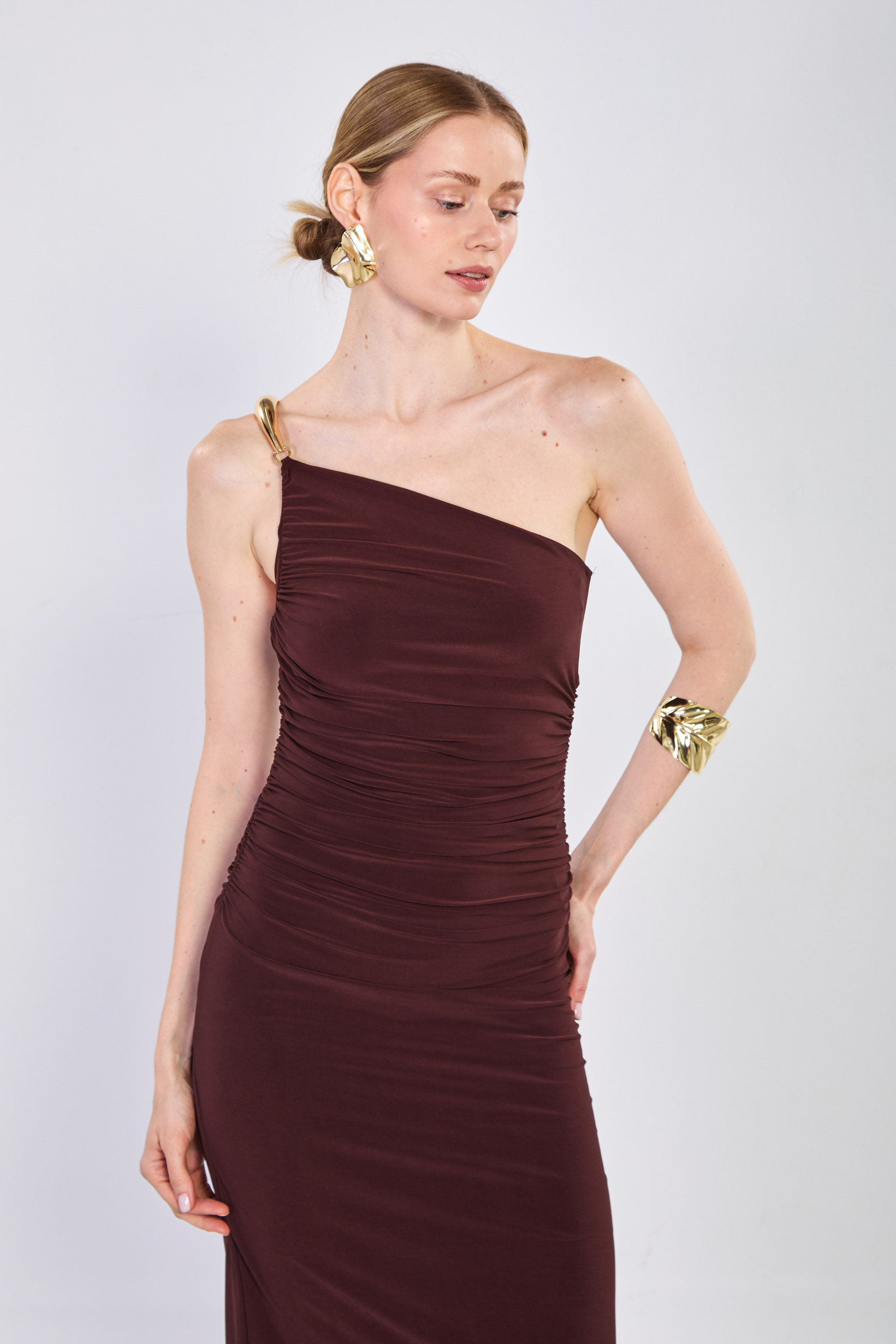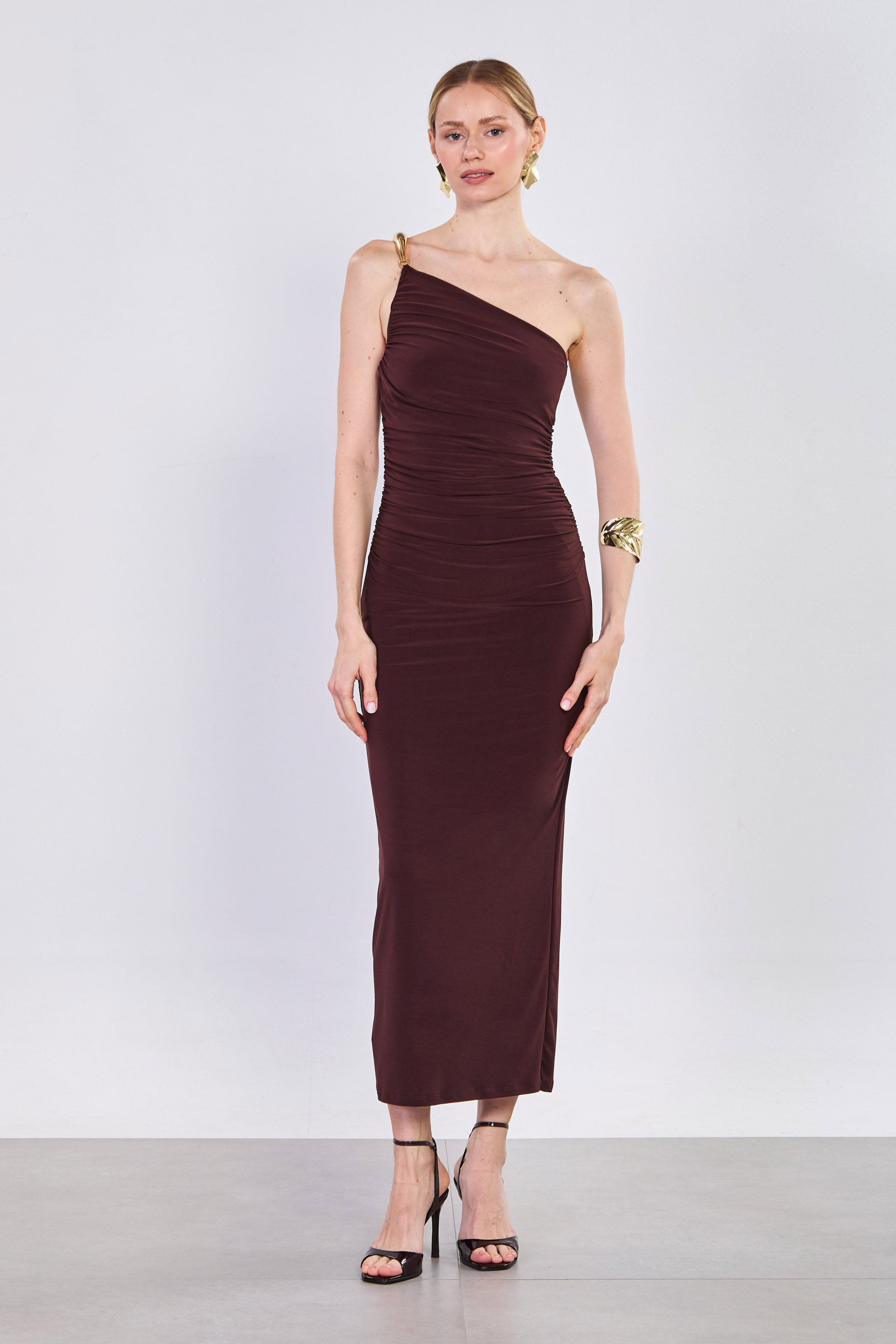Kadın Tokalı Yan Büzgülü Uzun Elbise - Acı Kahve