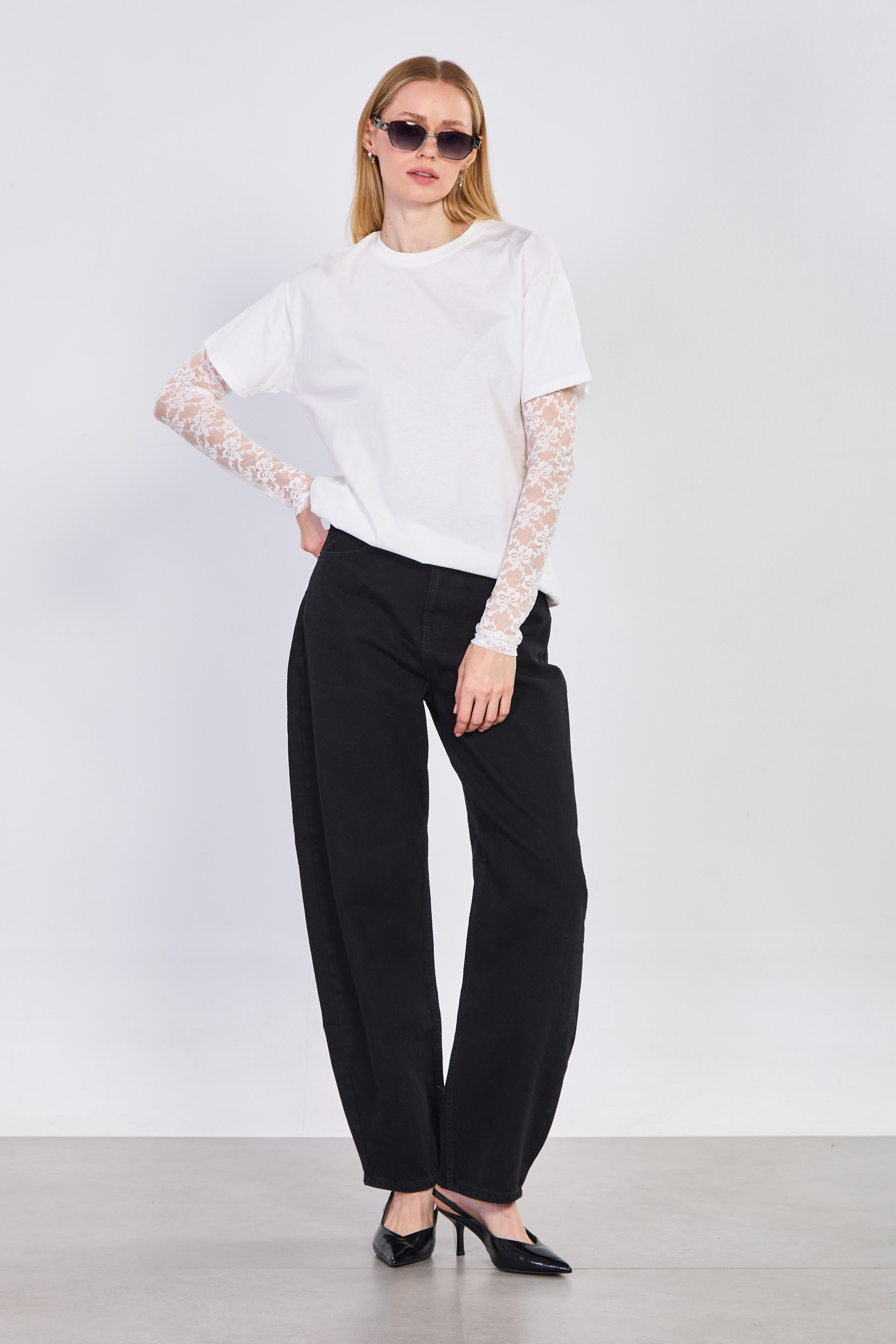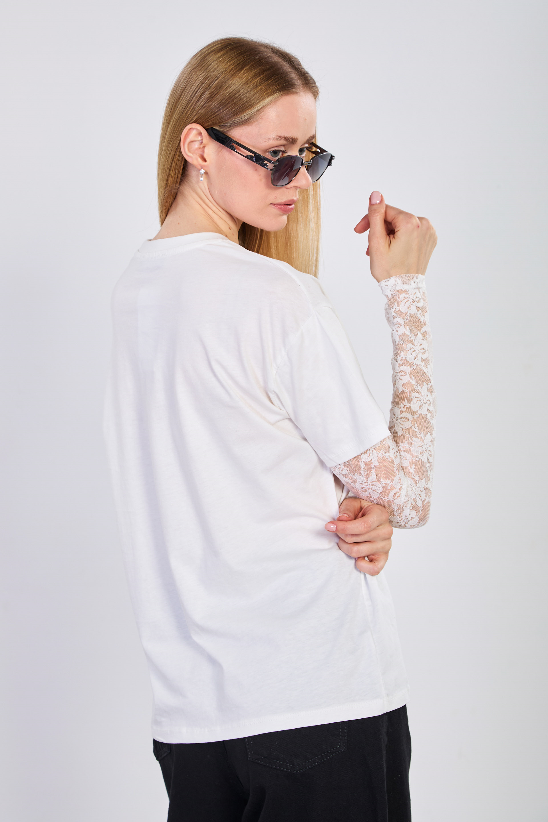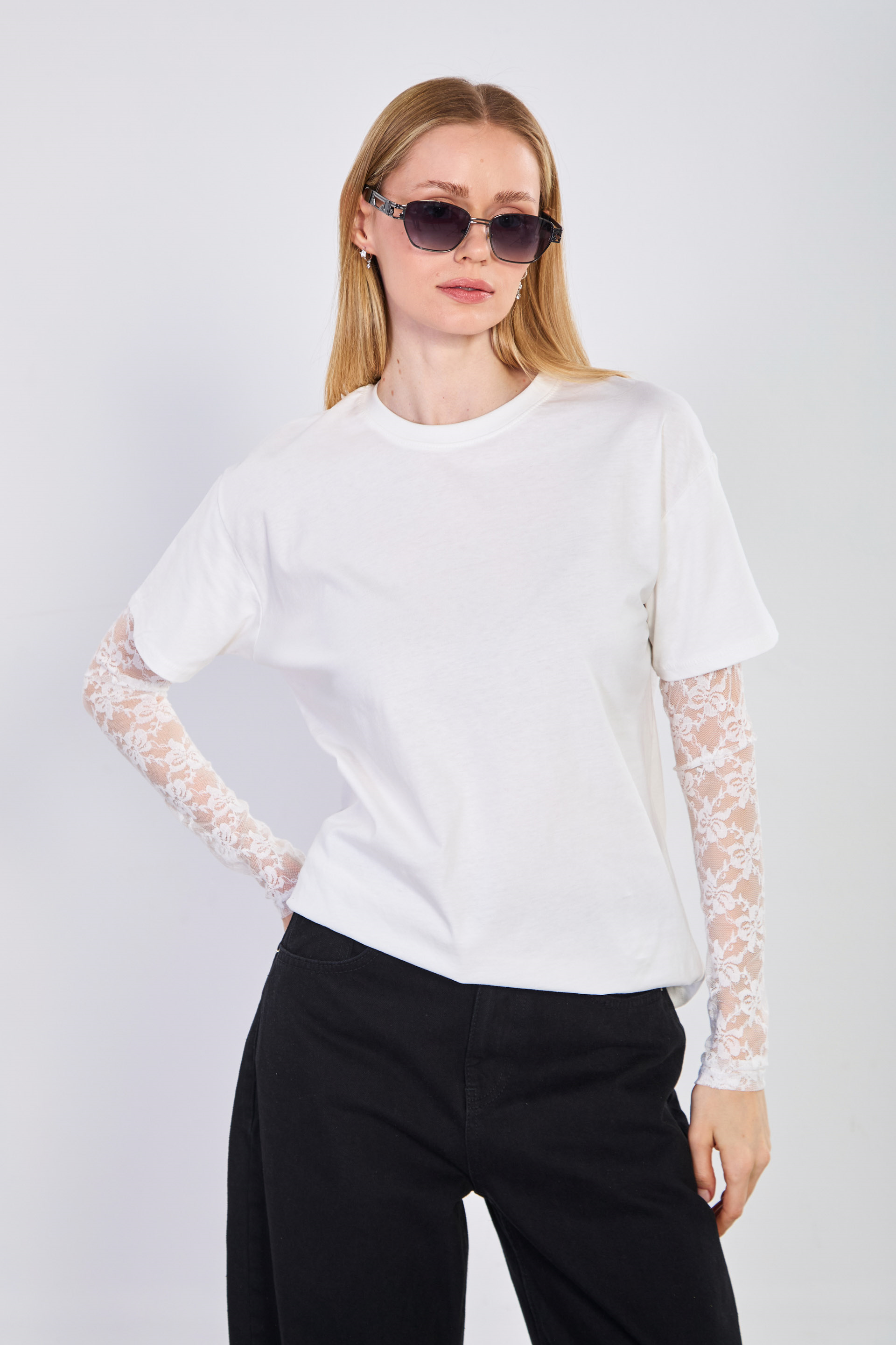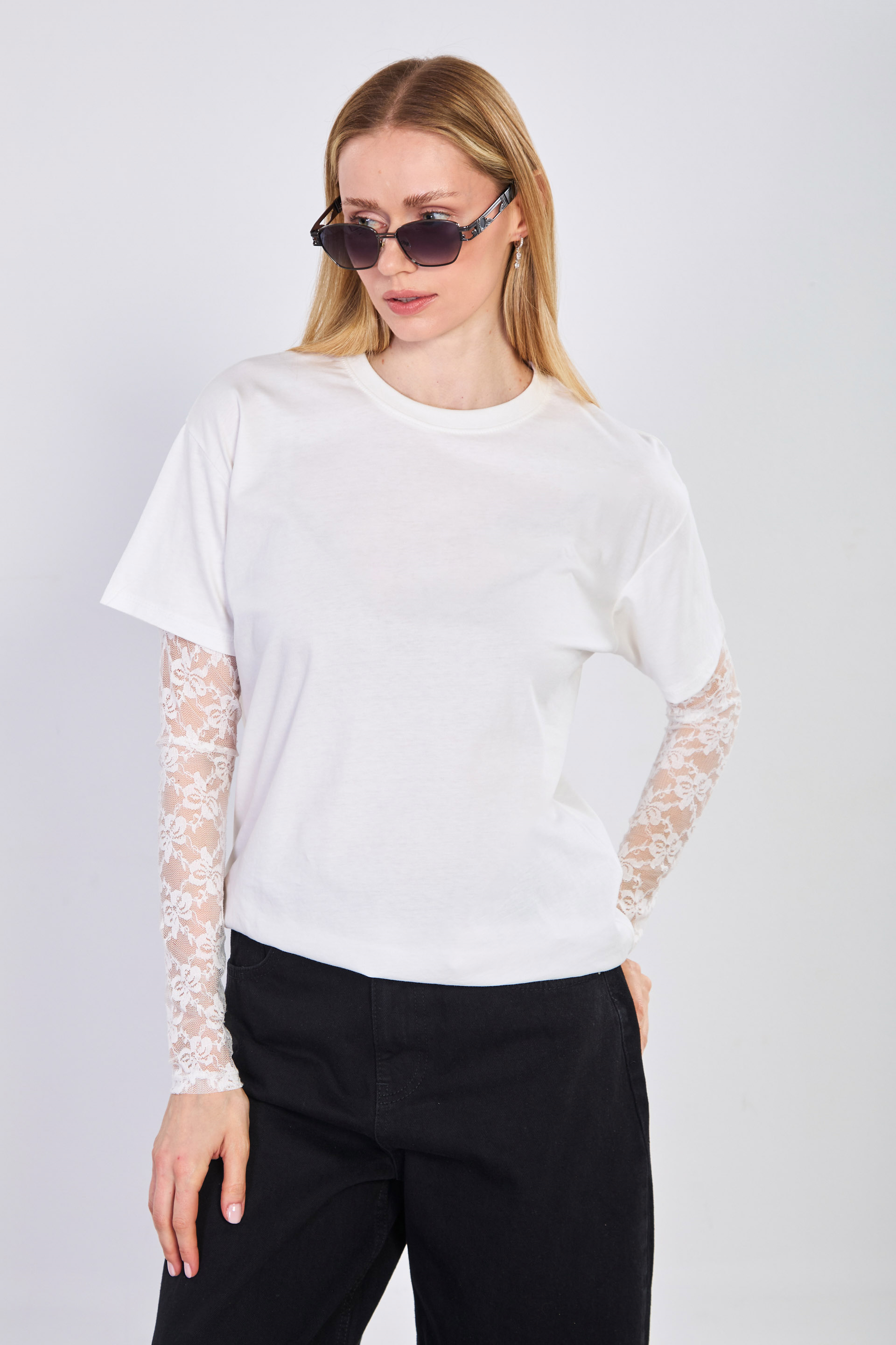 Kadın Tül Kollu Oversize T-Shirt - Ekru