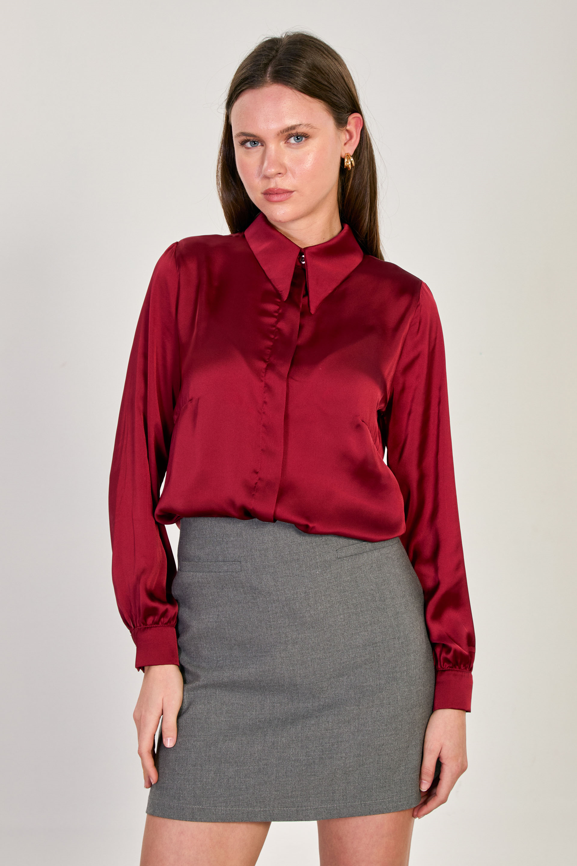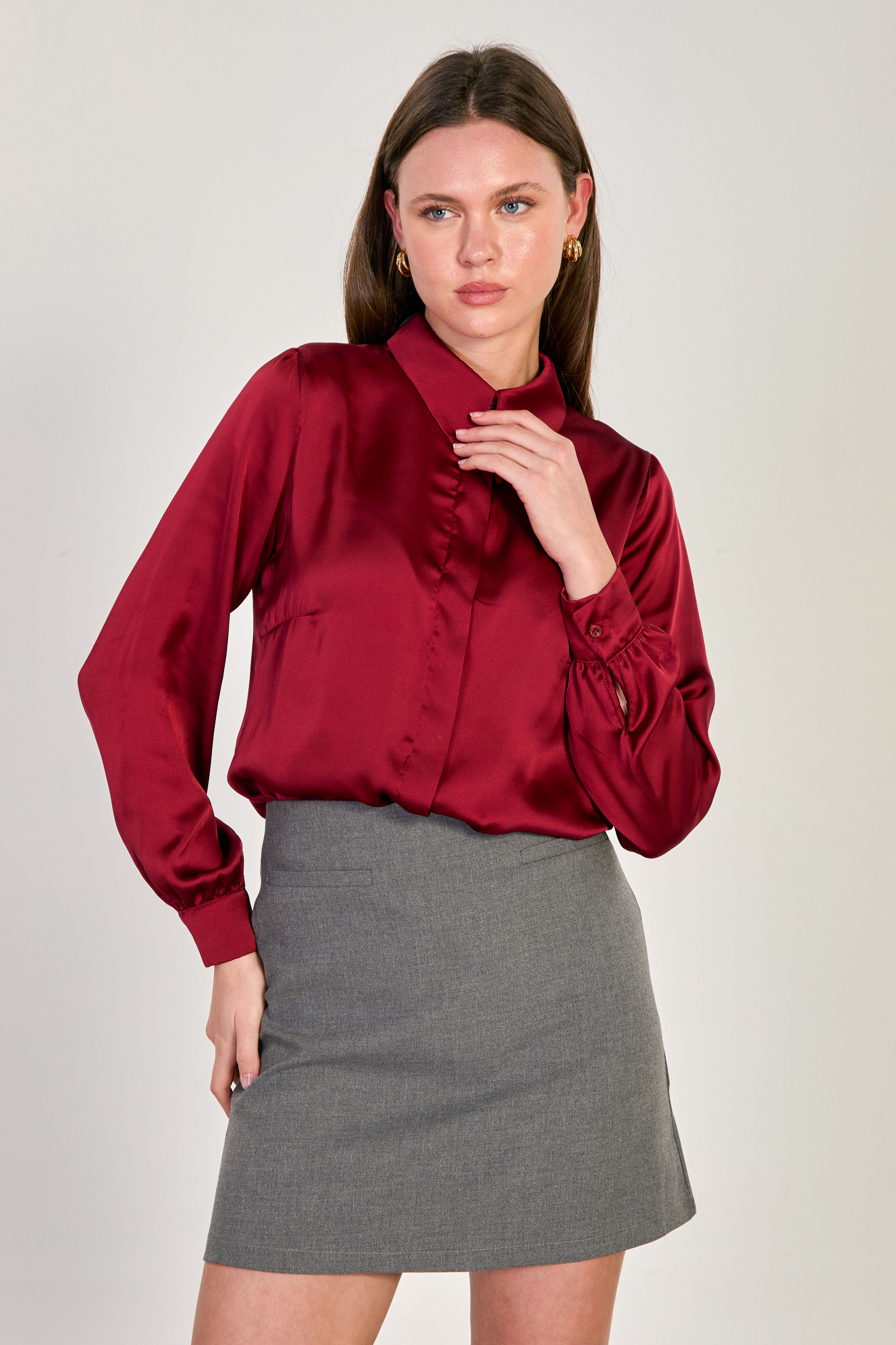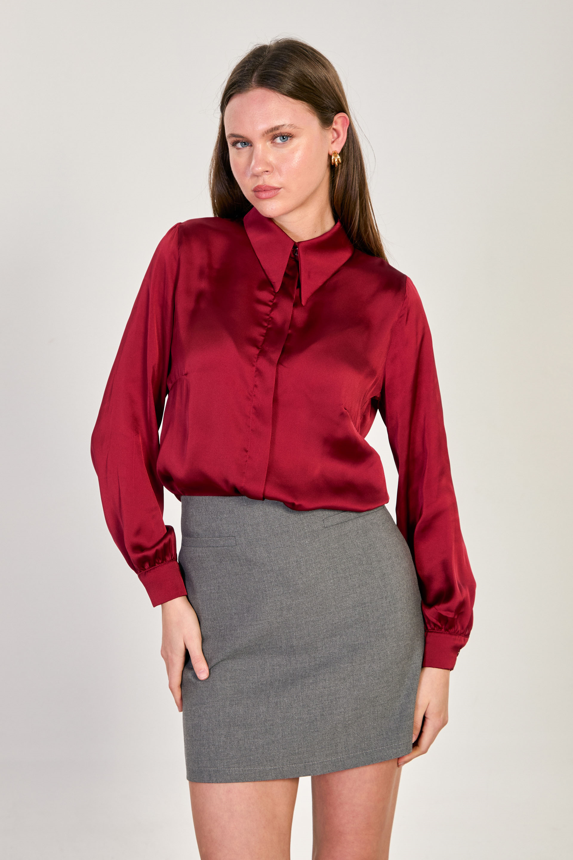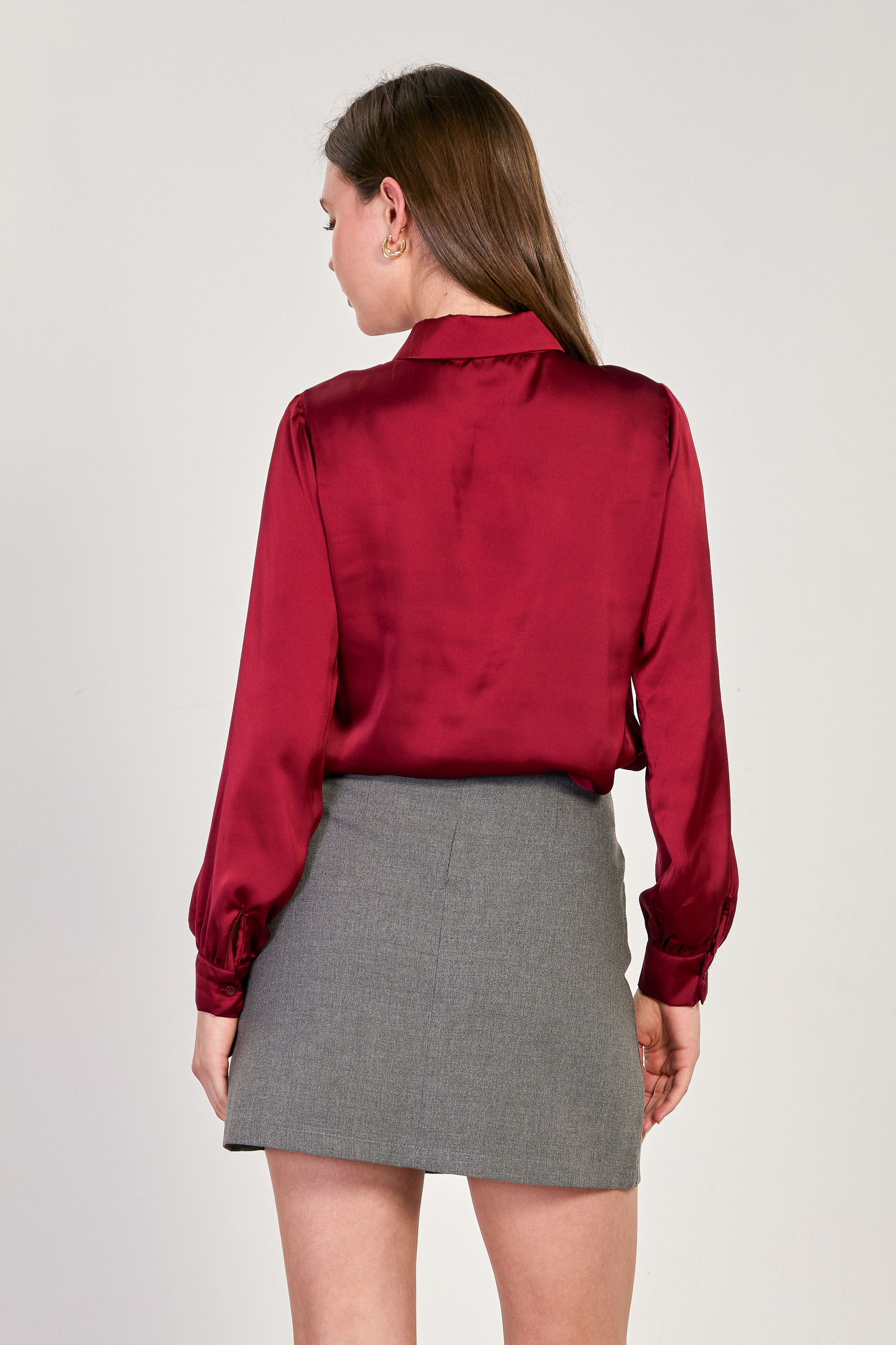 Kadın Uzun Kollu Saten Gömlek - Bordo