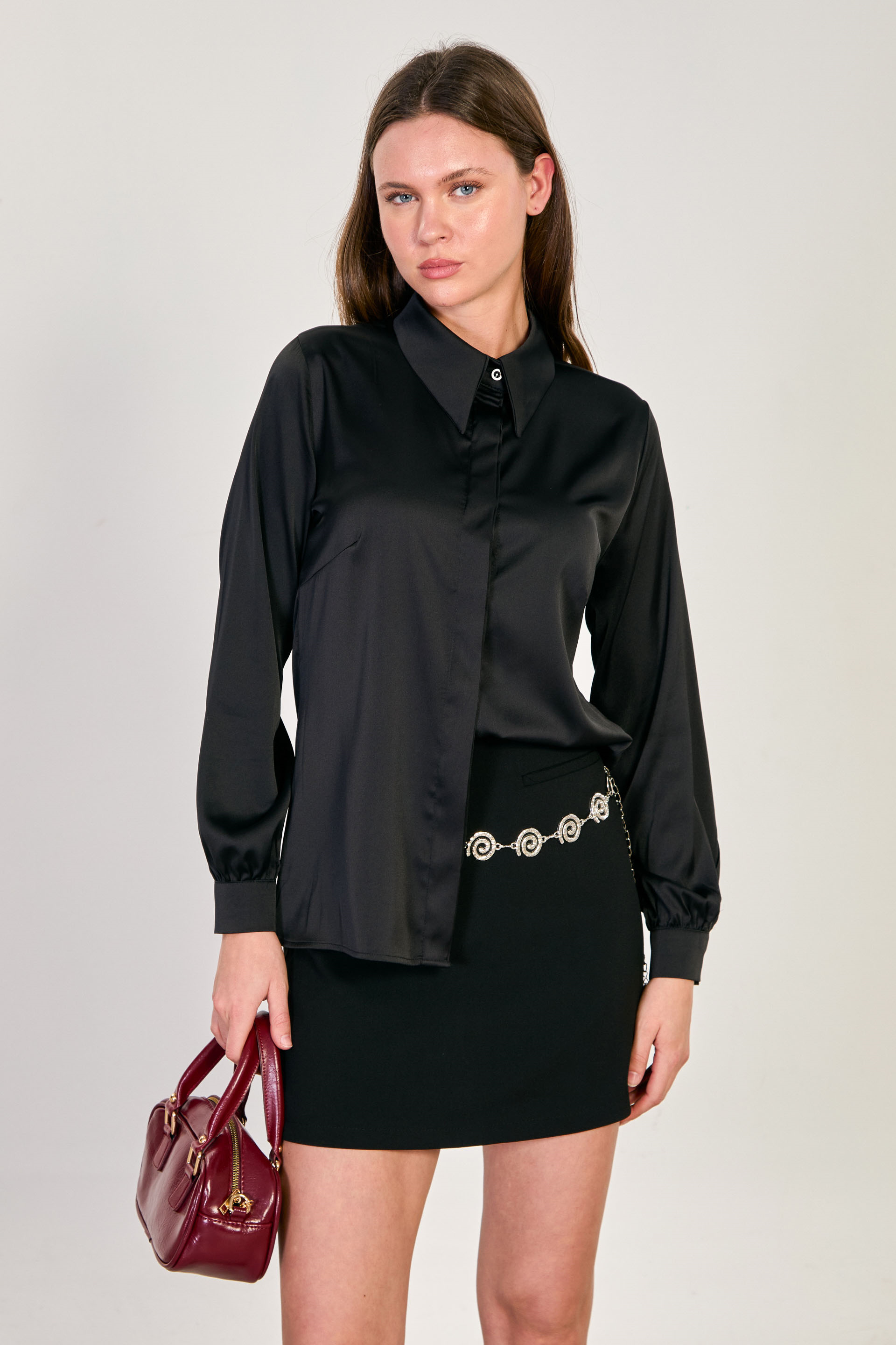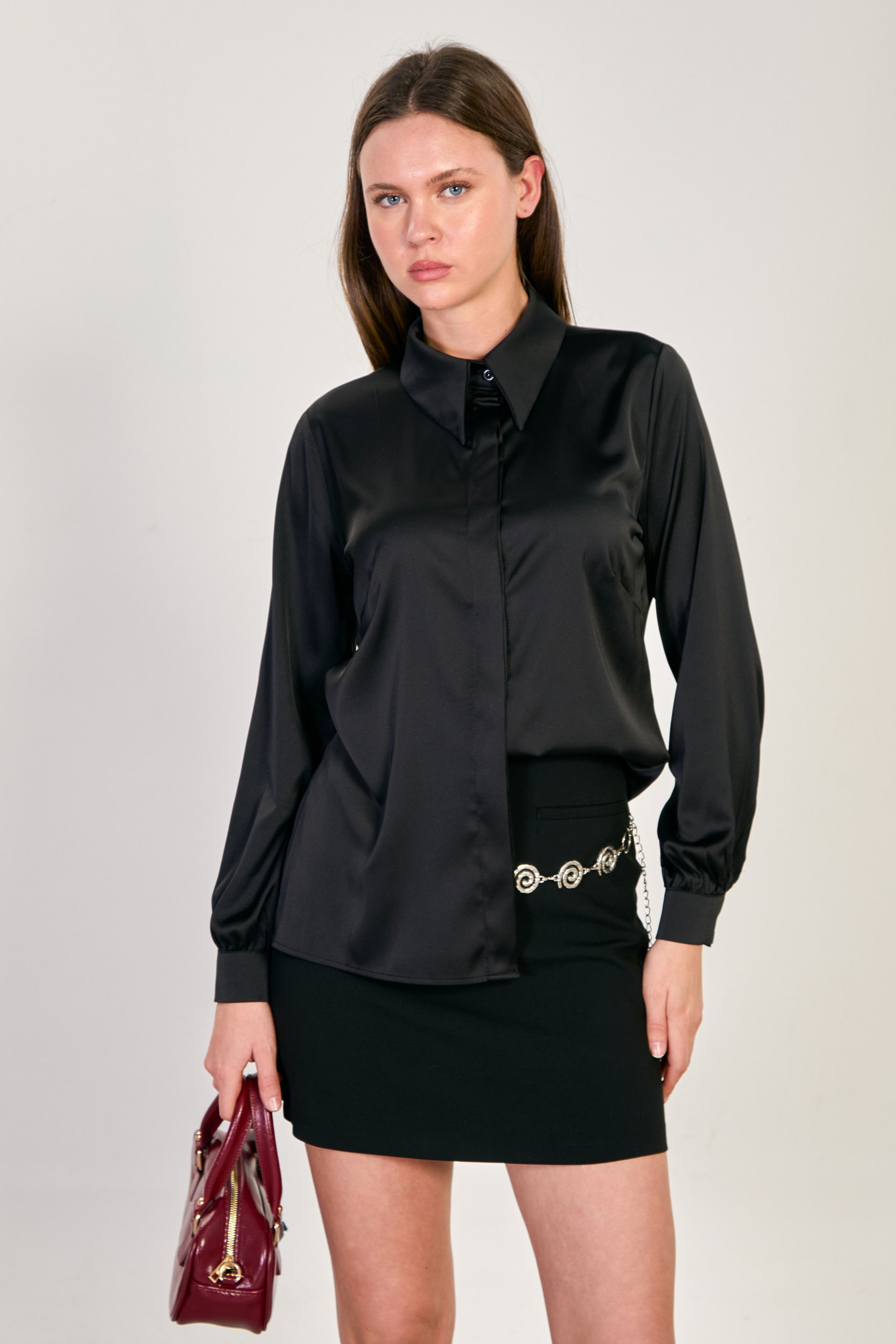 Kadın Uzun Kollu Saten Gömlek - Siyah