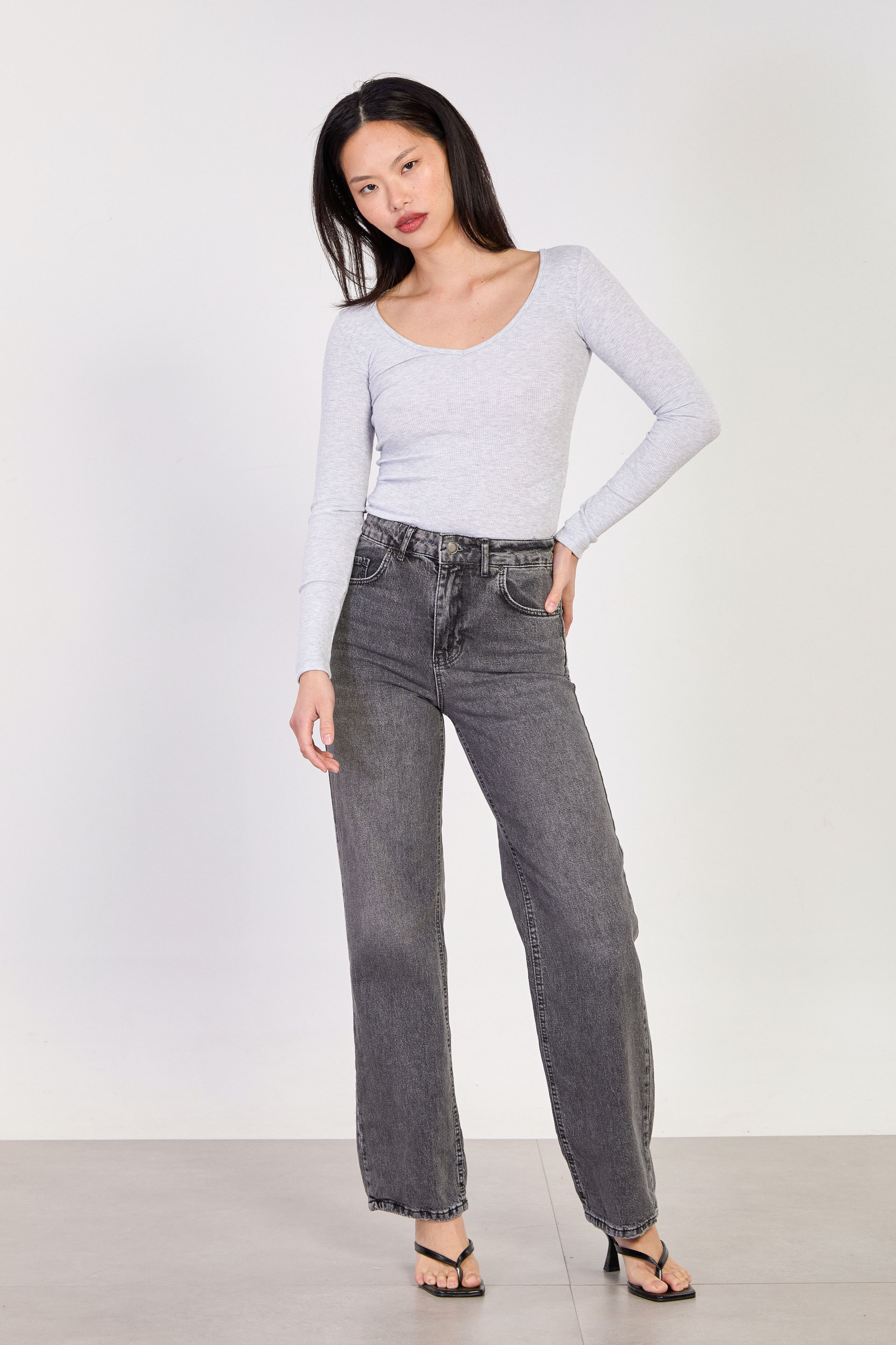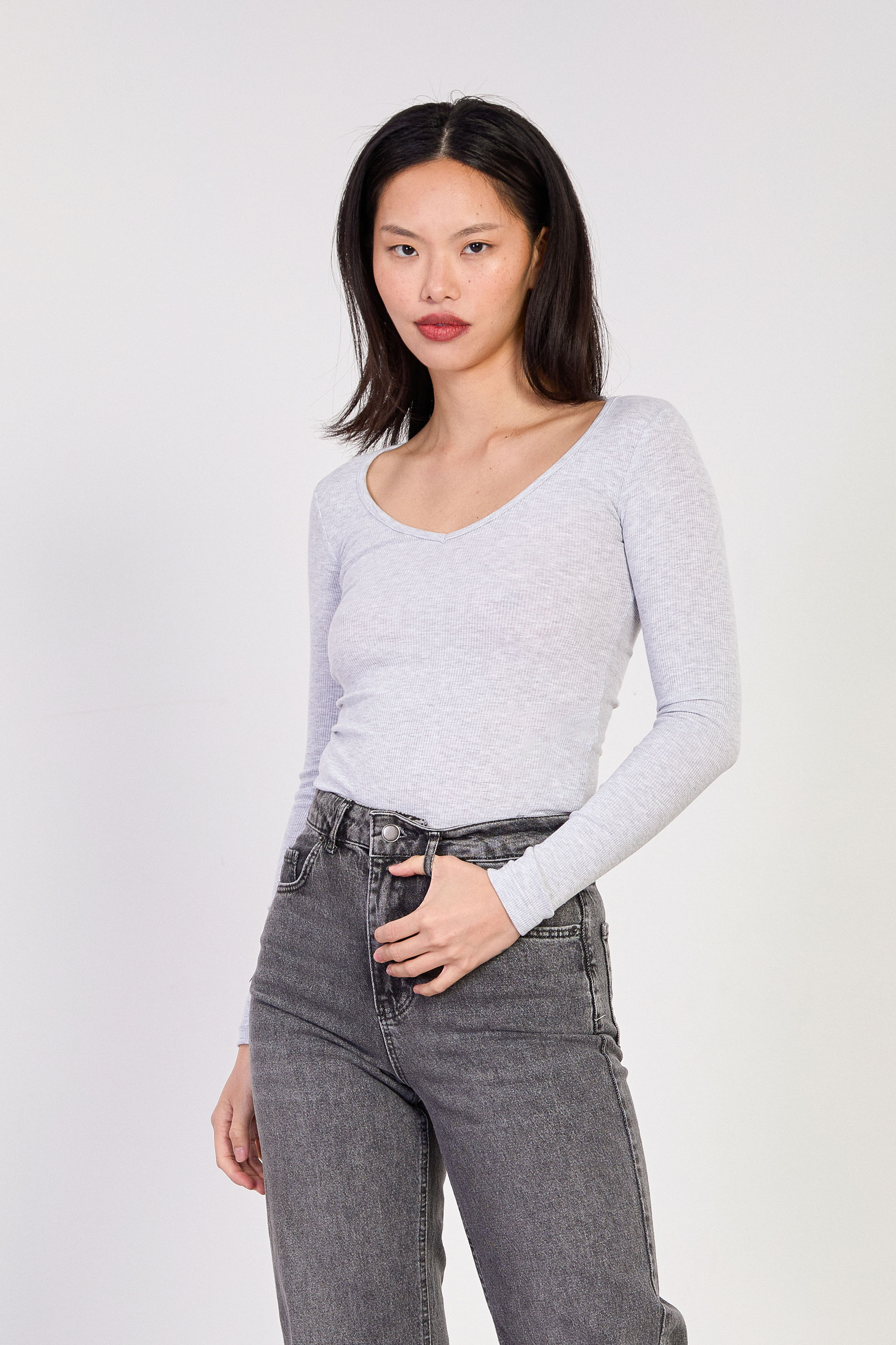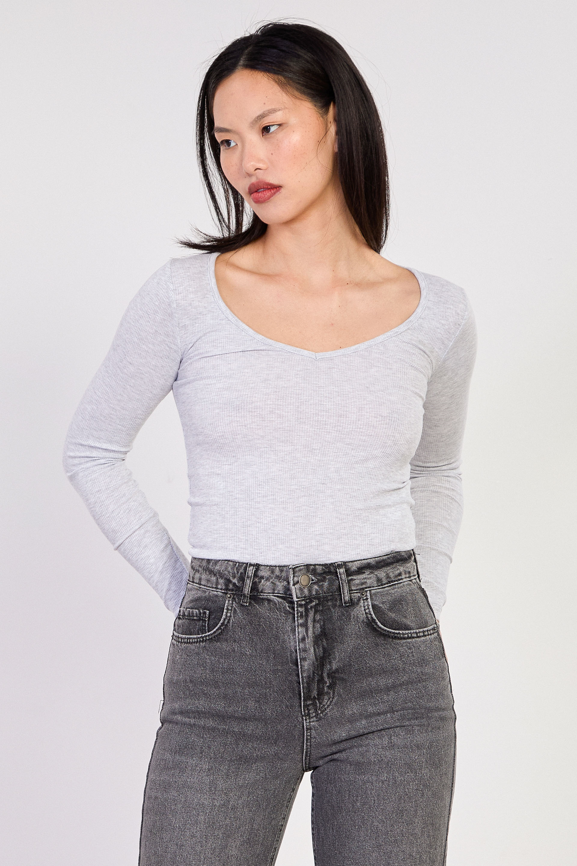Kadın Uzun Kollu V Yaka Body - Kar Melanj