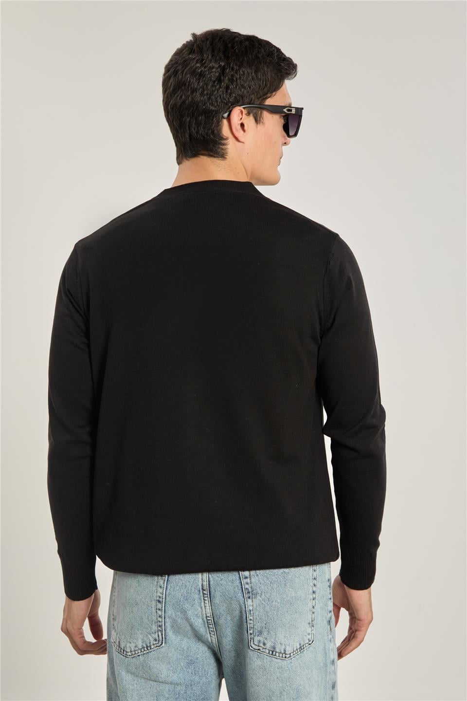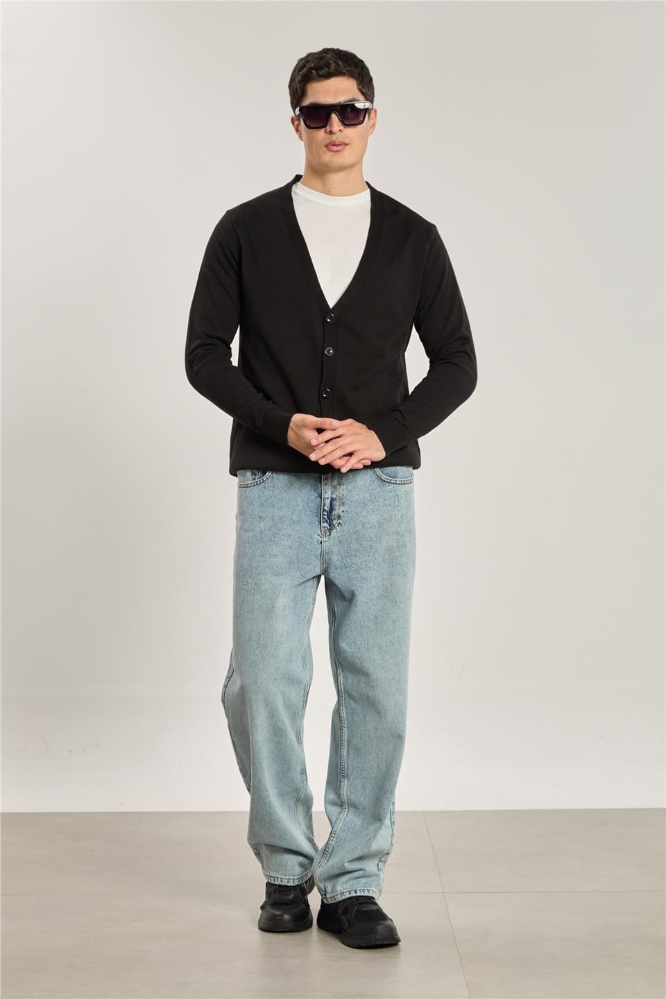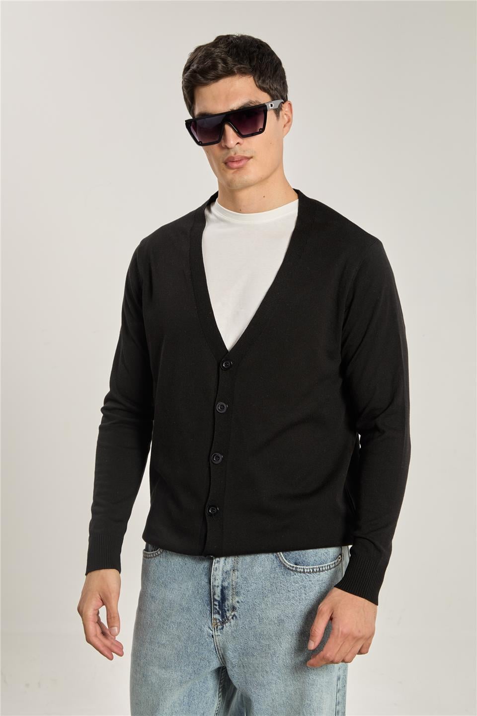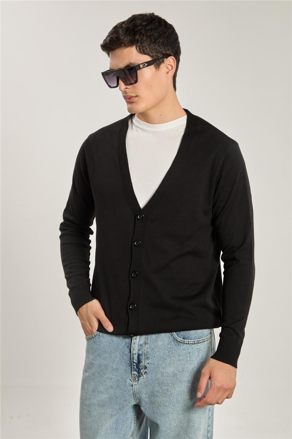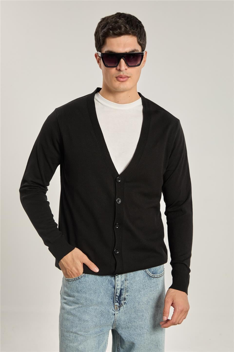 Erkek V Yaka Düğmeli Triko Hırka - Siyah