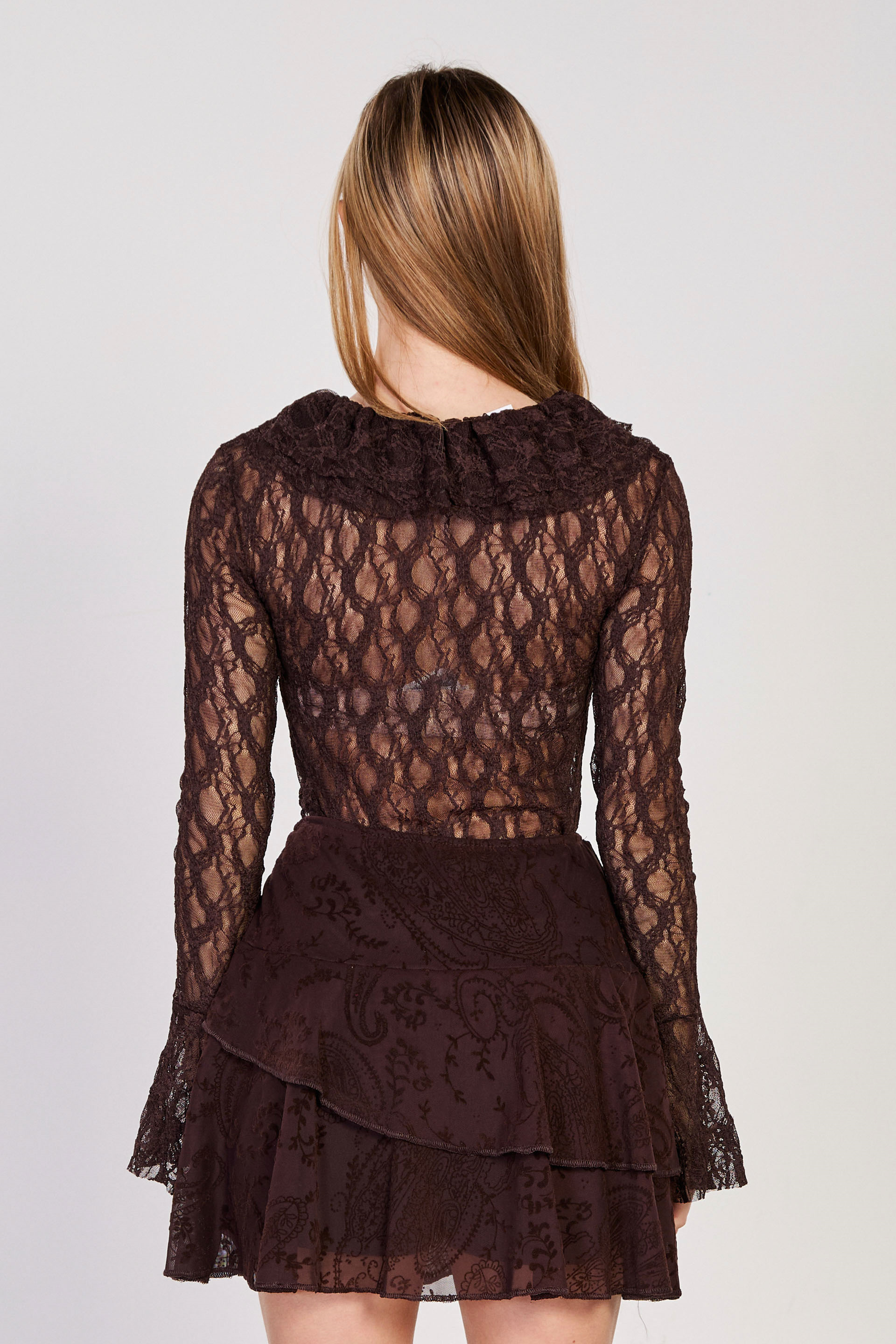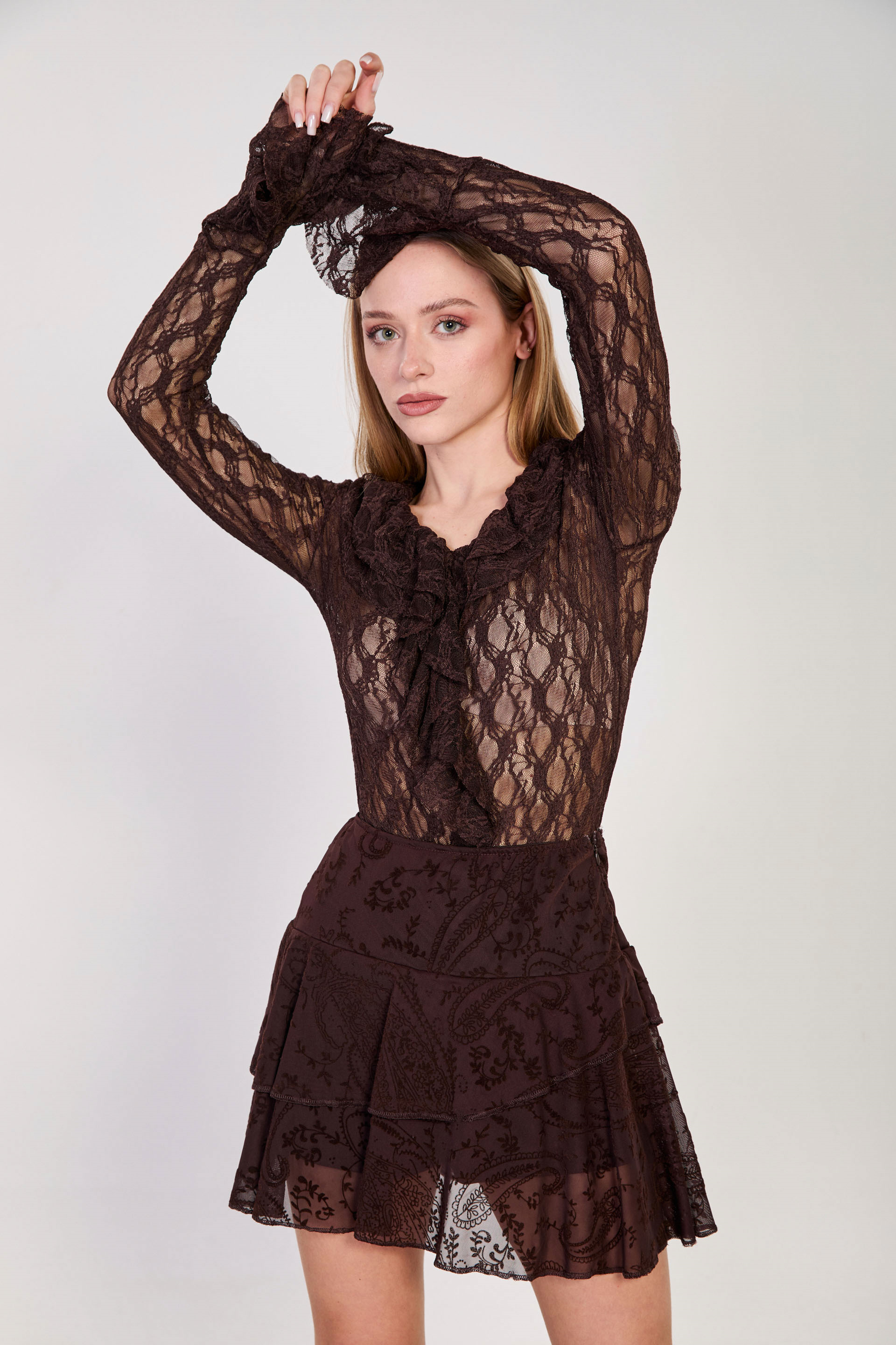 Kadın V Yaka Fırfırlı Dantel Bluz - Acı Kahve