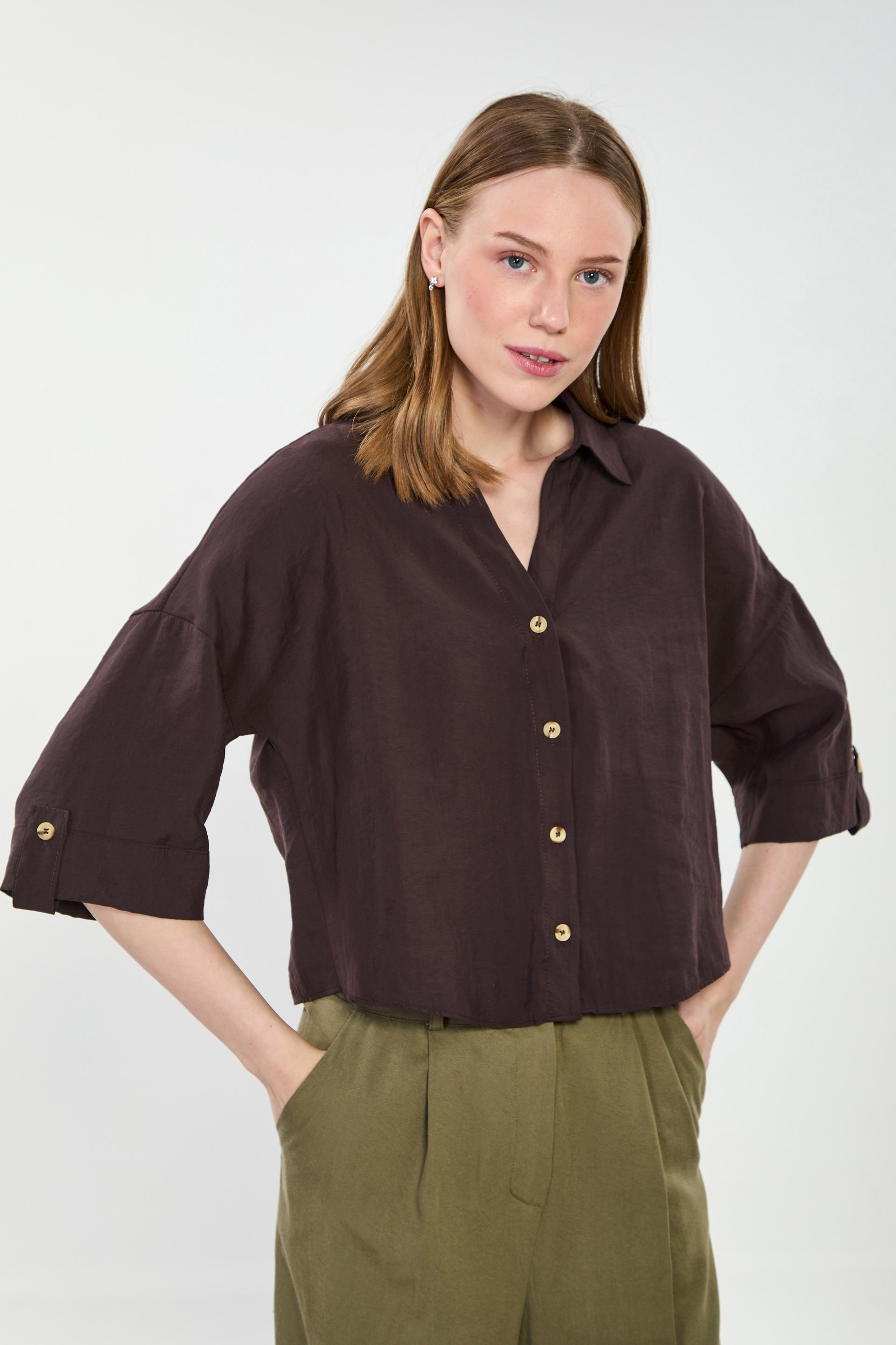 Kadın V Yaka Geniş Kol Kısa Gömlek - Acı Kahve