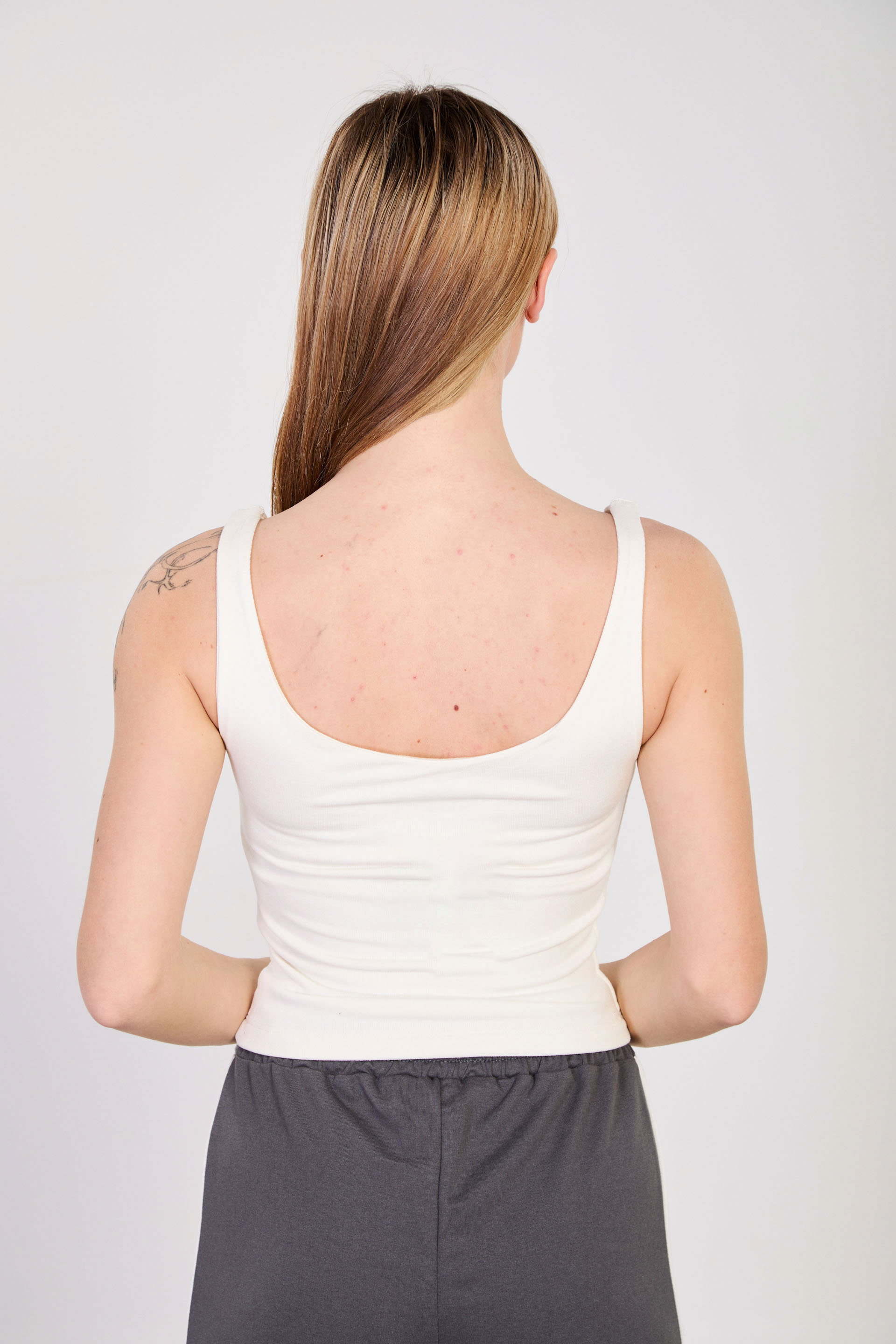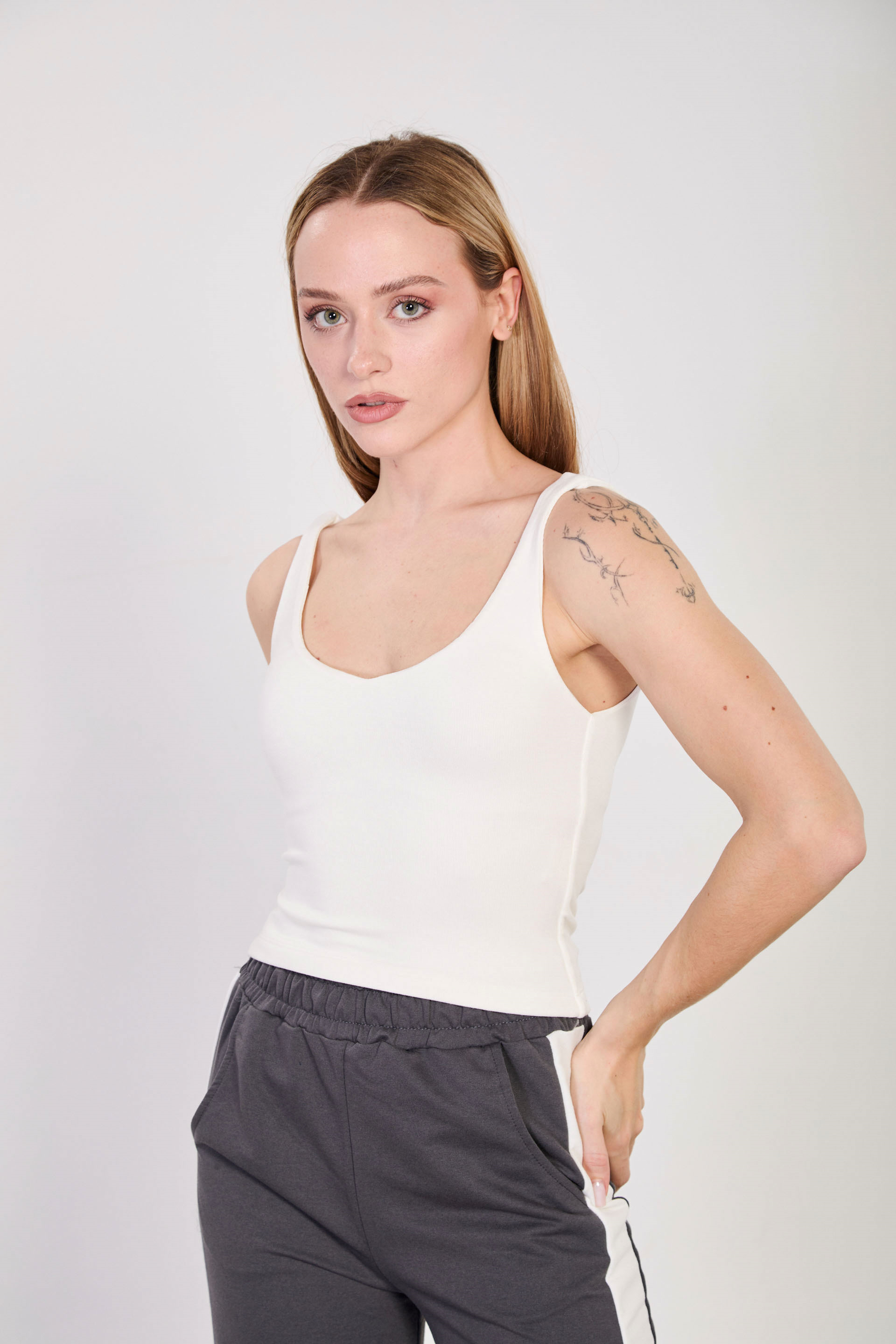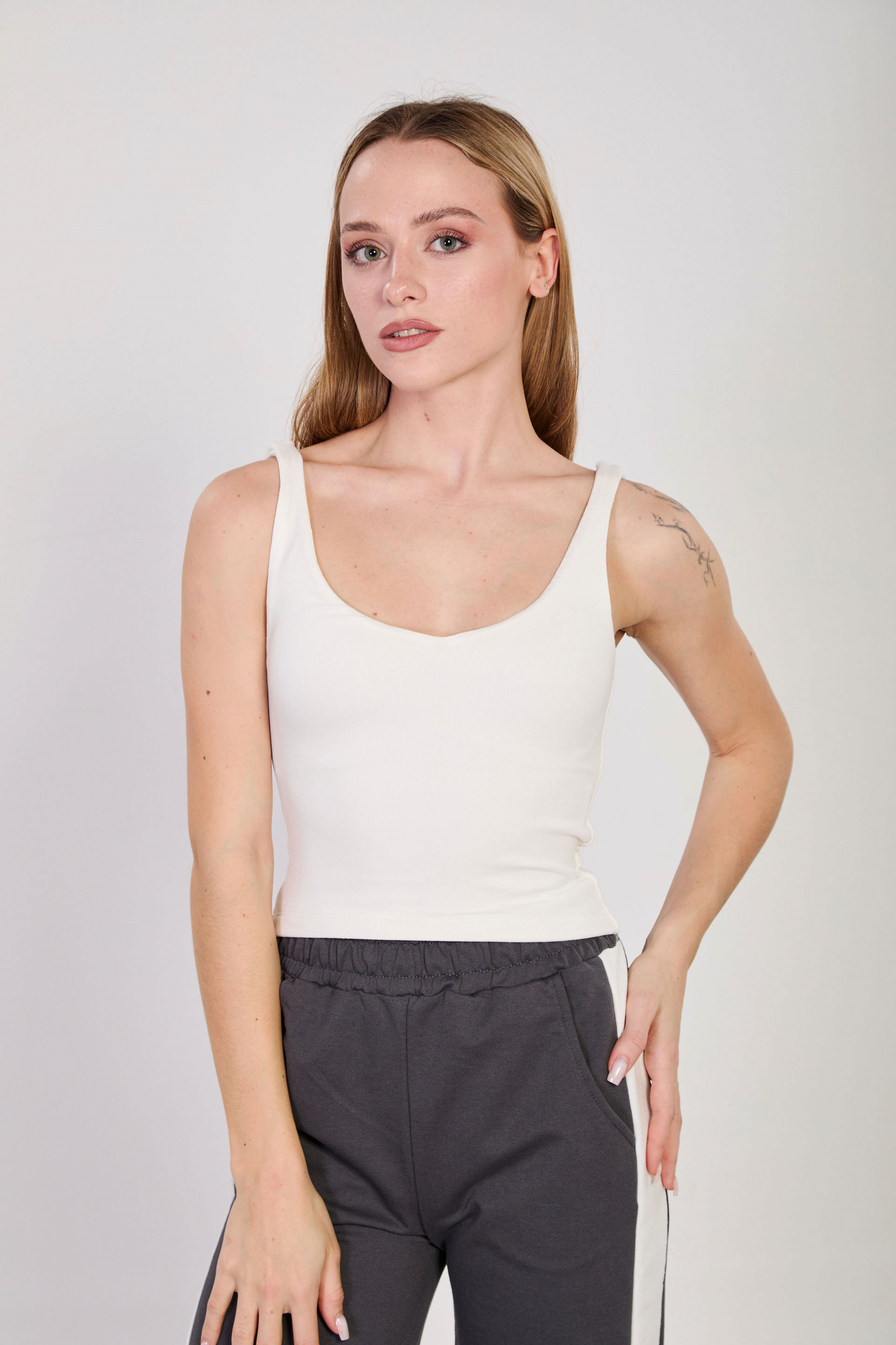 Kadın V Yaka Kalın Askılı Crop Top - Beyaz