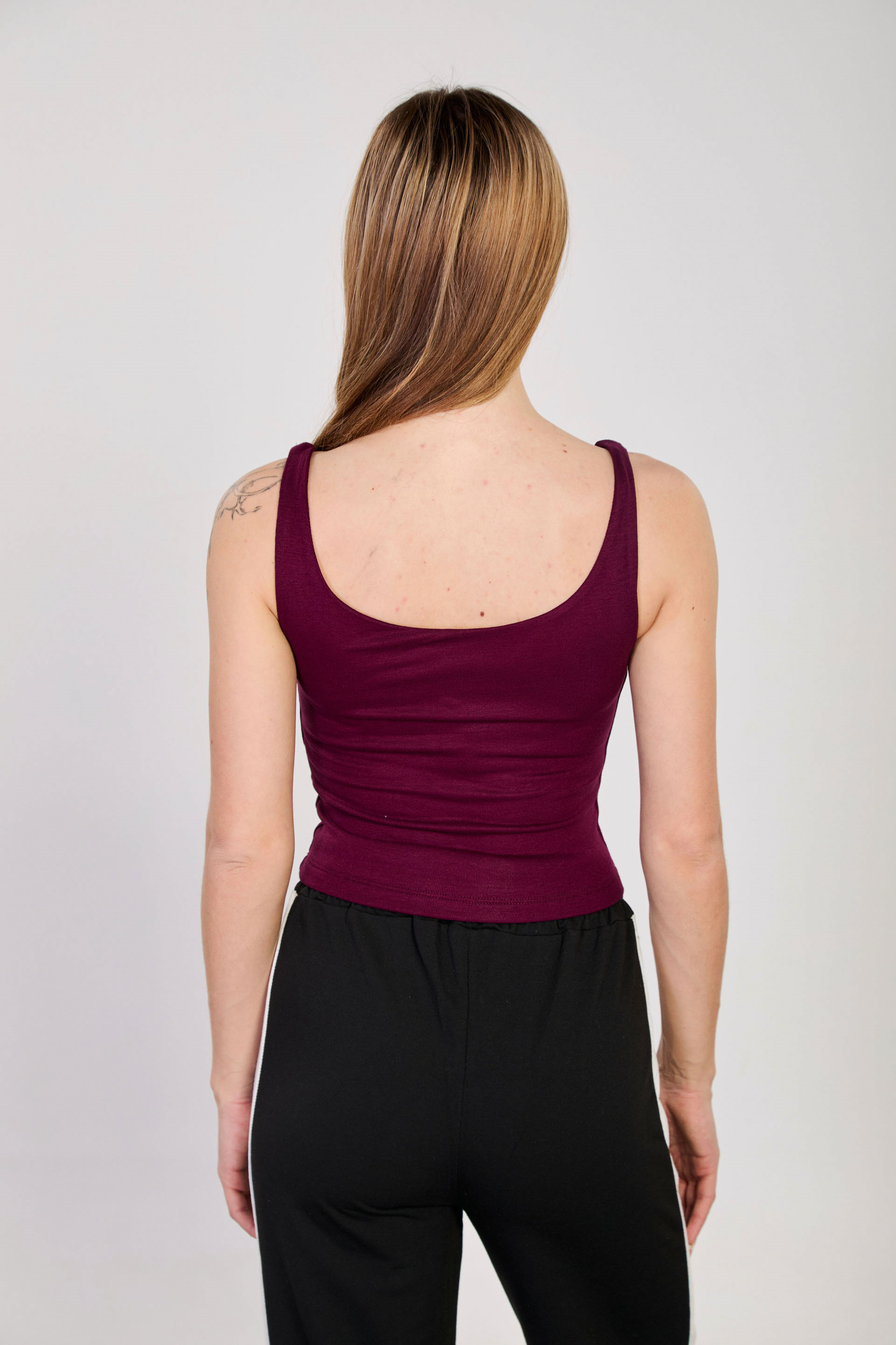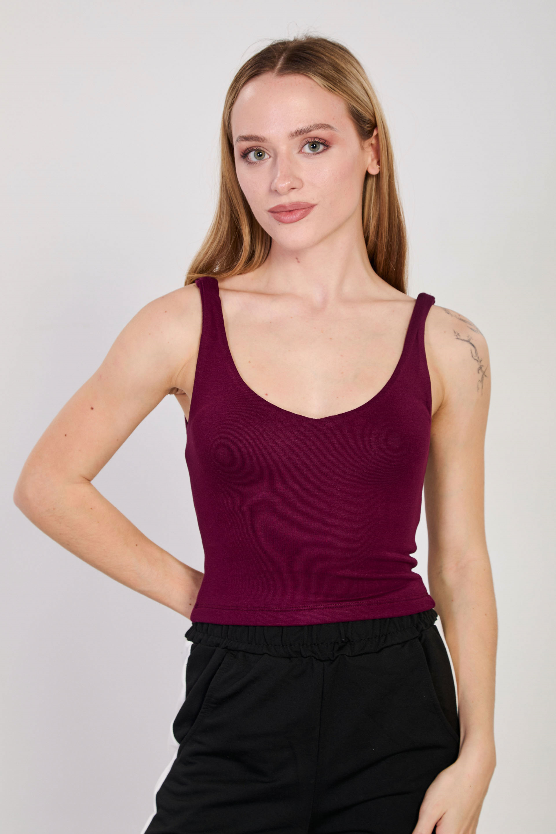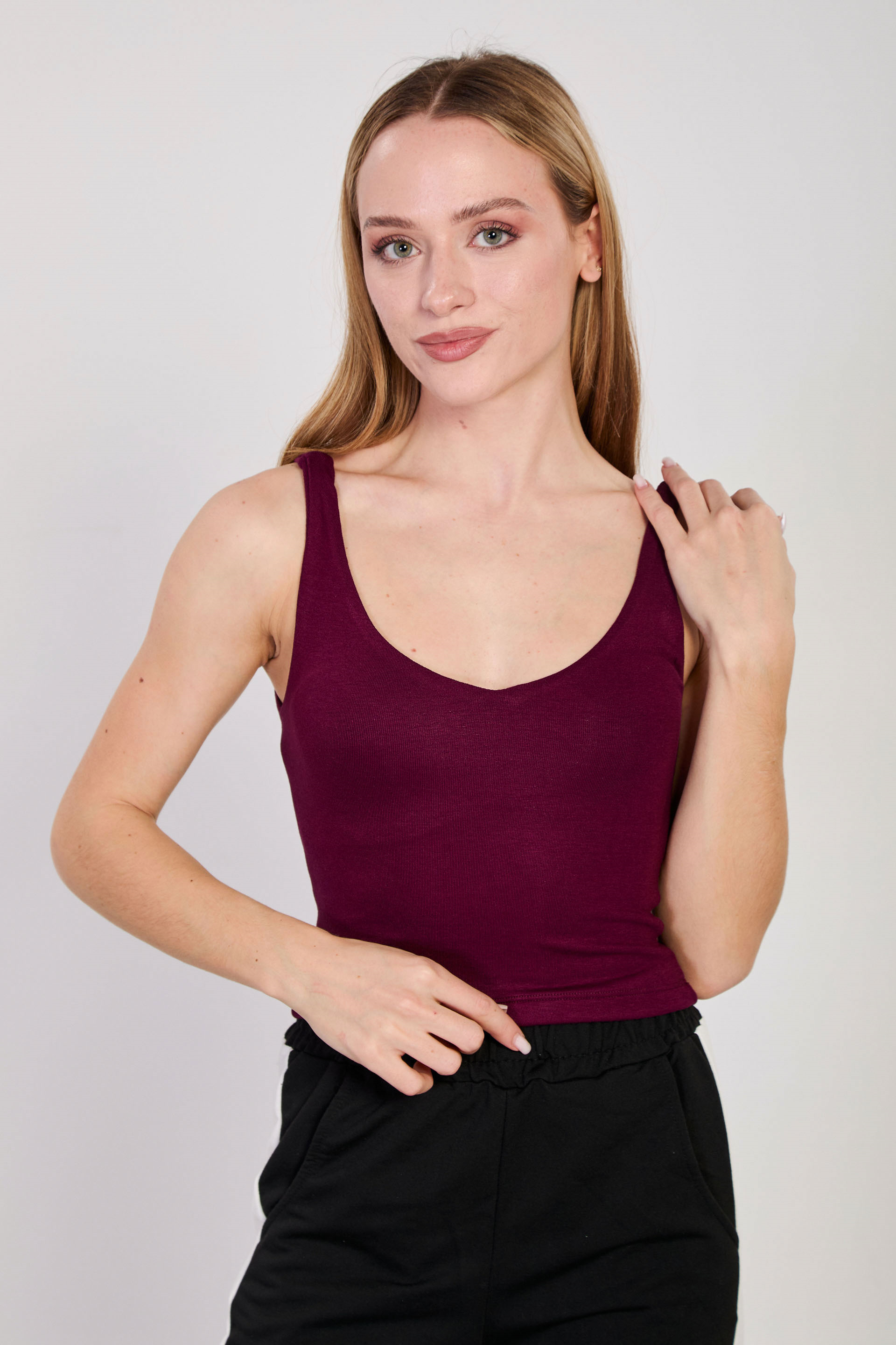 Kadın V Yaka Kalın Askılı Crop Top - Mürdüm