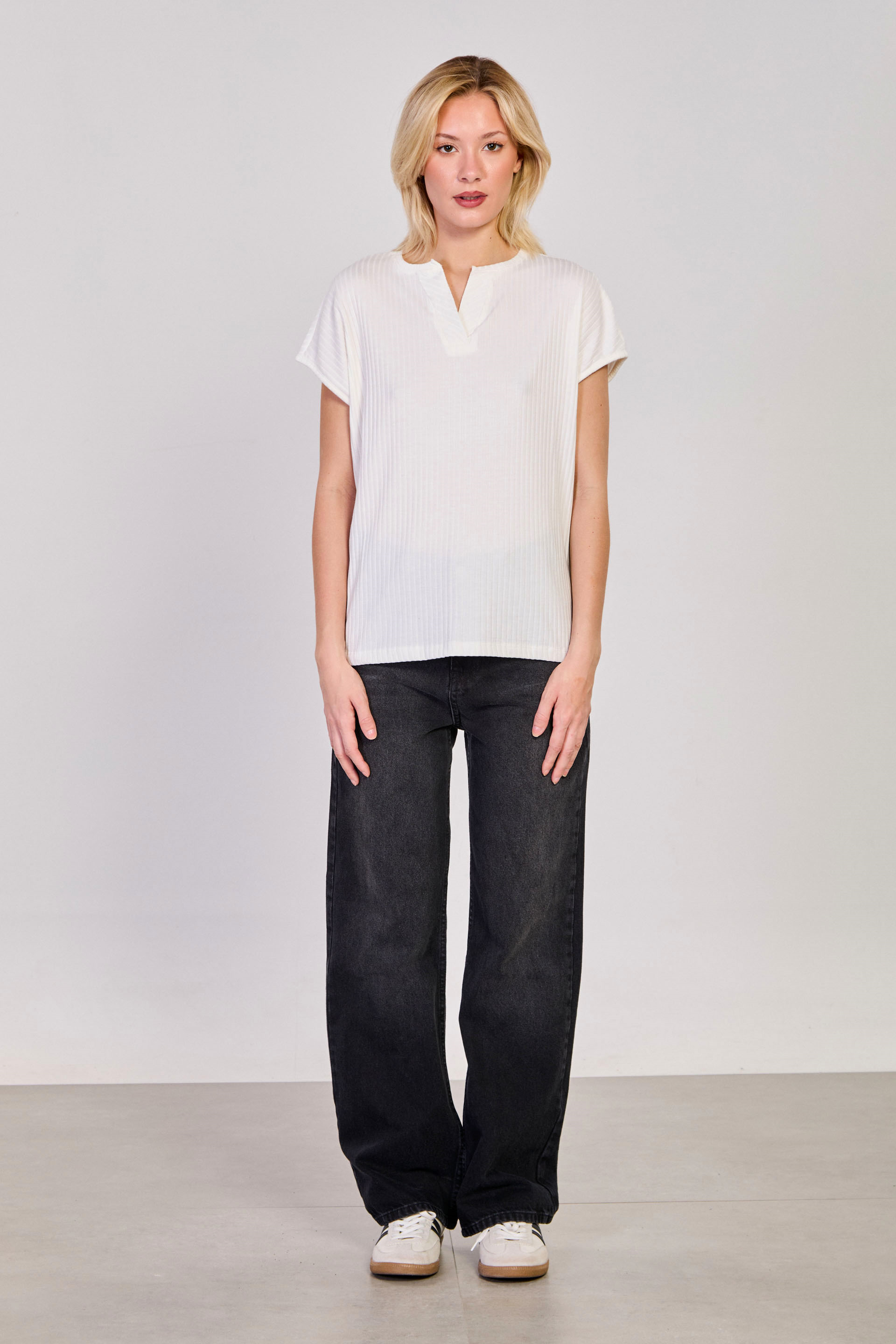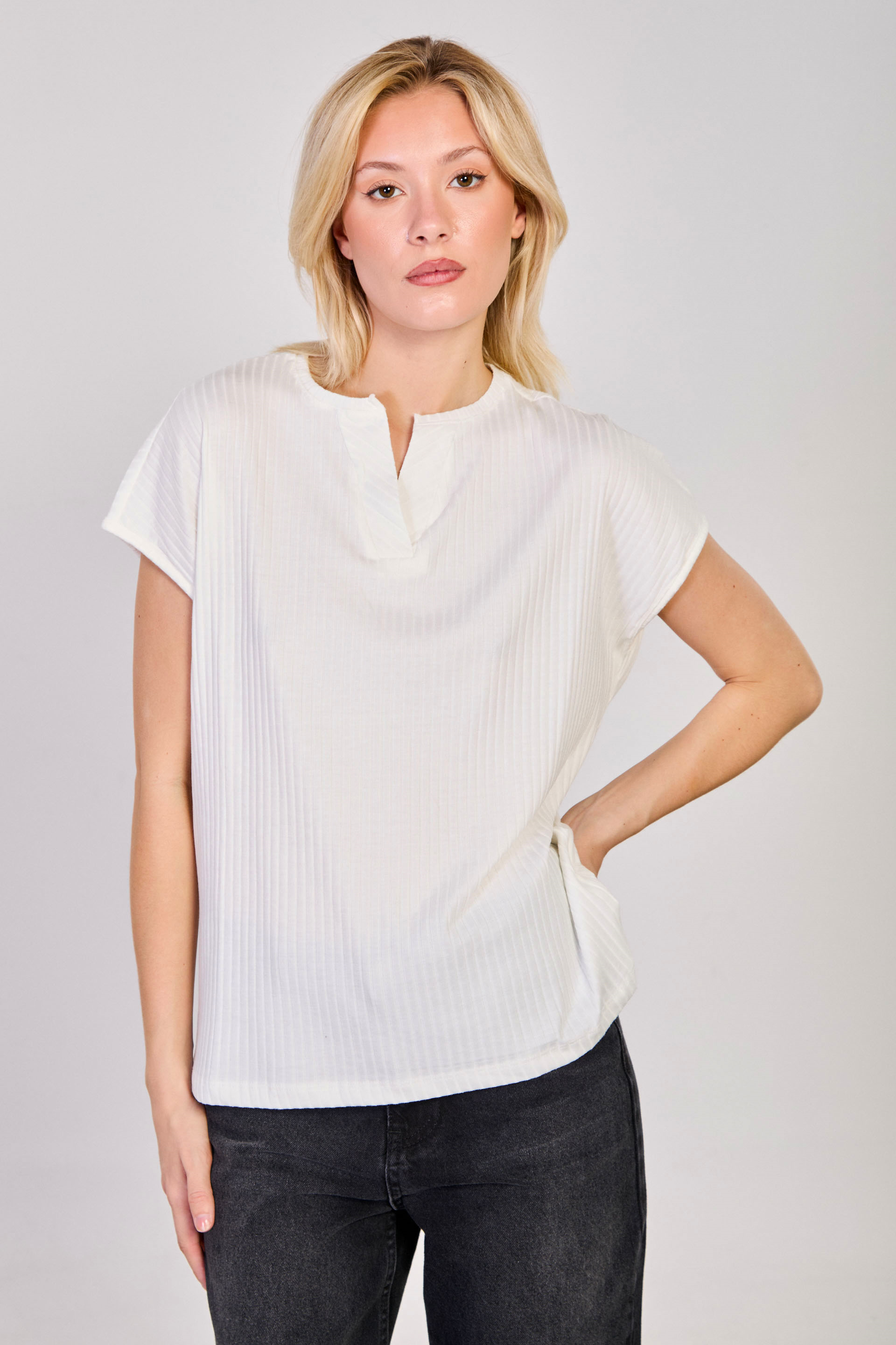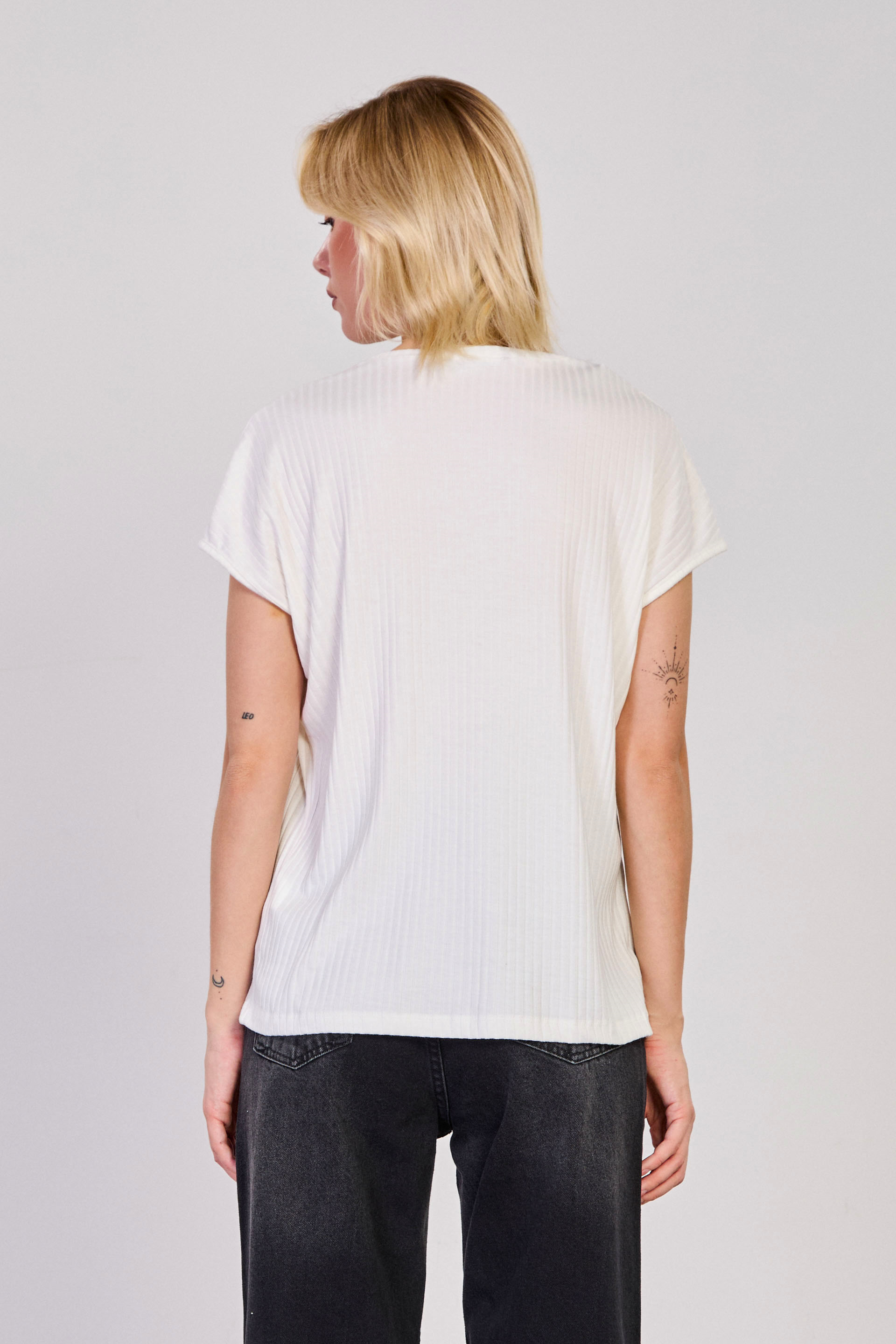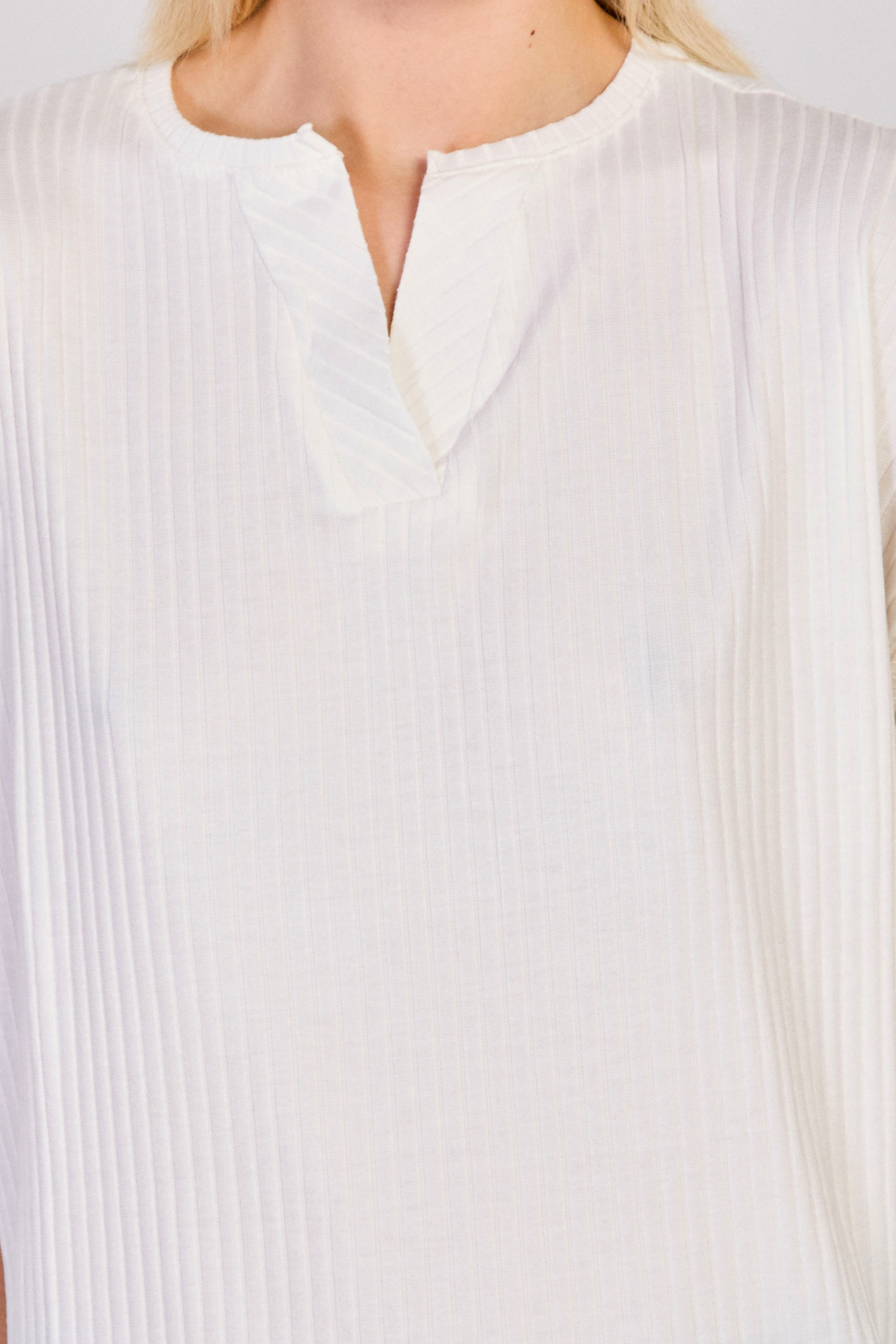 Kadın V Yaka Kısa Kollu Fitilli T-Shirt - Beyaz