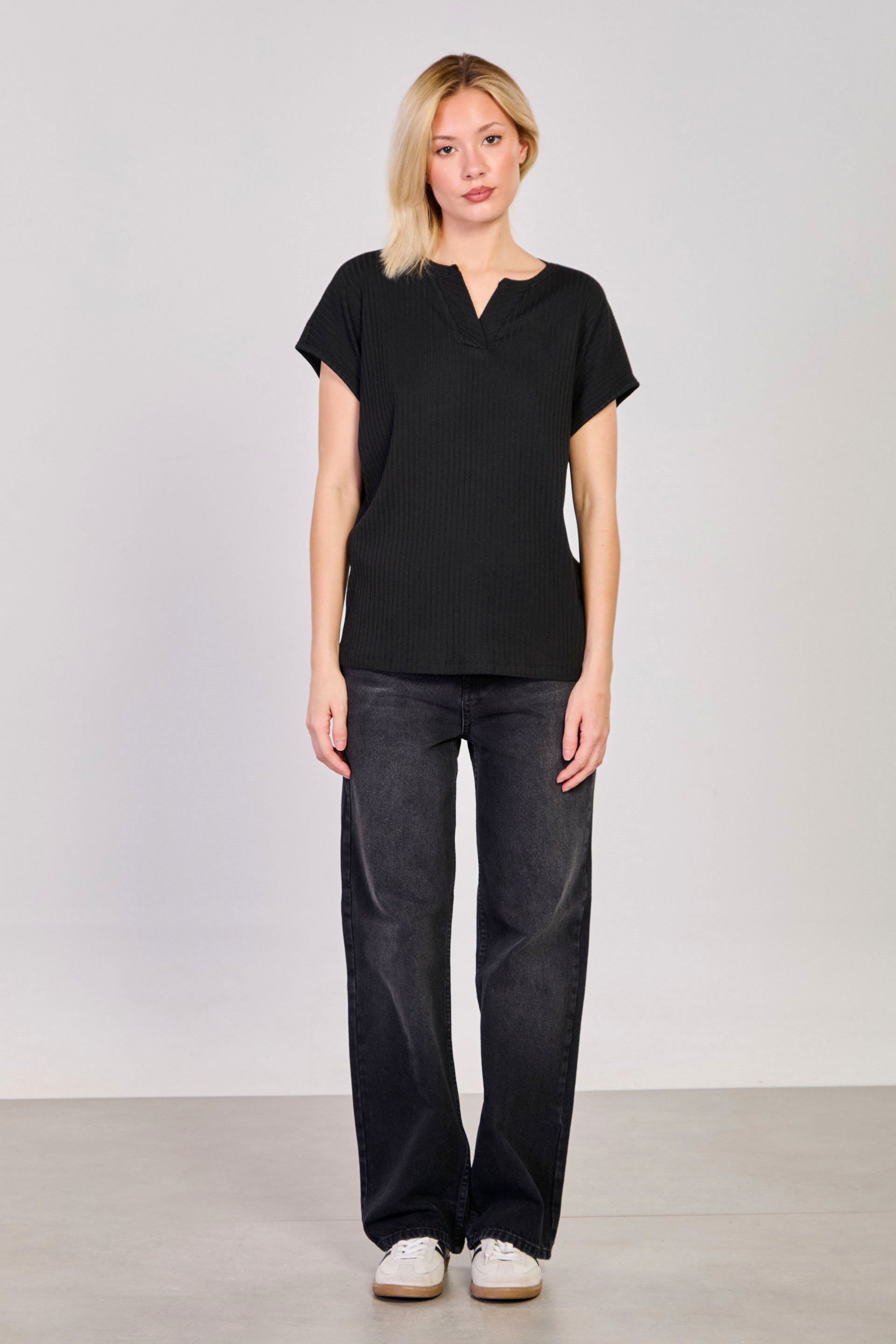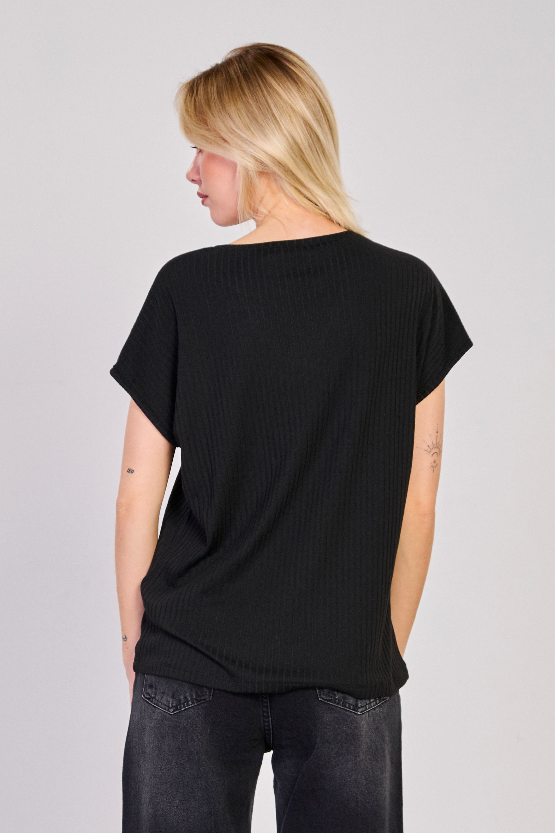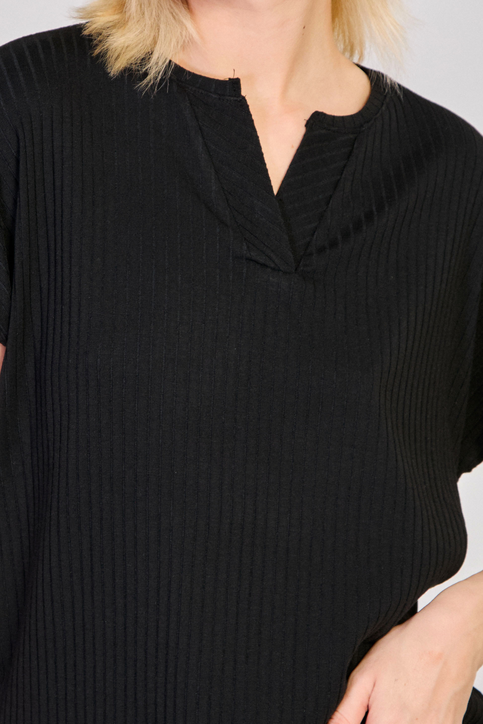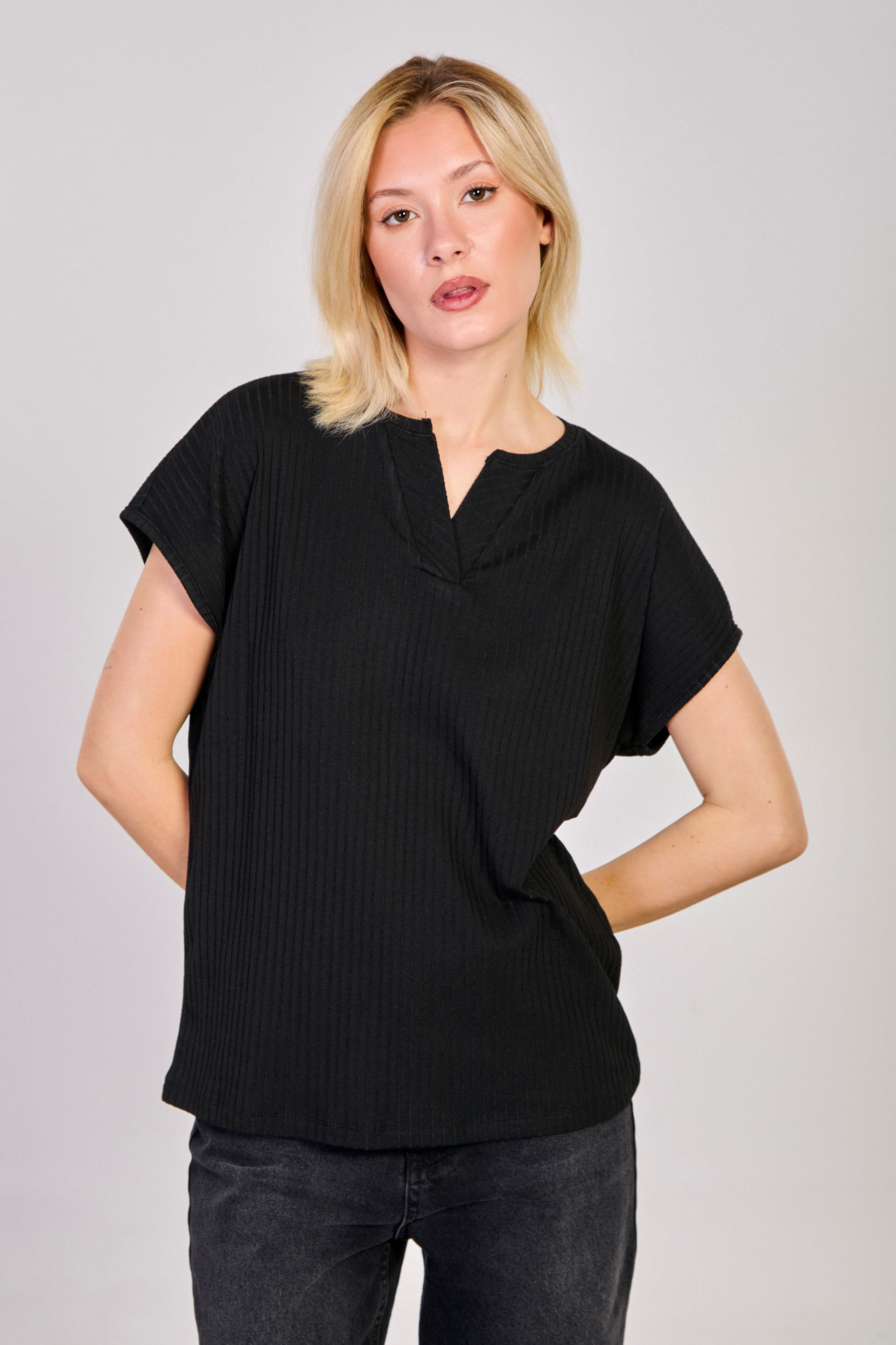 Kadın V Yaka Kısa Kollu Fitilli T-Shirt - Siyah
