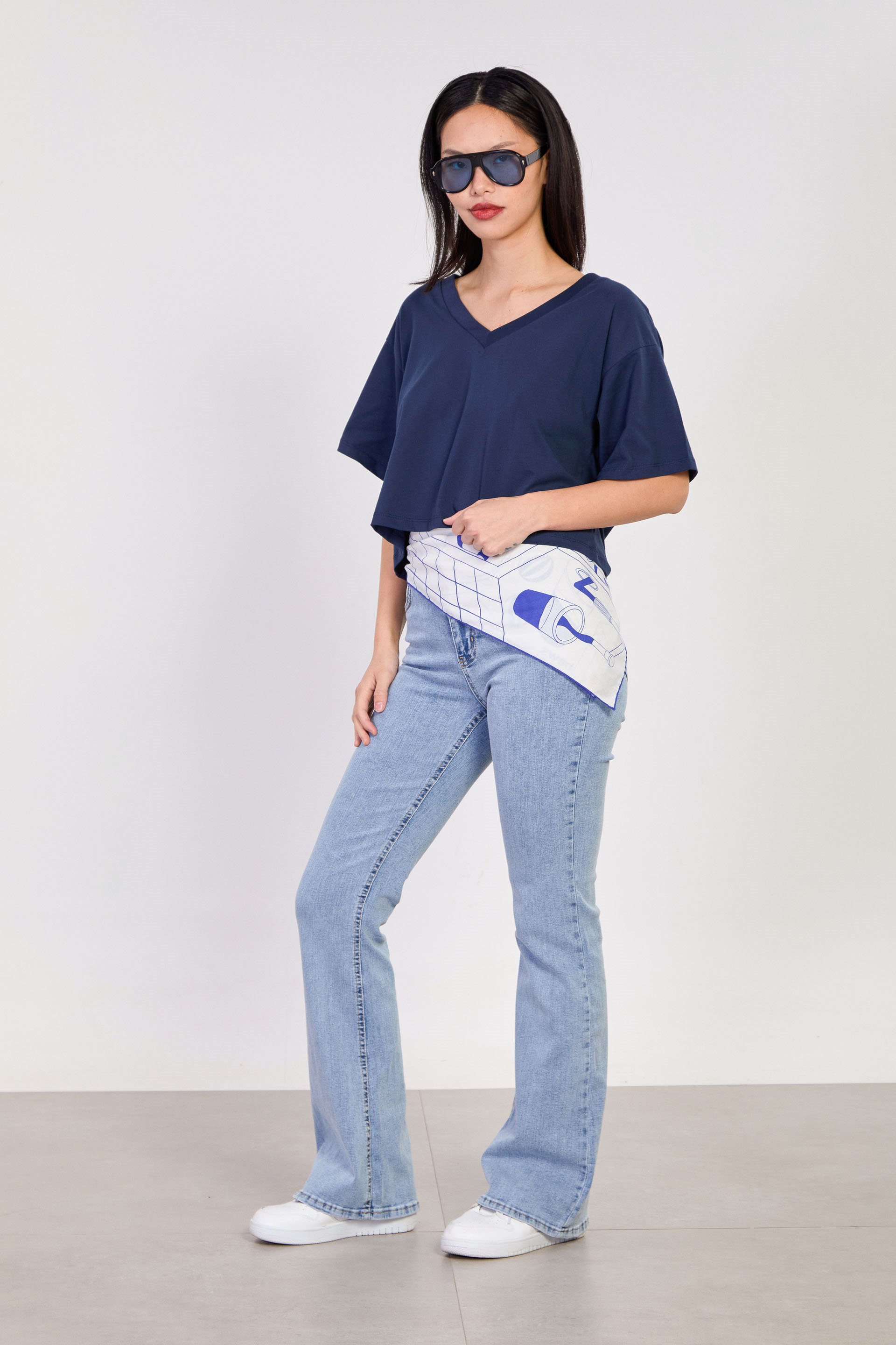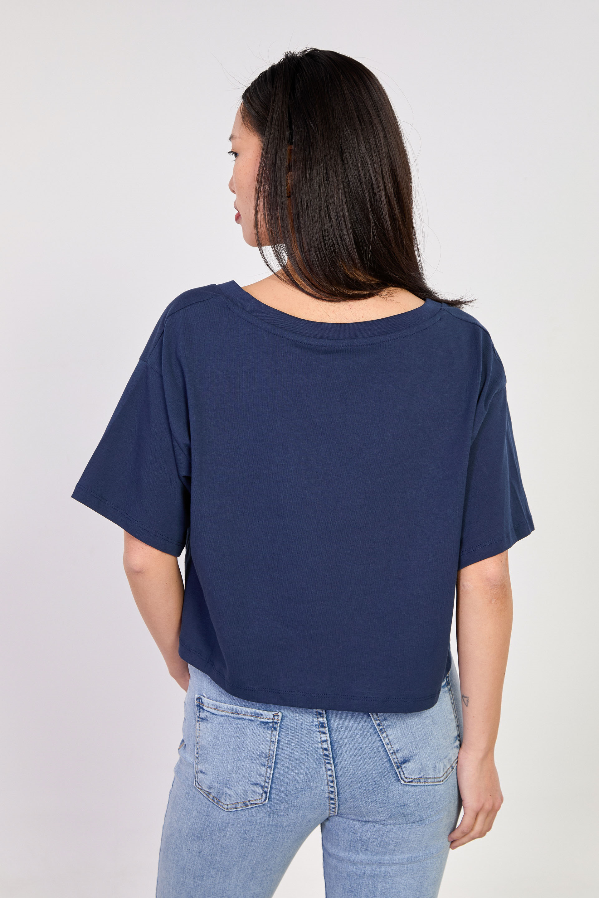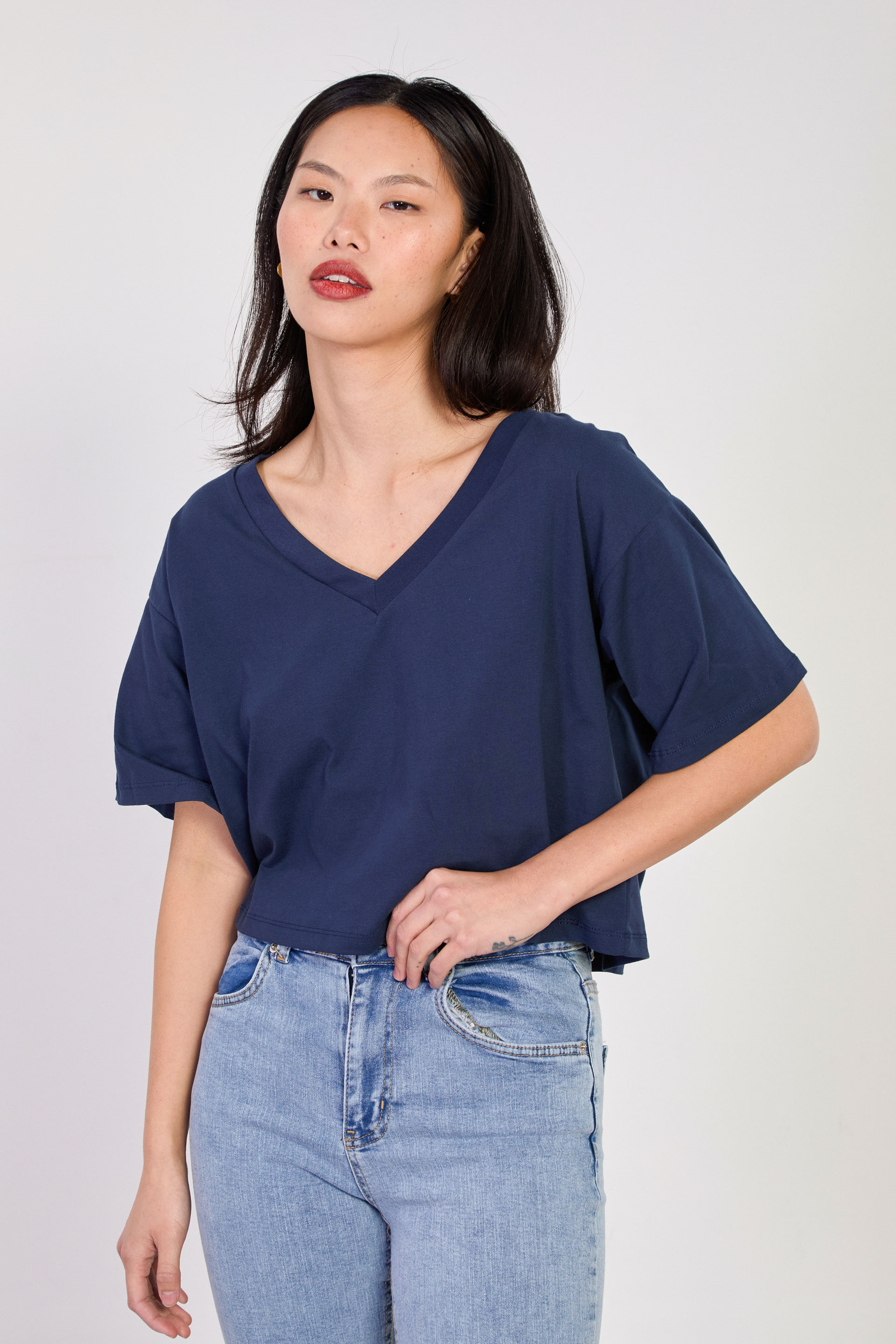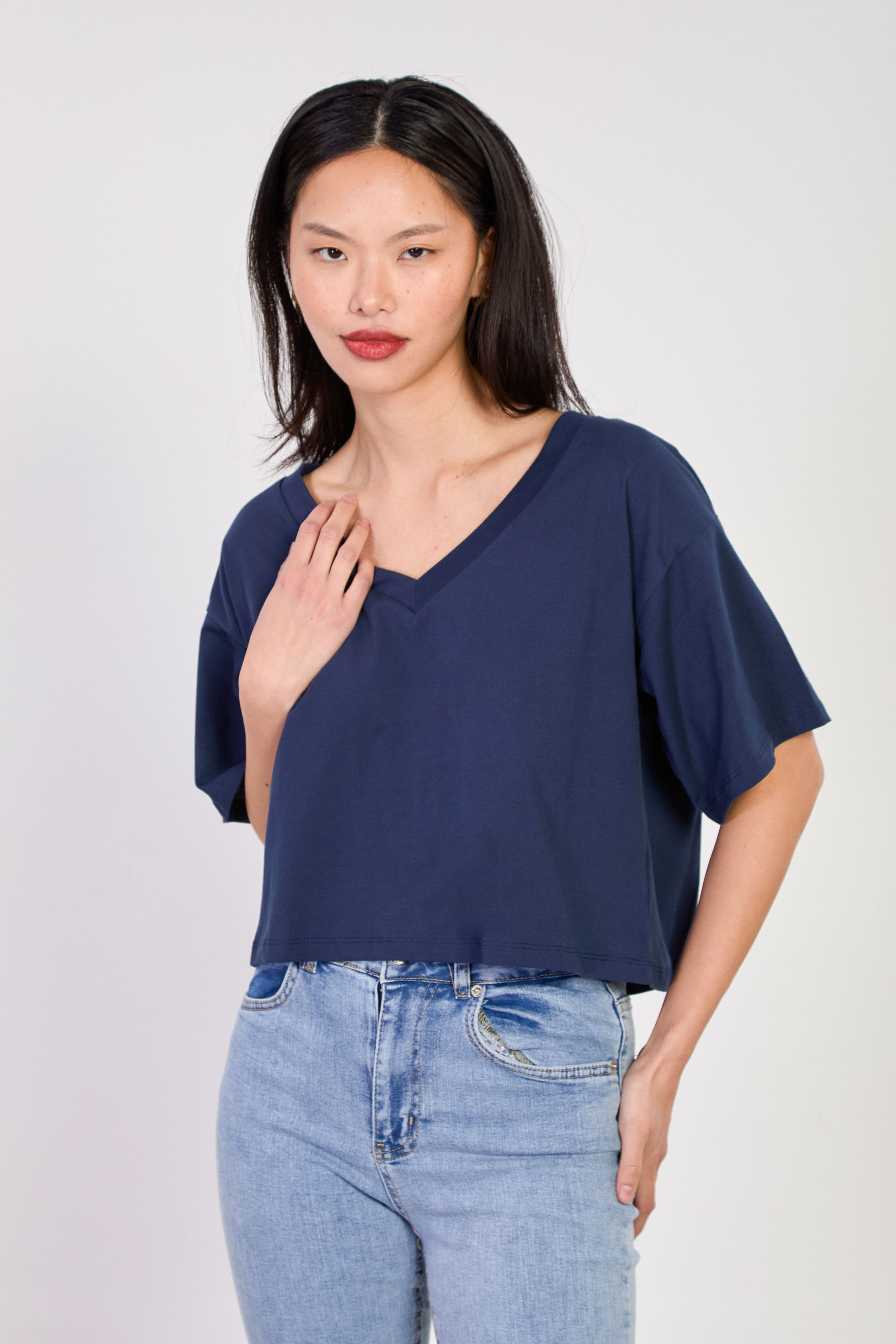 Kadın V Yaka Kısa Oversize T-Shirt - Lacivert