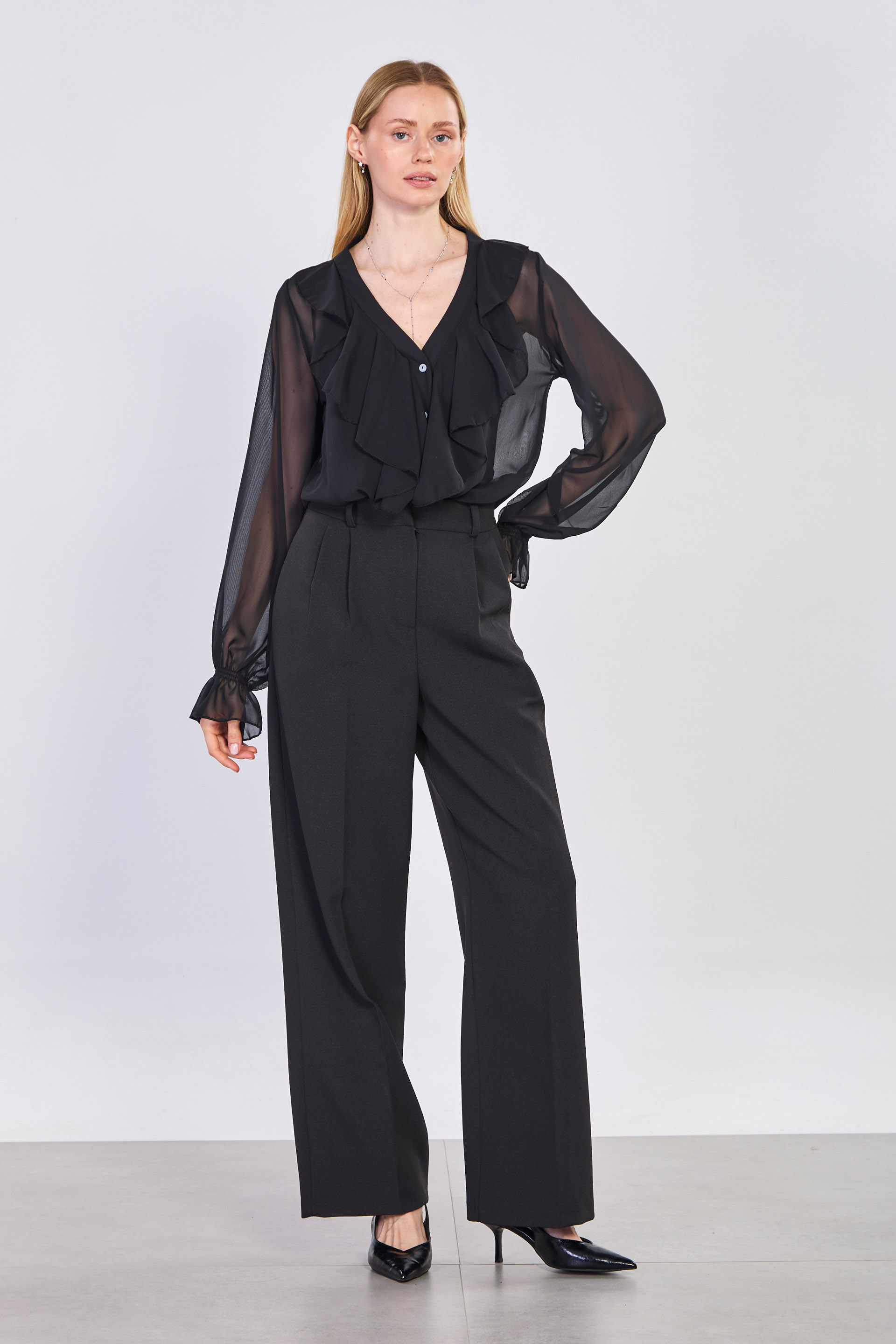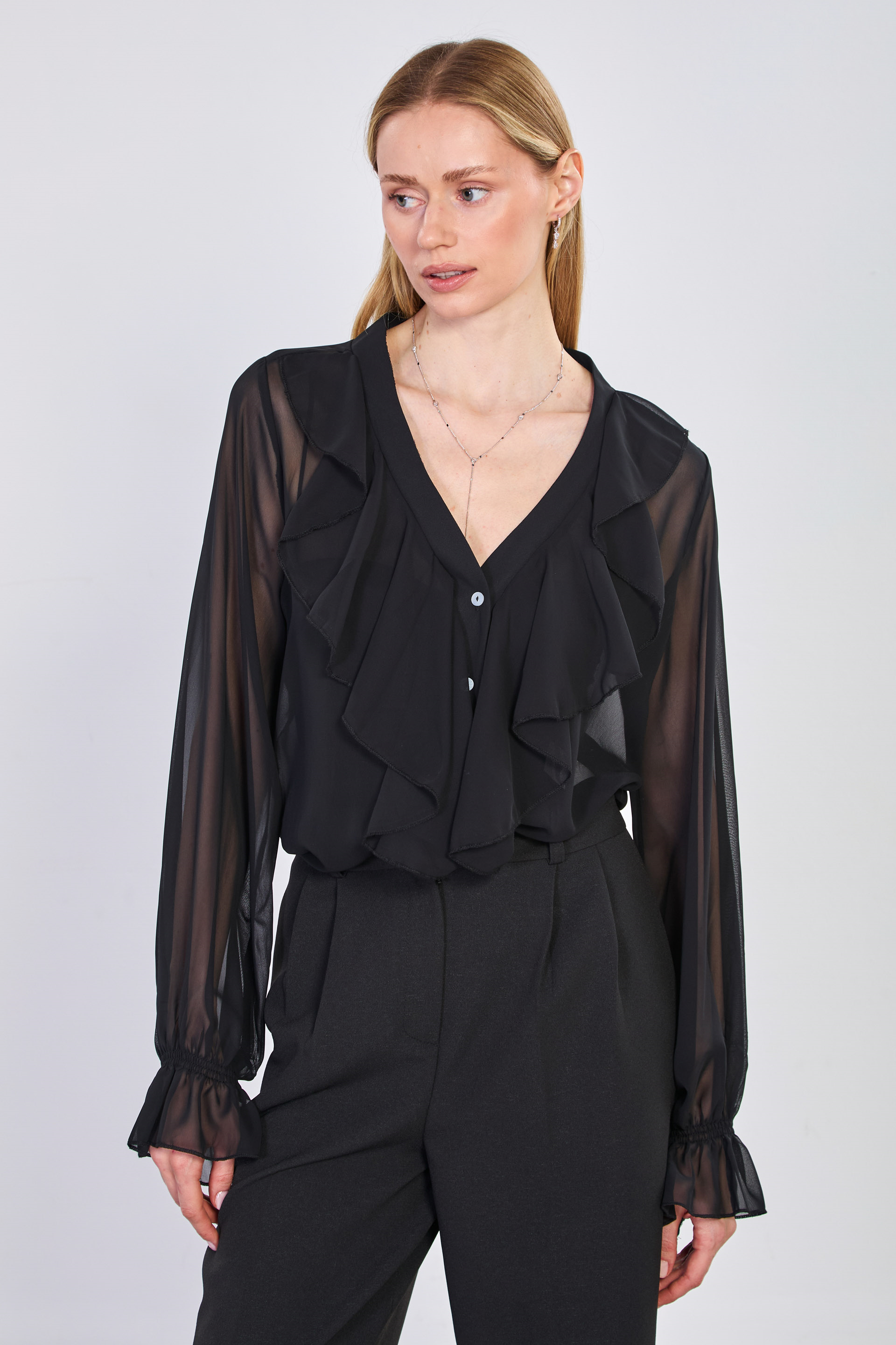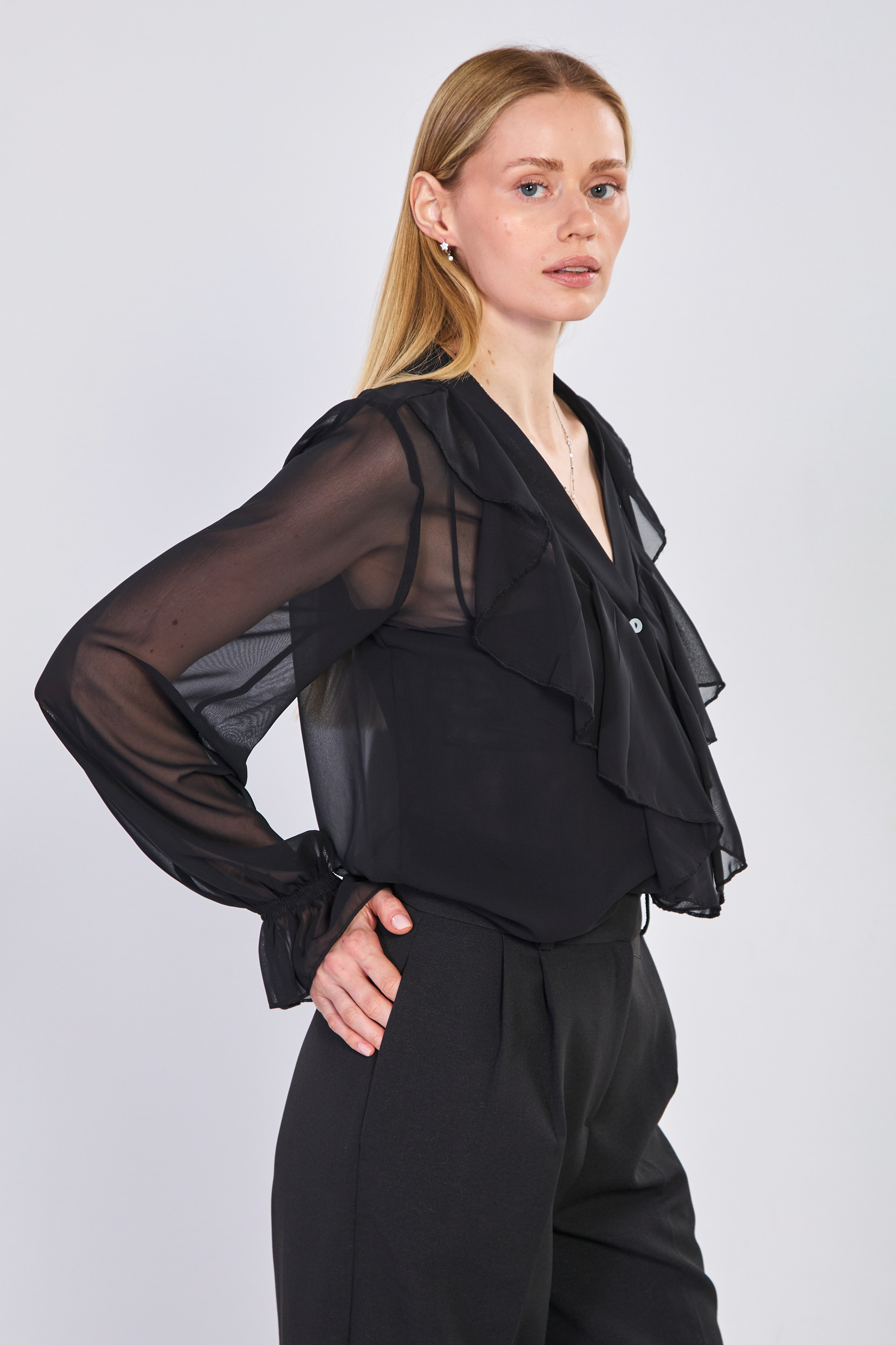 Kadın V Yaka Önü Fırfırlı Şifon Bluz - Siyah