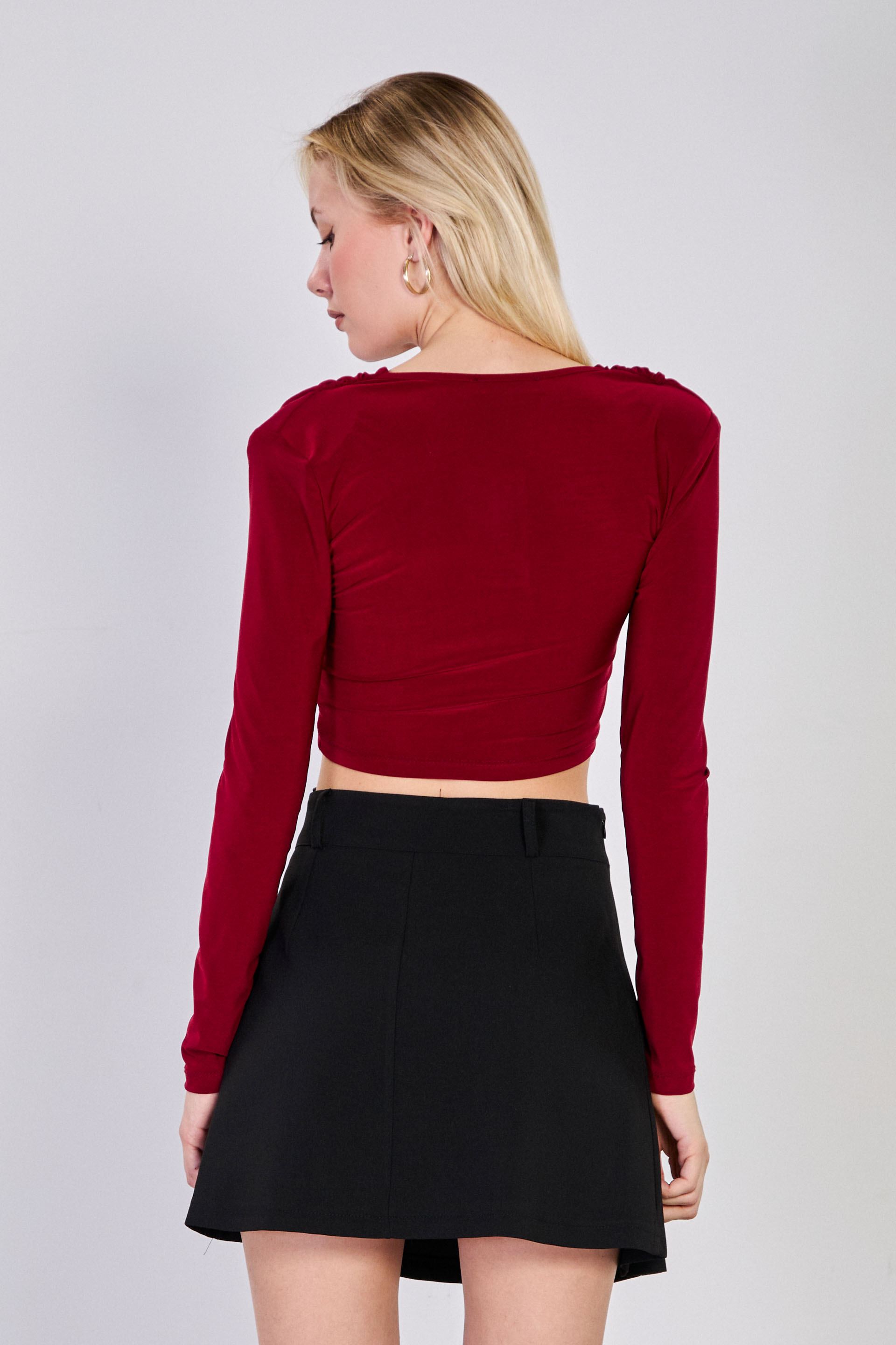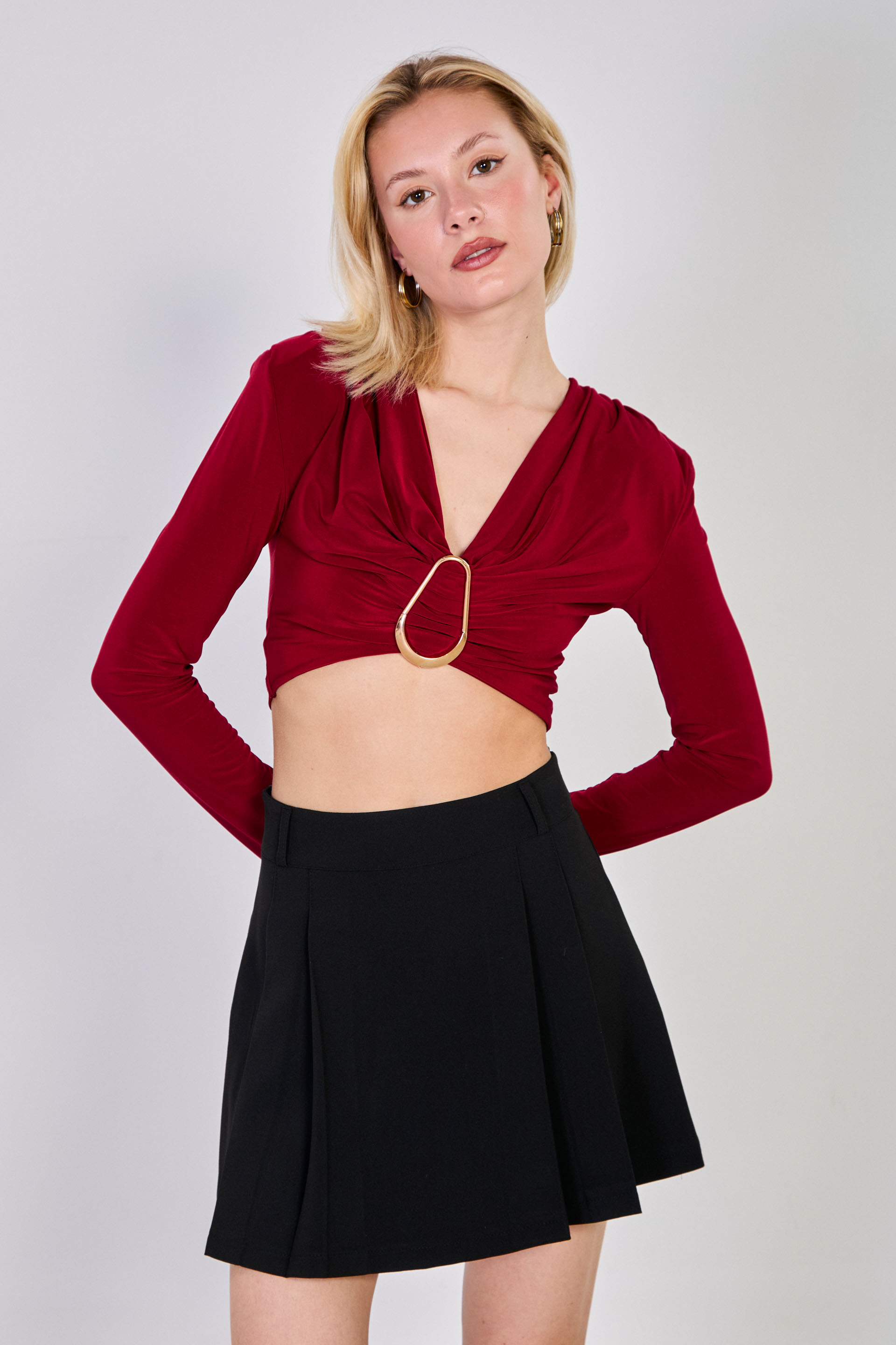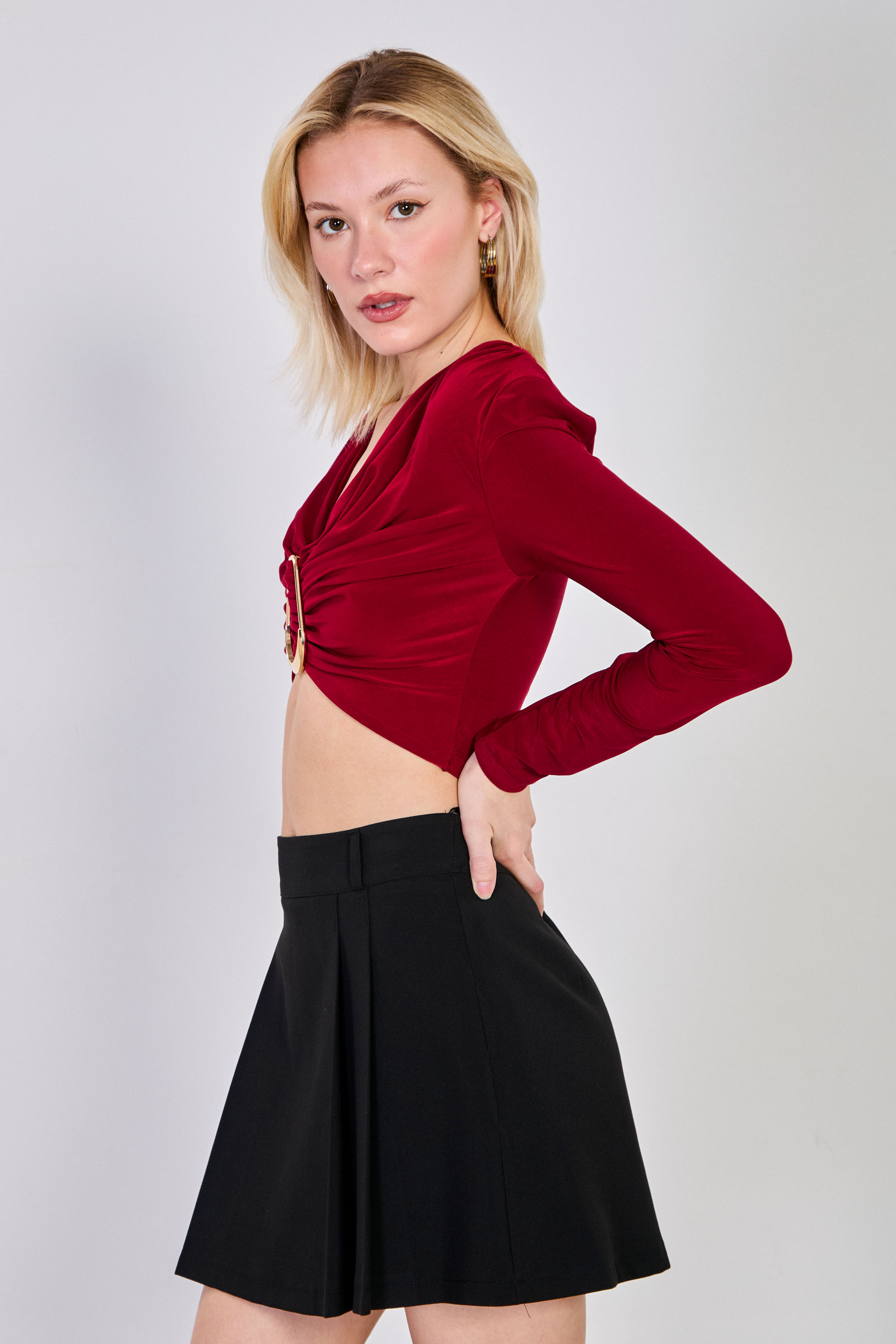 Kadın Vatkalı Derin V Yaka Uzun Kol Body - Bordo